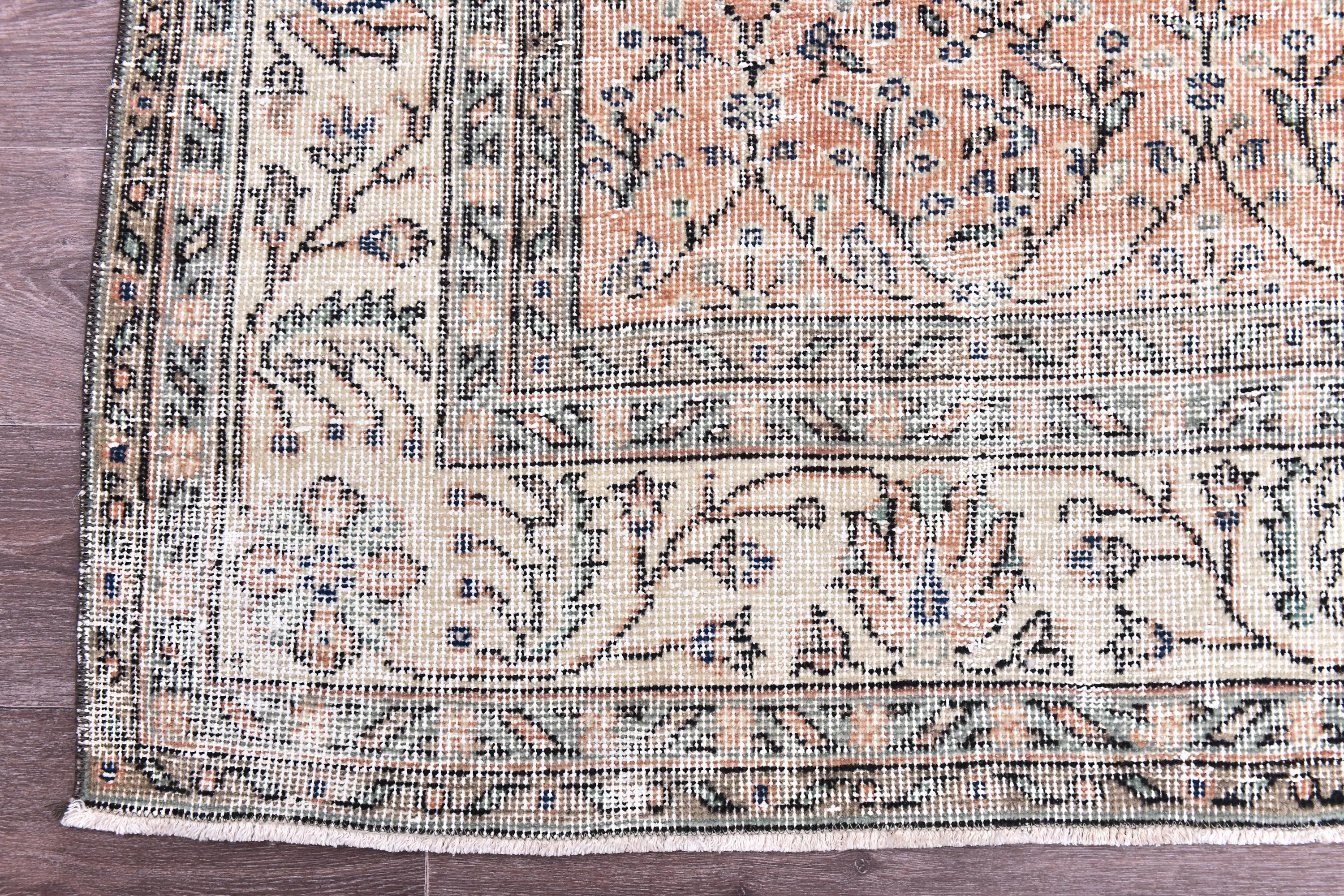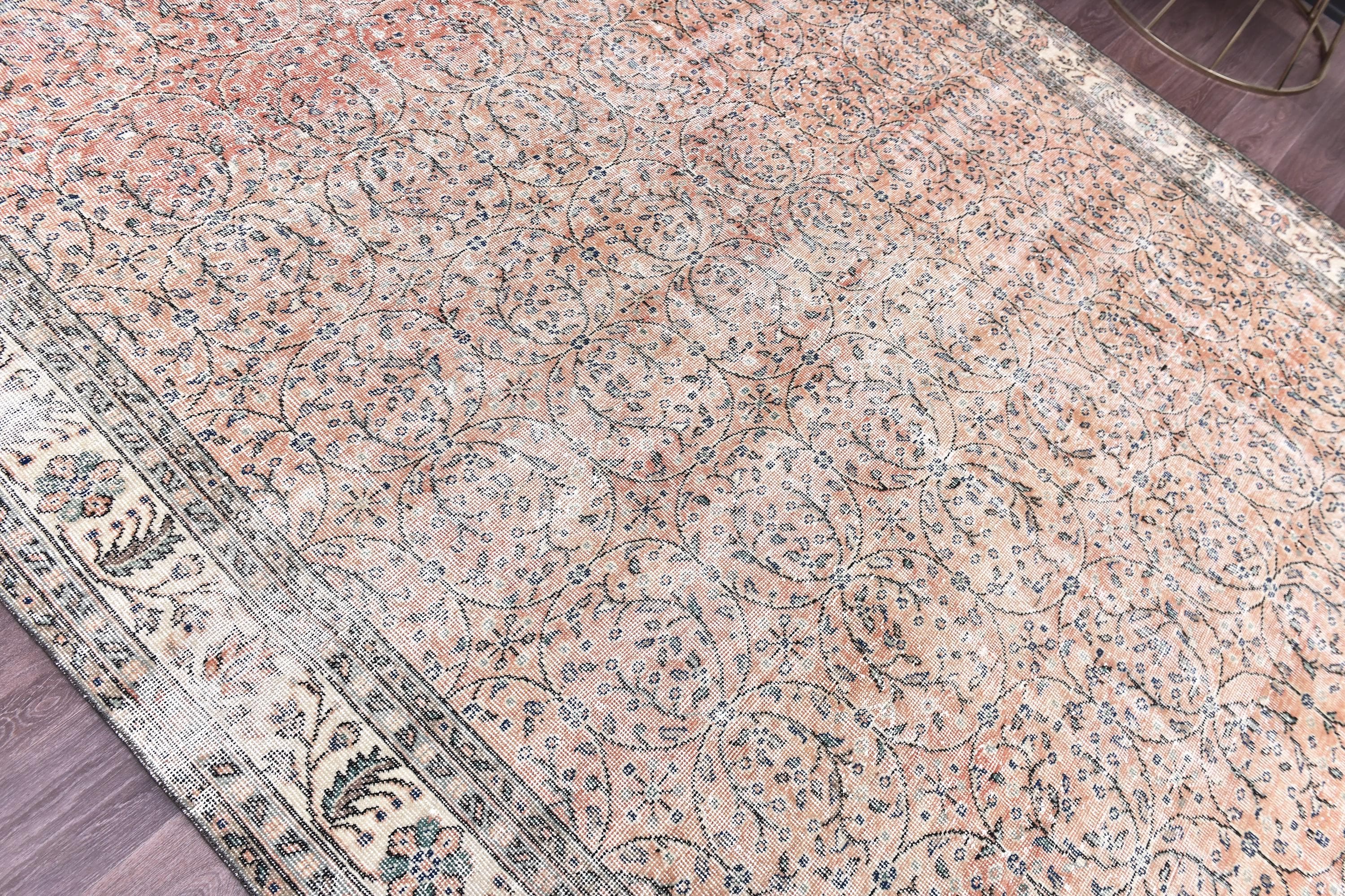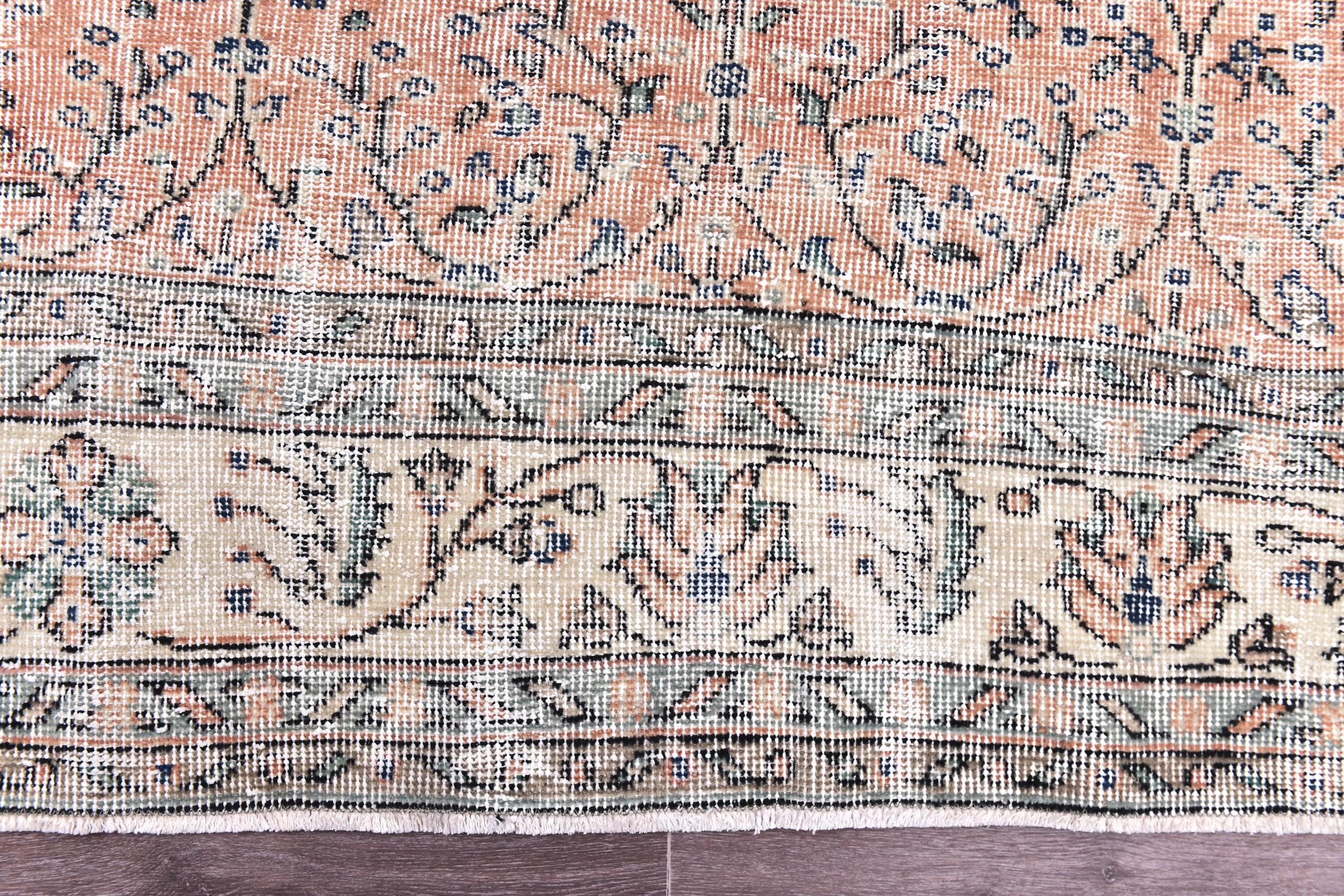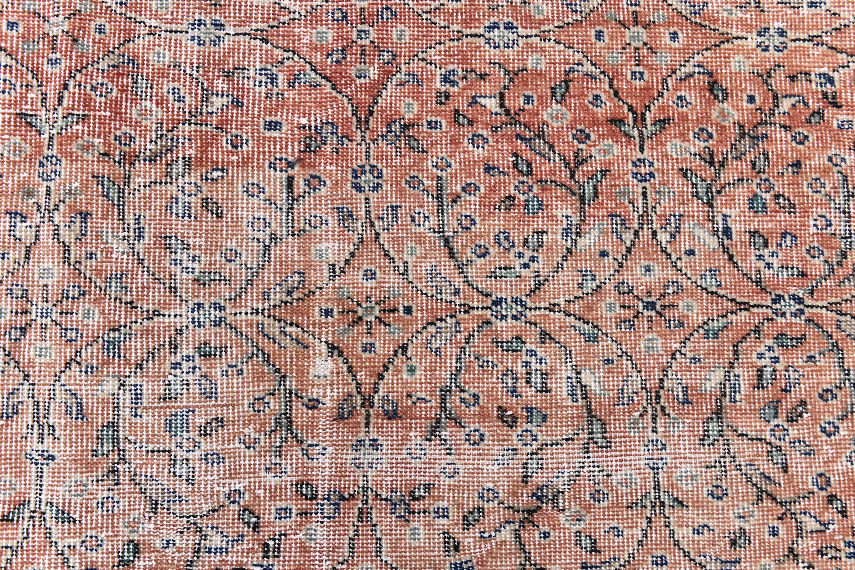 📜📌 Vintage hand-knotted wool rug in muted coral, soft peach, cream and gray colors showcasing an all-over herati pattern with curvilinear floral vines and palmettes, framed by an ornate ivory border with arabesque designs, exhibiting natural age-related distressing and faded patina