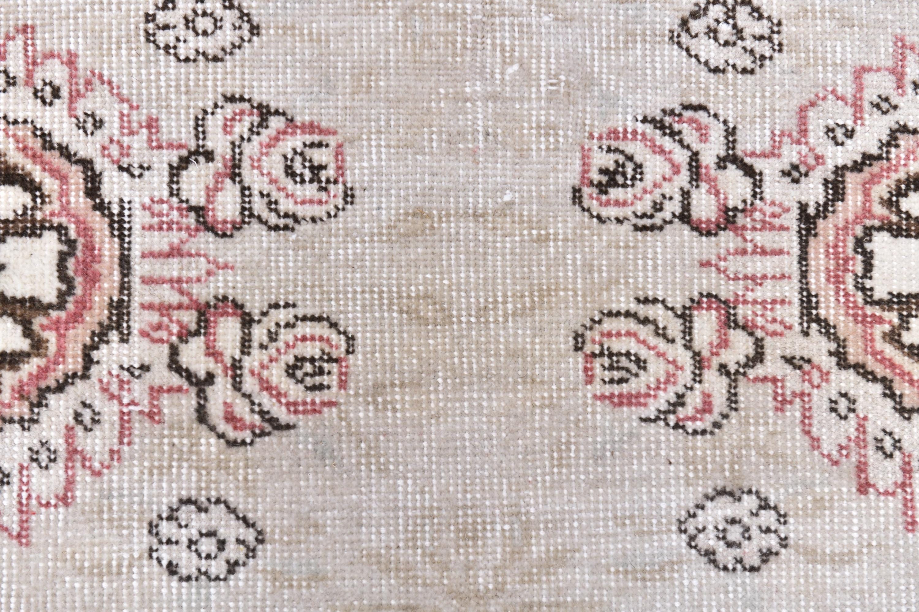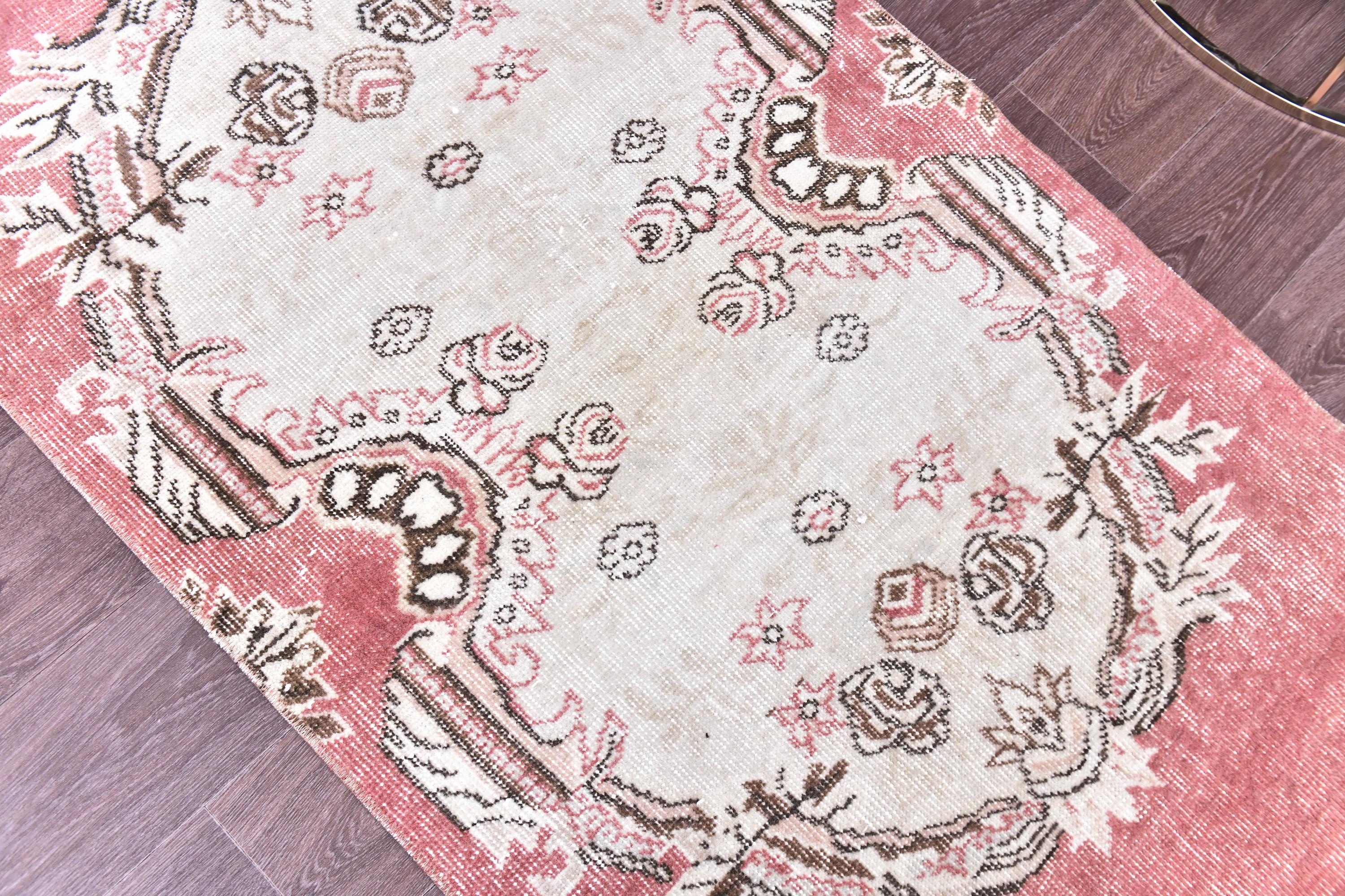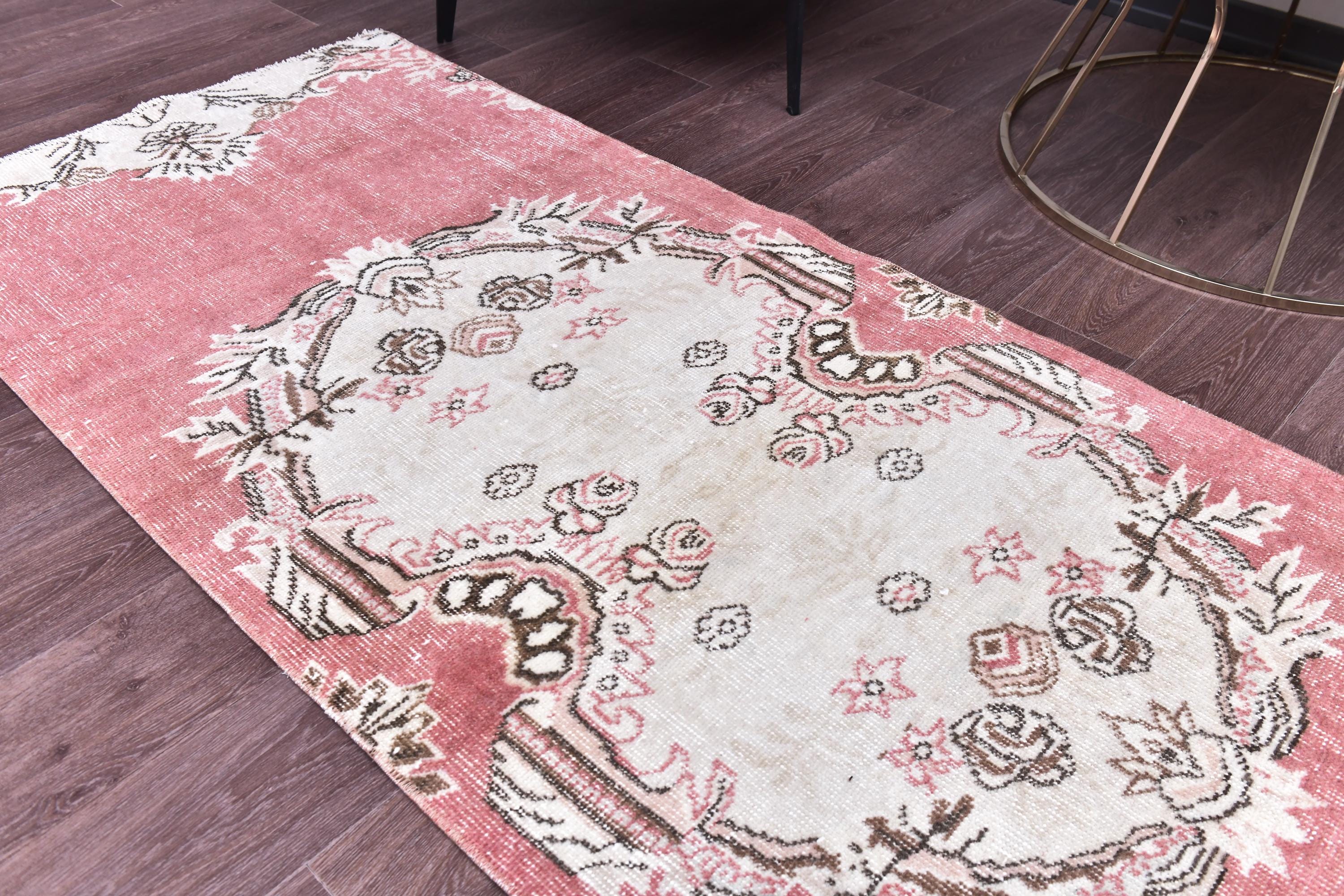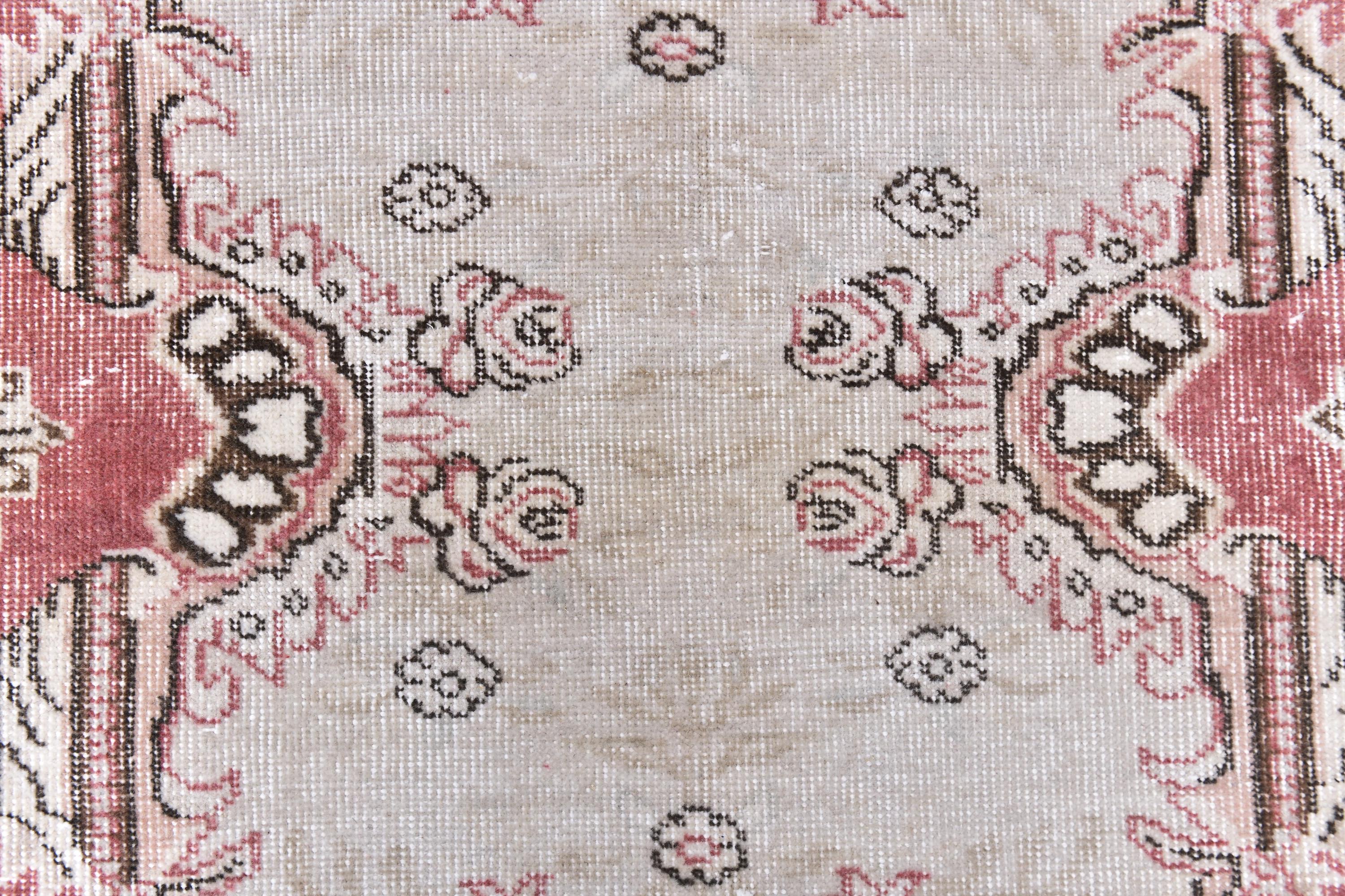 📜📌 Antique Anatolian tribal runner carpet in muted earth tones of taupe, gray, cream and soft pink accents, showcasing repeating diamond medallions with coral and navy centers, surrounded by traditional Greek meander borders, exhibiting authentic age-related wear and faded patina on hand-woven wool