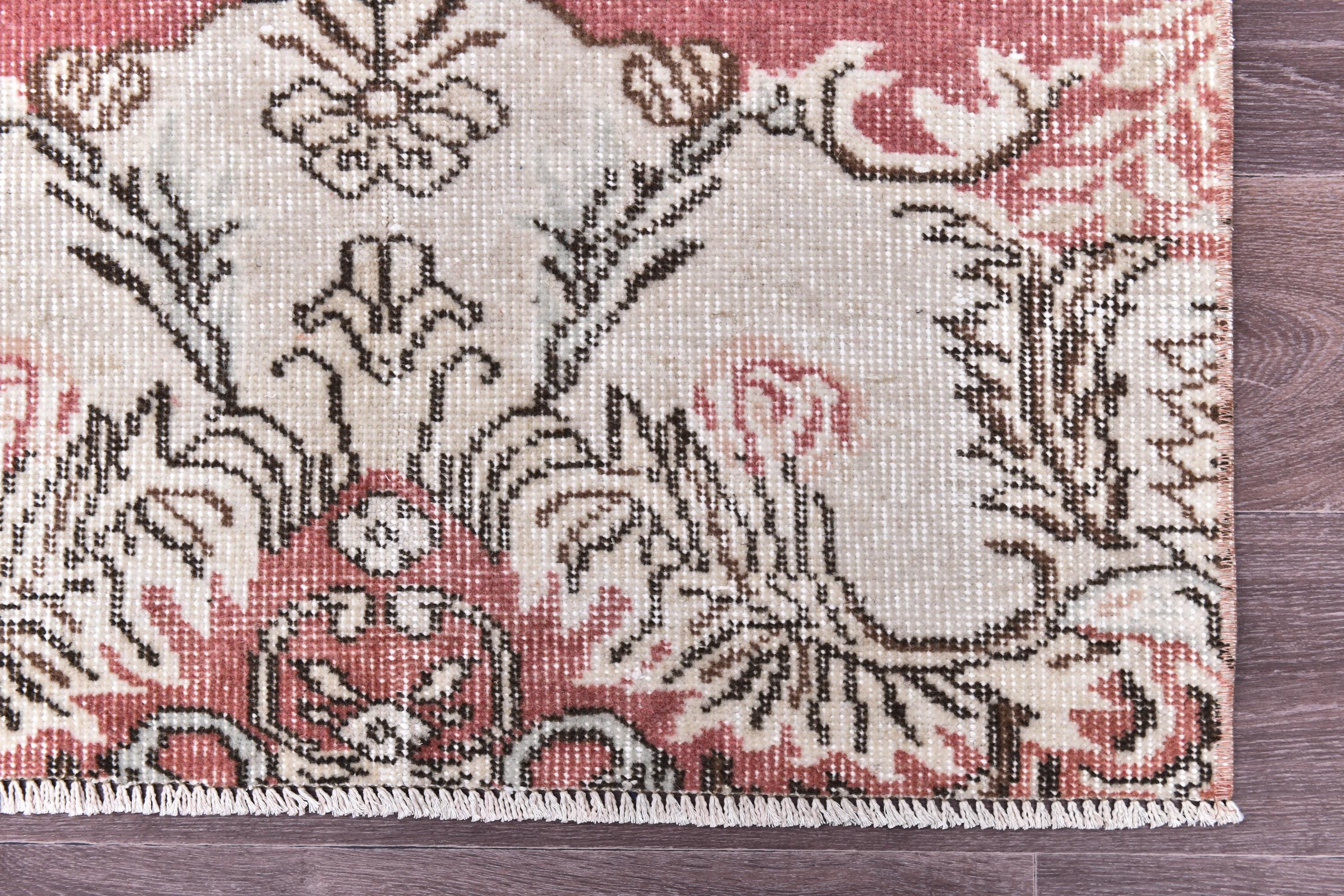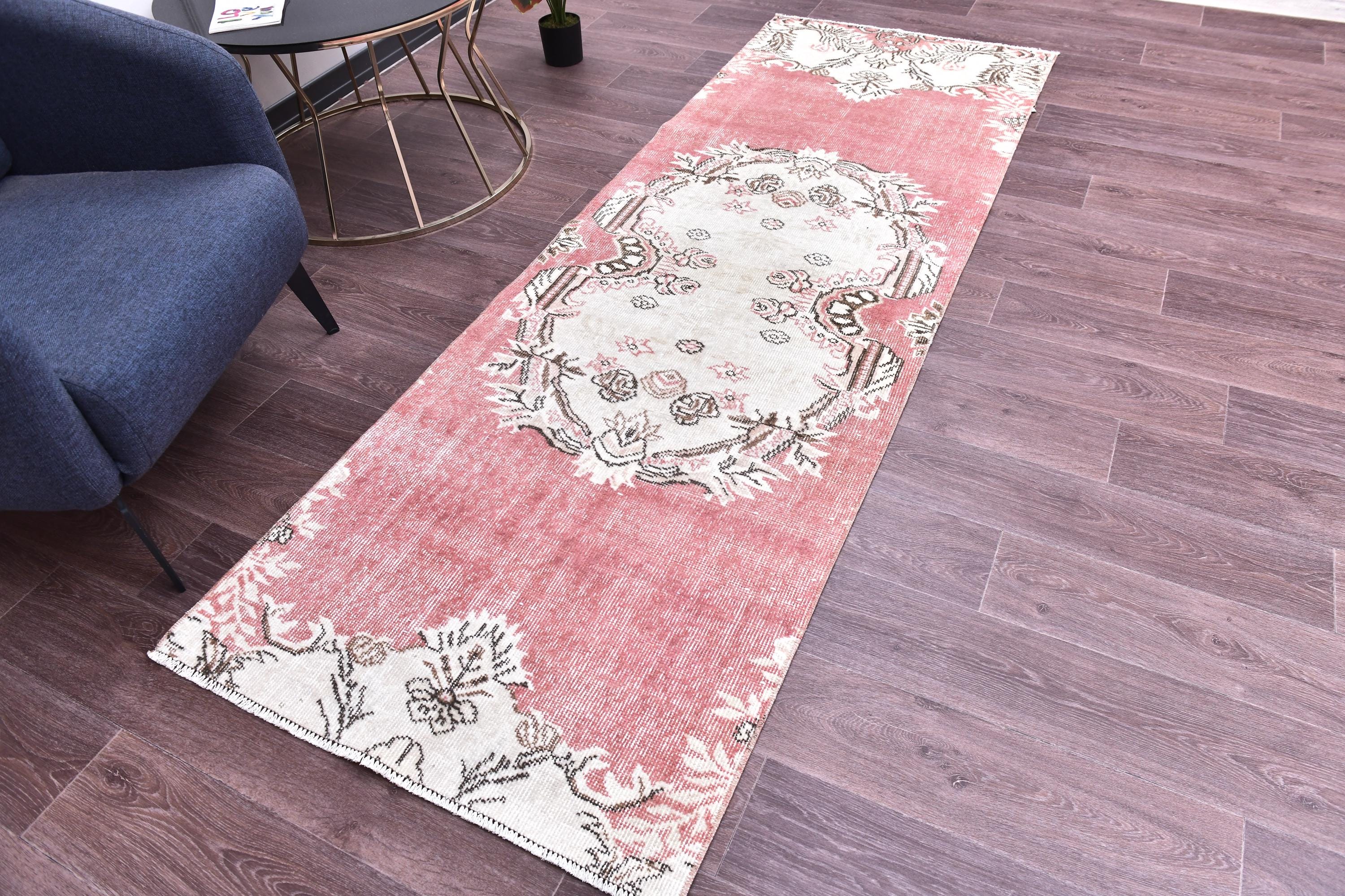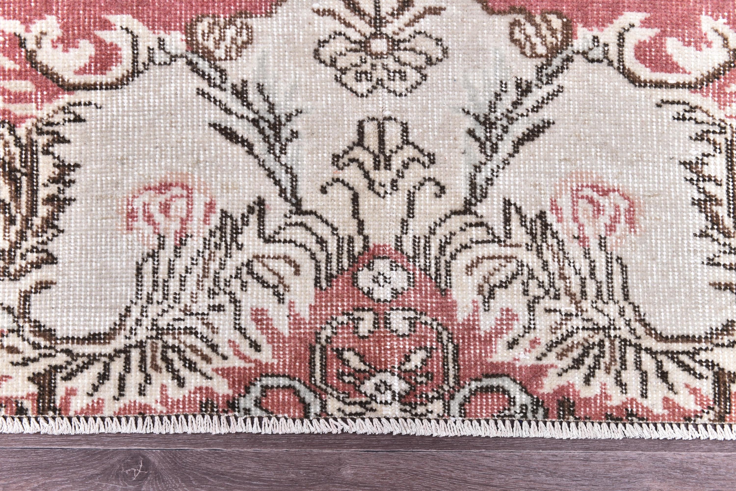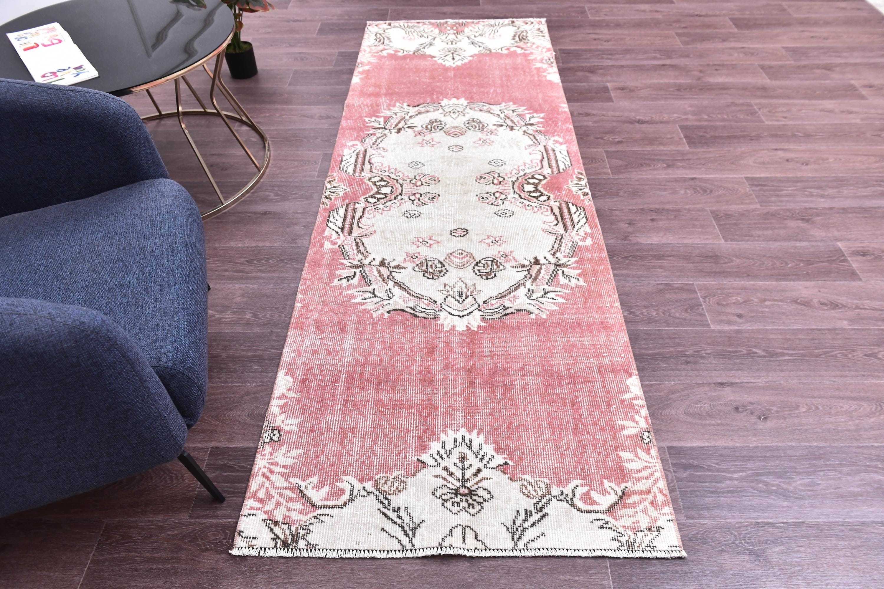 📜📌 Antique Anatolian tribal runner carpet in muted earth tones of taupe, gray, cream and soft pink accents, showcasing repeating diamond medallions with coral and navy centers, surrounded by traditional Greek meander borders, exhibiting authentic age-related wear and faded patina on hand-woven wool