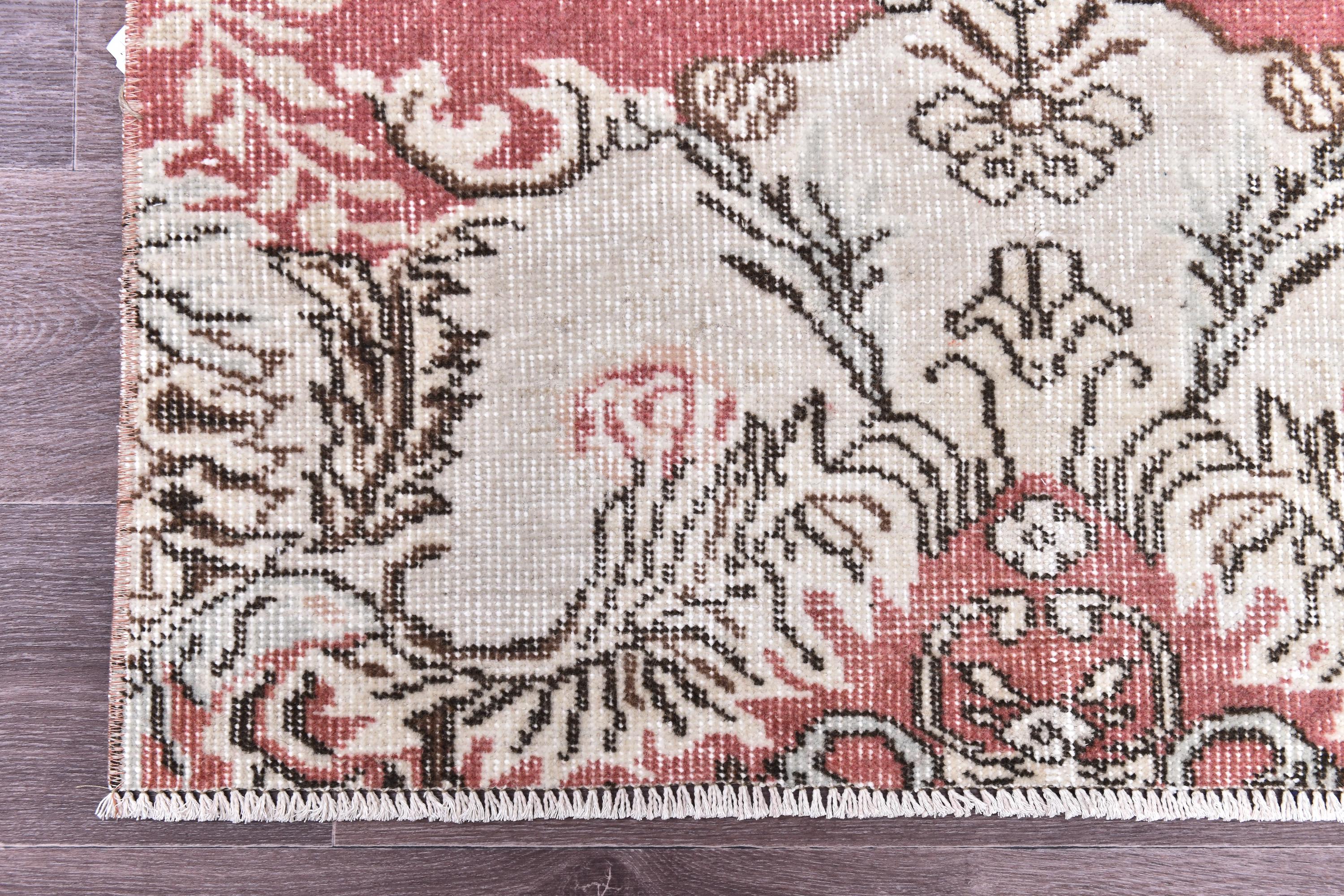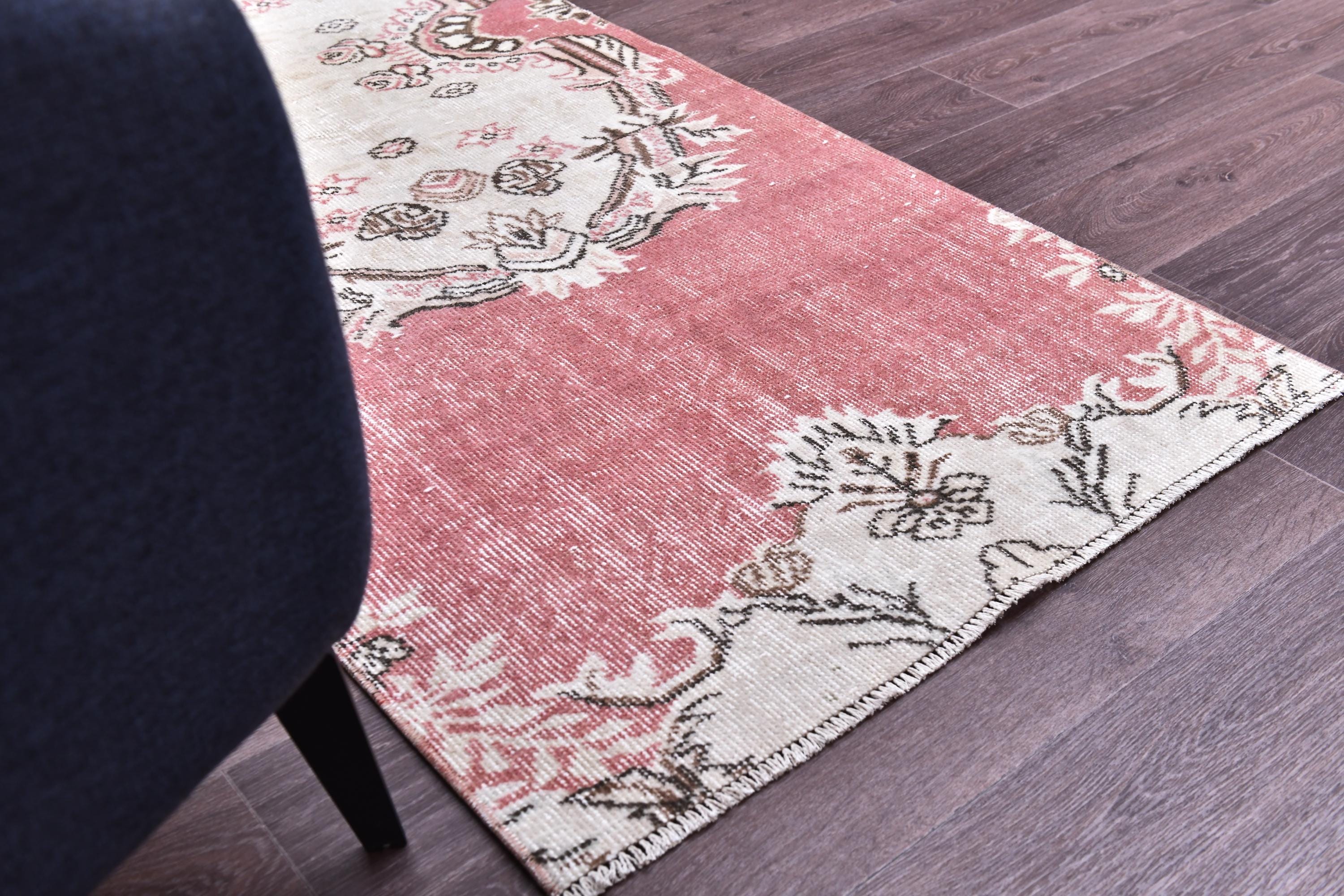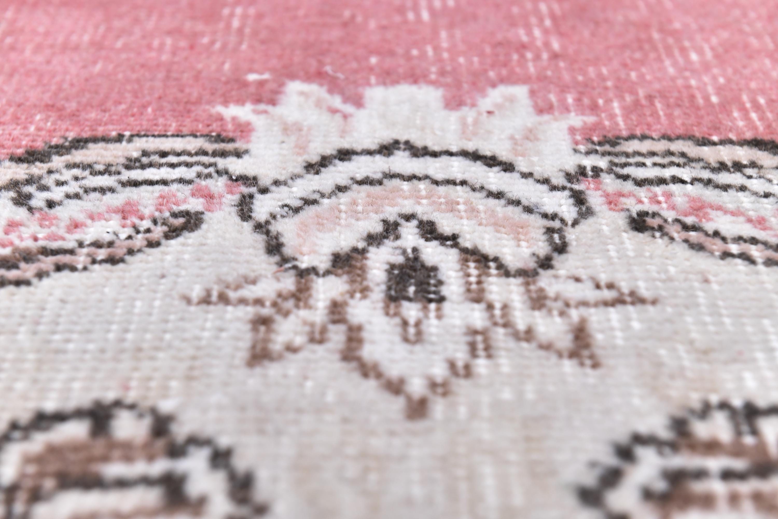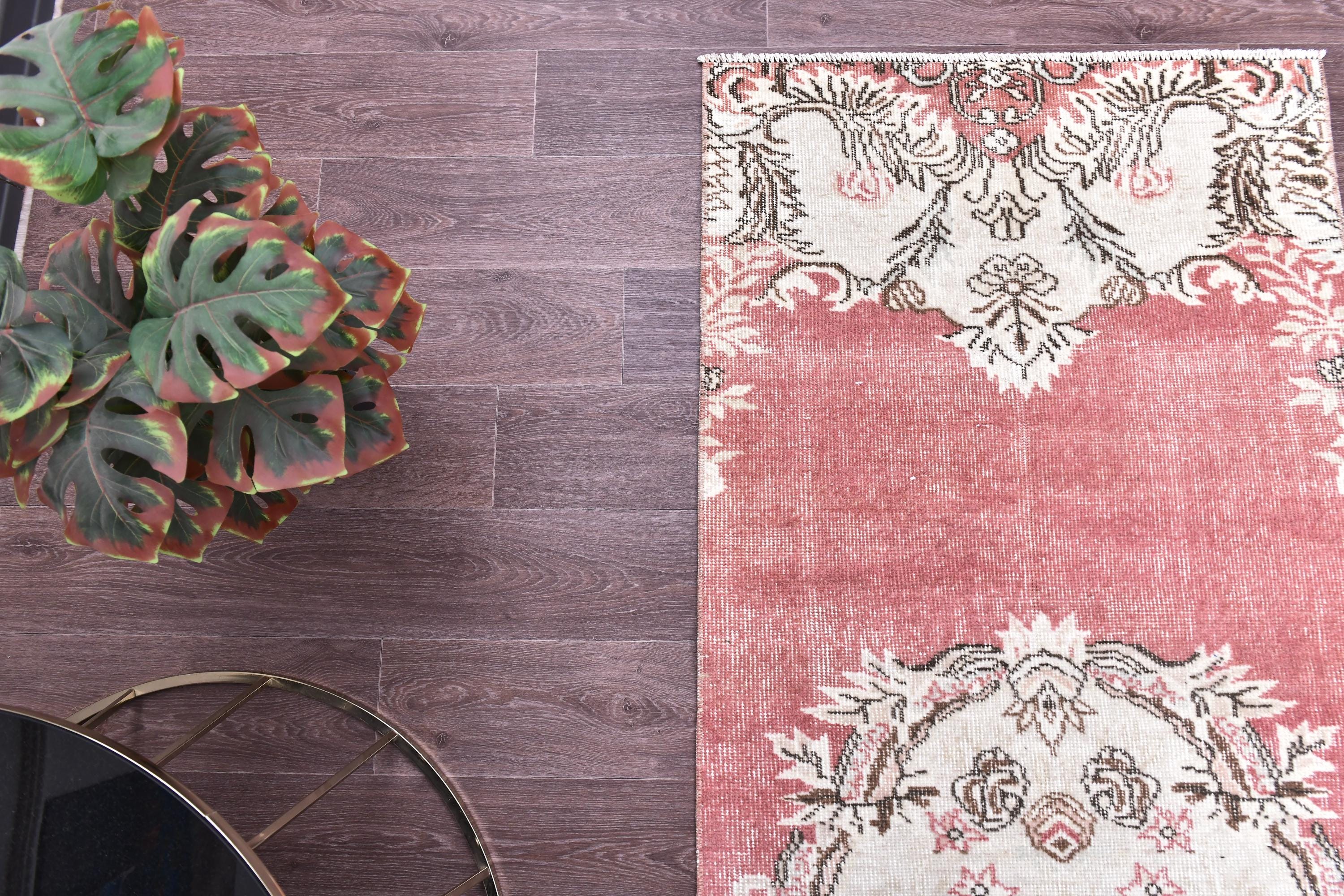 📜📌 Antique Anatolian tribal runner carpet in muted earth tones of taupe, gray, cream and soft pink accents, showcasing repeating diamond medallions with coral and navy centers, surrounded by traditional Greek meander borders, exhibiting authentic age-related wear and faded patina on hand-woven wool