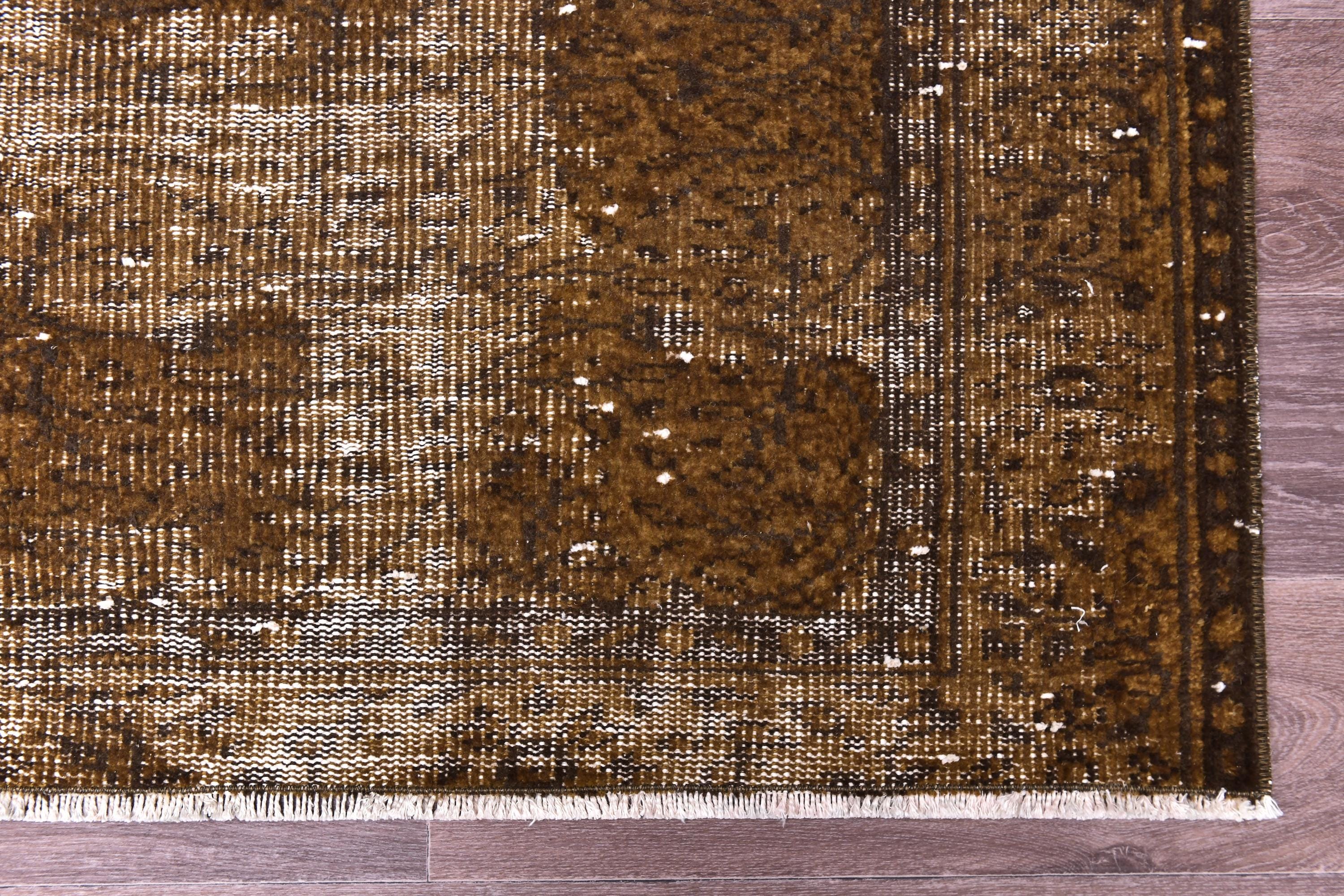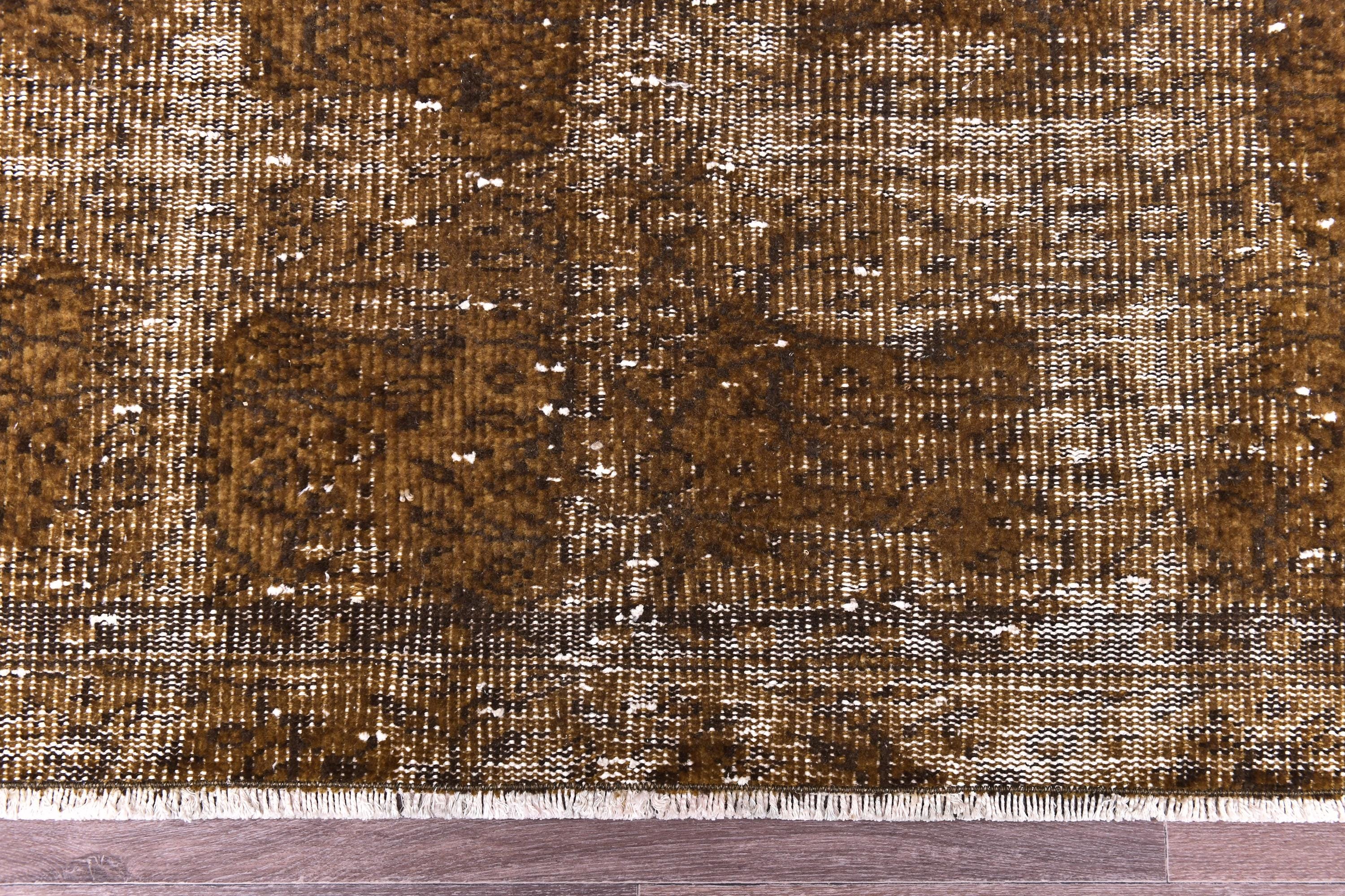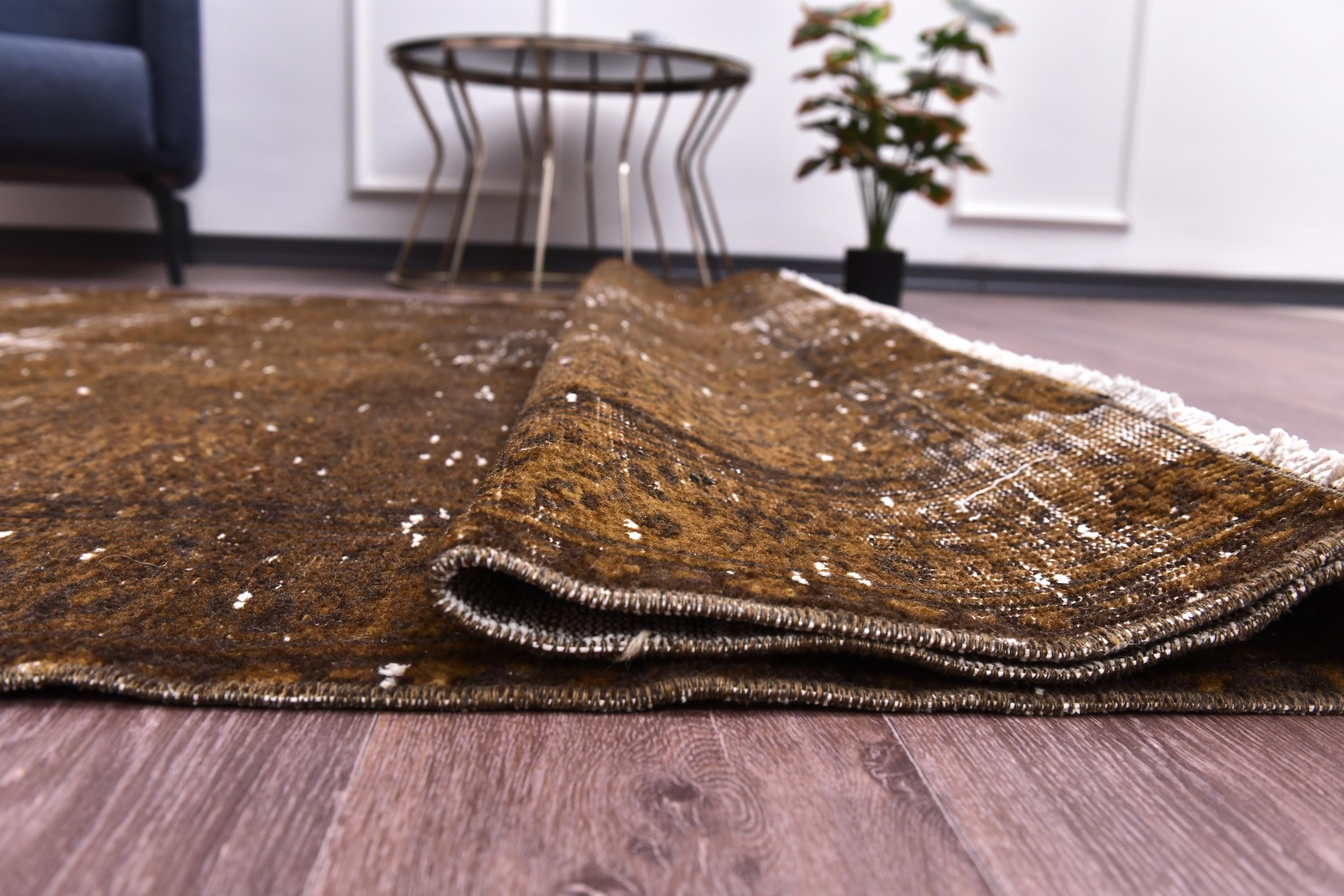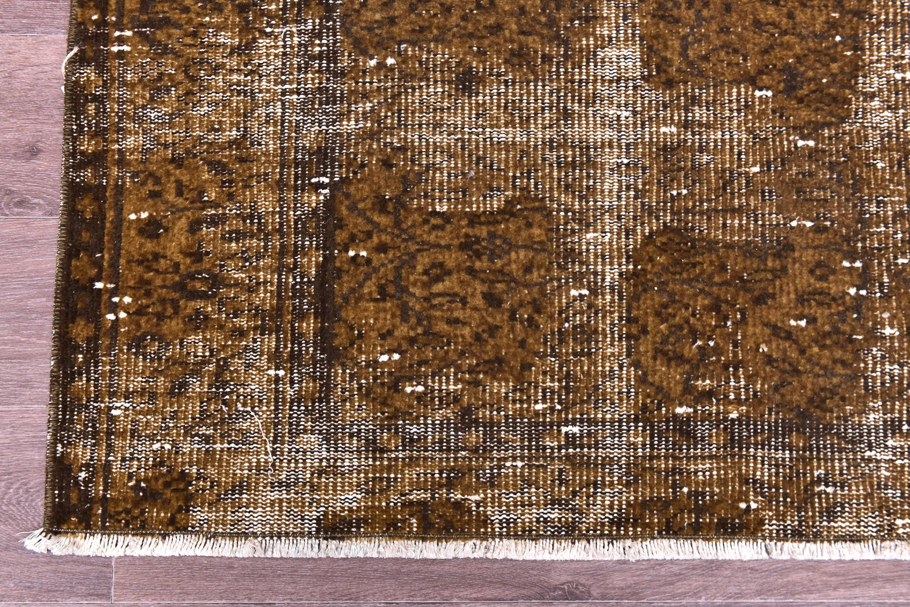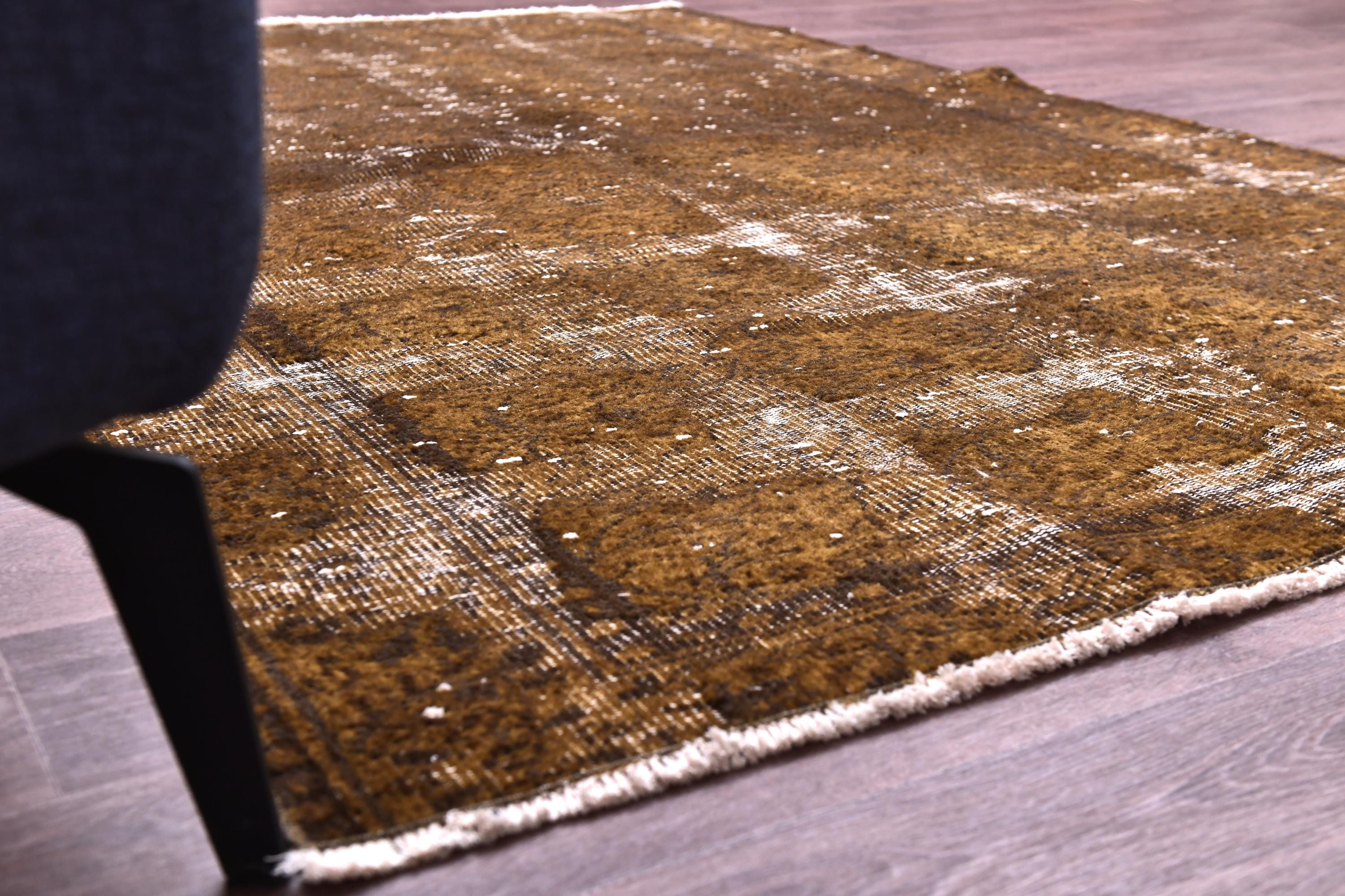📜📌 Vintage overdyed area rug featuring golden mustard and brown tones with distressed floral medallion patterns throughout. Hand-knotted wool carpet with weathered appearance, cream-colored abrash effects, and traditional Oriental border design. Perfect for bohemian or eclectic interior spaces.