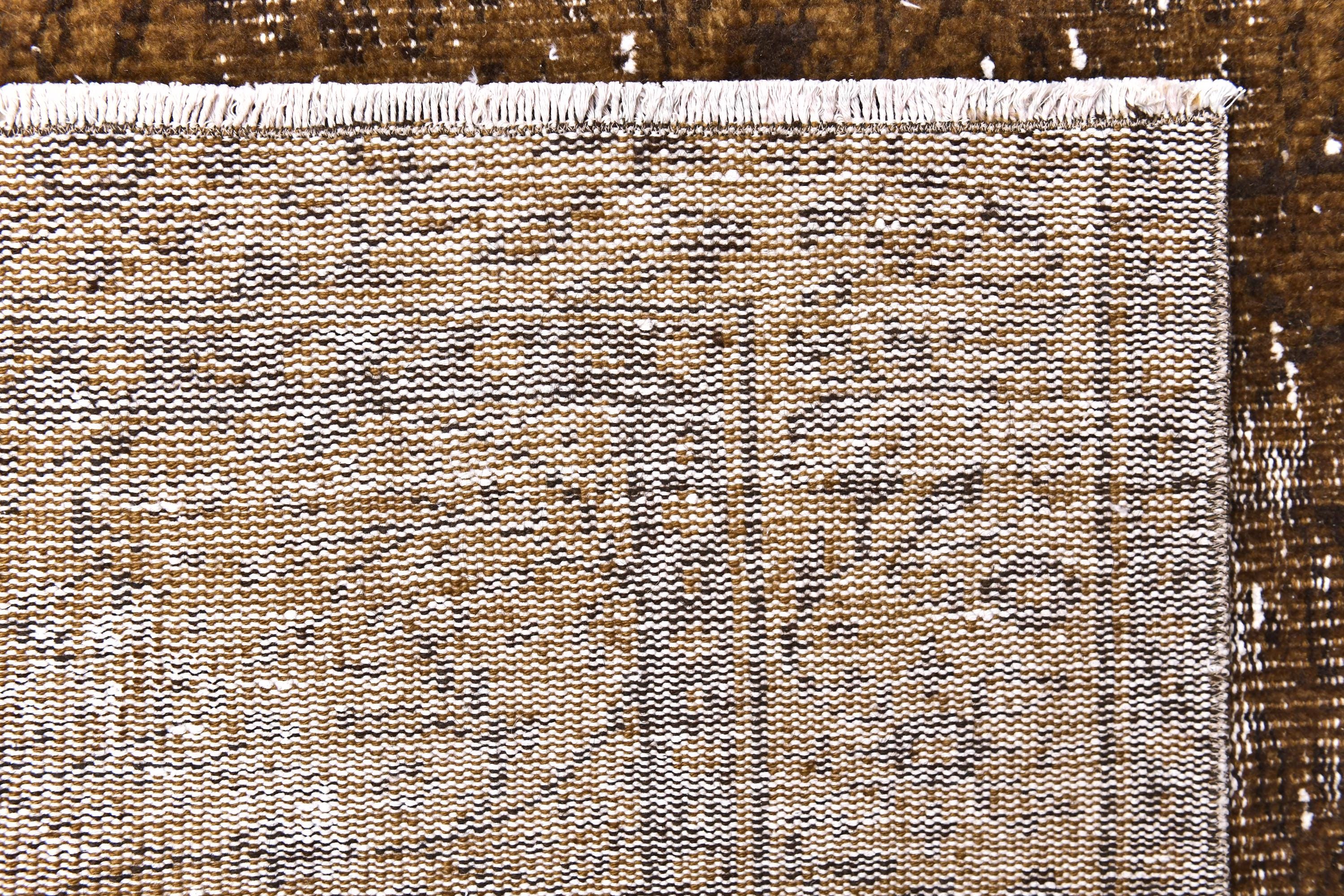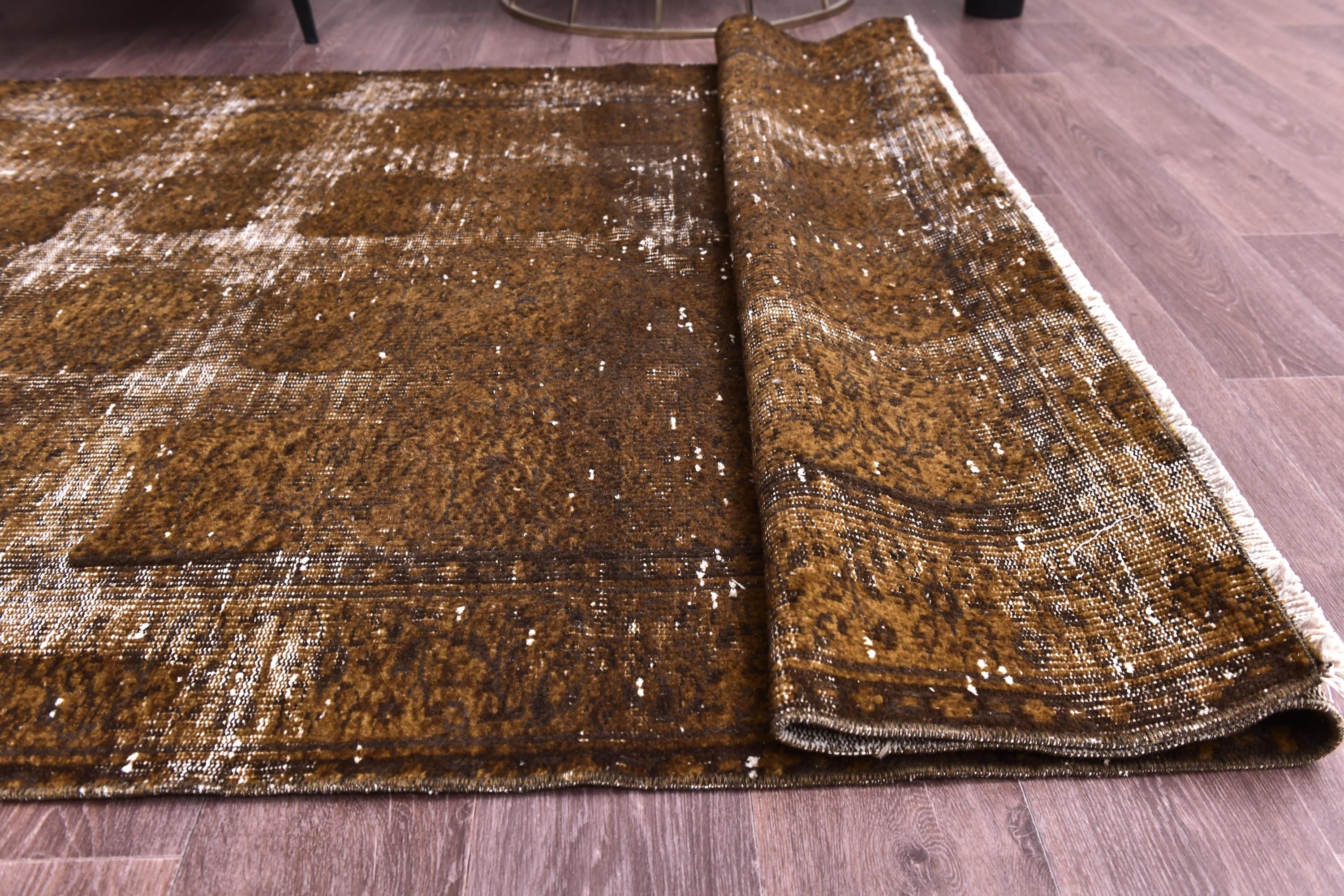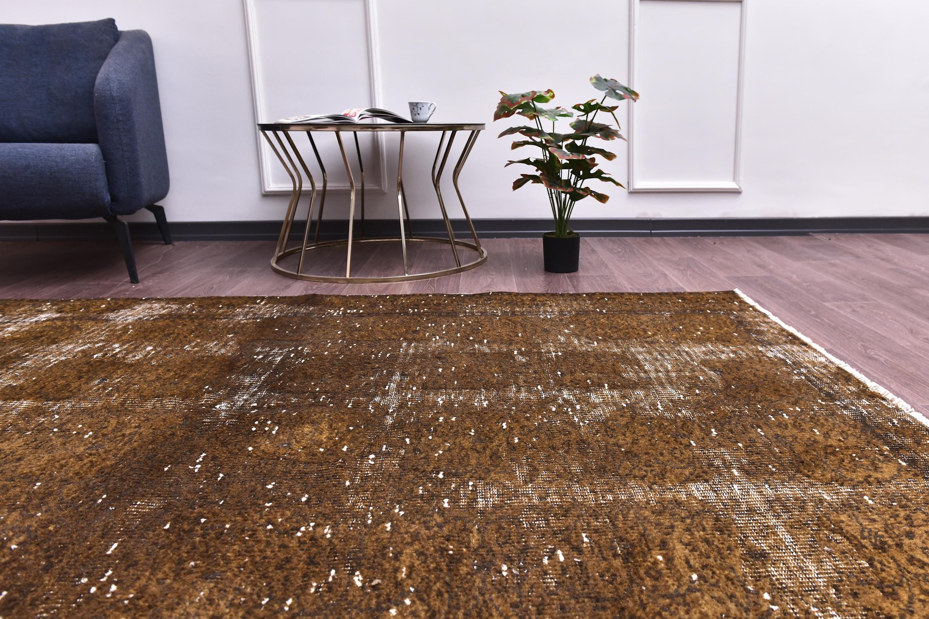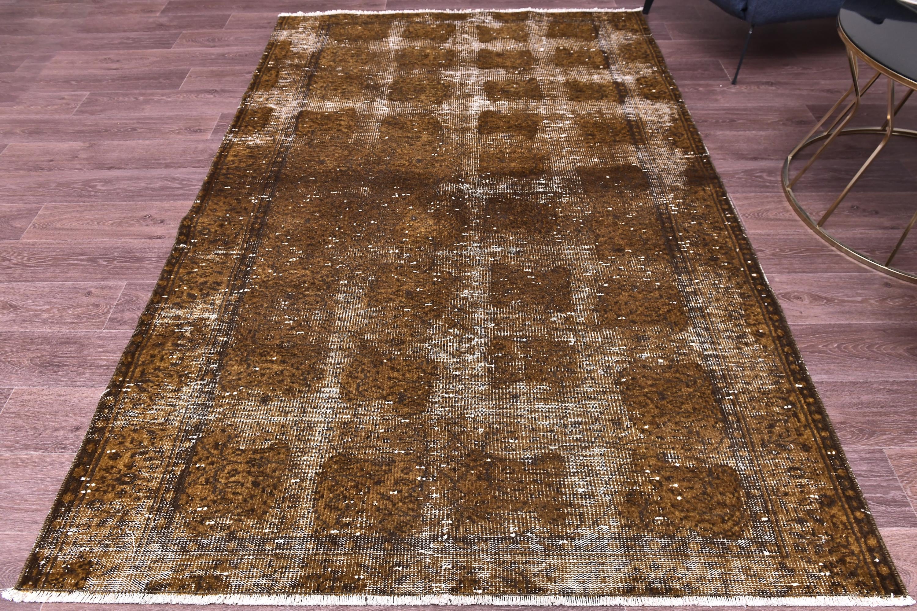 📜📌 Vintage overdyed area rug featuring golden mustard and brown tones with distressed floral medallion patterns throughout. Hand-knotted wool carpet with weathered appearance, cream-colored abrash effects, and traditional Oriental border design. Perfect for bohemian or eclectic interior spaces.