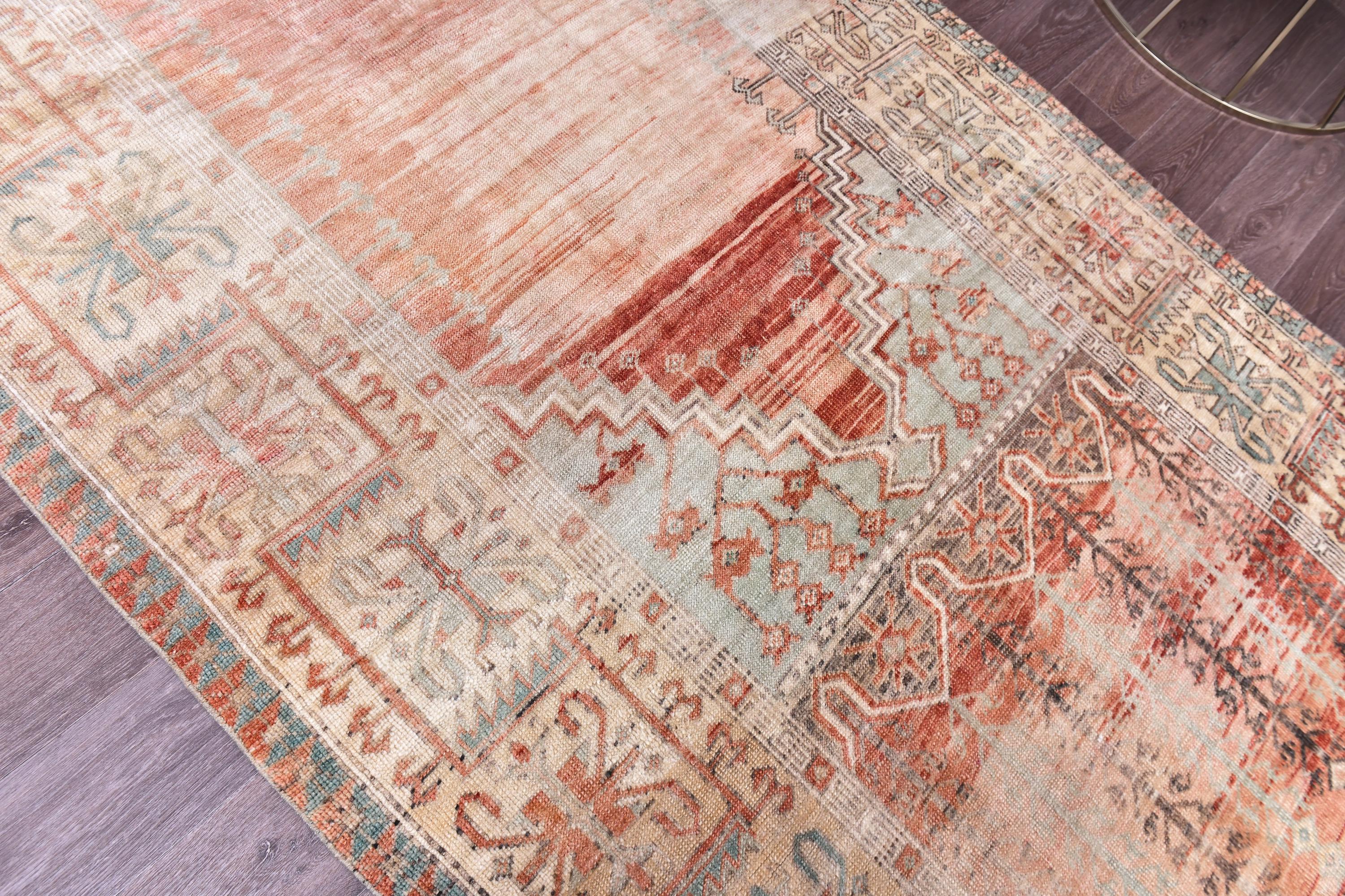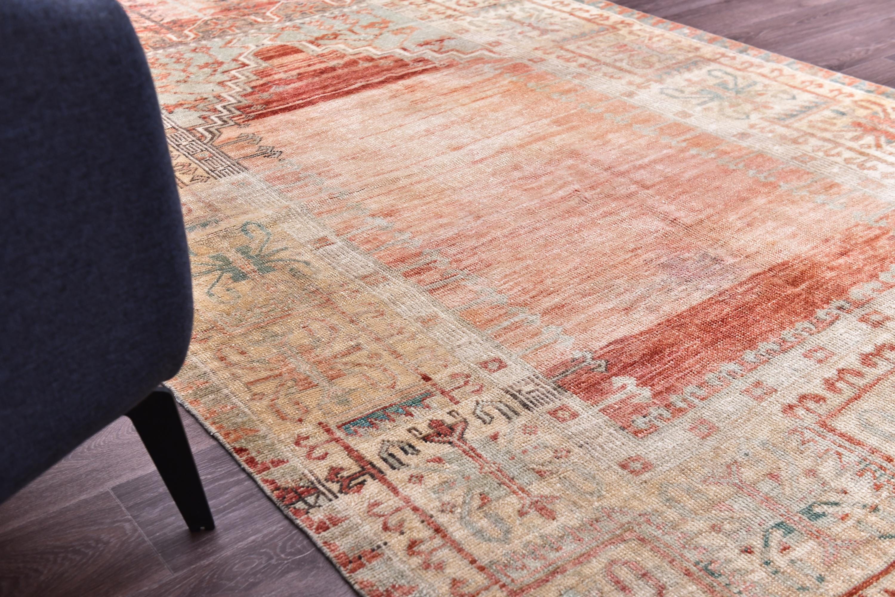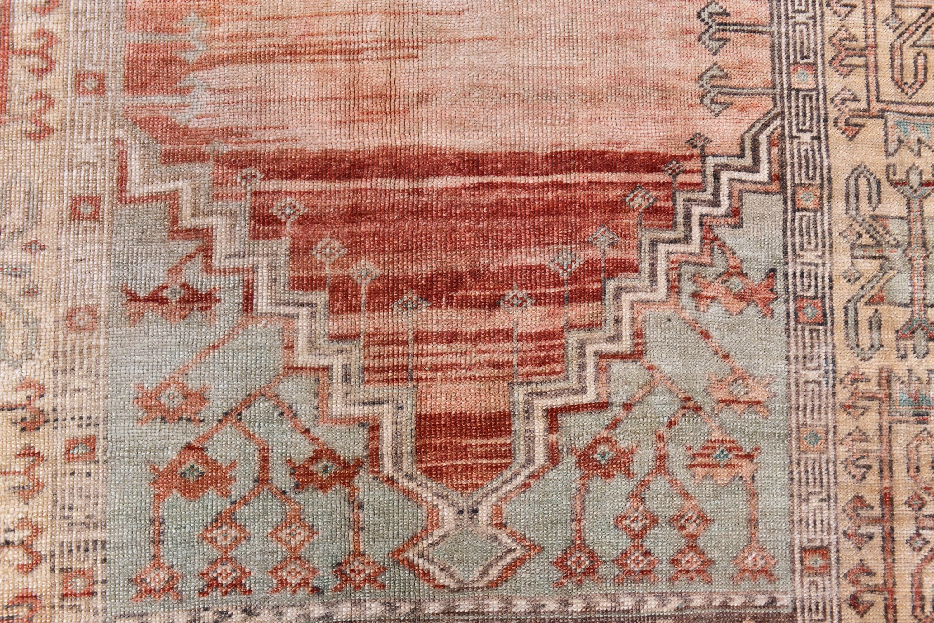📜📌 Antique Anatolian prayer carpet showcasing iconic mosque prayer niche mihrab with stepped pyramid design in muted terracotta and beige palette, embellished with stylized botanical motifs and meandering Greek fret borders, exhibiting natural age-related patina and faded colors characteristic of genuine vintage Islamic religious rugs