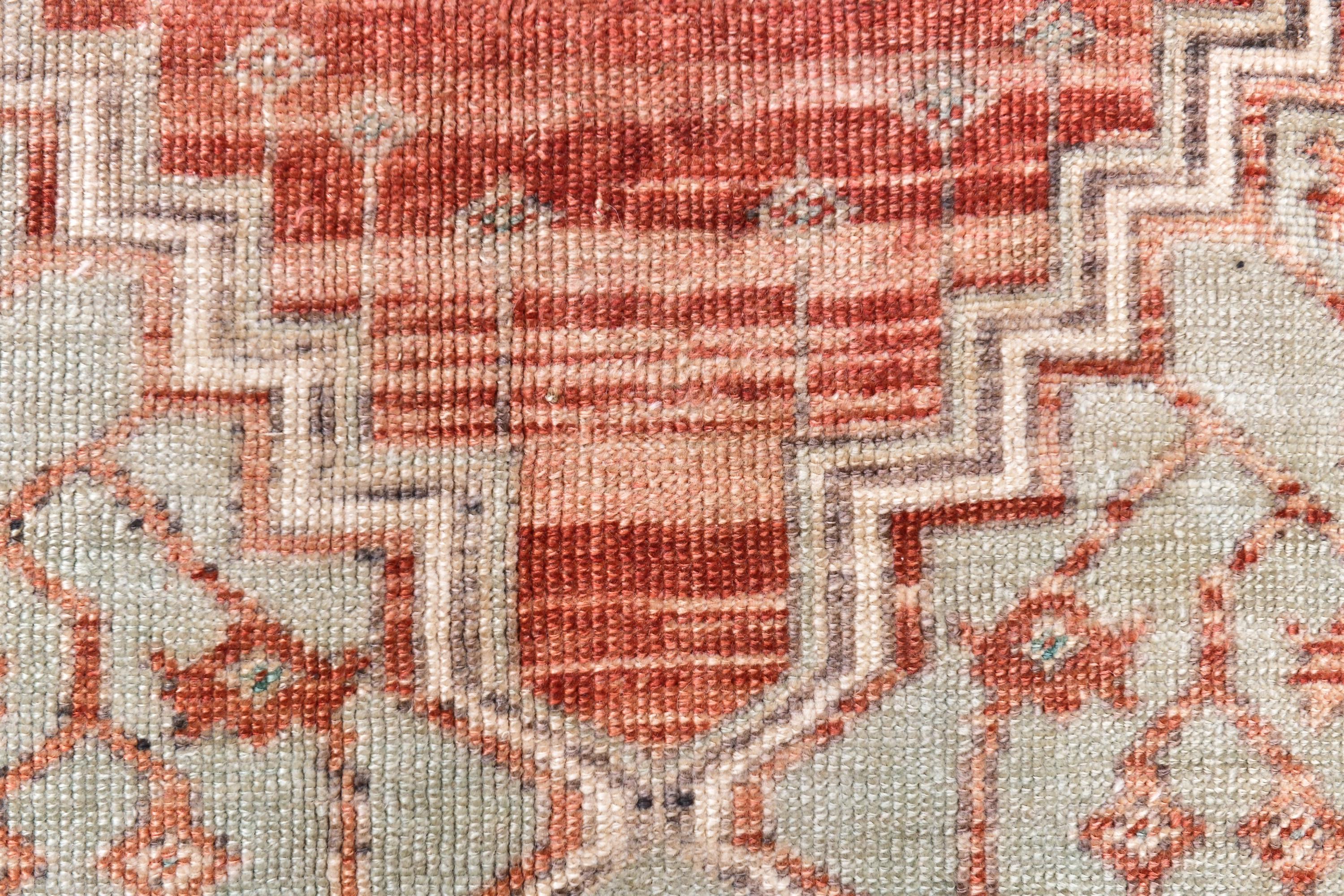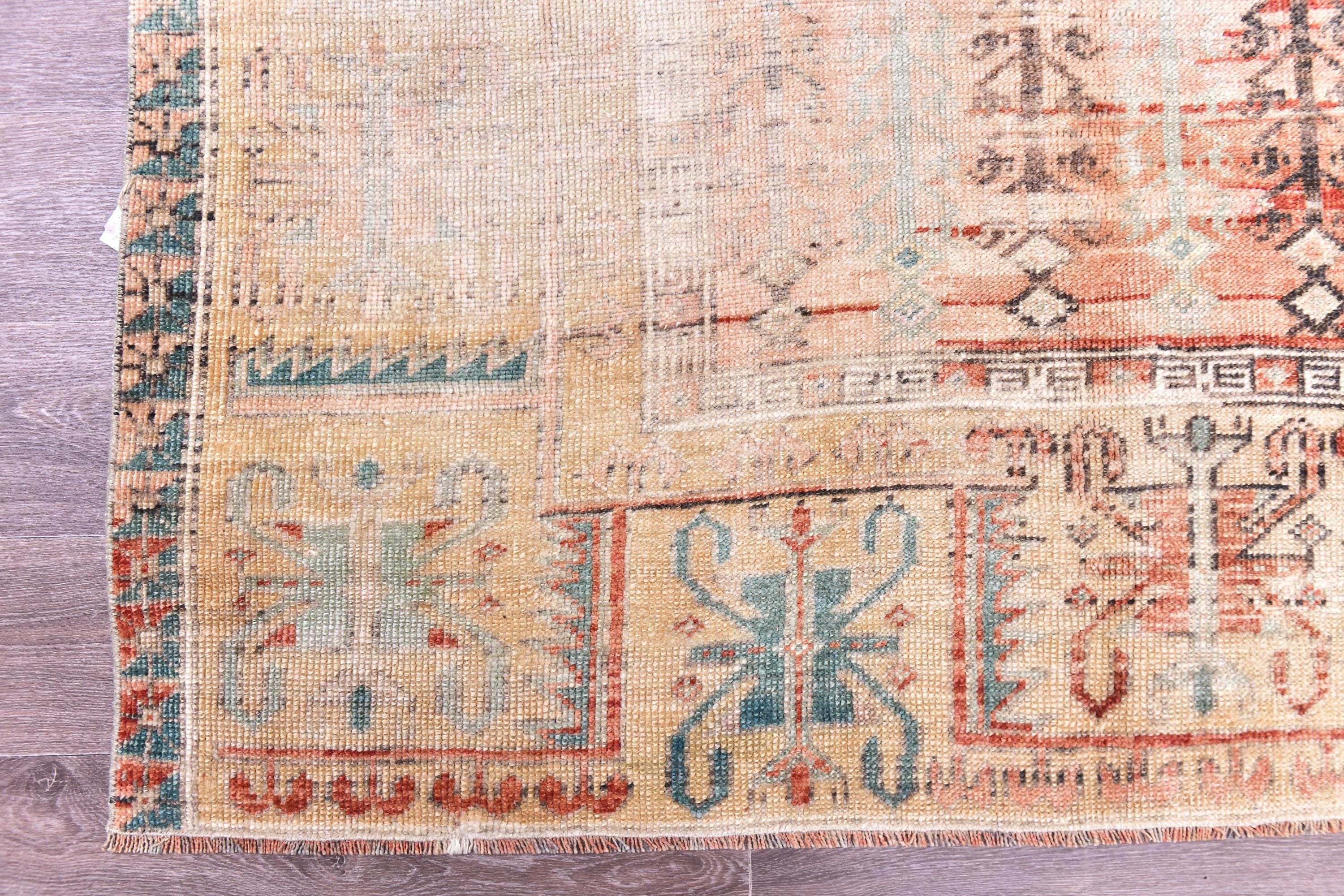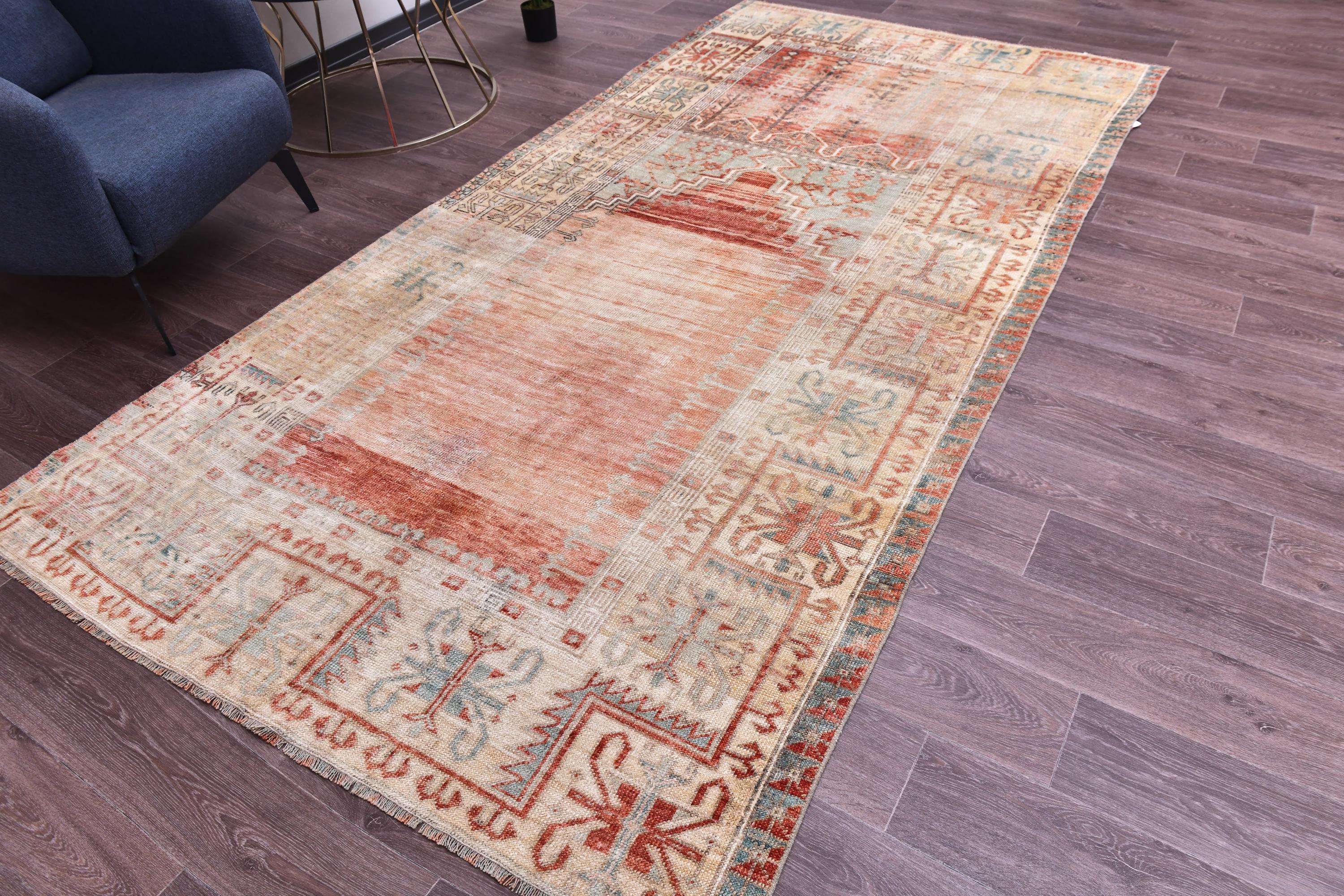 📜📌 Antique Anatolian prayer carpet showcasing iconic mosque prayer niche mihrab with stepped pyramid design in muted terracotta and beige palette, embellished with stylized botanical motifs and meandering Greek fret borders, exhibiting natural age-related patina and faded colors characteristic of genuine vintage Islamic religious rugs