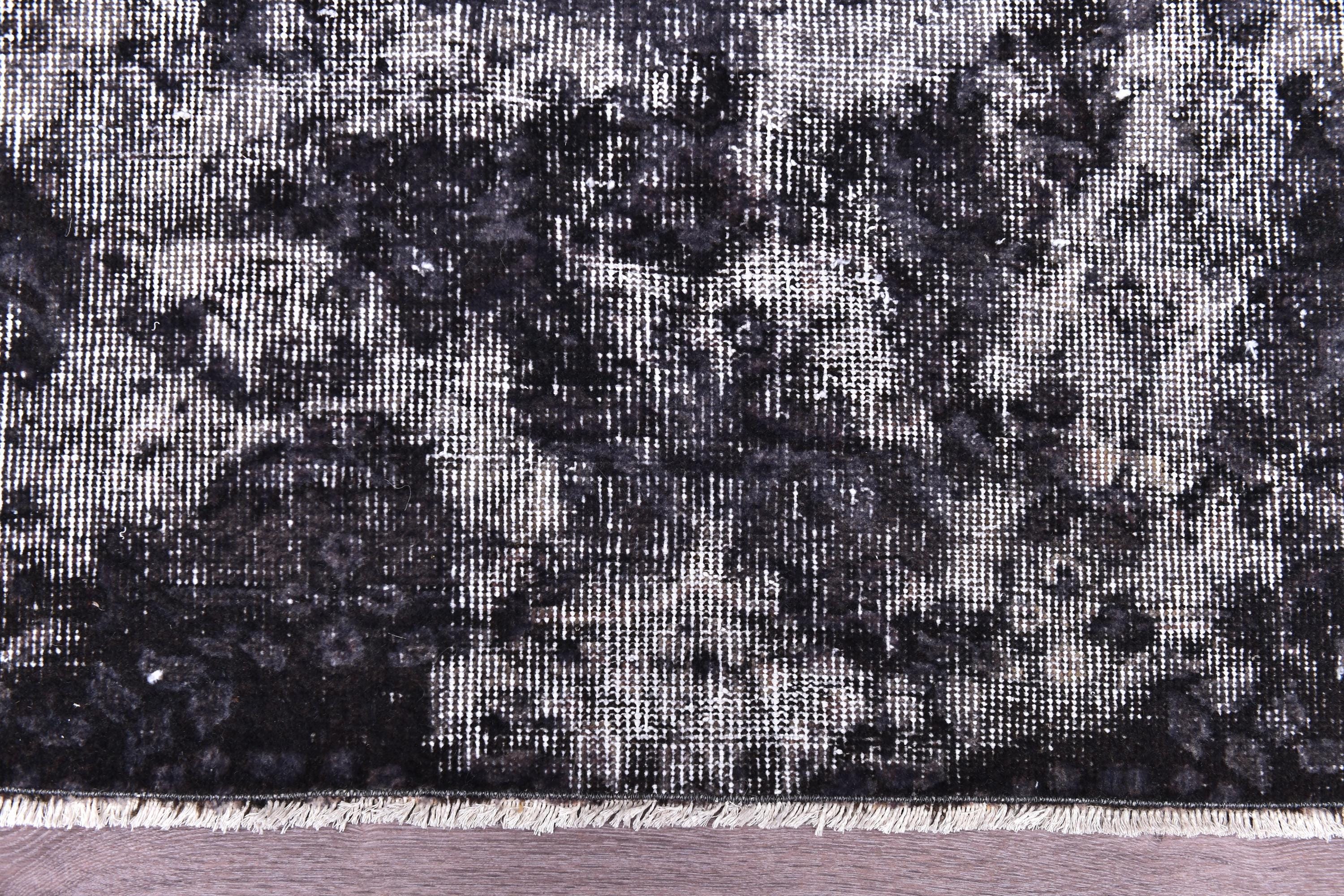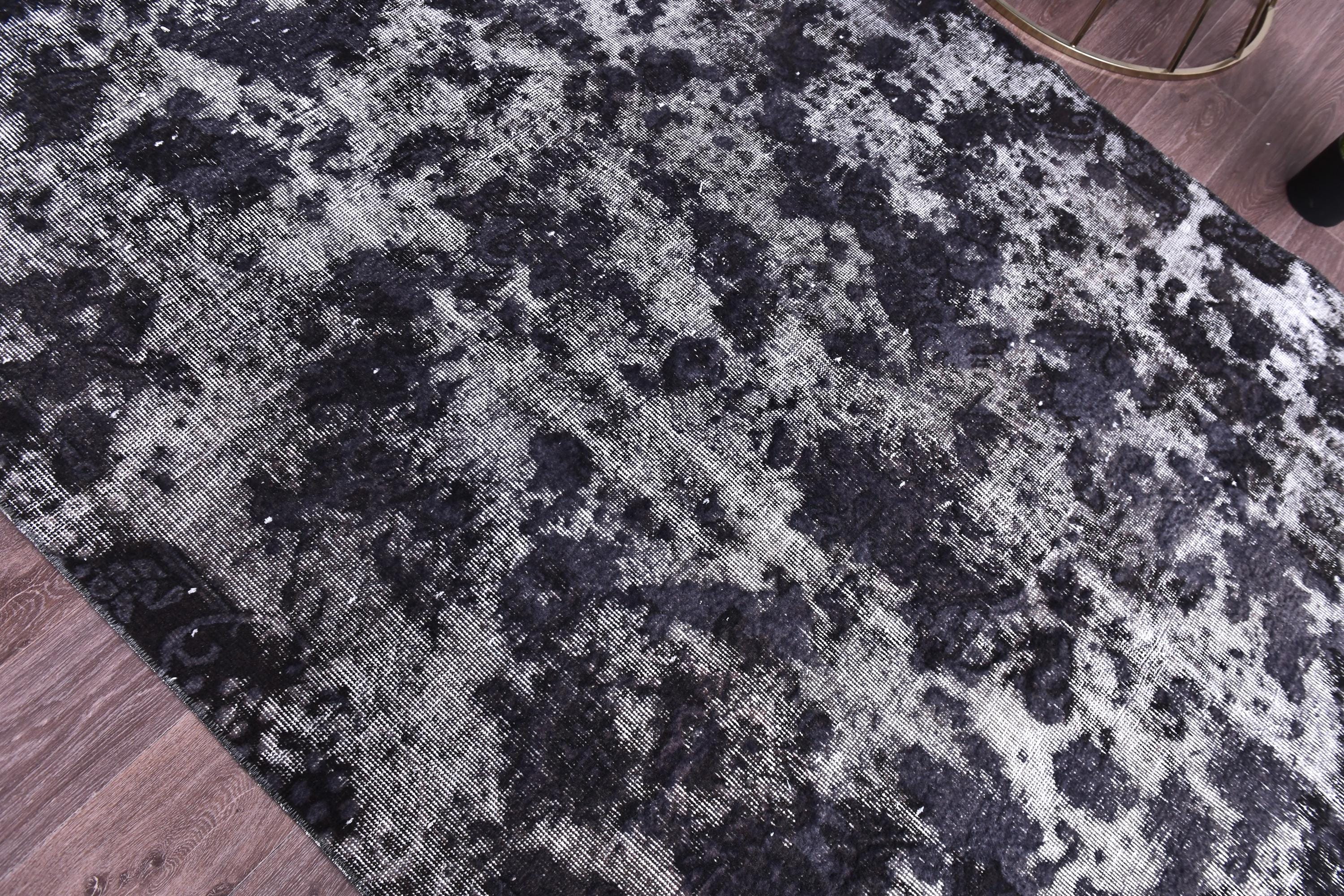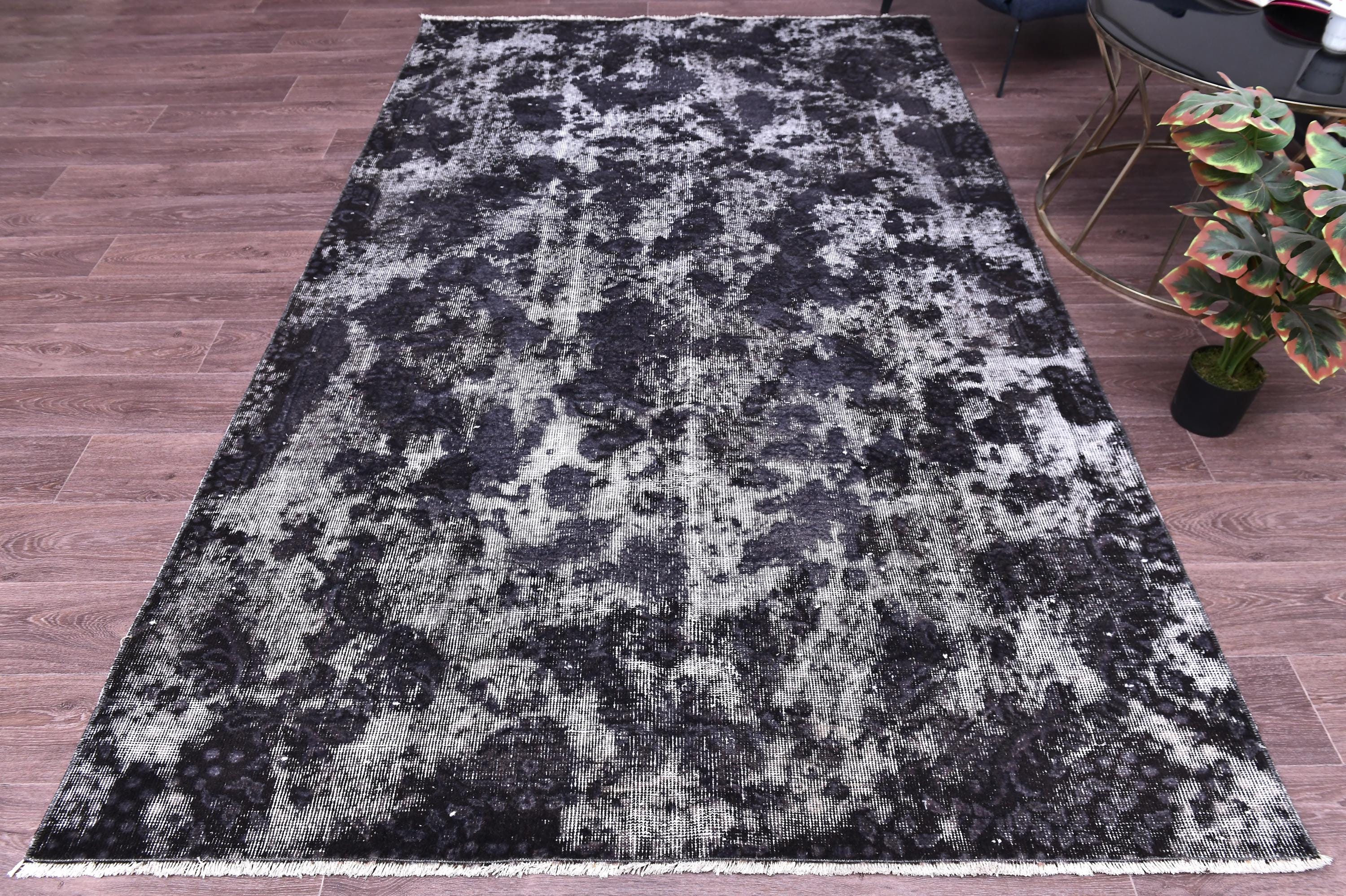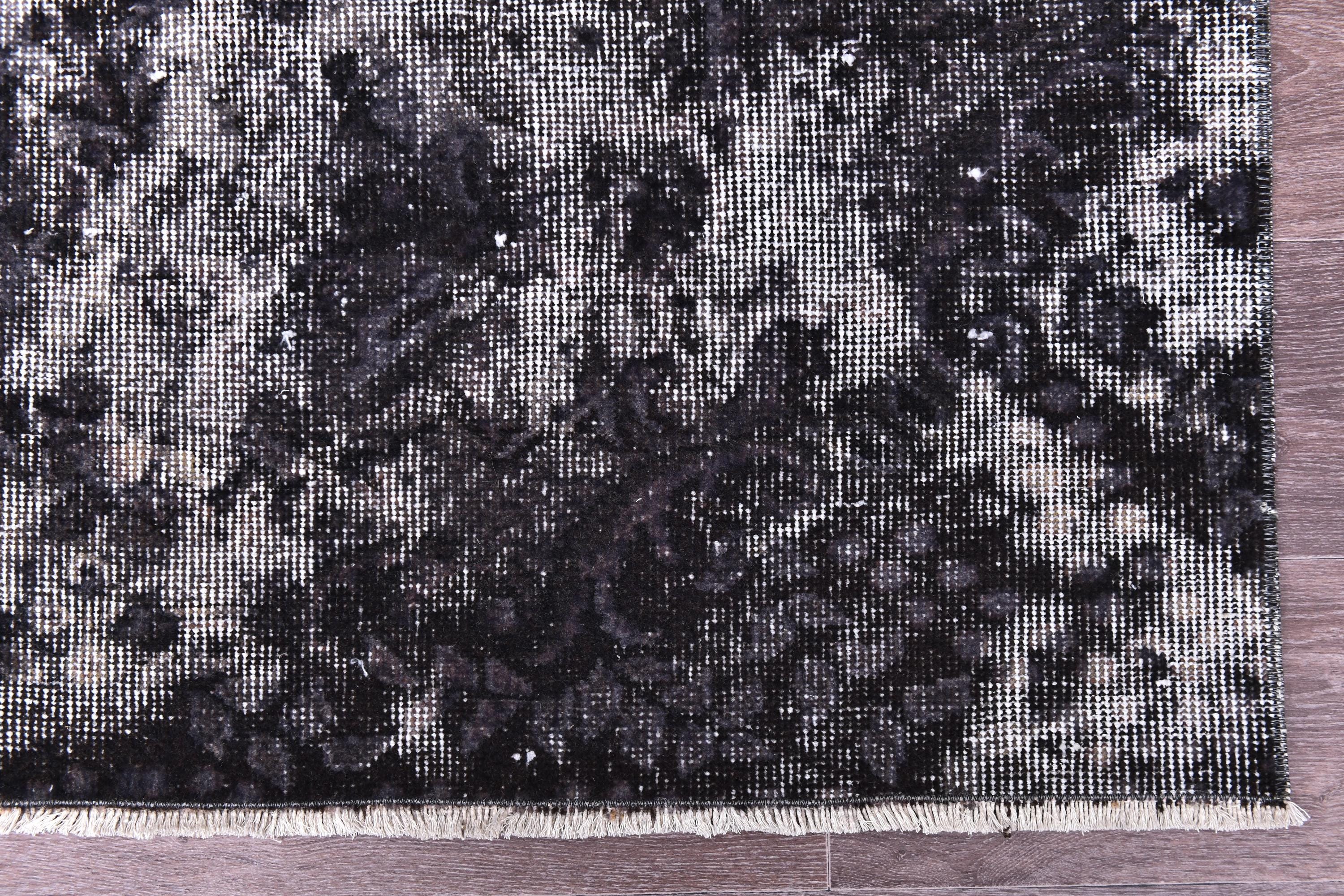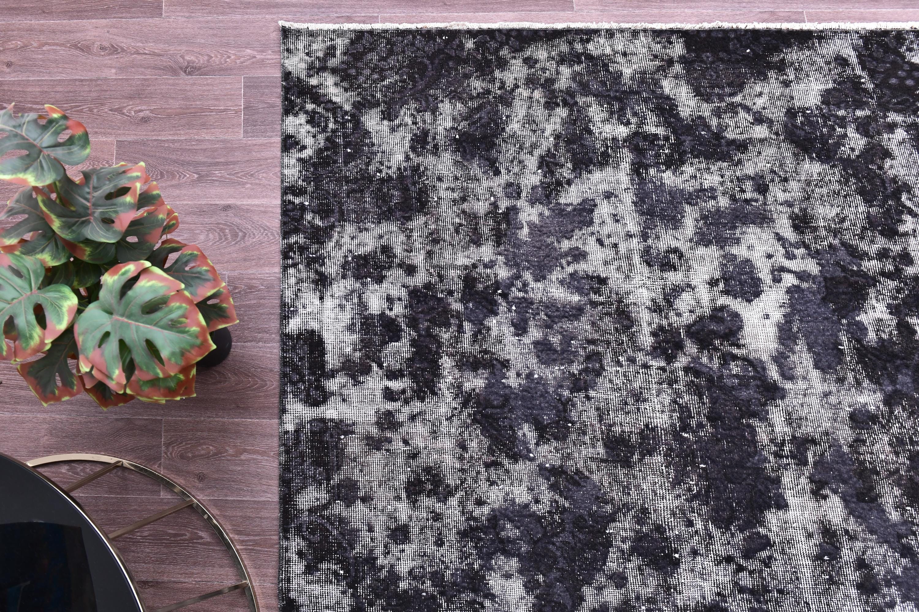 📜📌 Overdyed vintage Turkish rug in dramatic black and charcoal gray tones with distressed abstract pattern showing through faded design, handwoven wool with worn patina creating modern industrial aesthetic on gray wood flooring