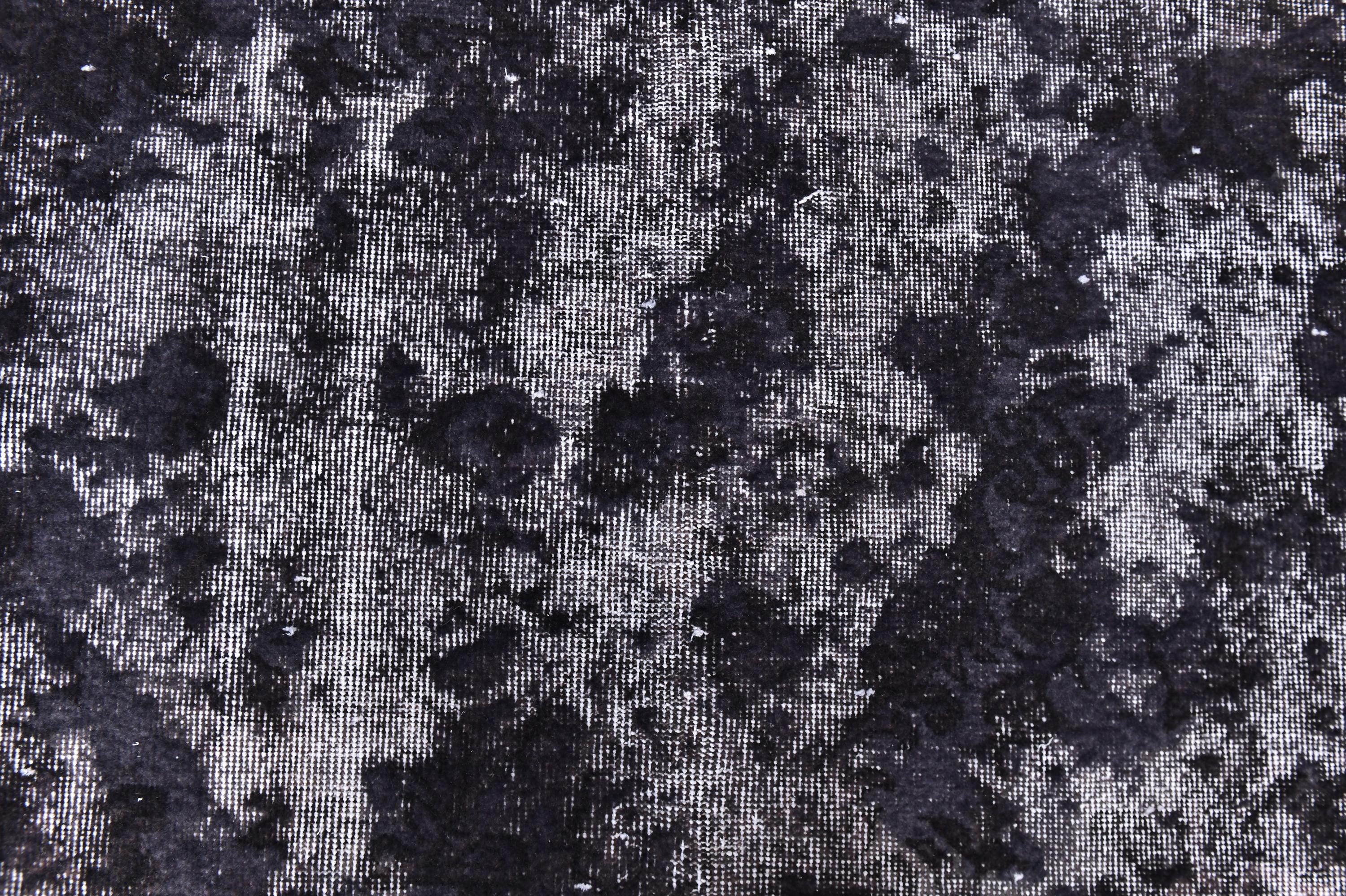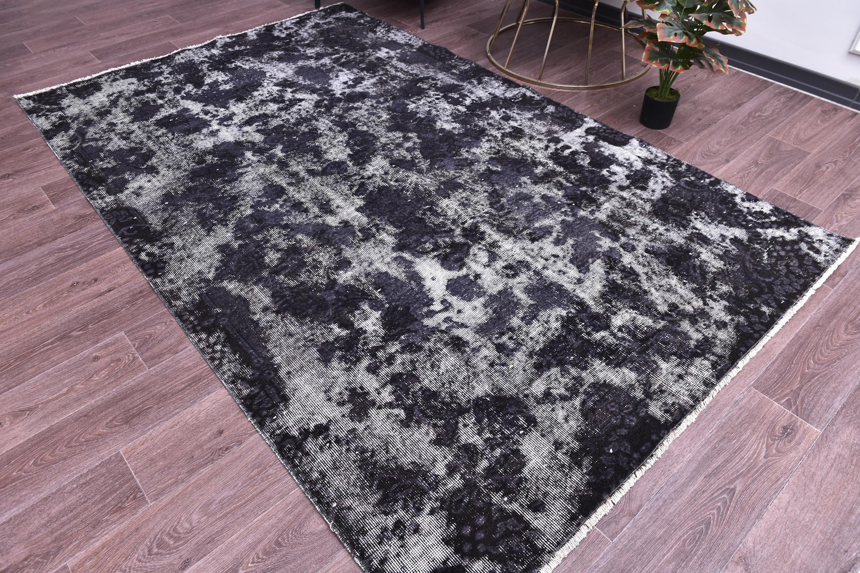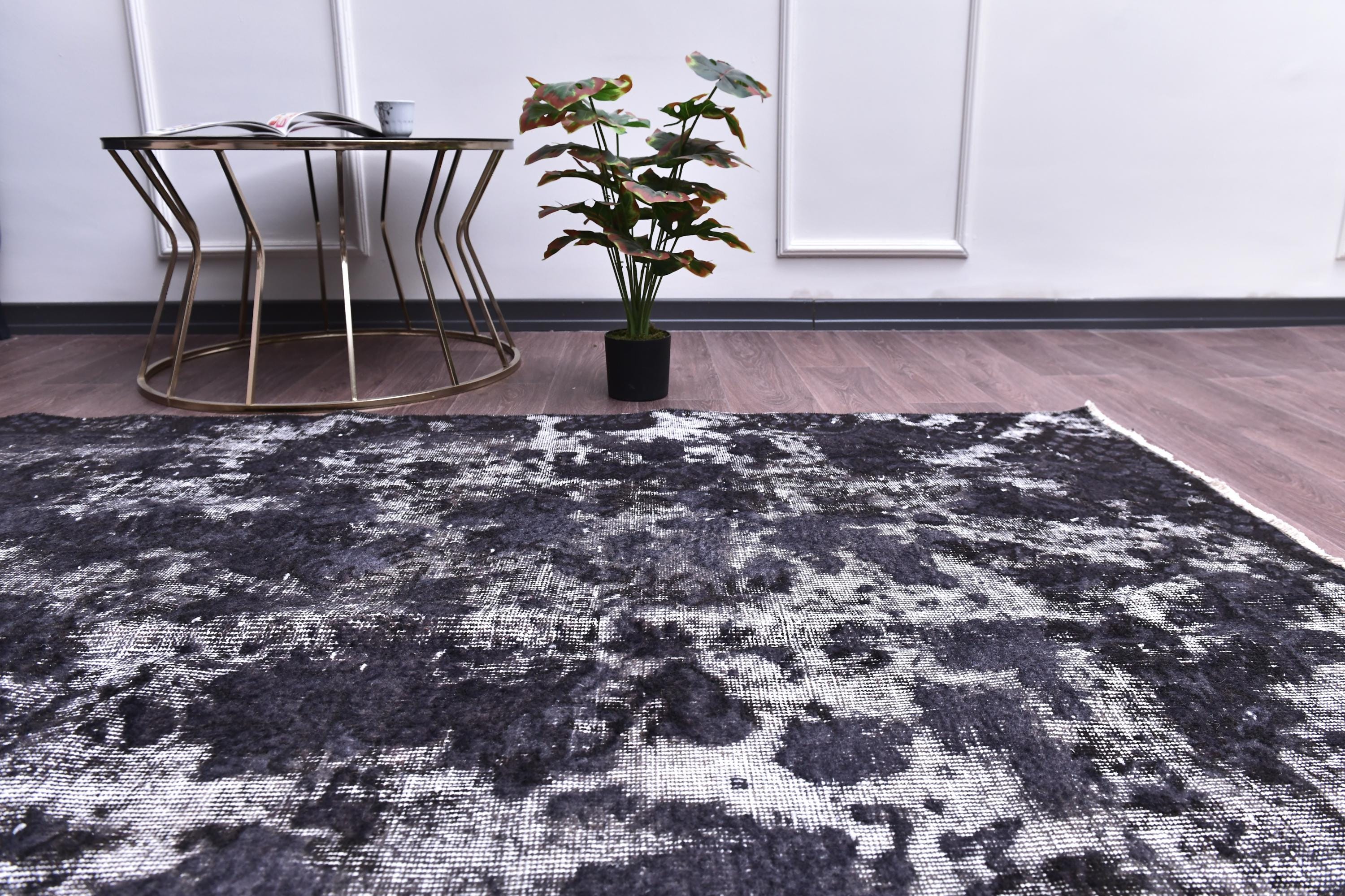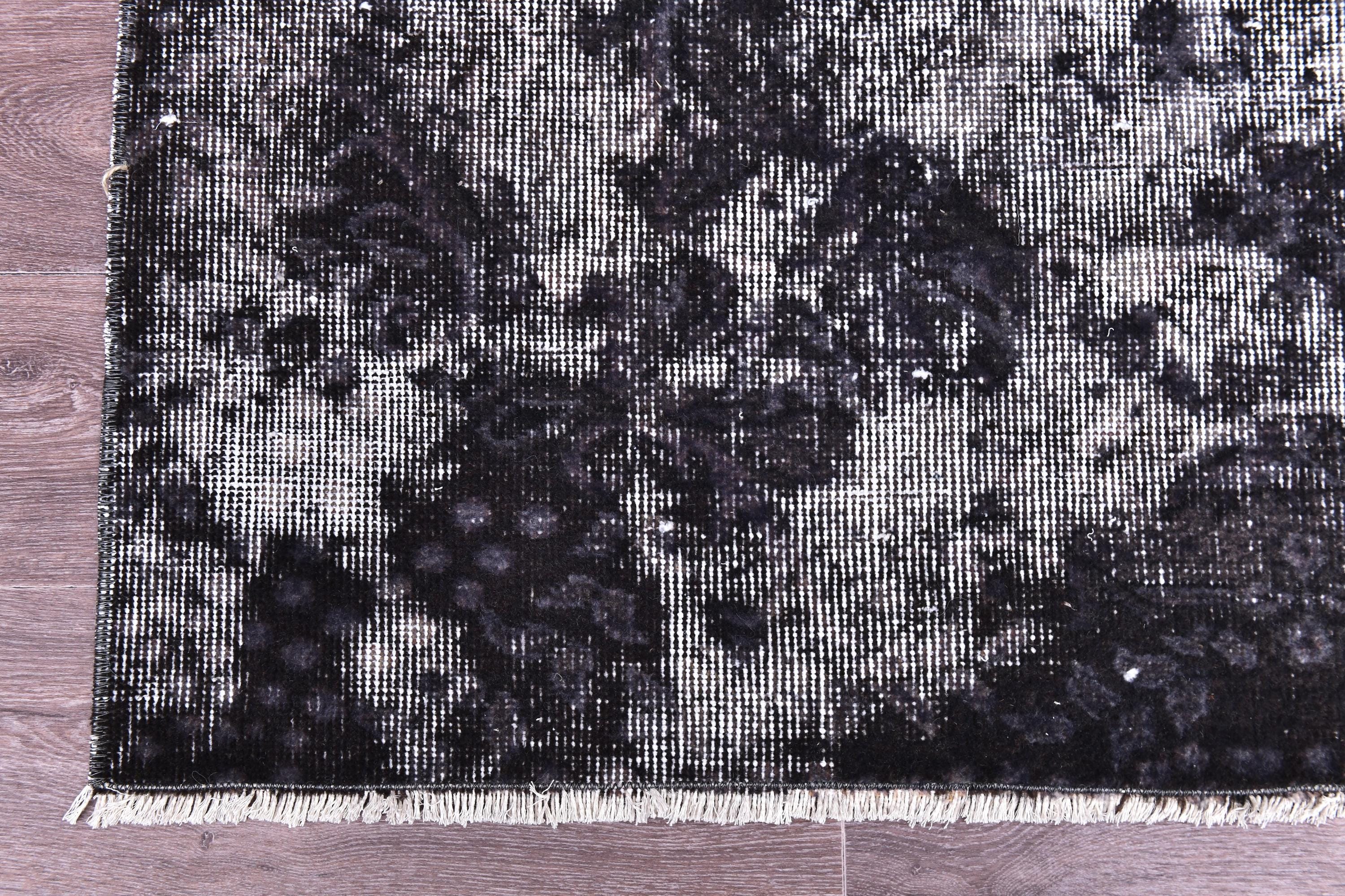 📜📌 Overdyed vintage Turkish rug in dramatic black and charcoal gray tones with distressed abstract pattern showing through faded design, handwoven wool with worn patina creating modern industrial aesthetic on gray wood flooring