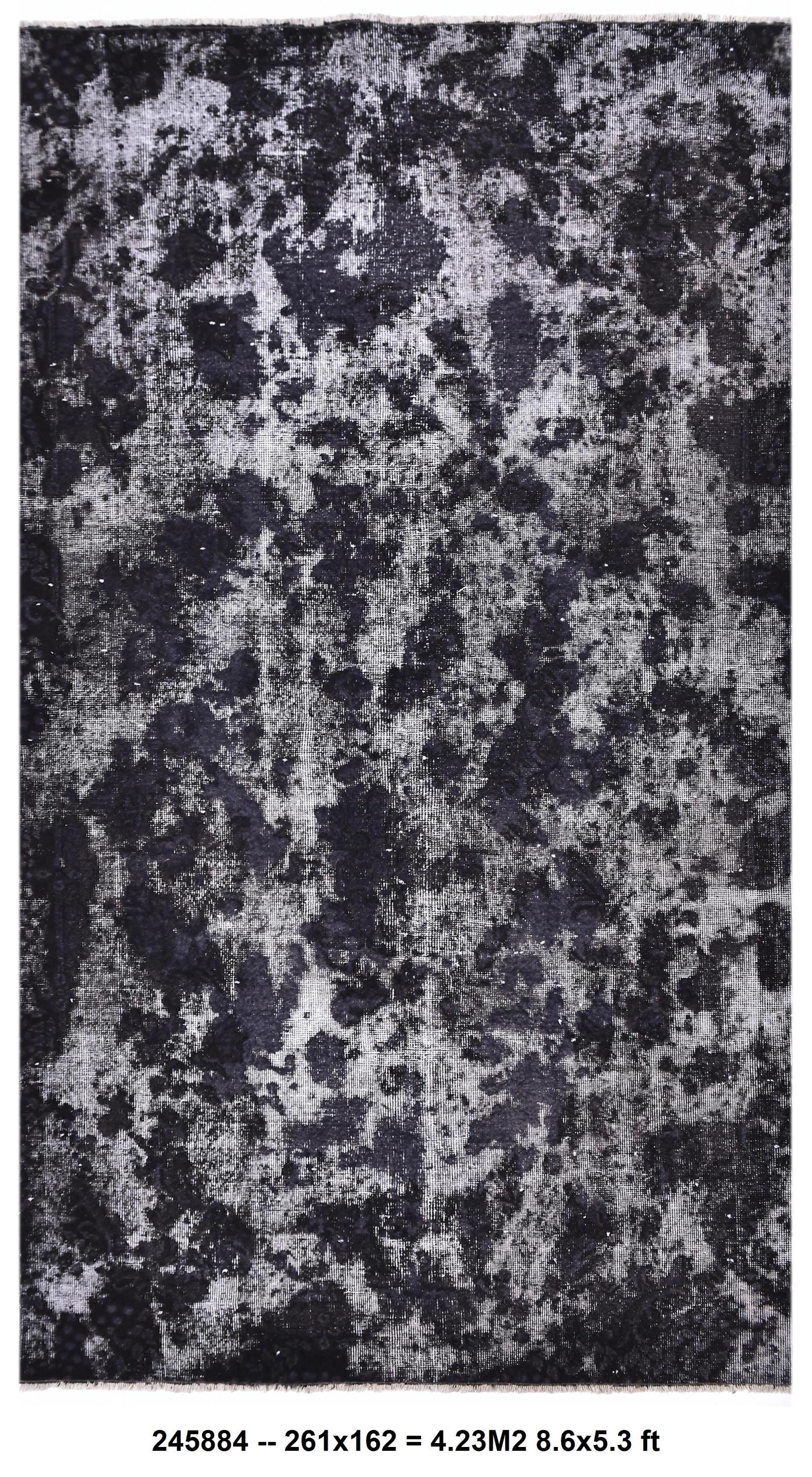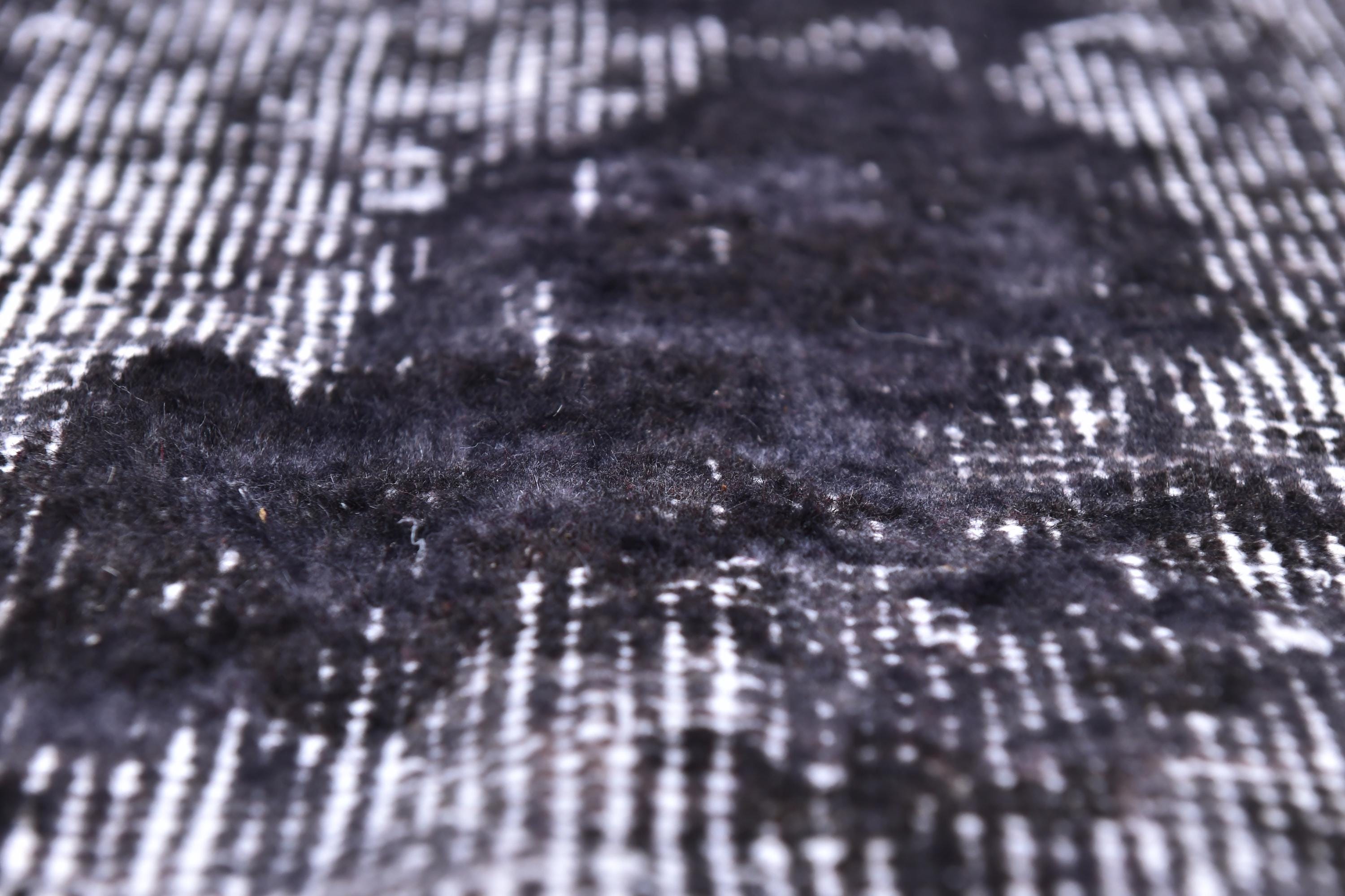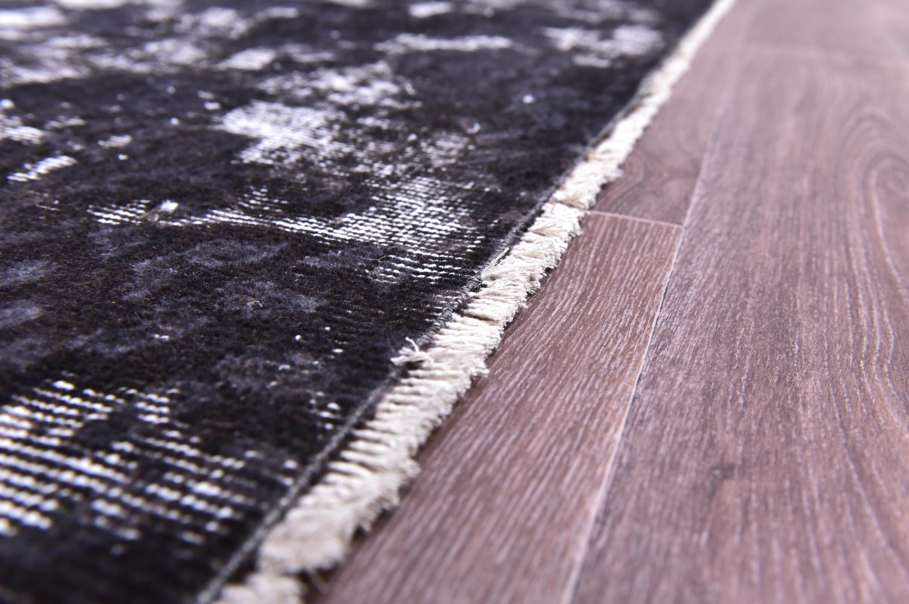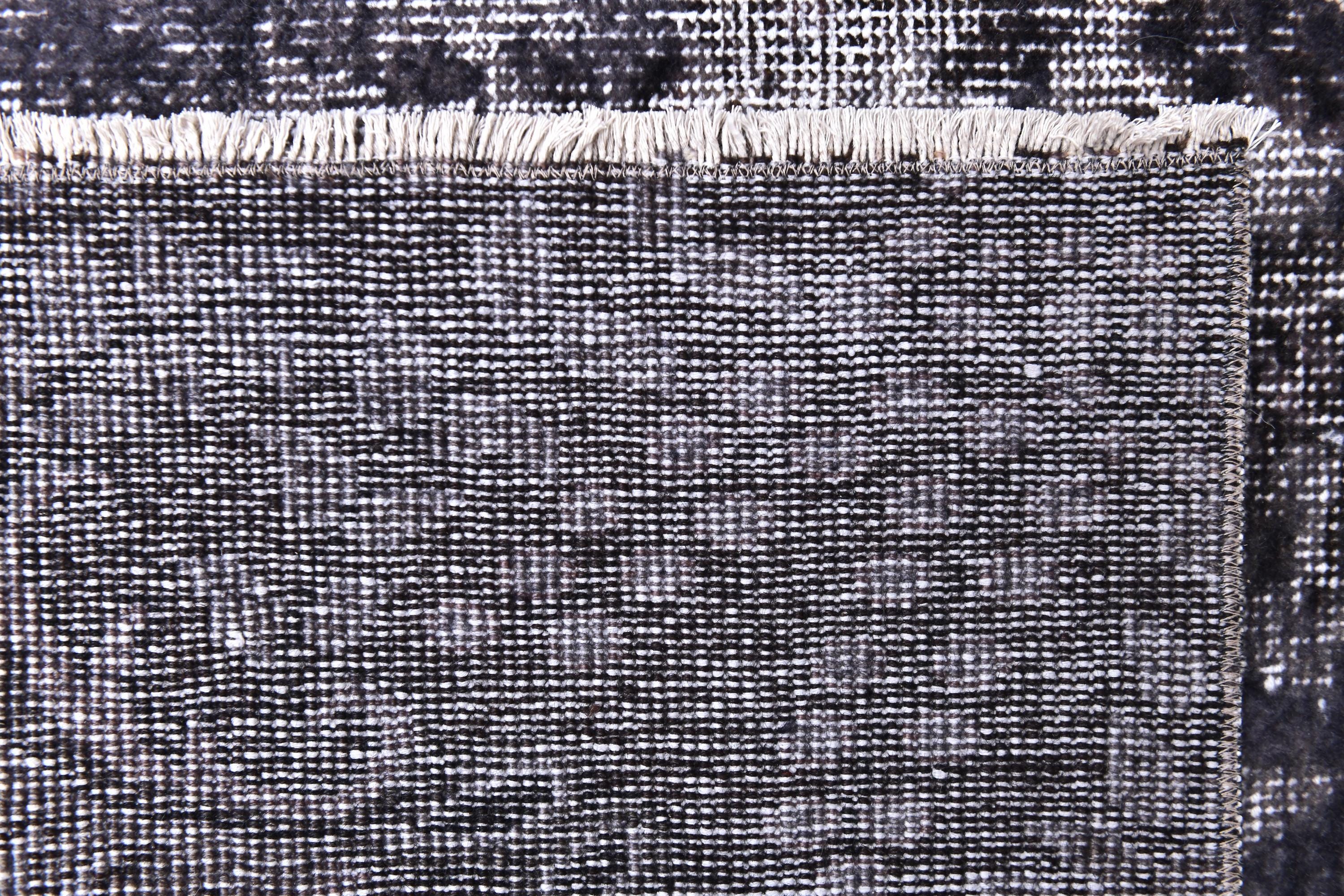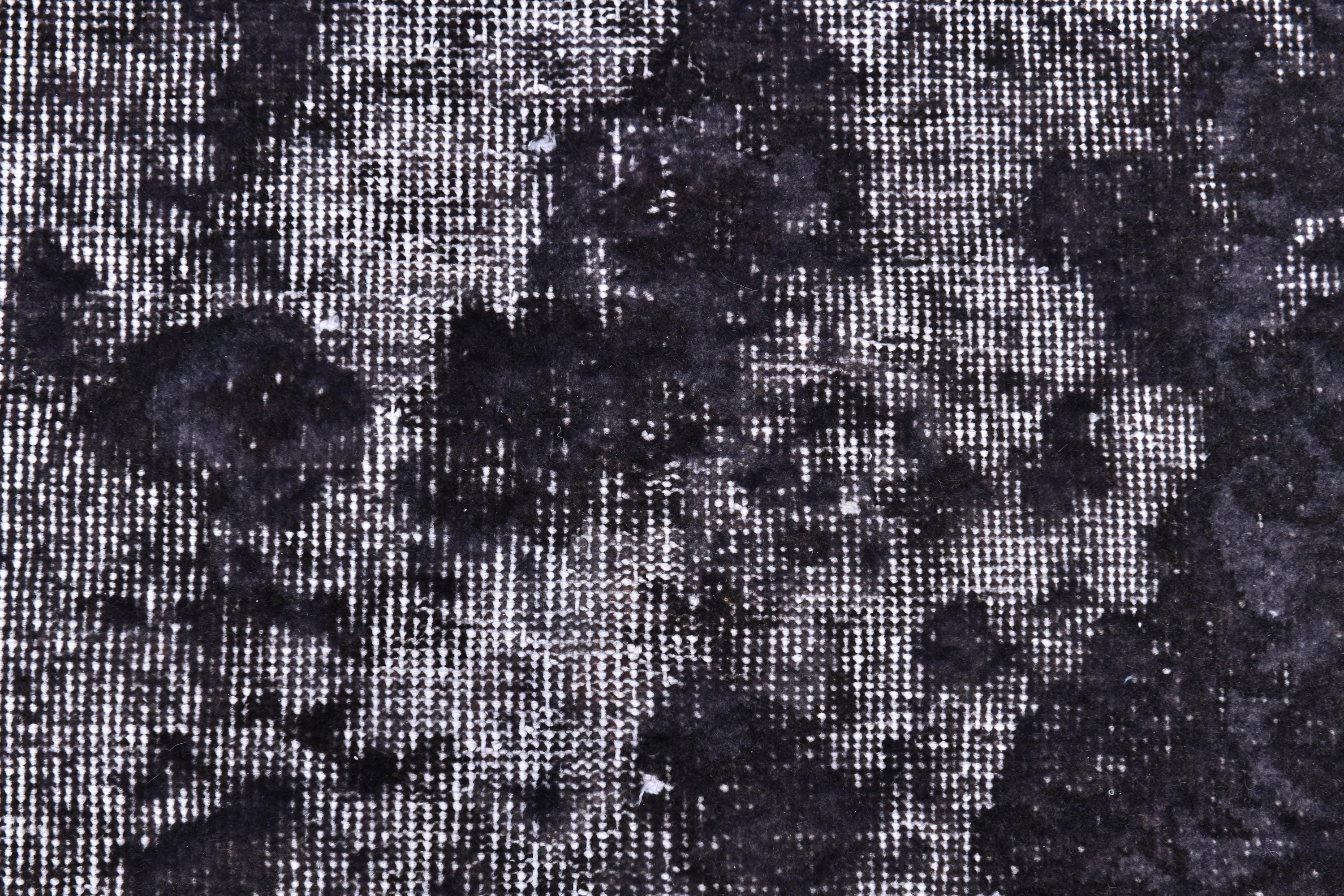 📜📌 Overdyed vintage Turkish rug in dramatic black and charcoal gray tones with distressed abstract pattern showing through faded design, handwoven wool with worn patina creating modern industrial aesthetic on gray wood flooring