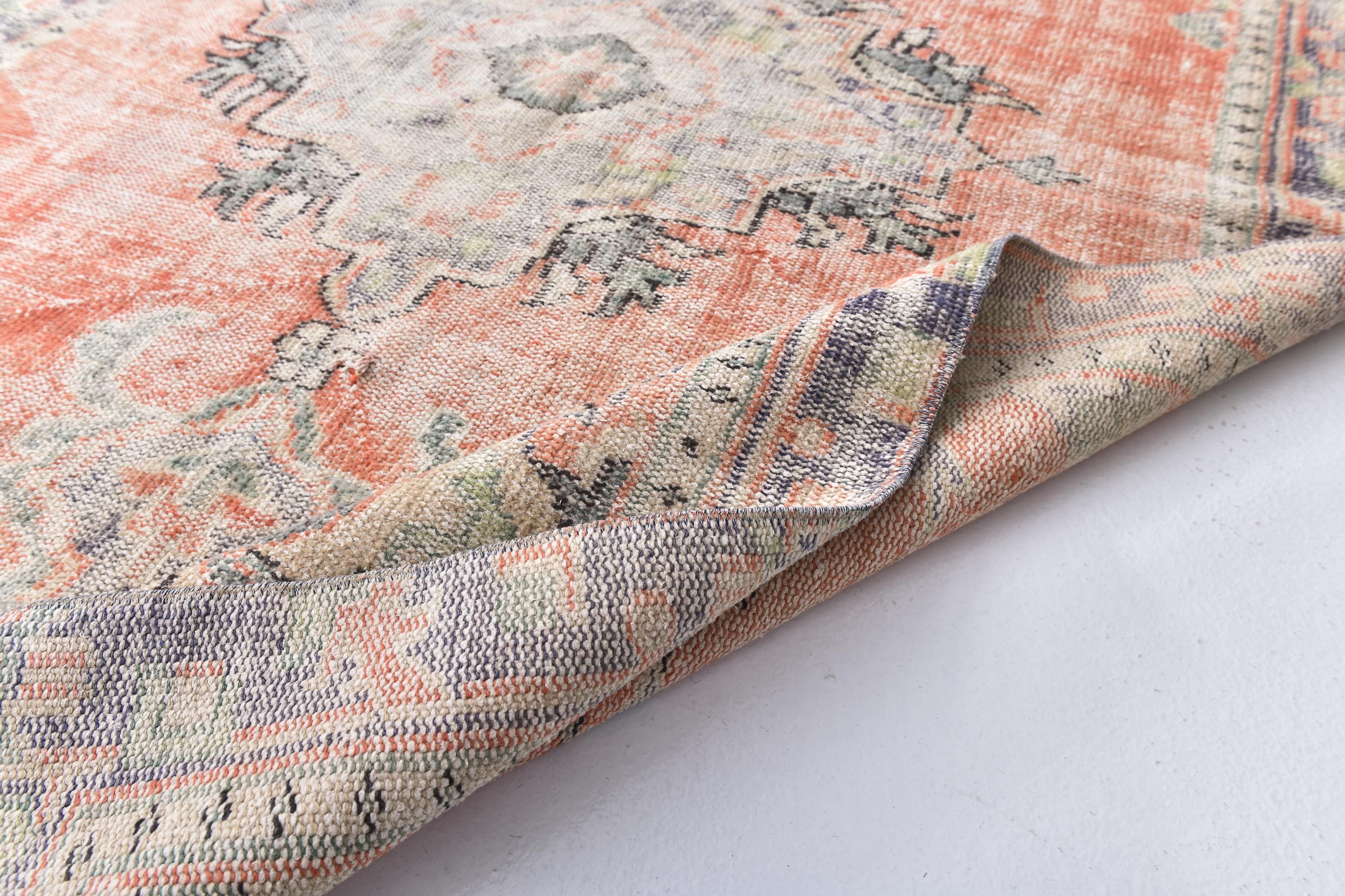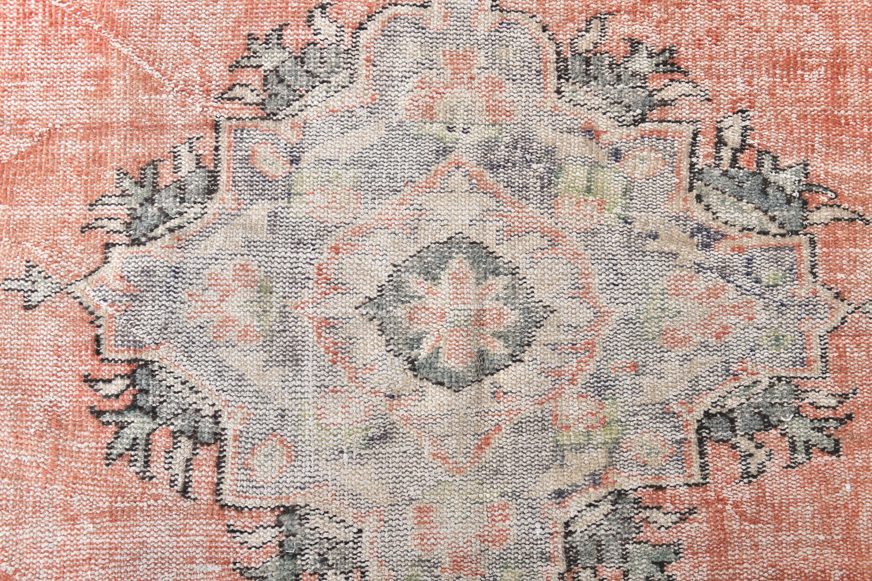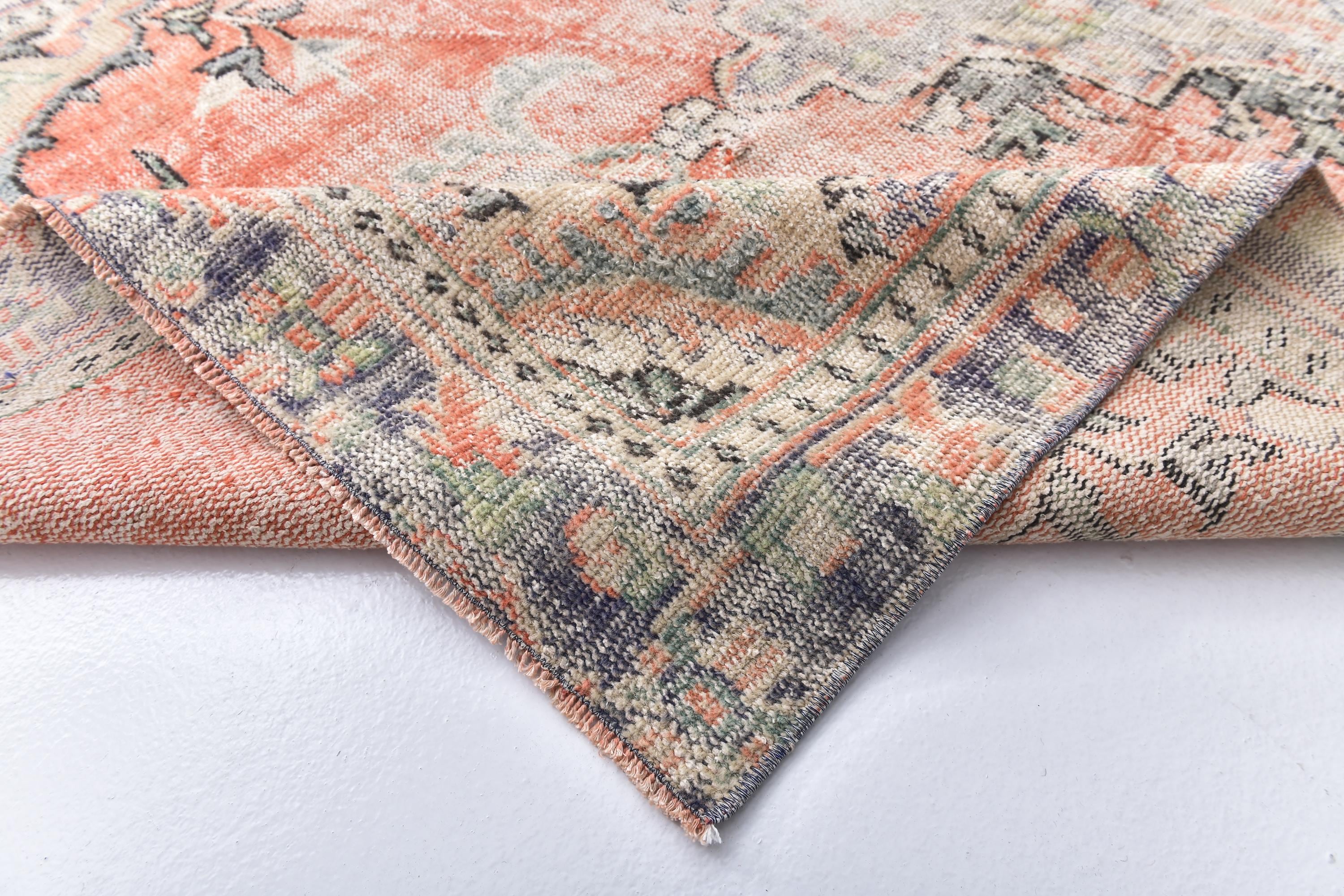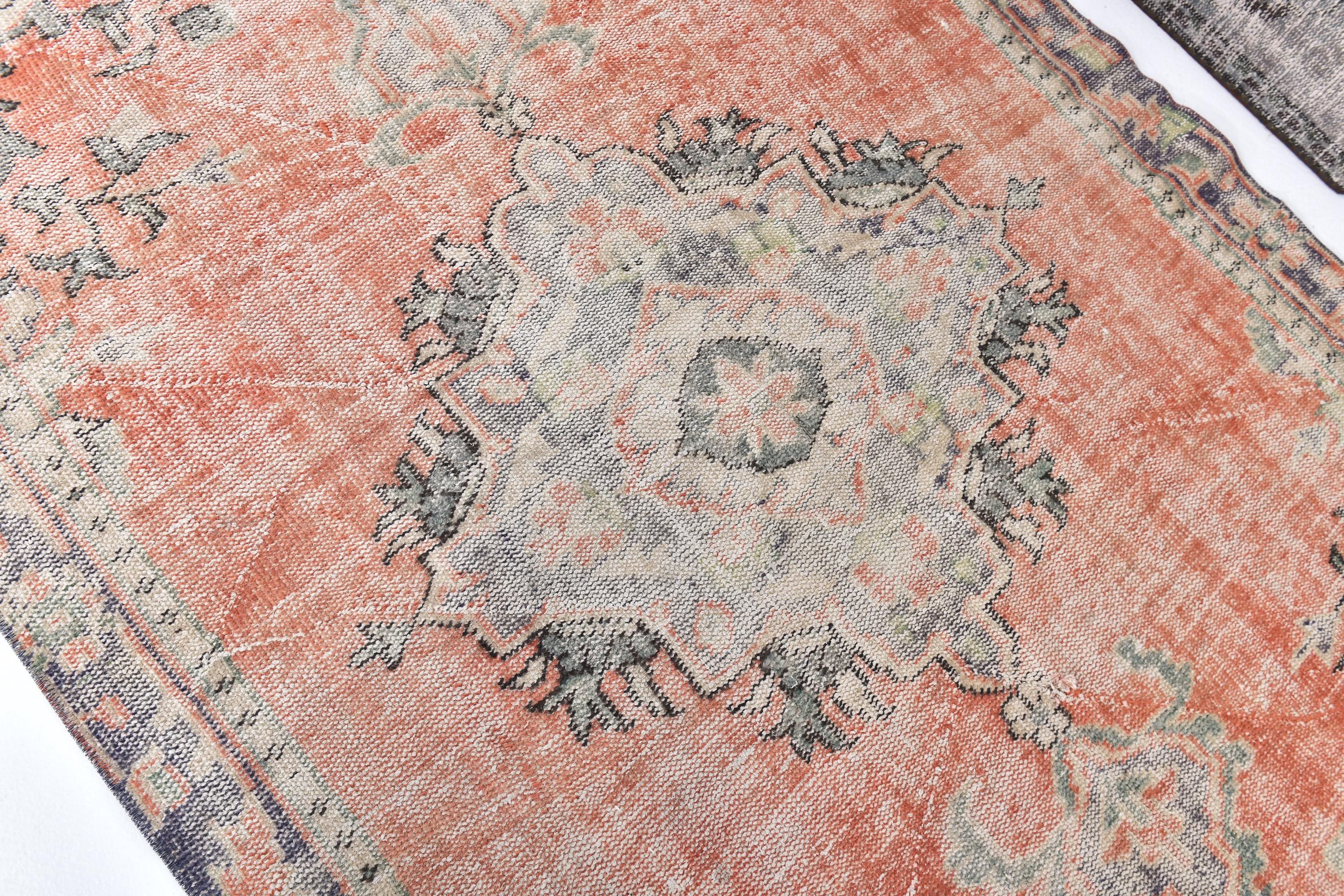 📜📌 Vintage Anatolian wool rug with muted salmon orange background and soft green color palette. Traditional medallion center with symmetrical floral ornaments and geometric patterns. Distressed vintage finish with natural color fading creates an authentic aged appearance ideal for modern eclectic or traditional home decor.