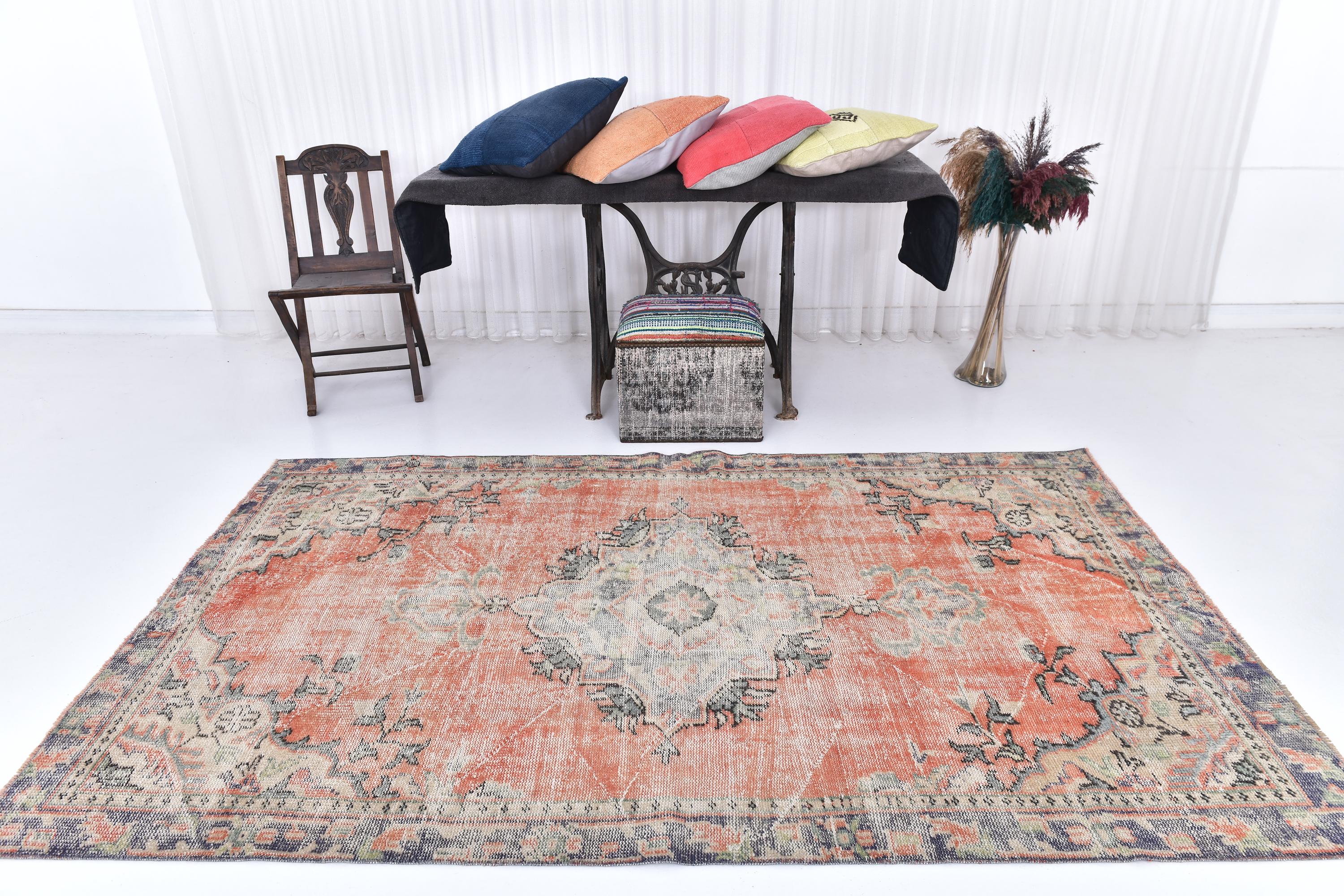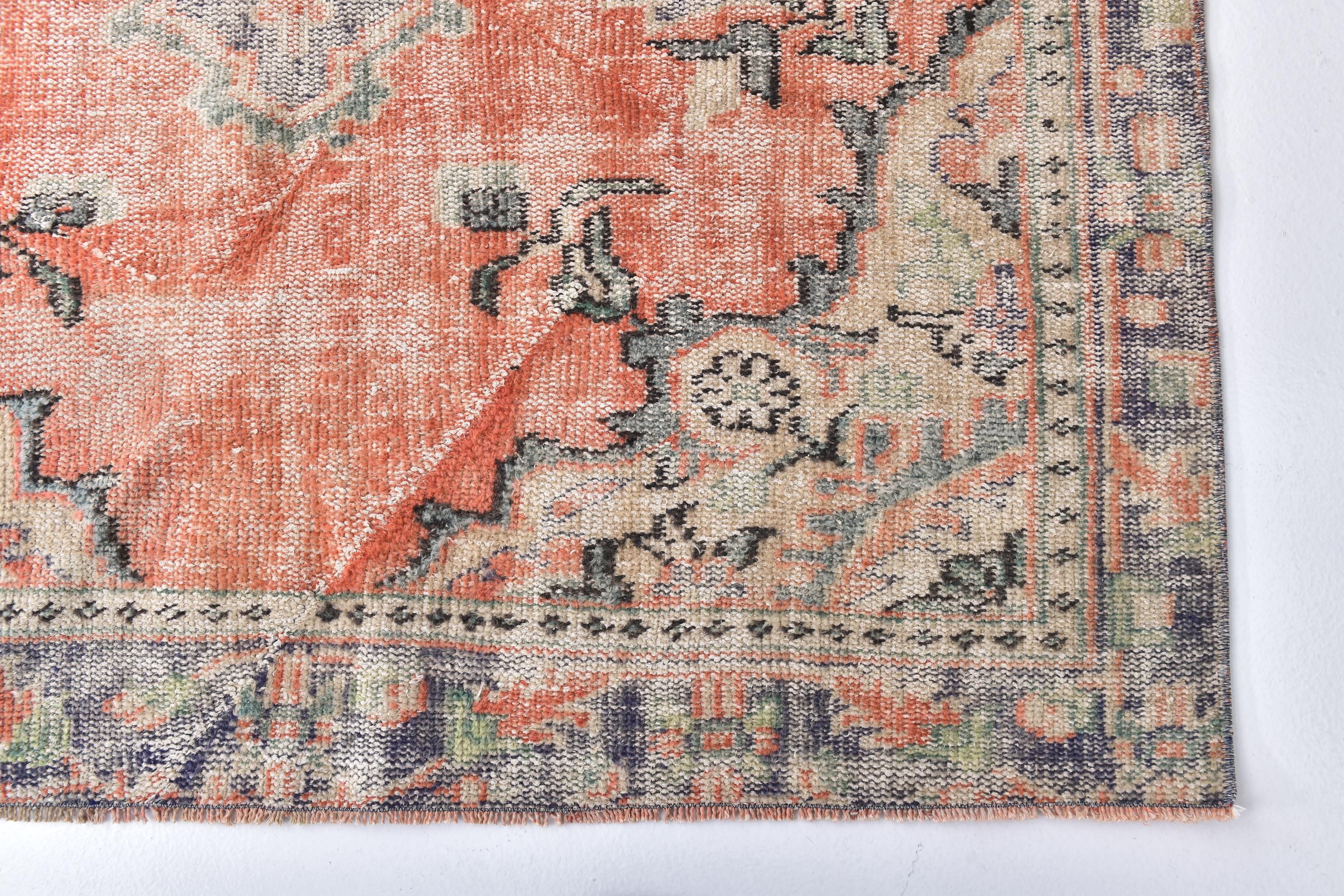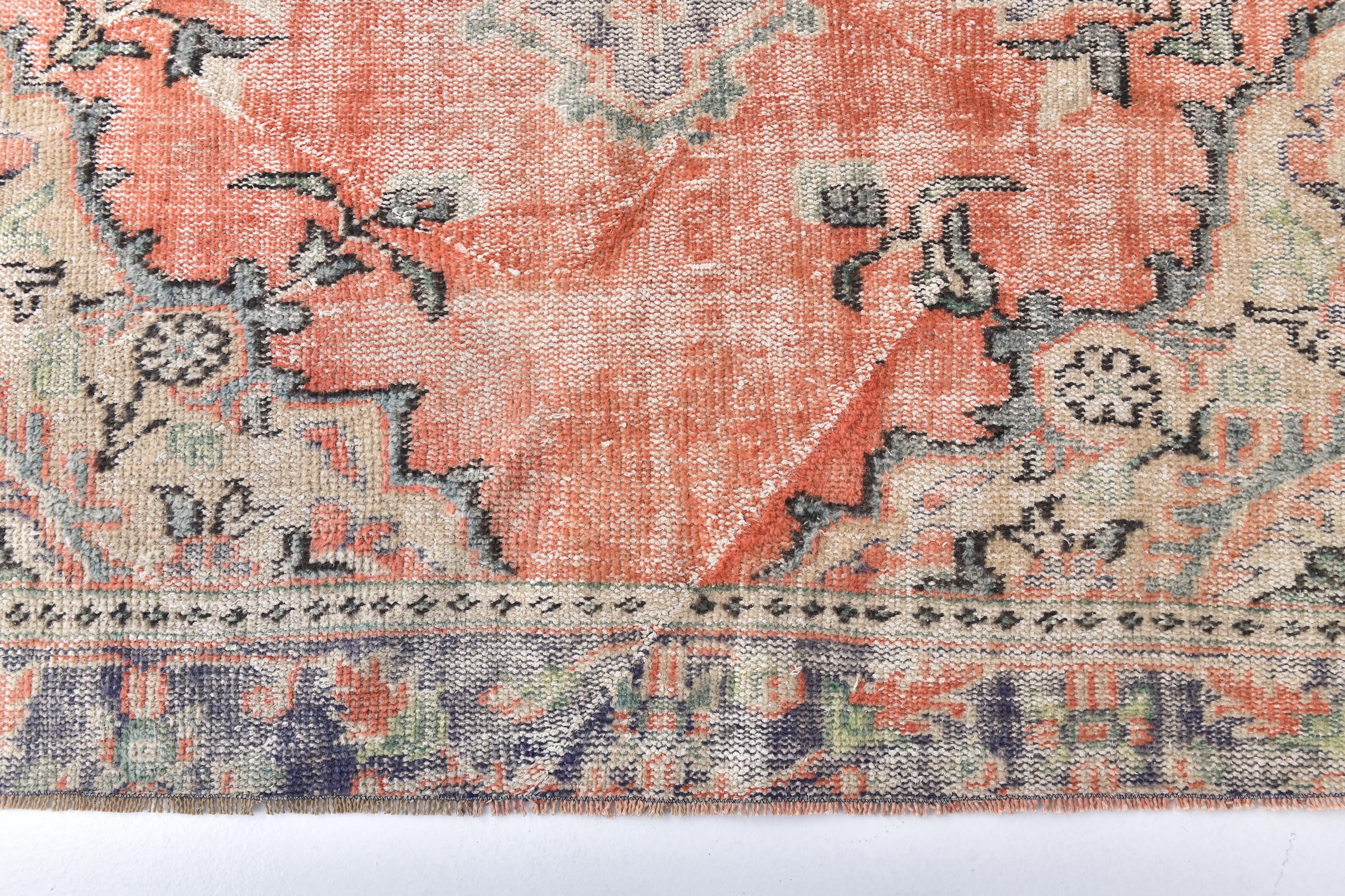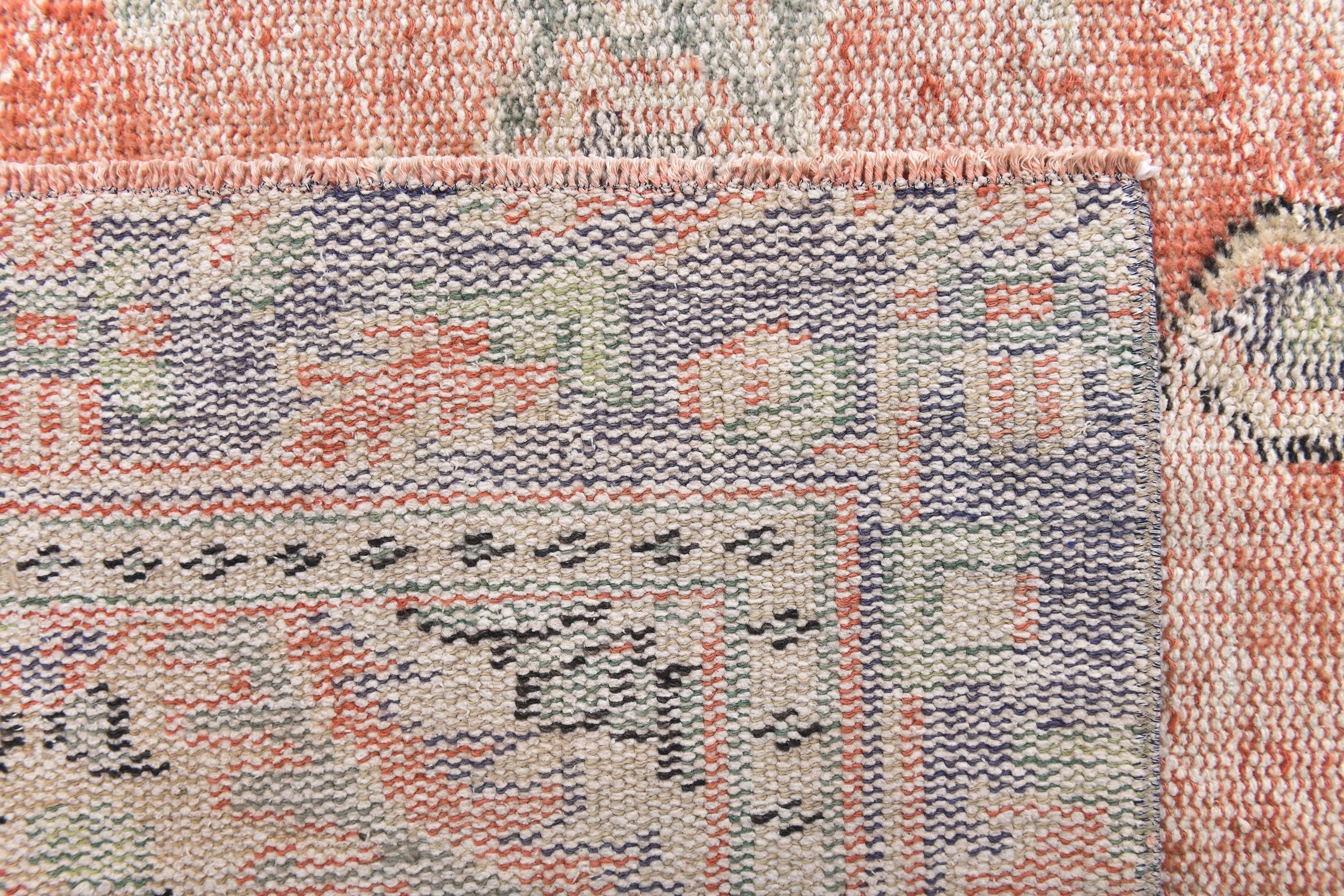 📜📌 Vintage Anatolian wool rug with muted salmon orange background and soft green color palette. Traditional medallion center with symmetrical floral ornaments and geometric patterns. Distressed vintage finish with natural color fading creates an authentic aged appearance ideal for modern eclectic or traditional home decor.