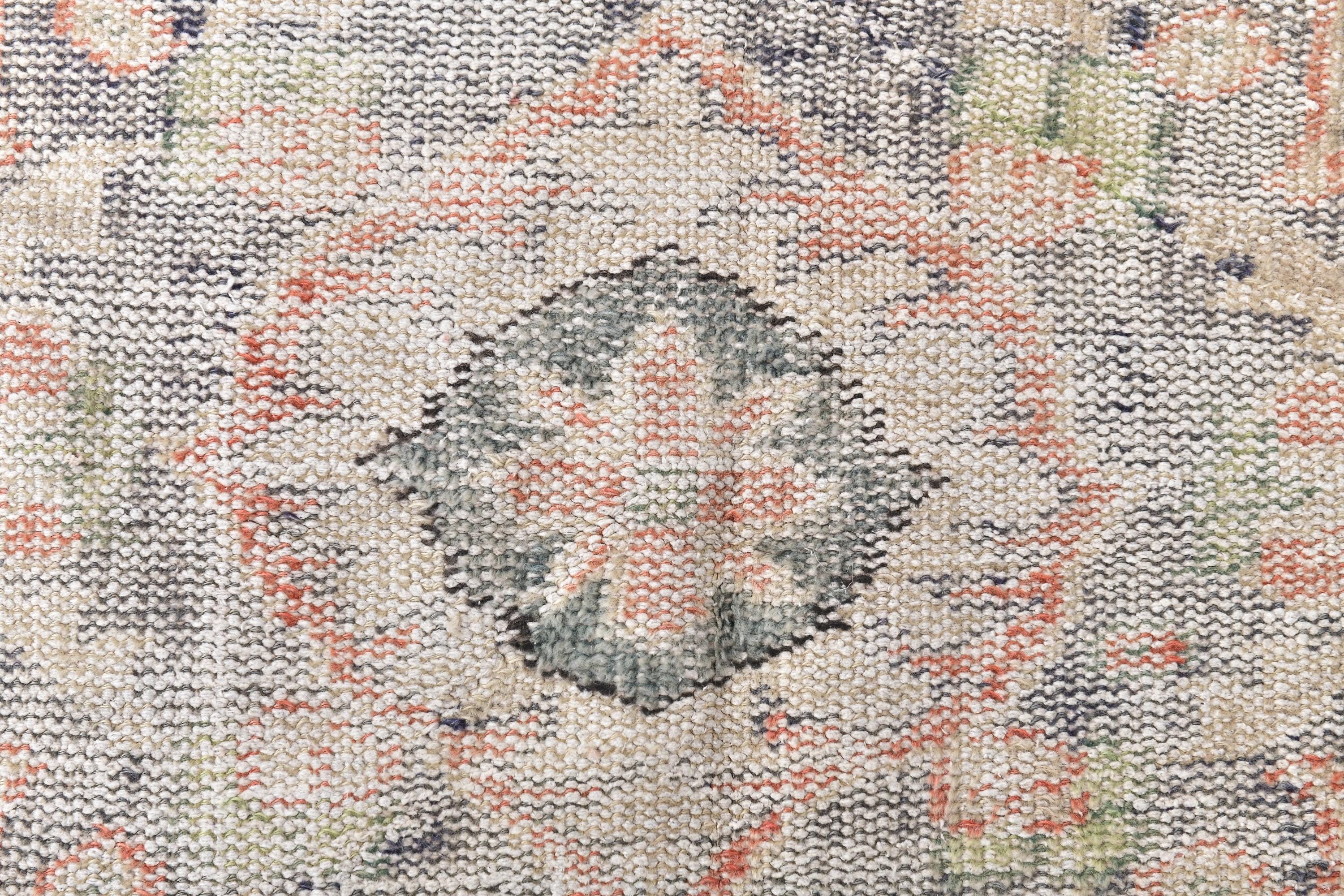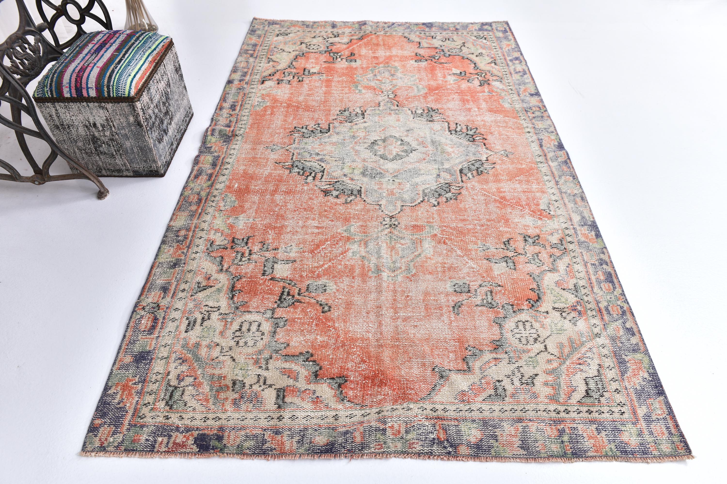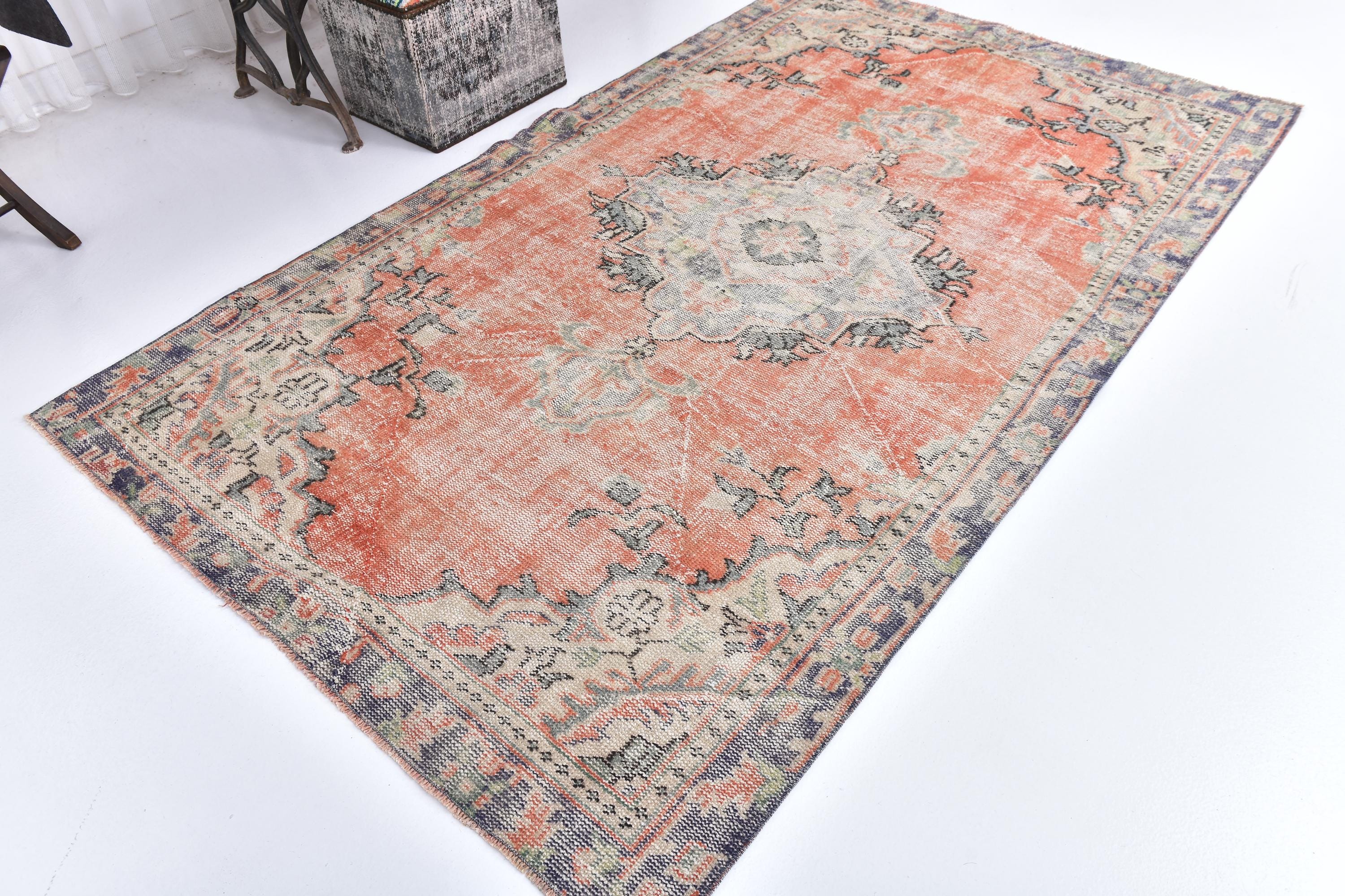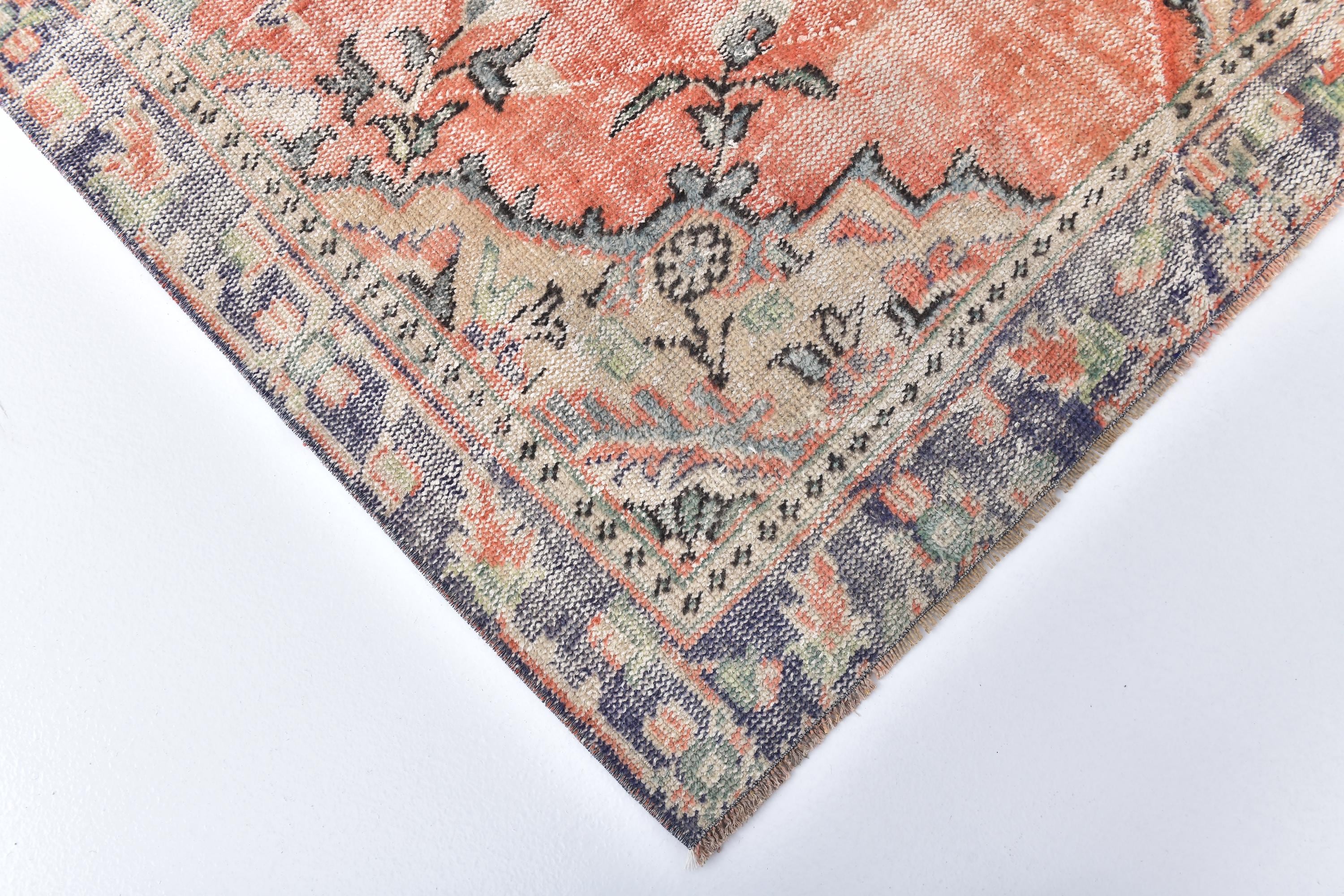 📜📌 Vintage Anatolian wool rug with muted salmon orange background and soft green color palette. Traditional medallion center with symmetrical floral ornaments and geometric patterns. Distressed vintage finish with natural color fading creates an authentic aged appearance ideal for modern eclectic or traditional home decor.