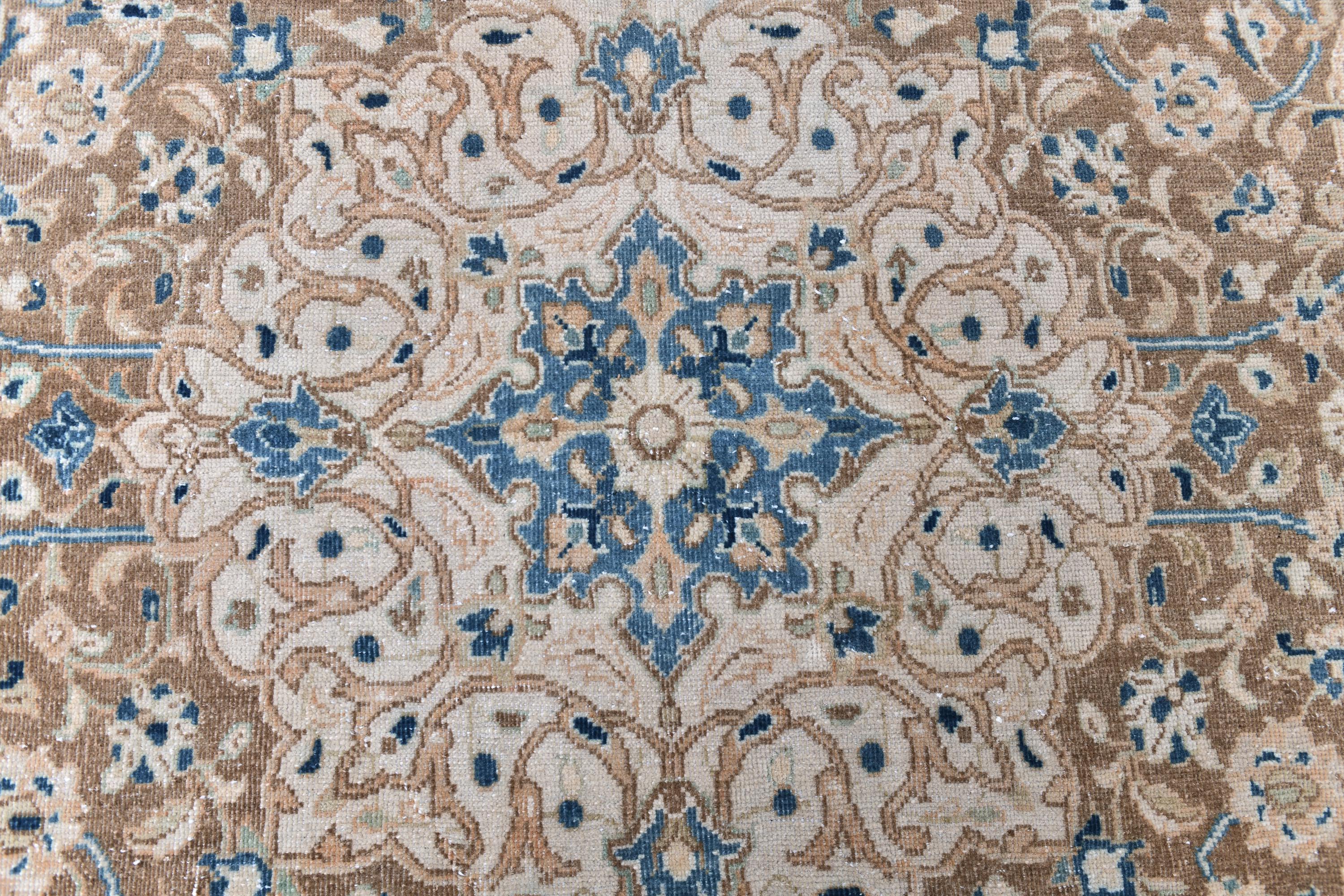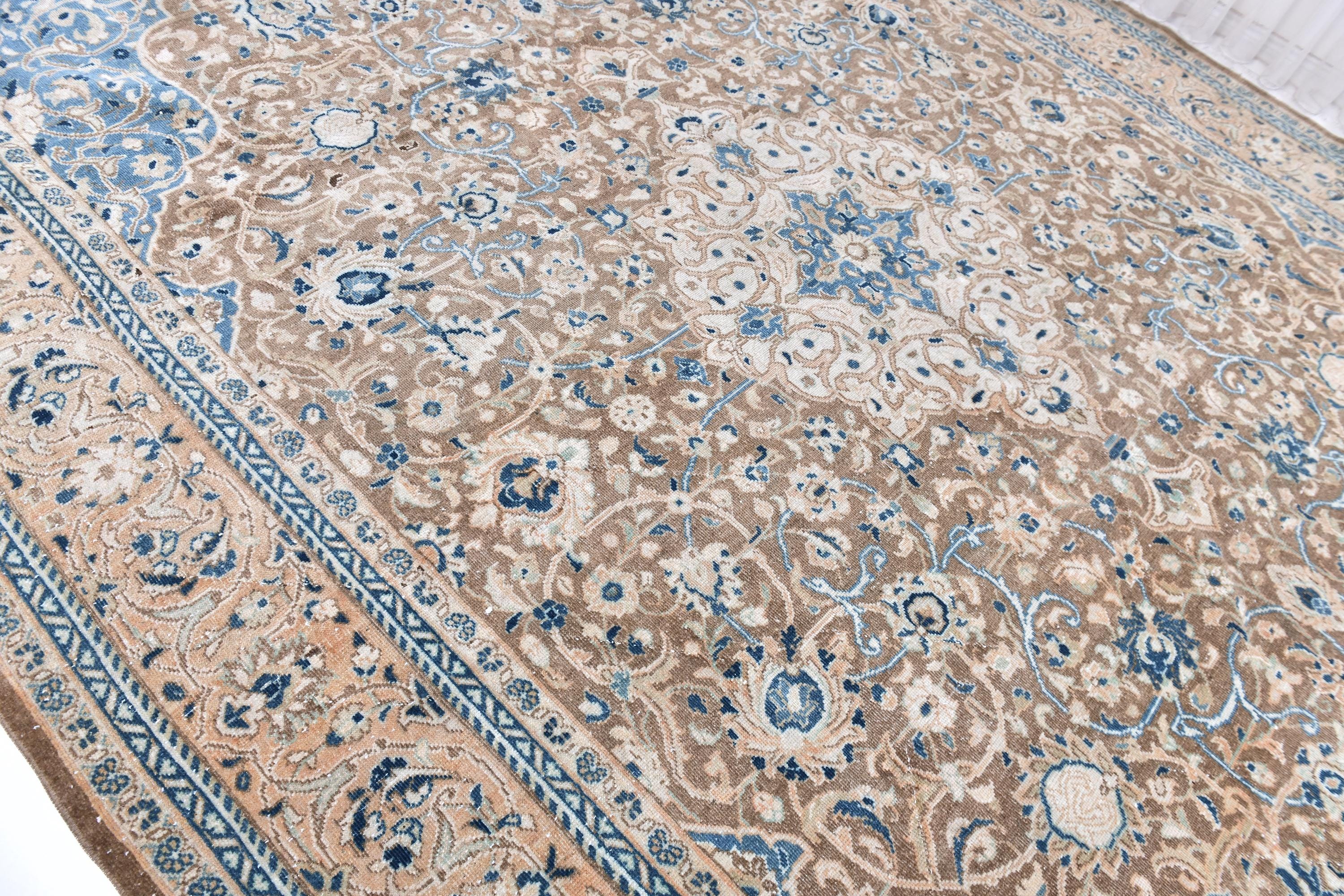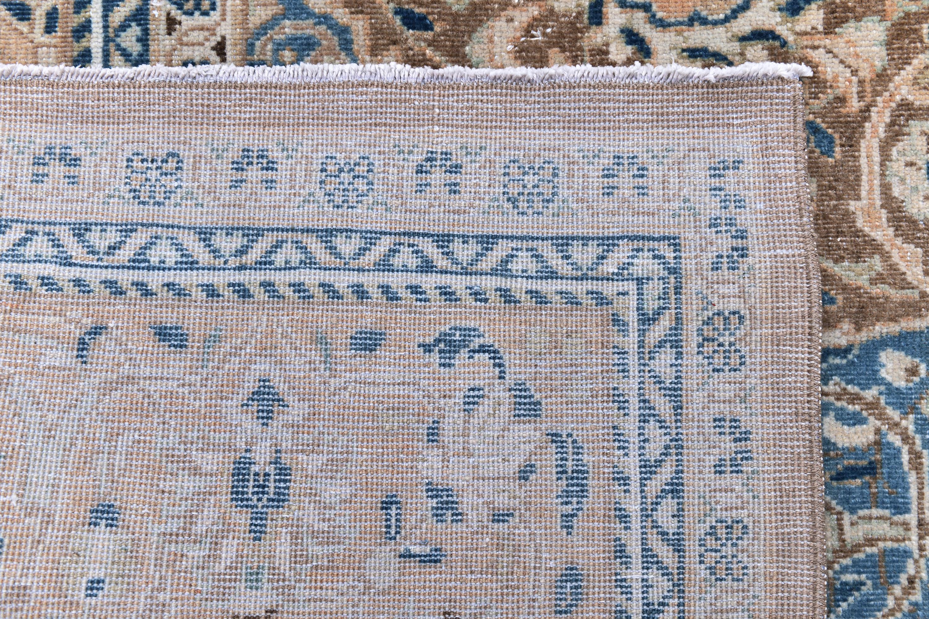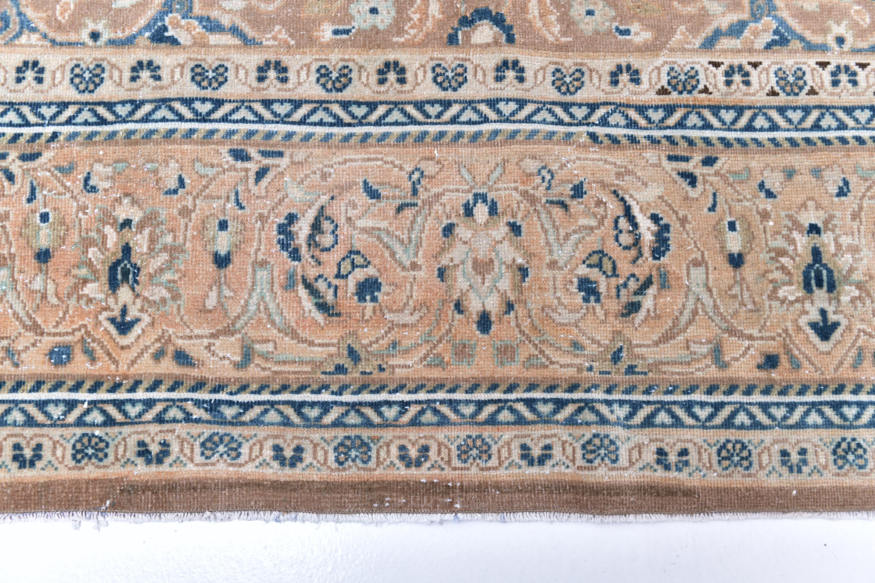📜📌Large vintage Persian area rug featuring an all-over repeating geometric pattern in soft coral, brown peach, beige, and muted blue tones. The hand-knotted wool carpet displays small diamond medallions and floral motifs densely covering the entire field, surrounded by multiple decorative borders with intricate Persian geometric and botanical designs. The low-pile rug shows authentic distressed patina and natural color fading.