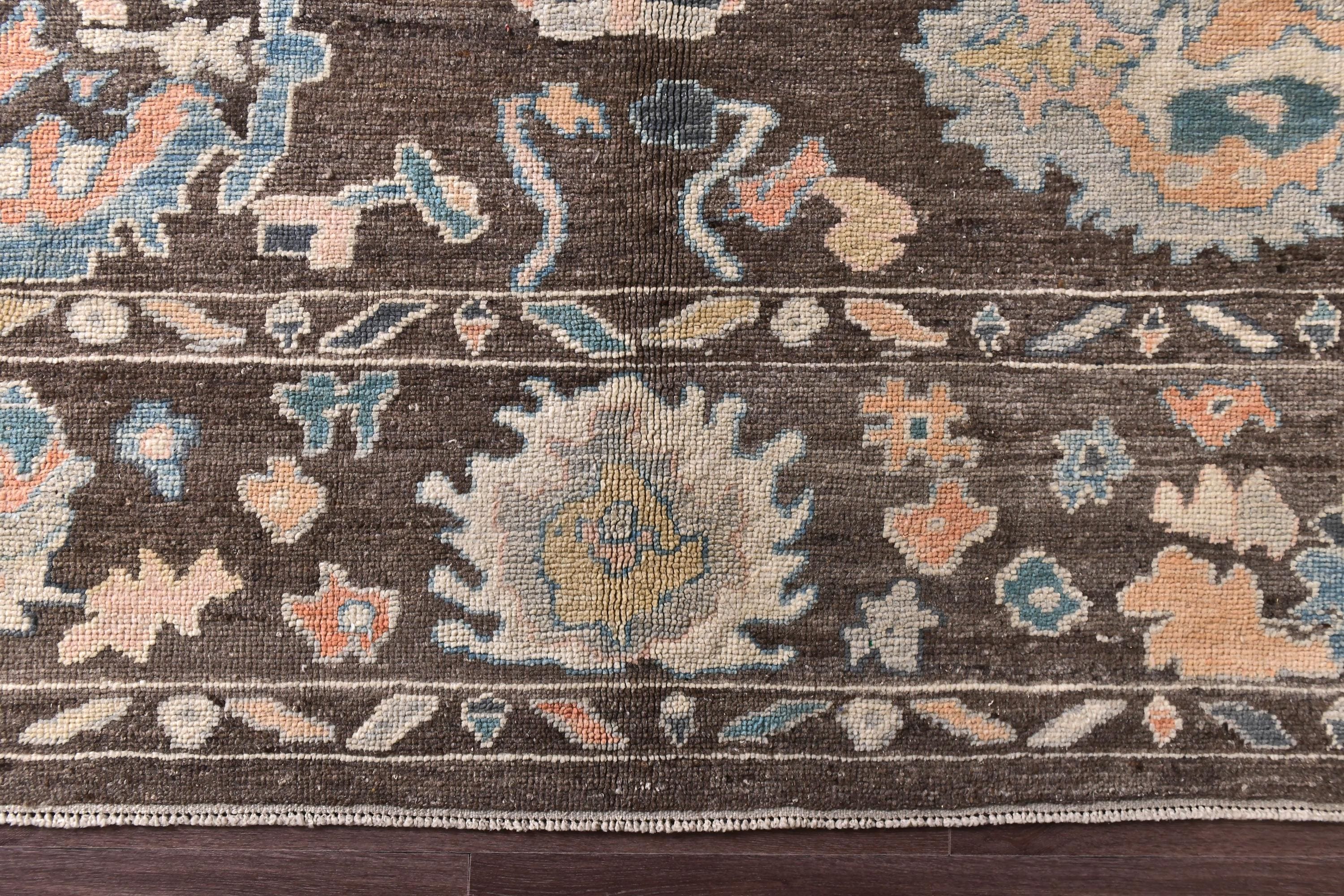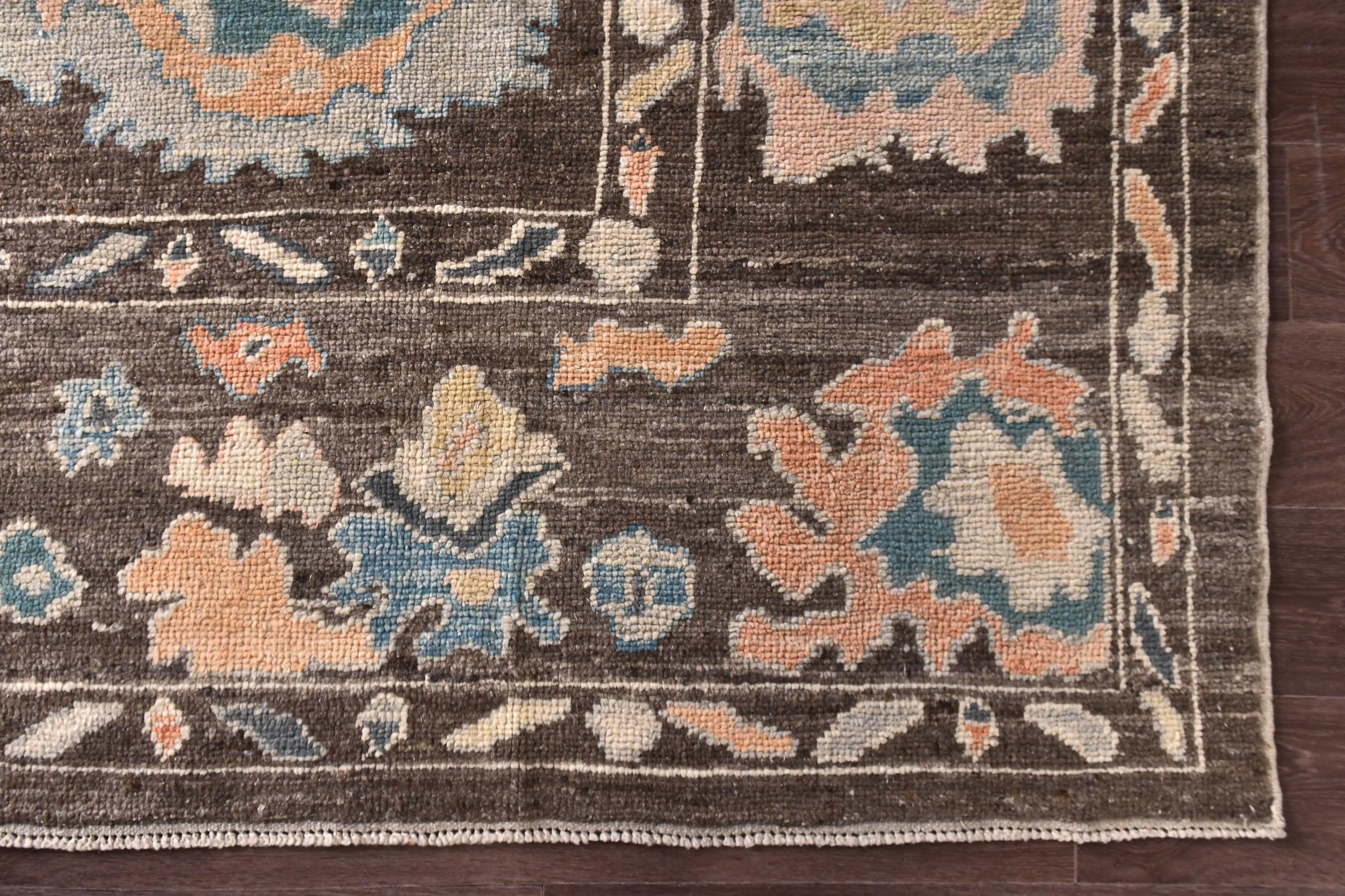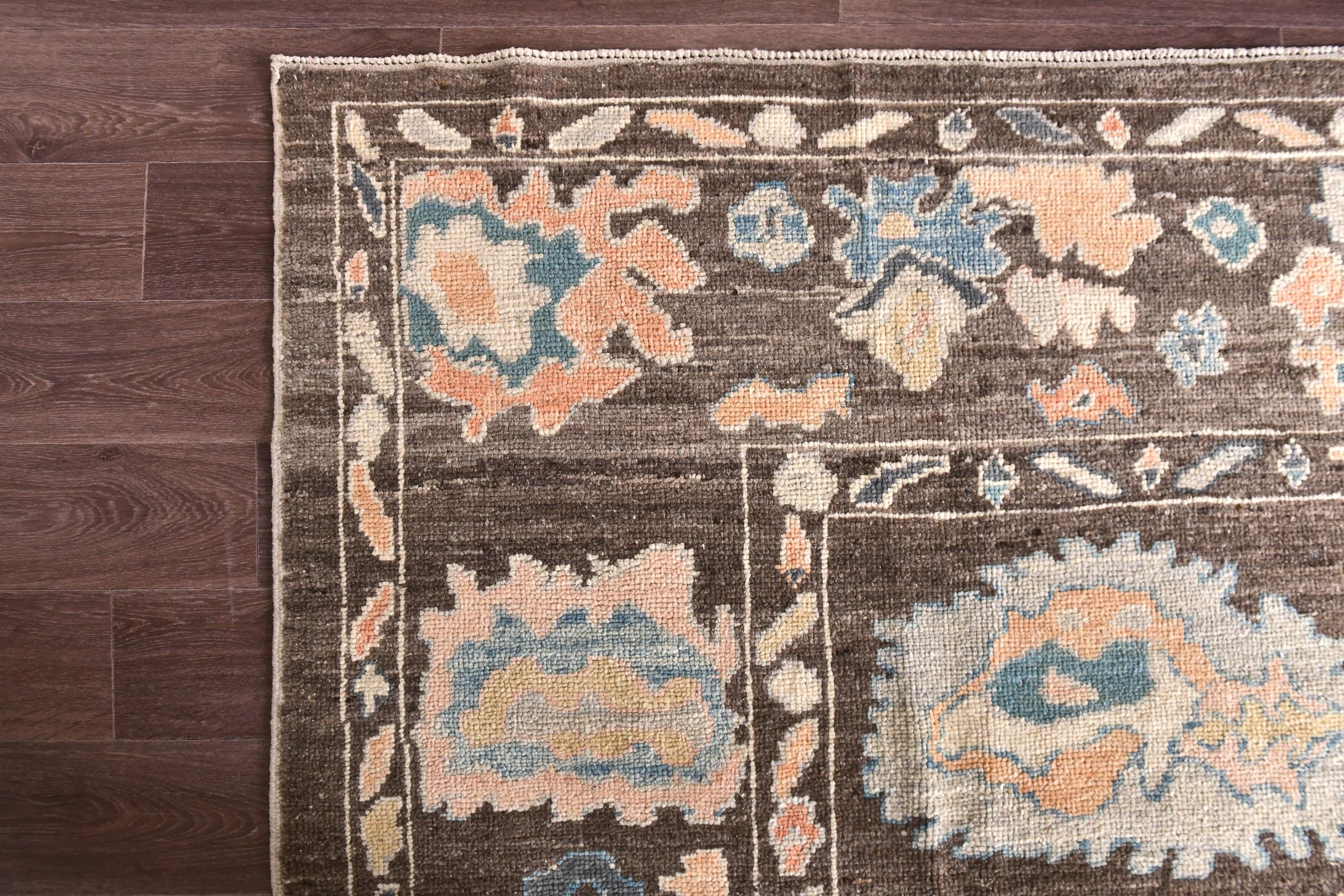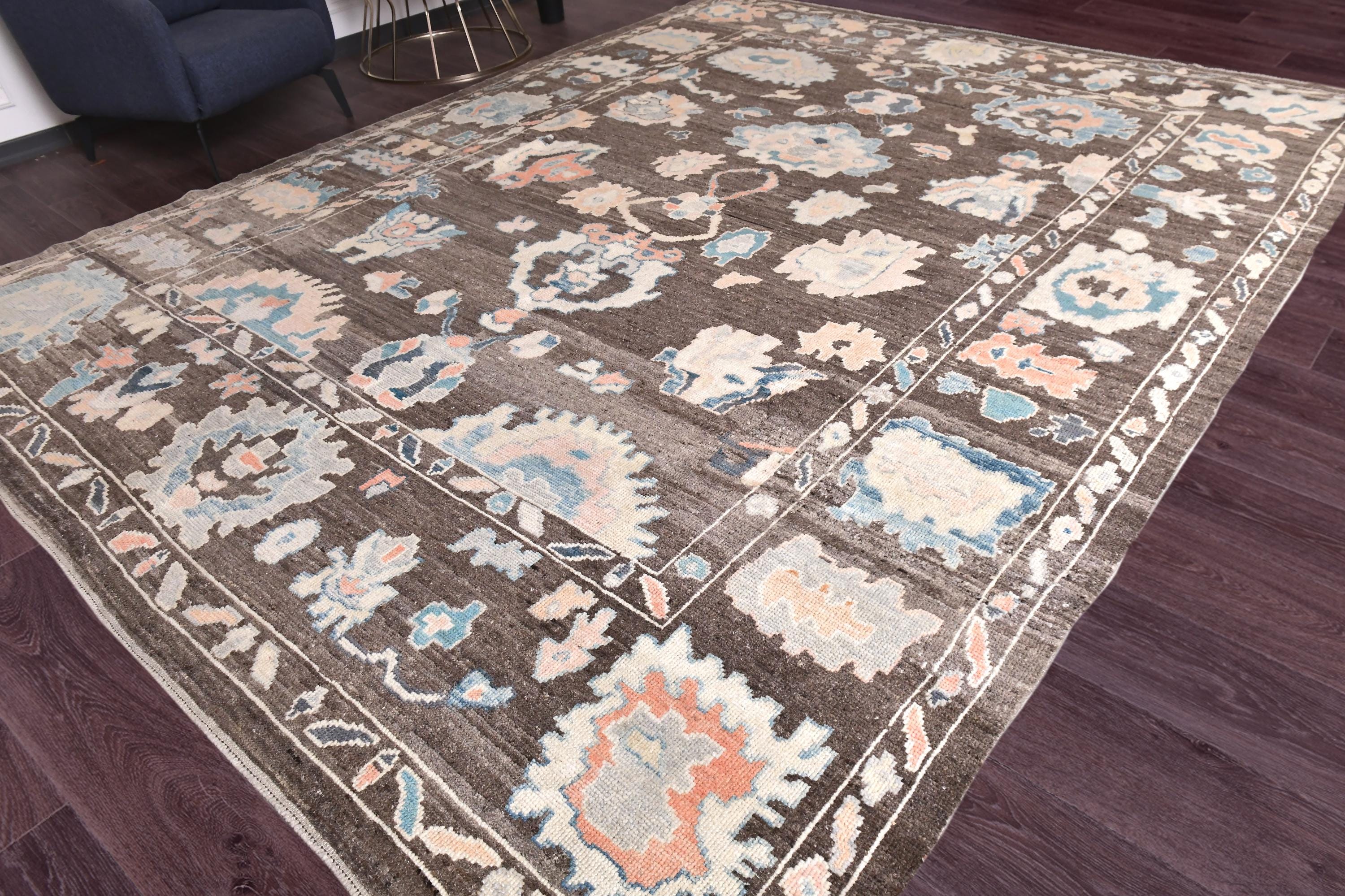 📜📌 Vintage Turkish Oushak area rug featuring rich charcoal brown field with scattered pastel floral motifs in soft blue, coral pink, cream and beige, hand-knotted wool construction with all-over botanical pattern and decorative border showing authentic distressed patina