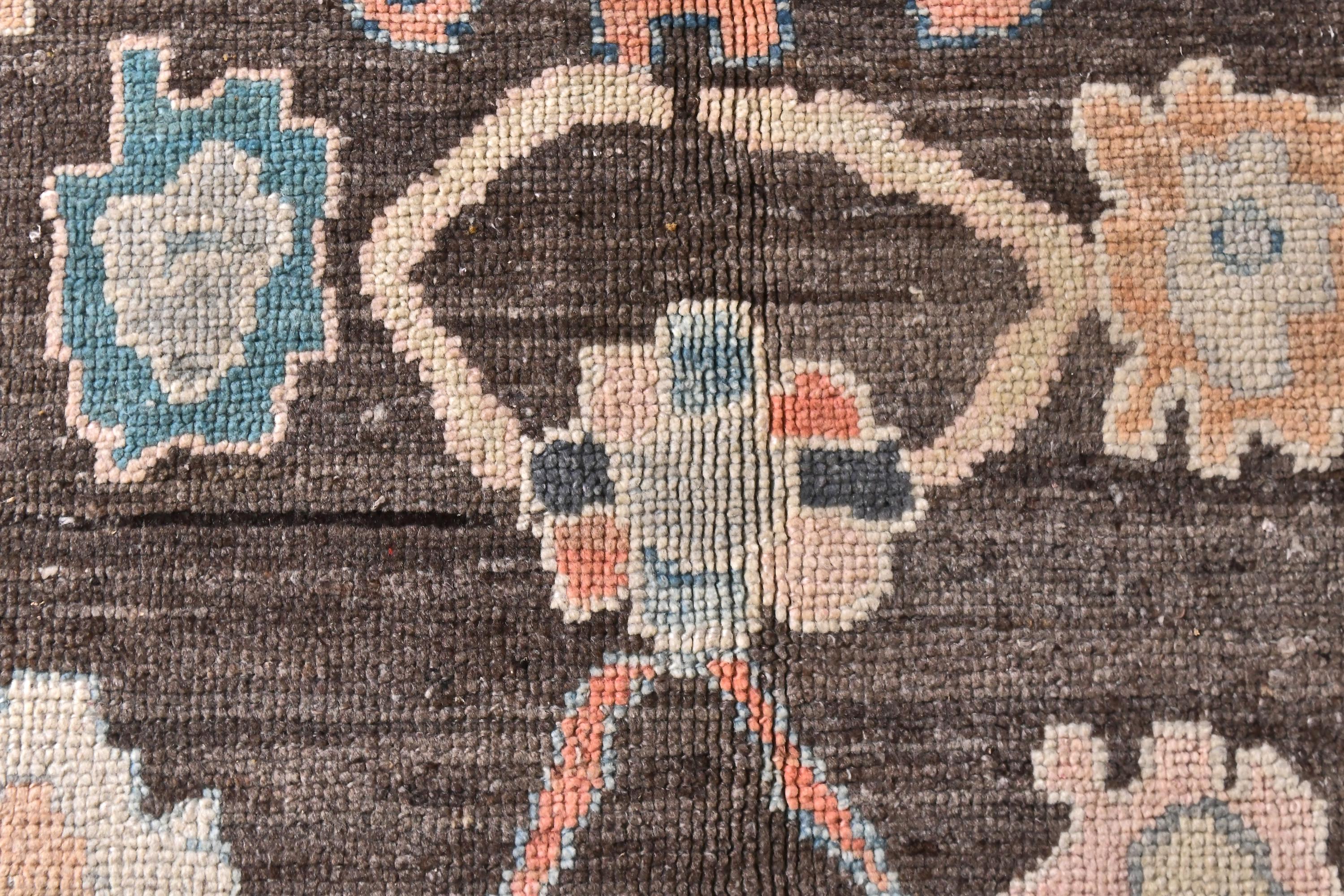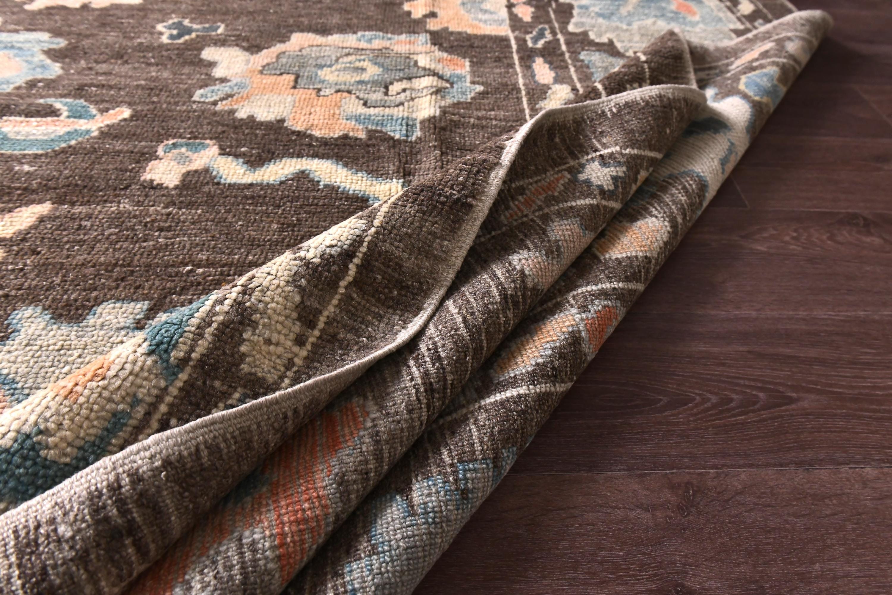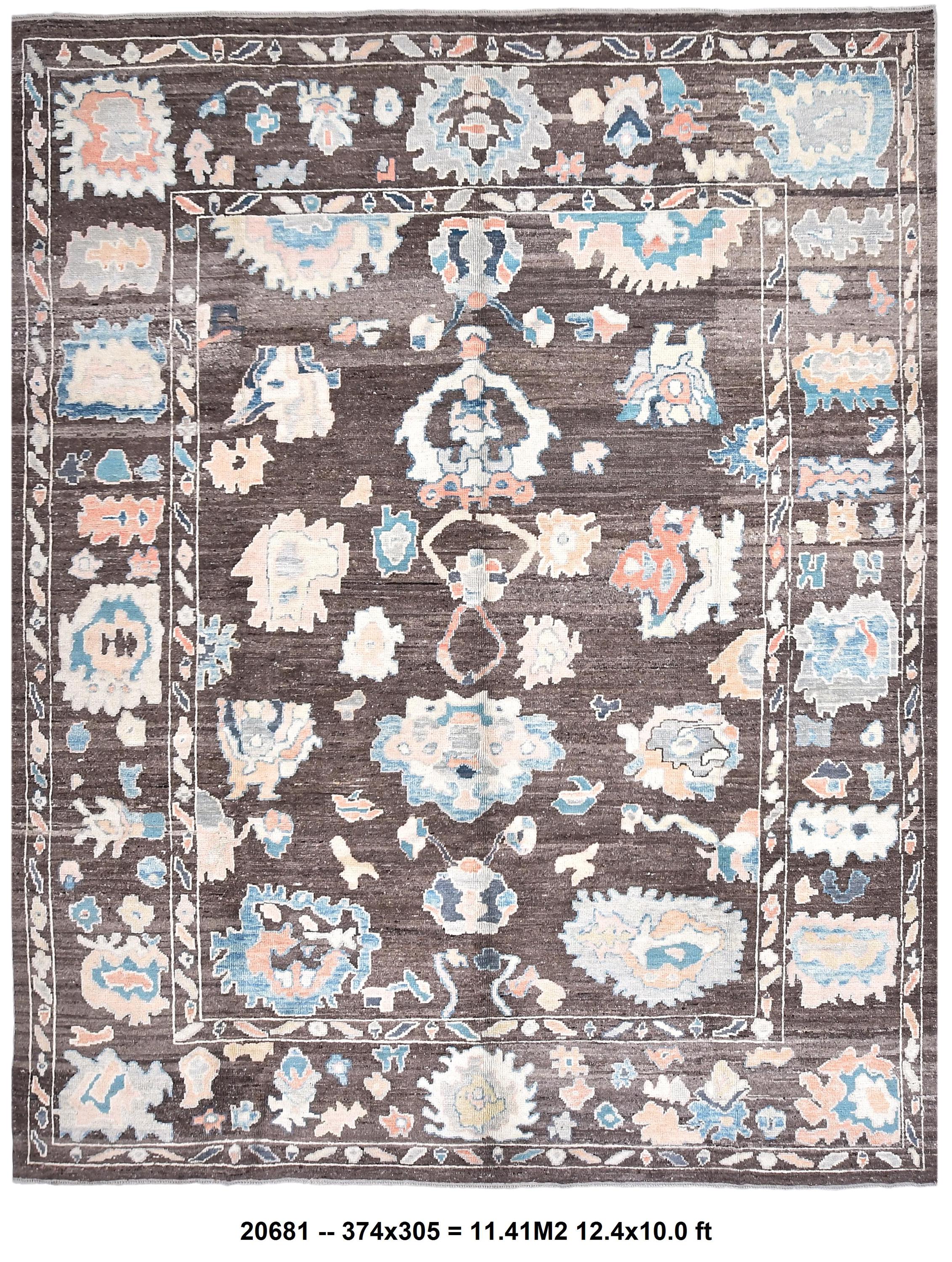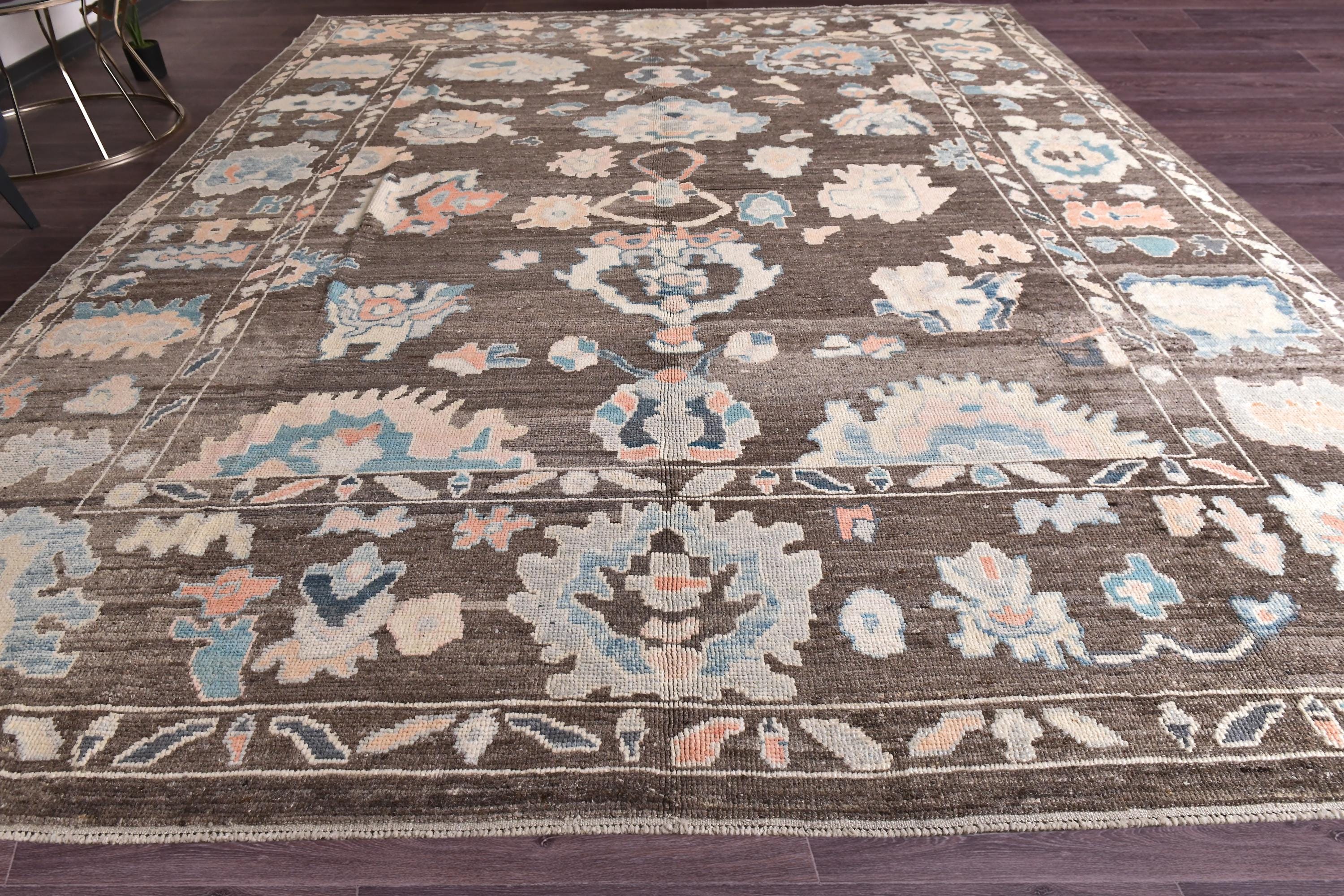 📜📌 Vintage Turkish Oushak area rug featuring rich charcoal brown field with scattered pastel floral motifs in soft blue, coral pink, cream and beige, hand-knotted wool construction with all-over botanical pattern and decorative border showing authentic distressed patina