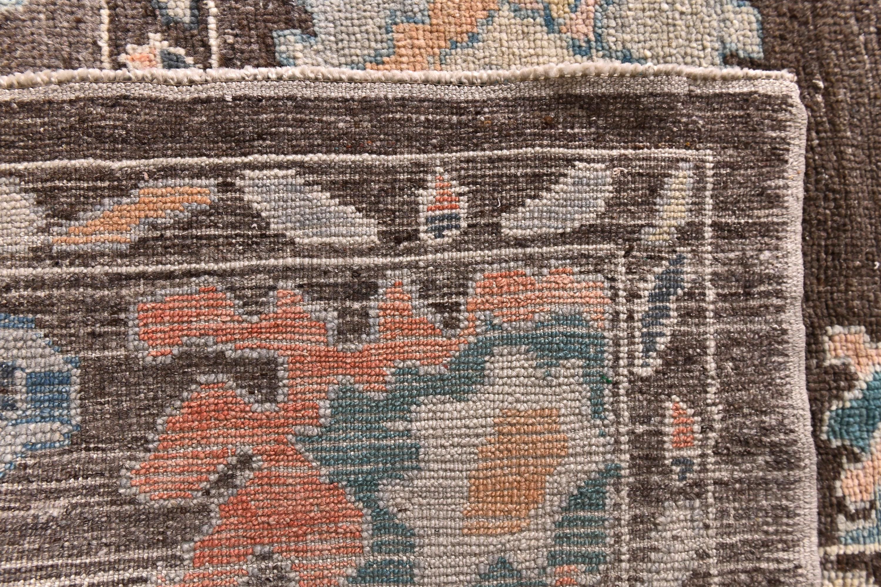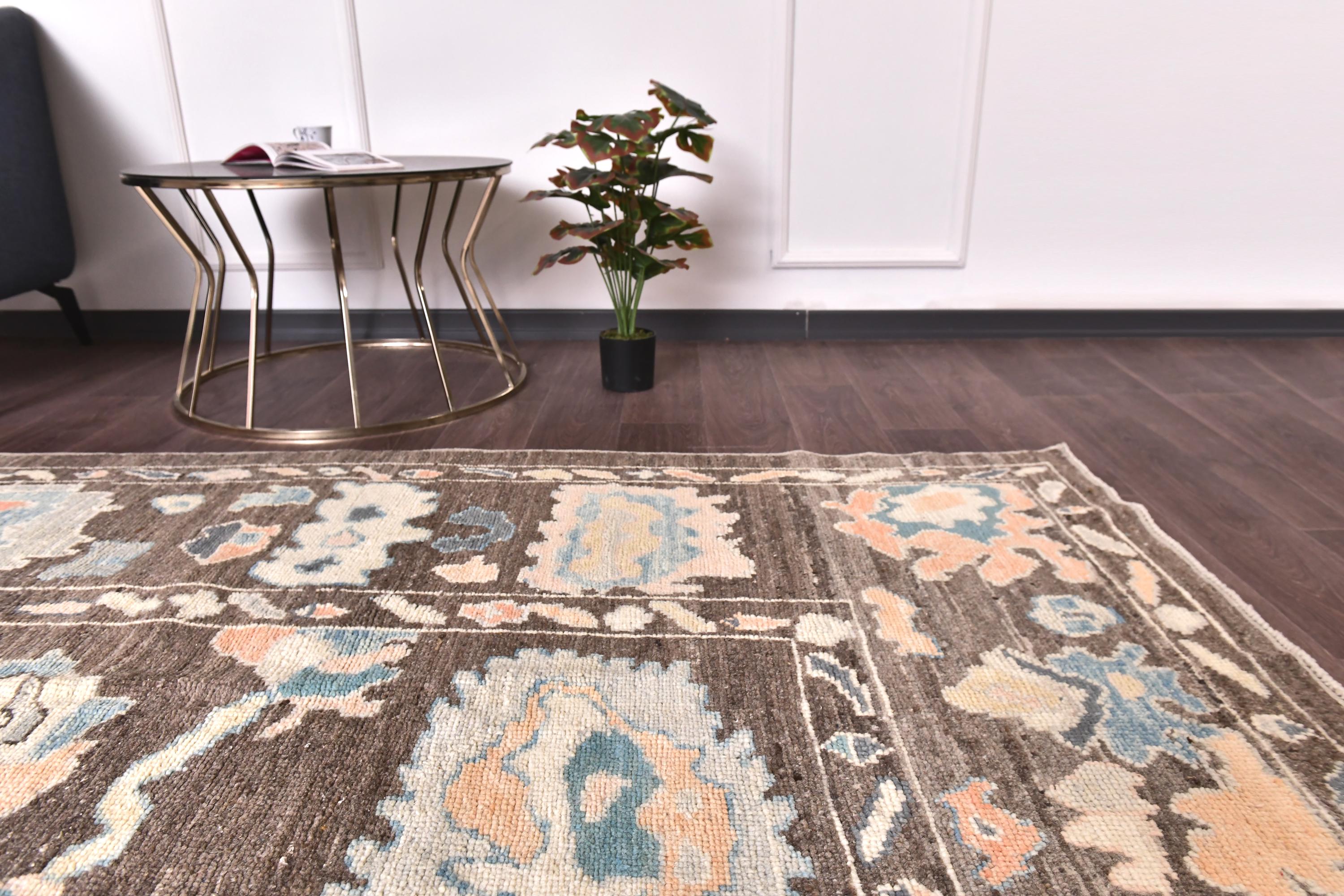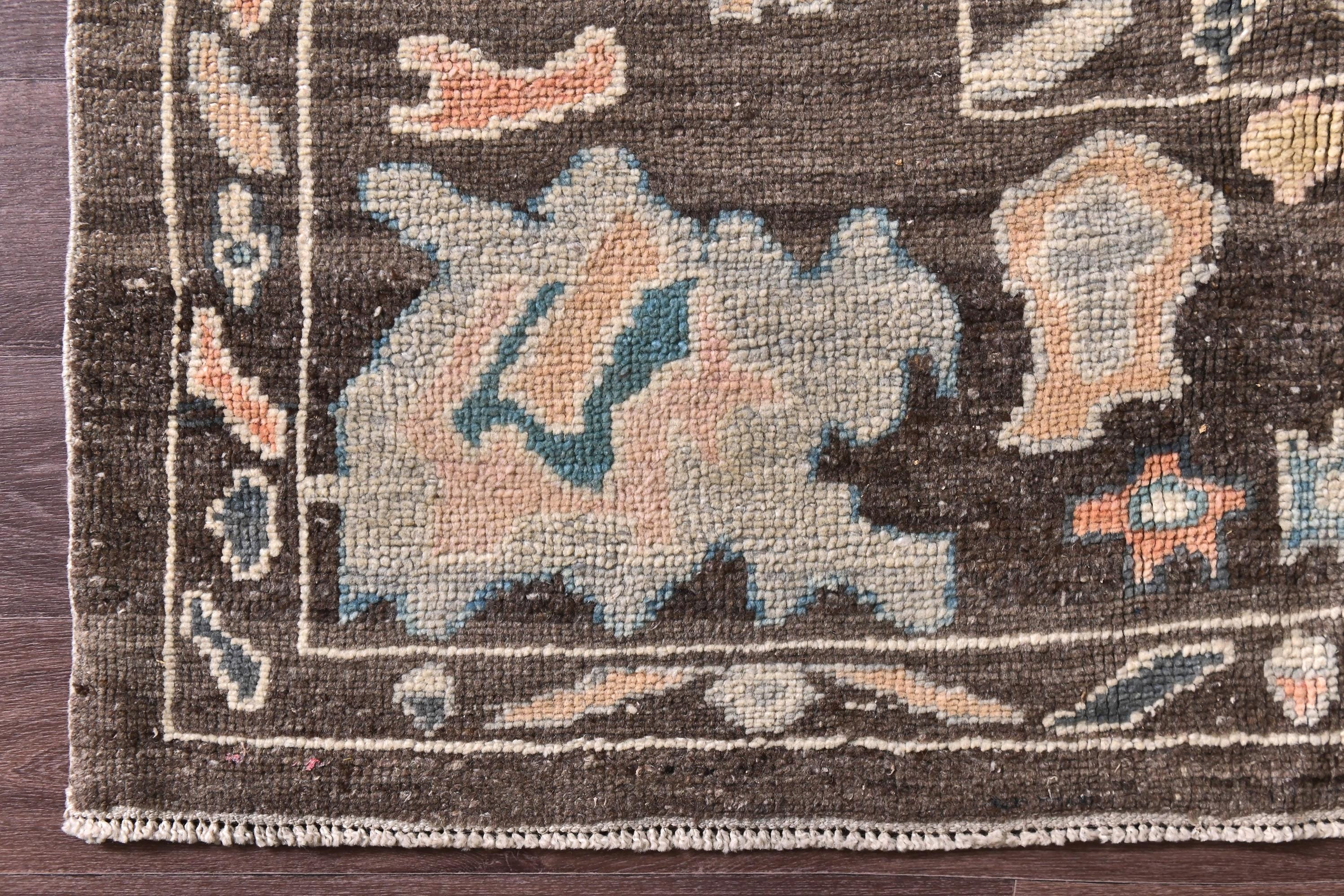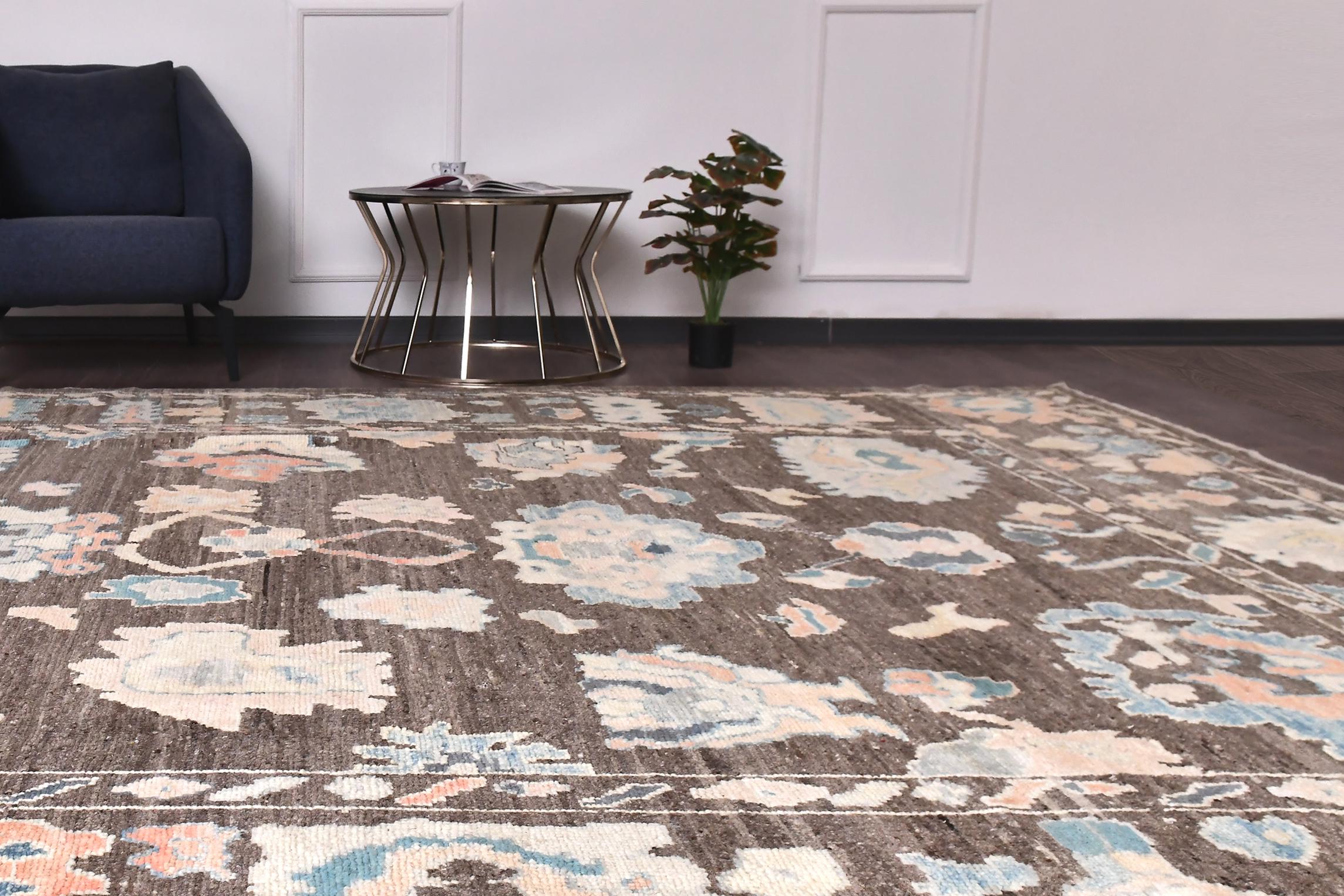📜📌 Vintage Turkish Oushak area rug featuring rich charcoal brown field with scattered pastel floral motifs in soft blue, coral pink, cream and beige, hand-knotted wool construction with all-over botanical pattern and decorative border showing authentic distressed patina