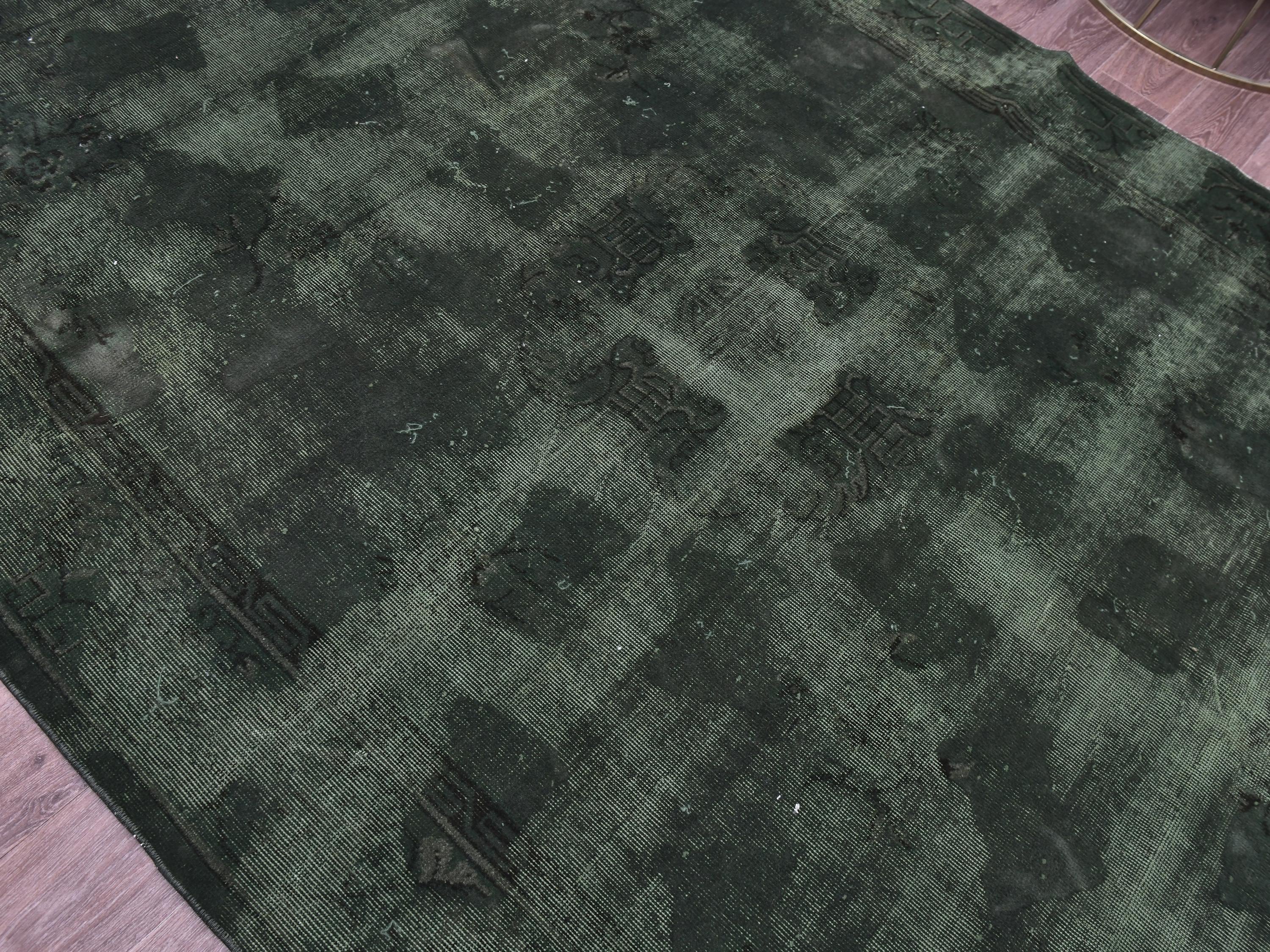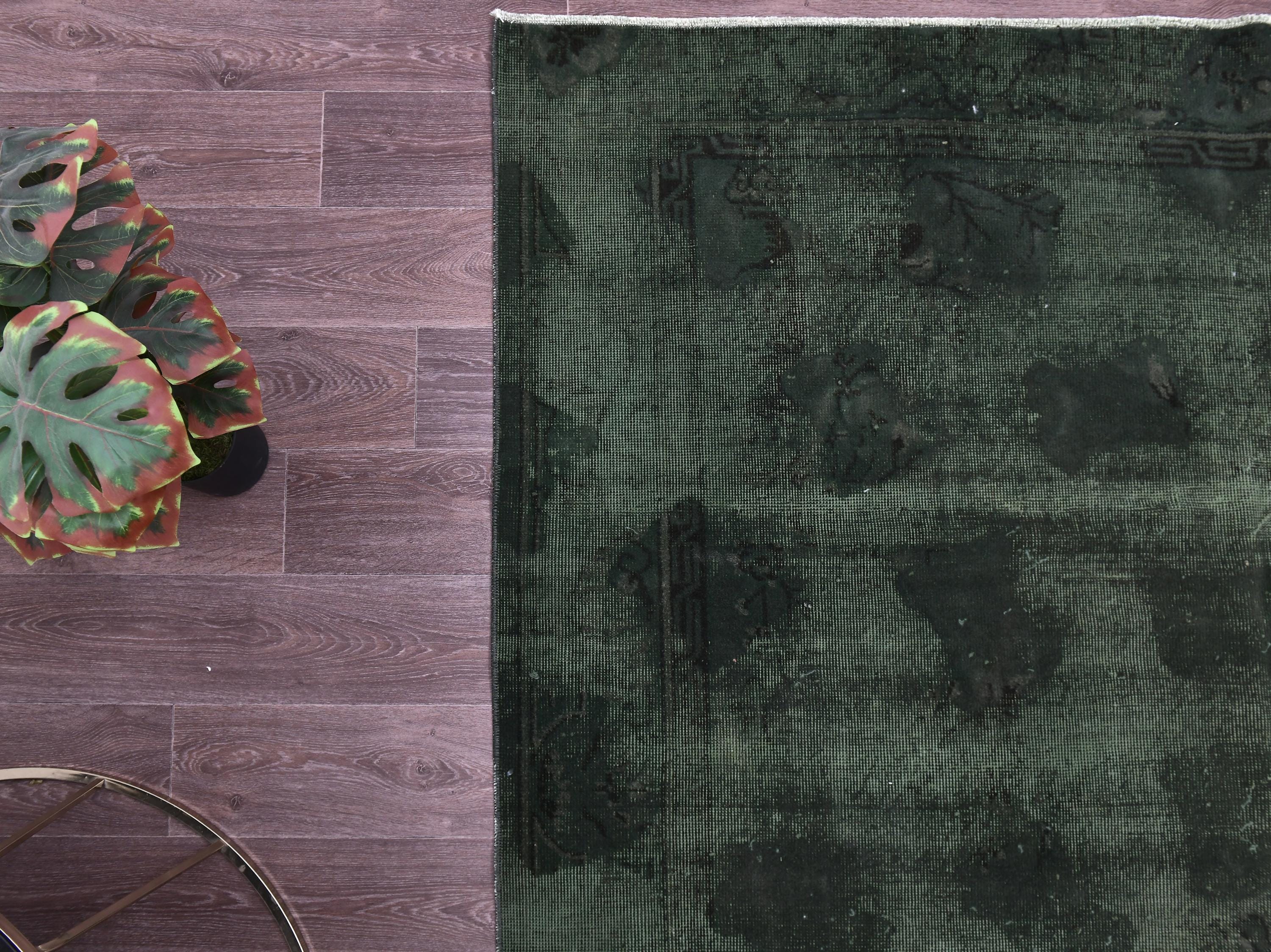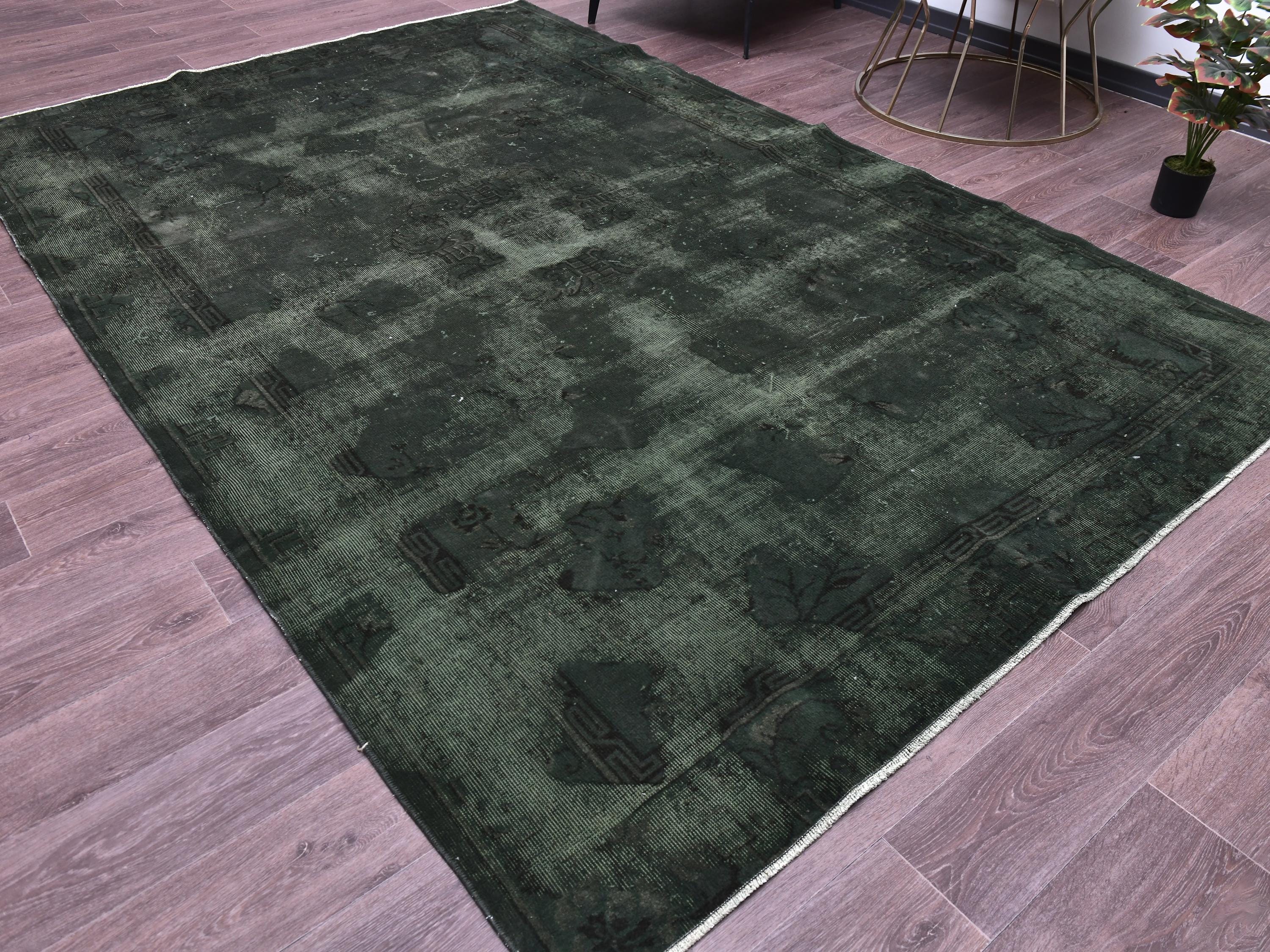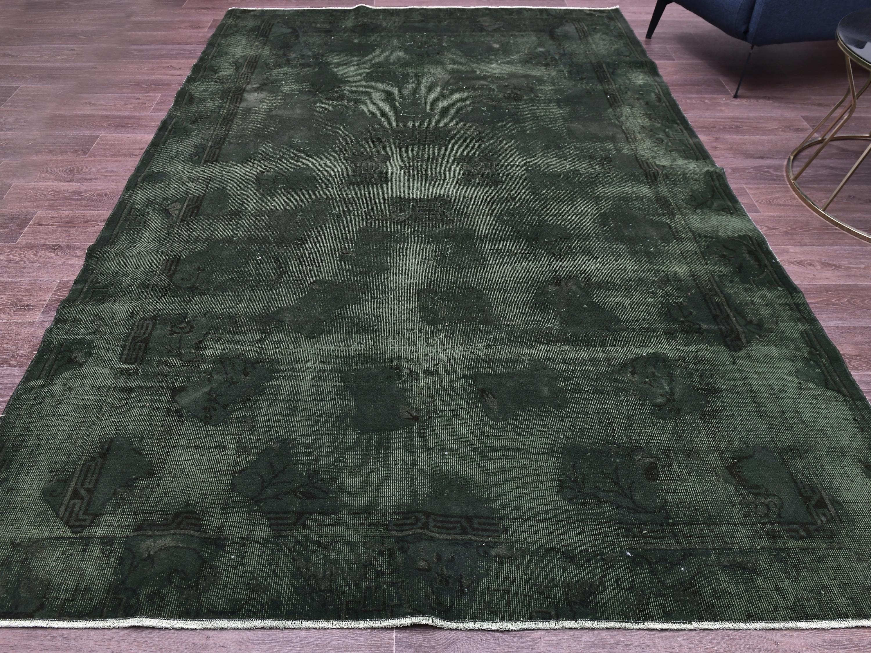 📜📌Green overdyed area rug featuring vintage distressed appearance with tonal variations from dark forest to sage green, hand-knotted wool with faded ornamental border and central medallion design barely visible beneath the rich green overdye treatment