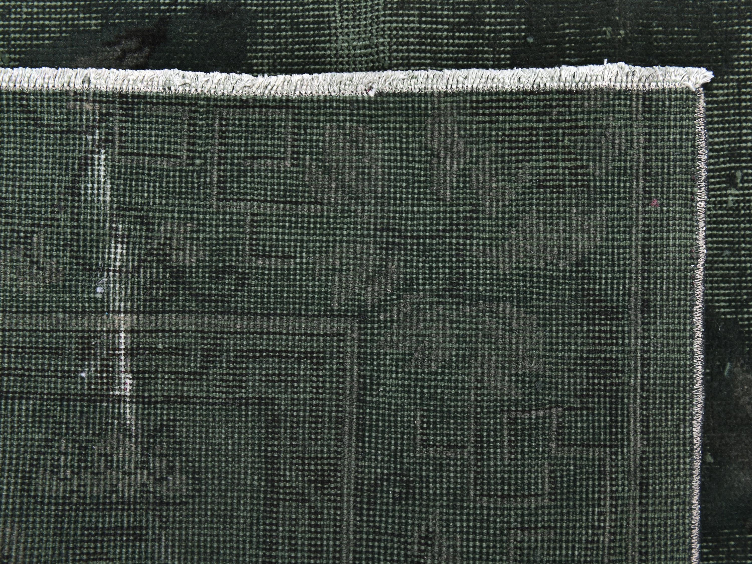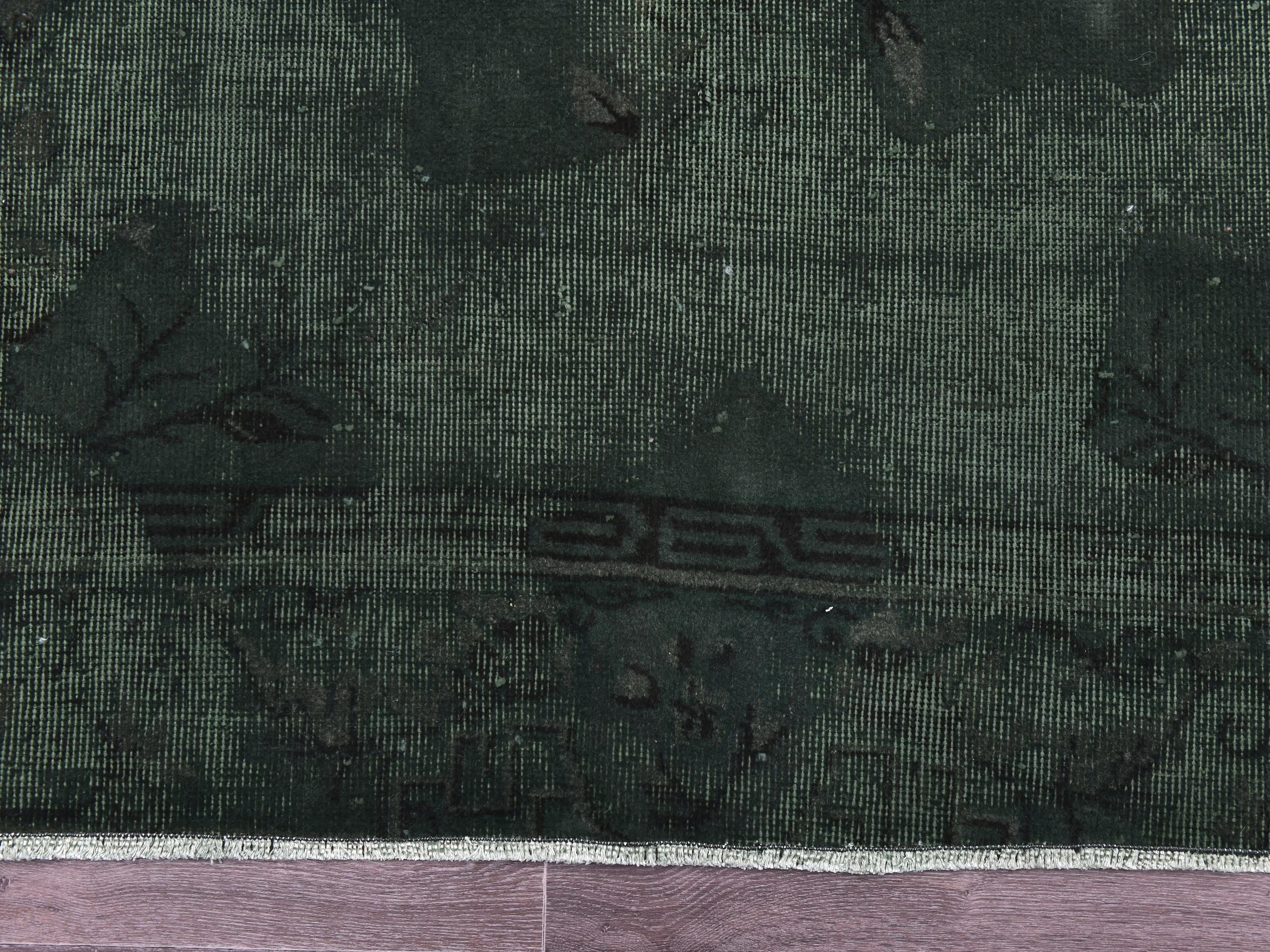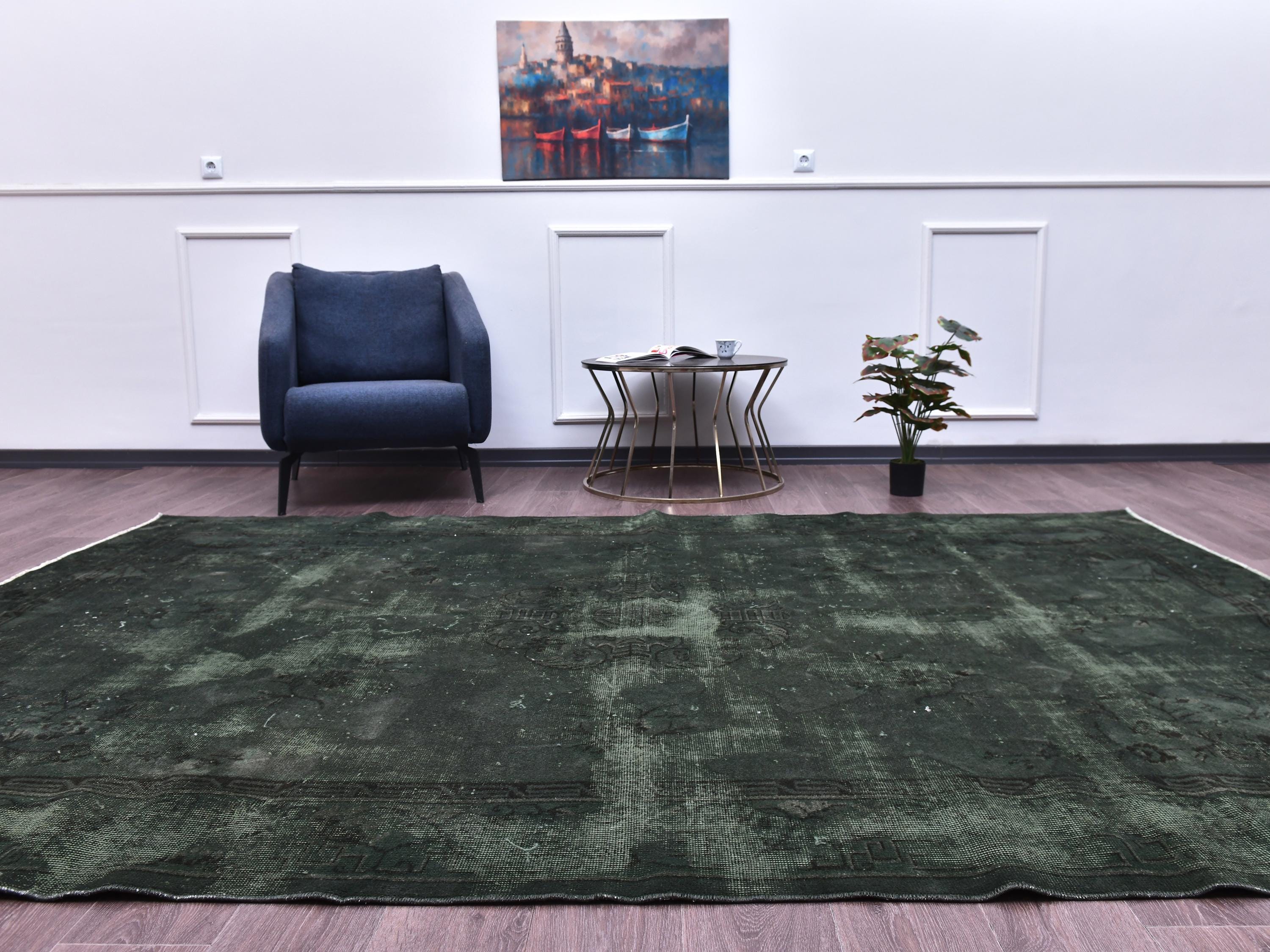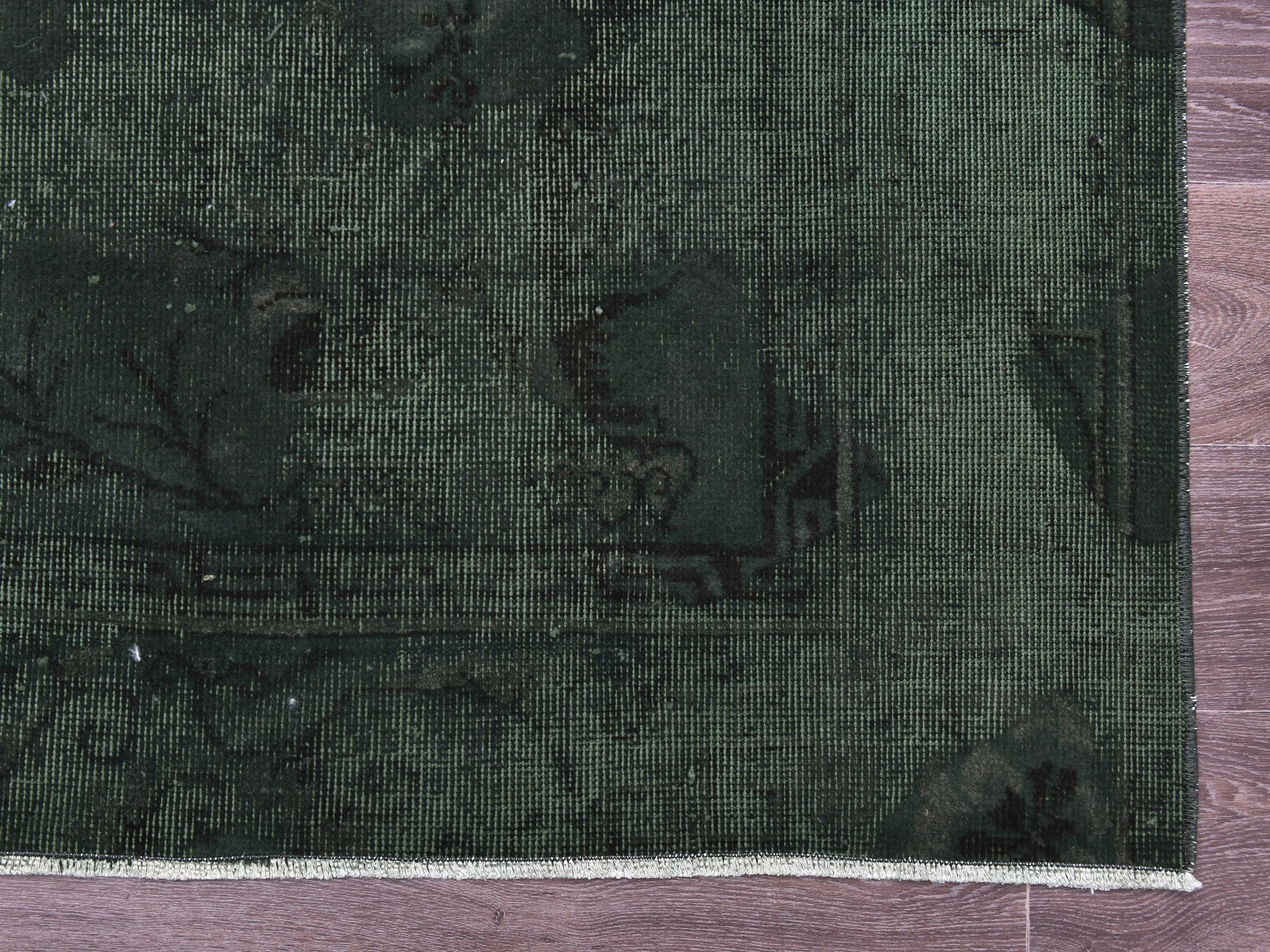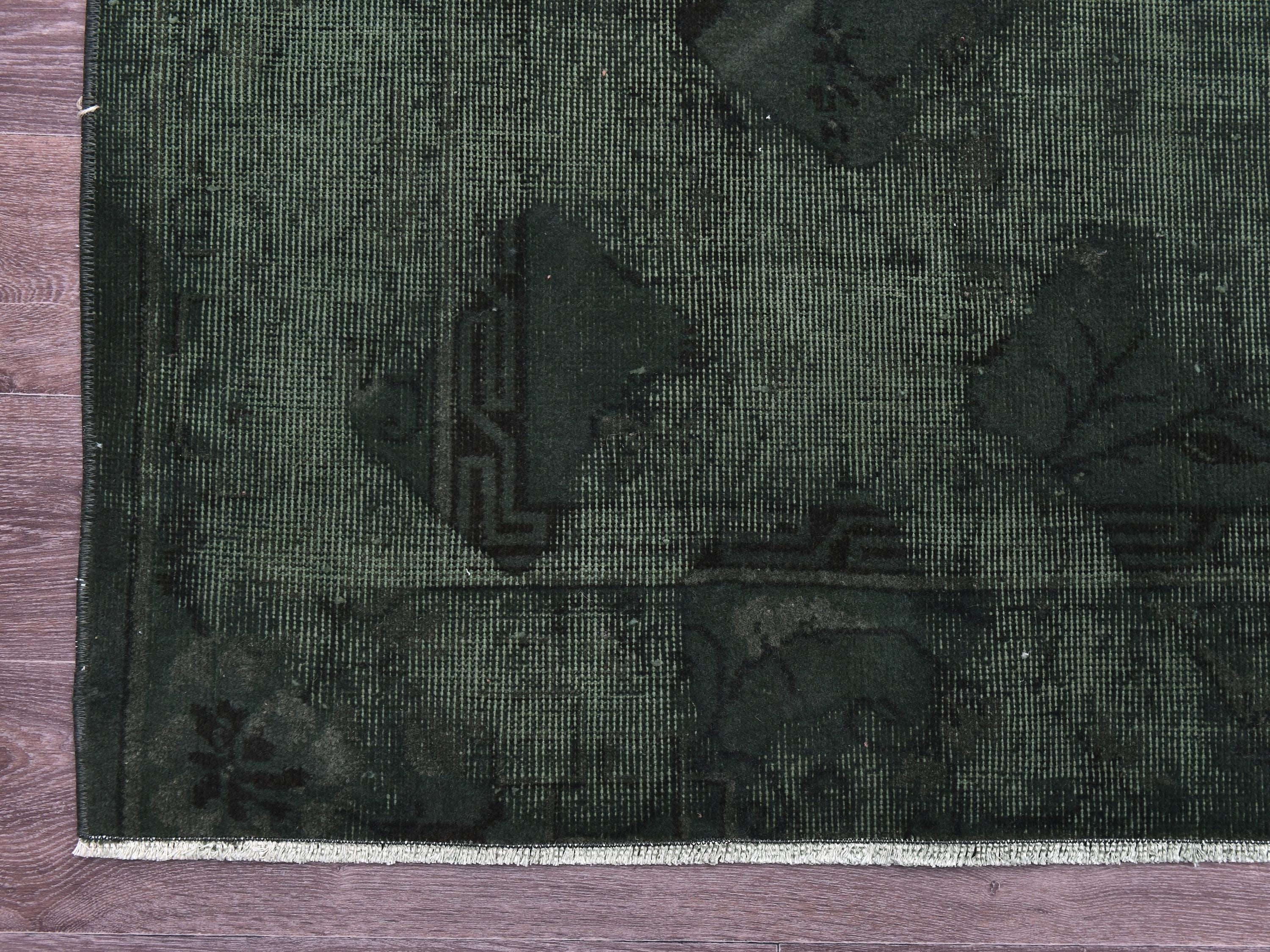 📜📌Green overdyed area rug featuring vintage distressed appearance with tonal variations from dark forest to sage green, hand-knotted wool with faded ornamental border and central medallion design barely visible beneath the rich green overdye treatment
