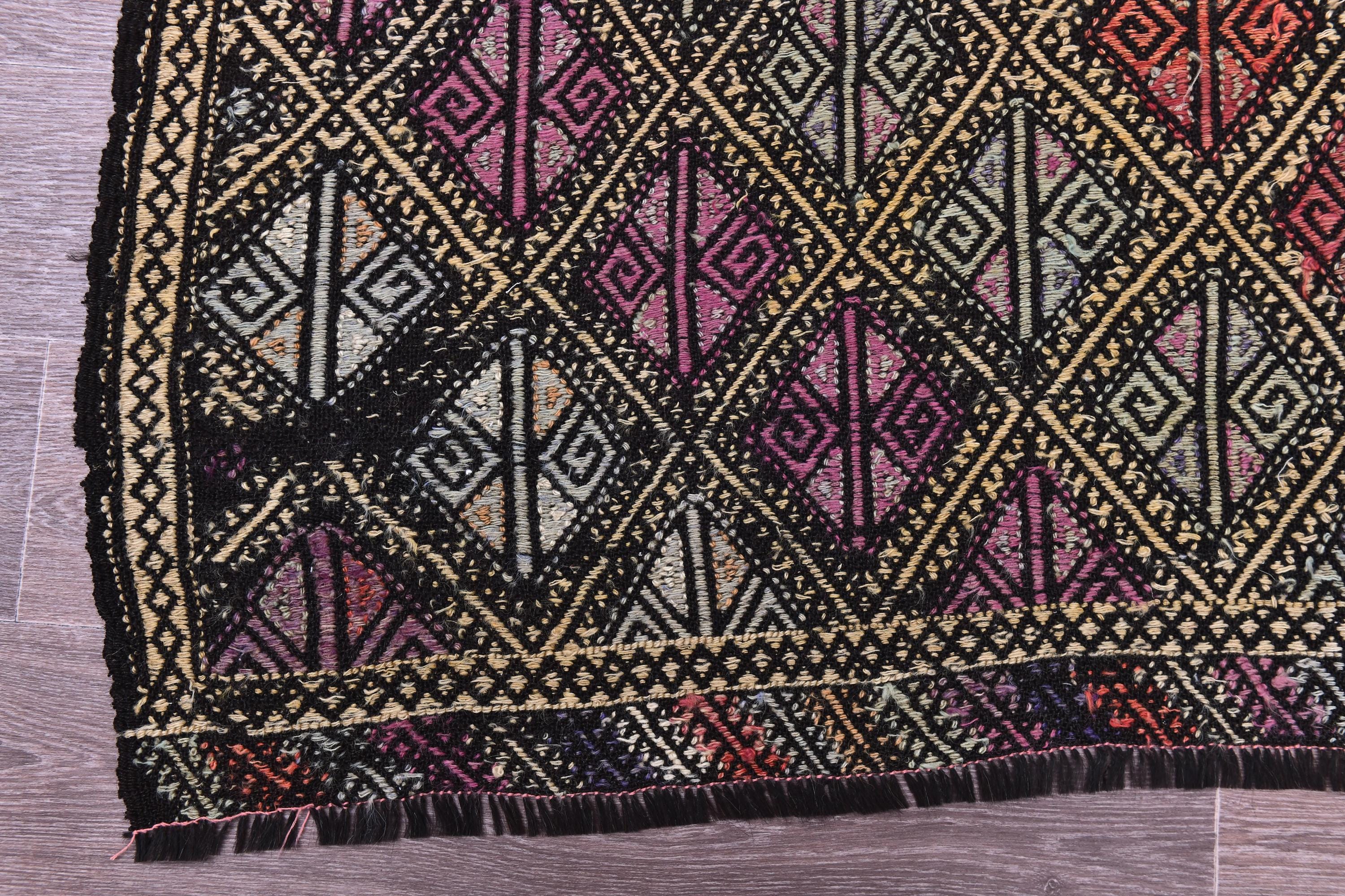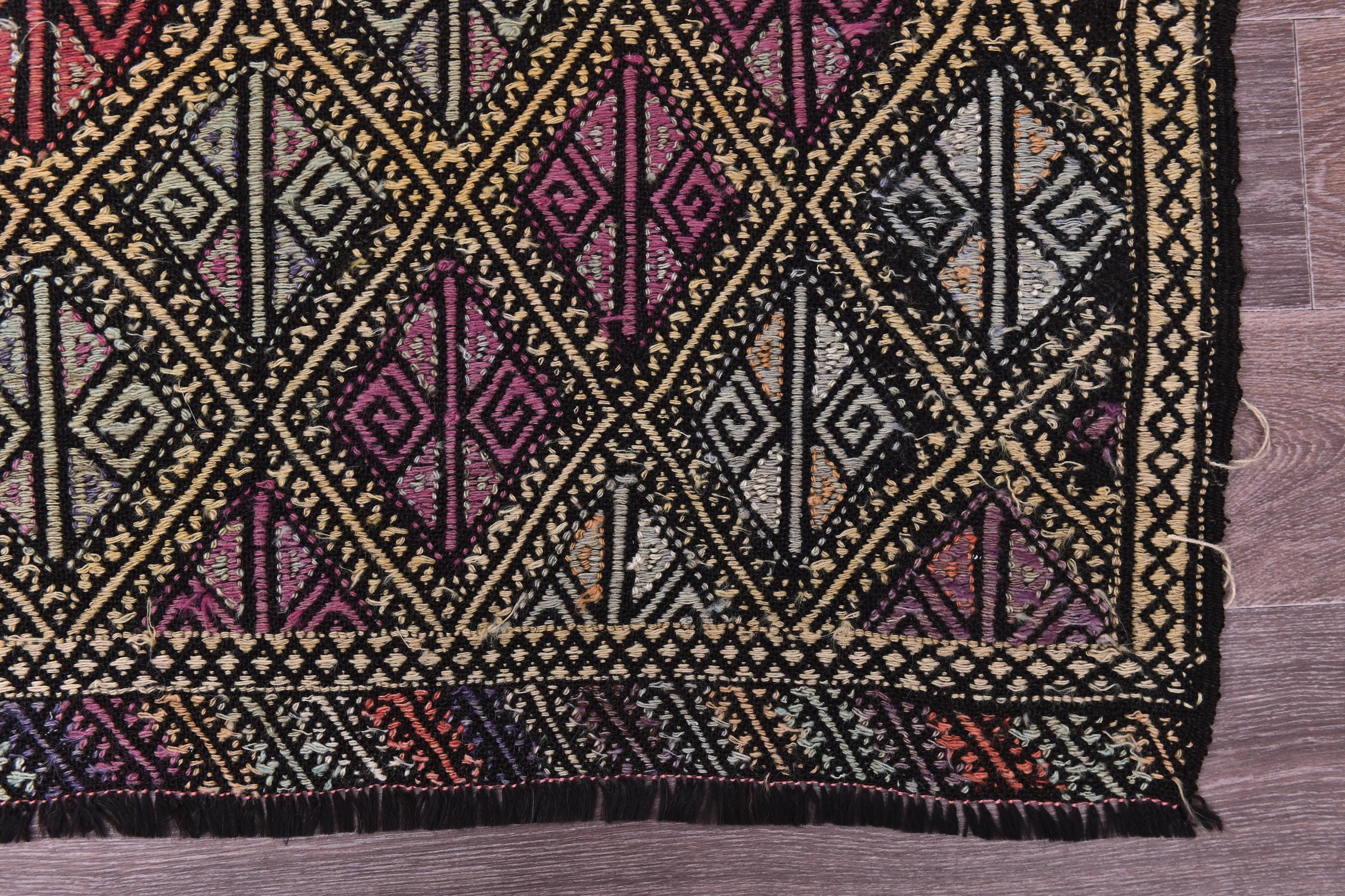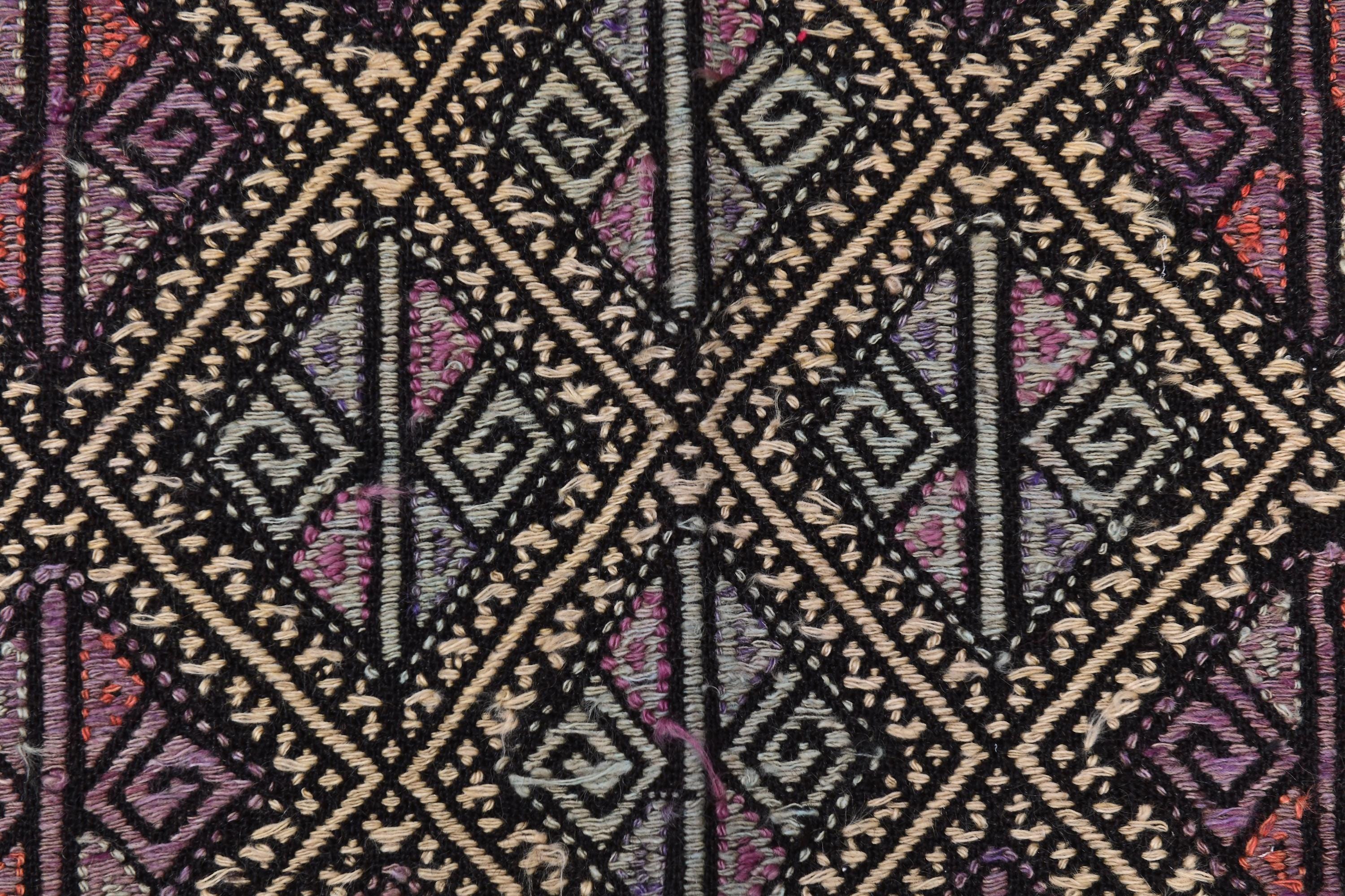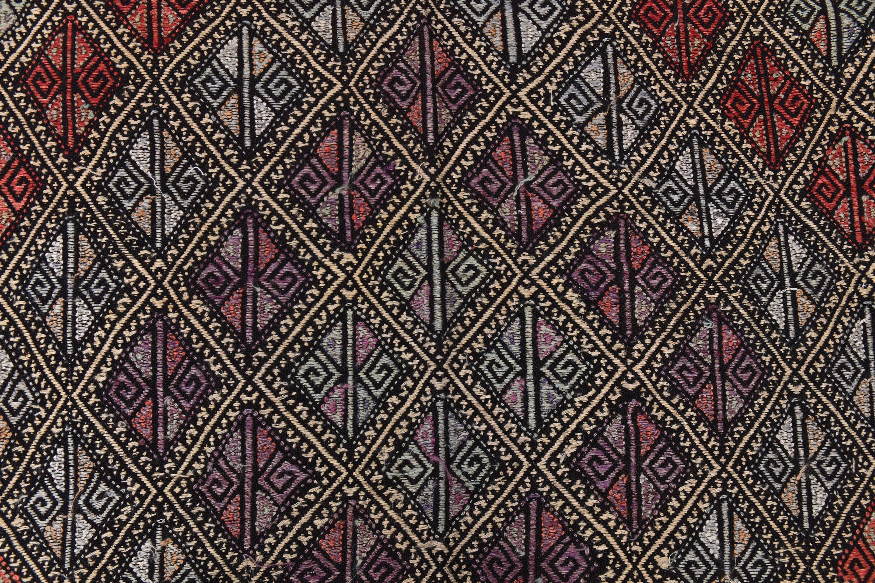 📜📌Vintage Turkish Cicim kilim featuring intricate hand-embroidered geometric diamond grid pattern in purple, coral red, and black with yellow gold accents, traditional flat weave wool construction with supplementary weft embroidery technique, repeating tribal motifs with zigzag and cross designs, authentic Anatolian craftsmanship