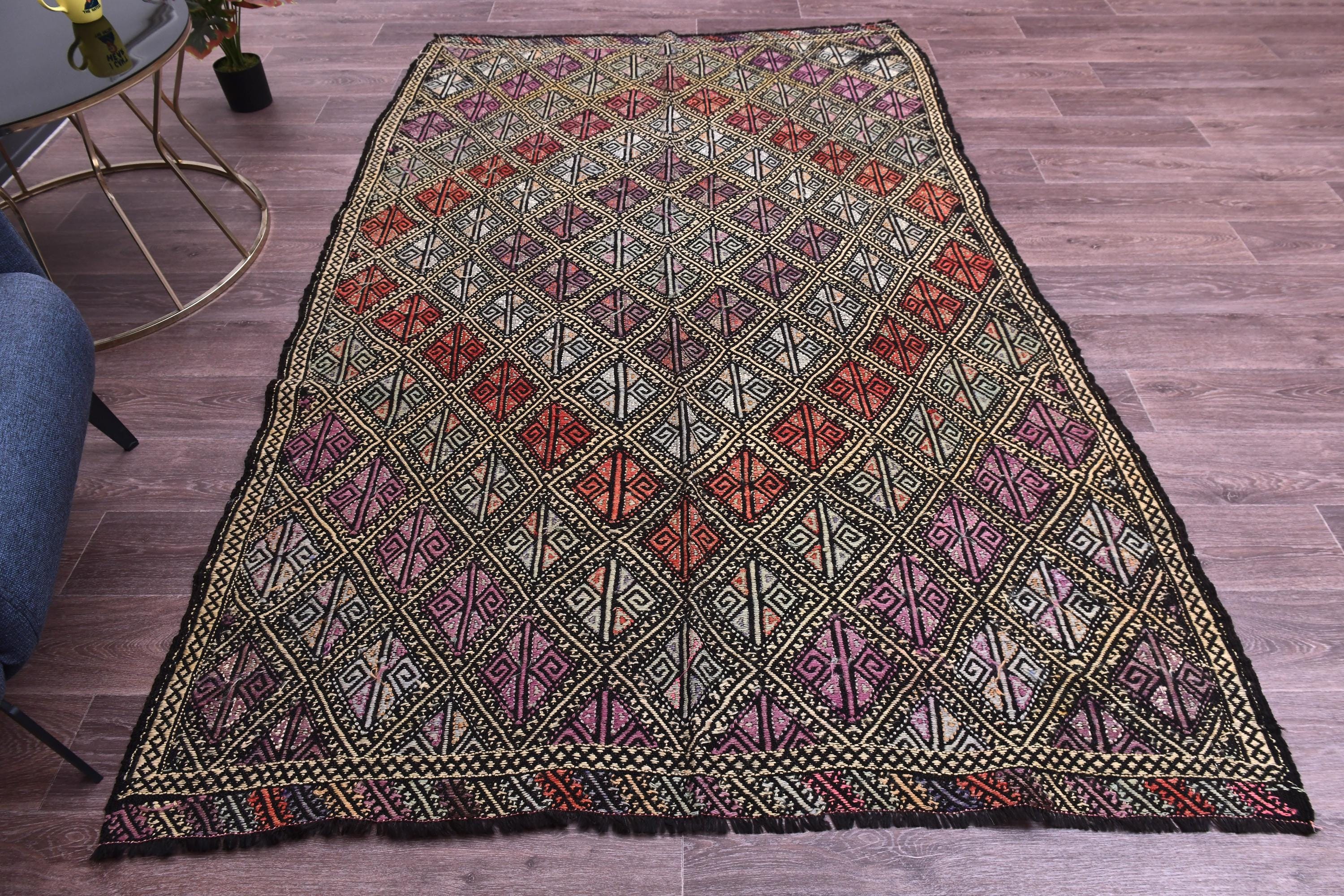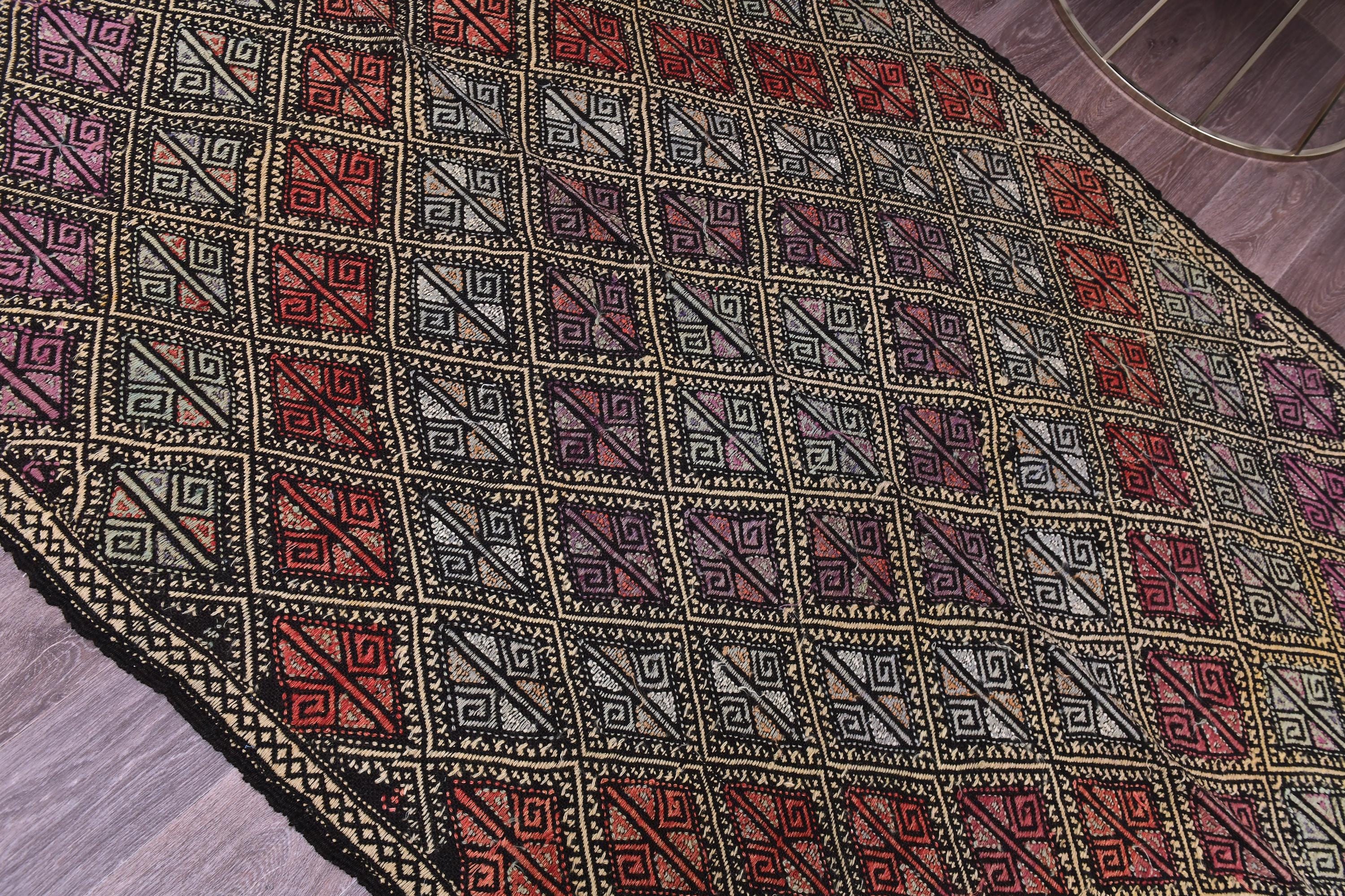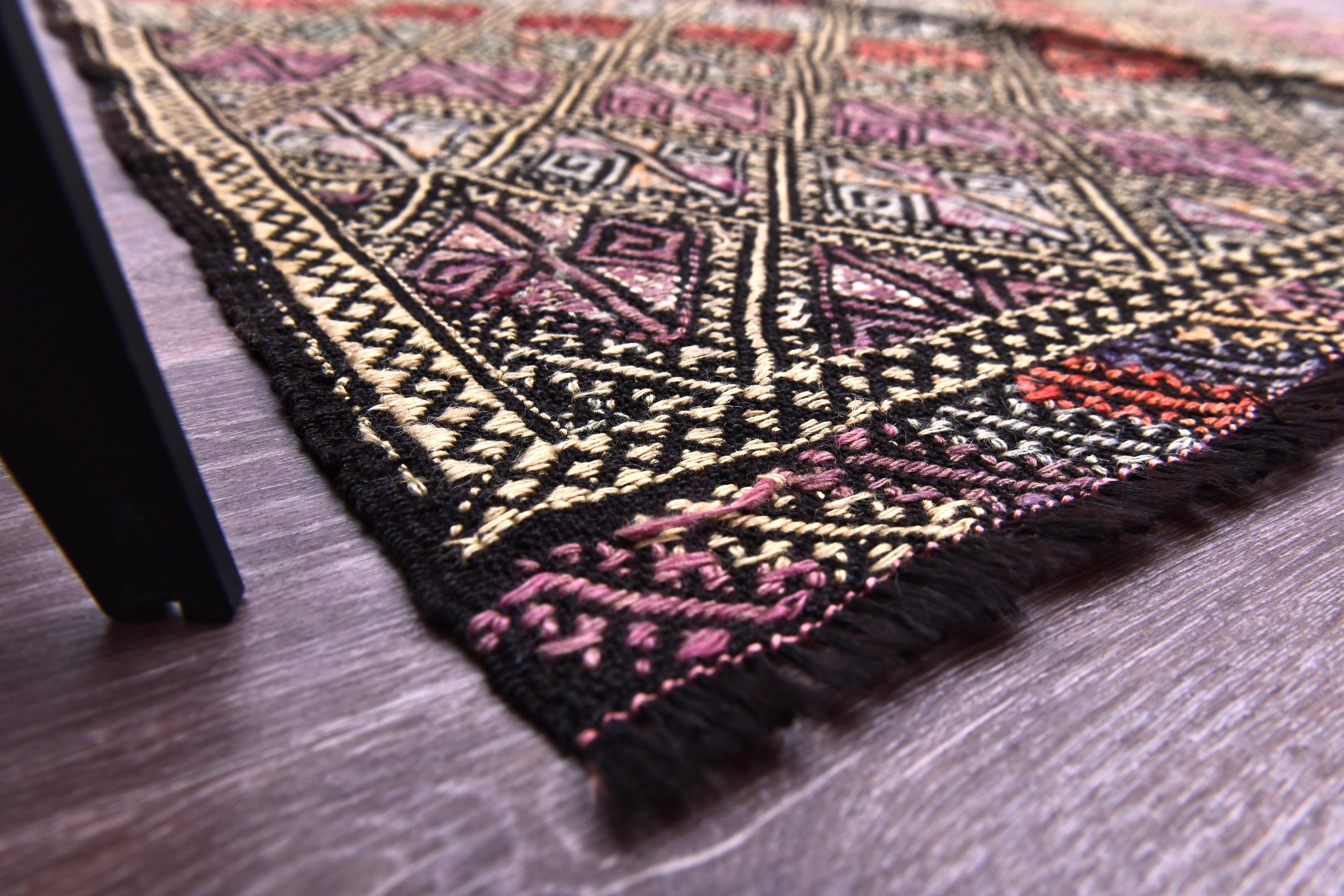 📜📌Vintage Turkish Cicim kilim featuring intricate hand-embroidered geometric diamond grid pattern in purple, coral red, and black with yellow gold accents, traditional flat weave wool construction with supplementary weft embroidery technique, repeating tribal motifs with zigzag and cross designs, authentic Anatolian craftsmanship
