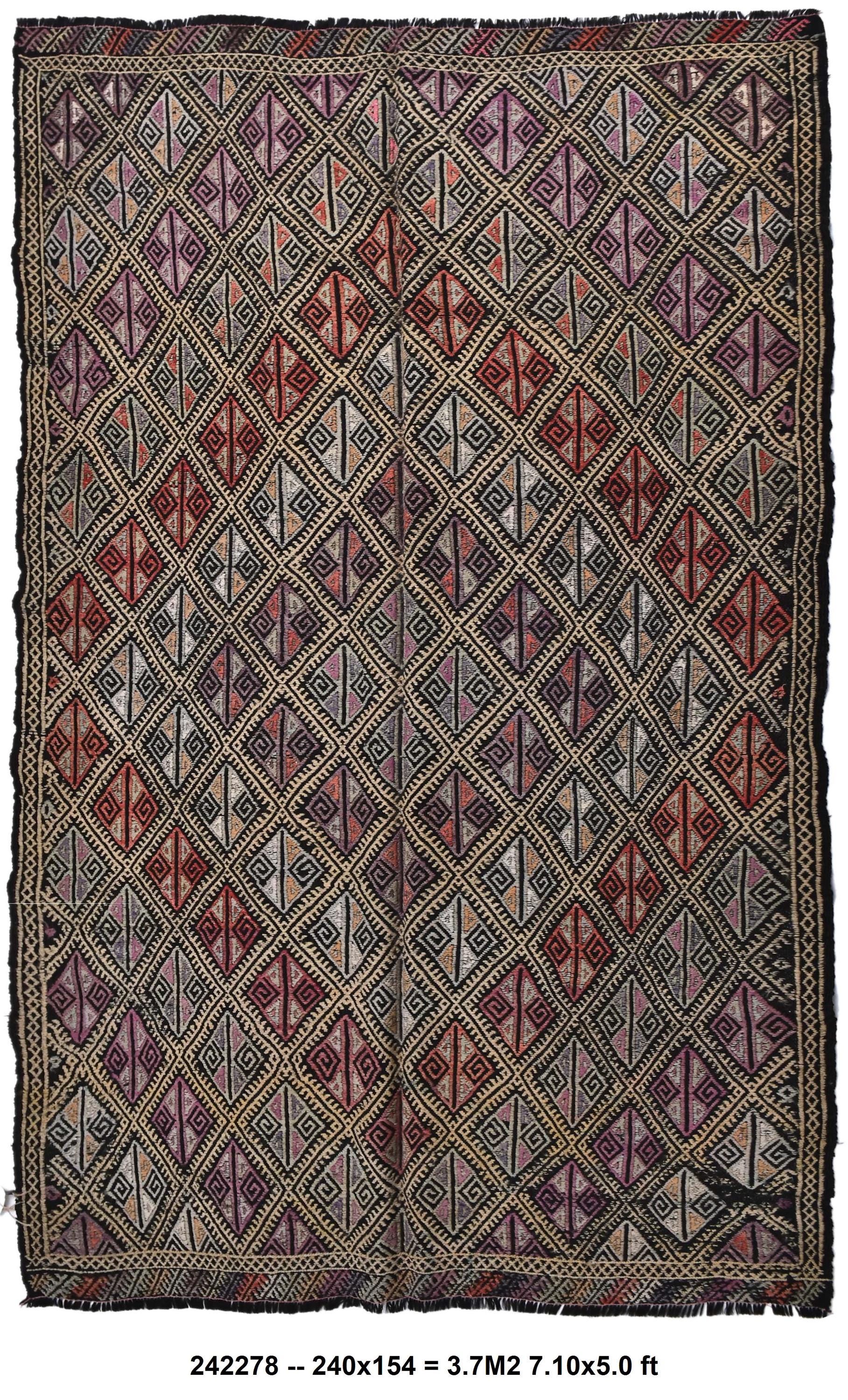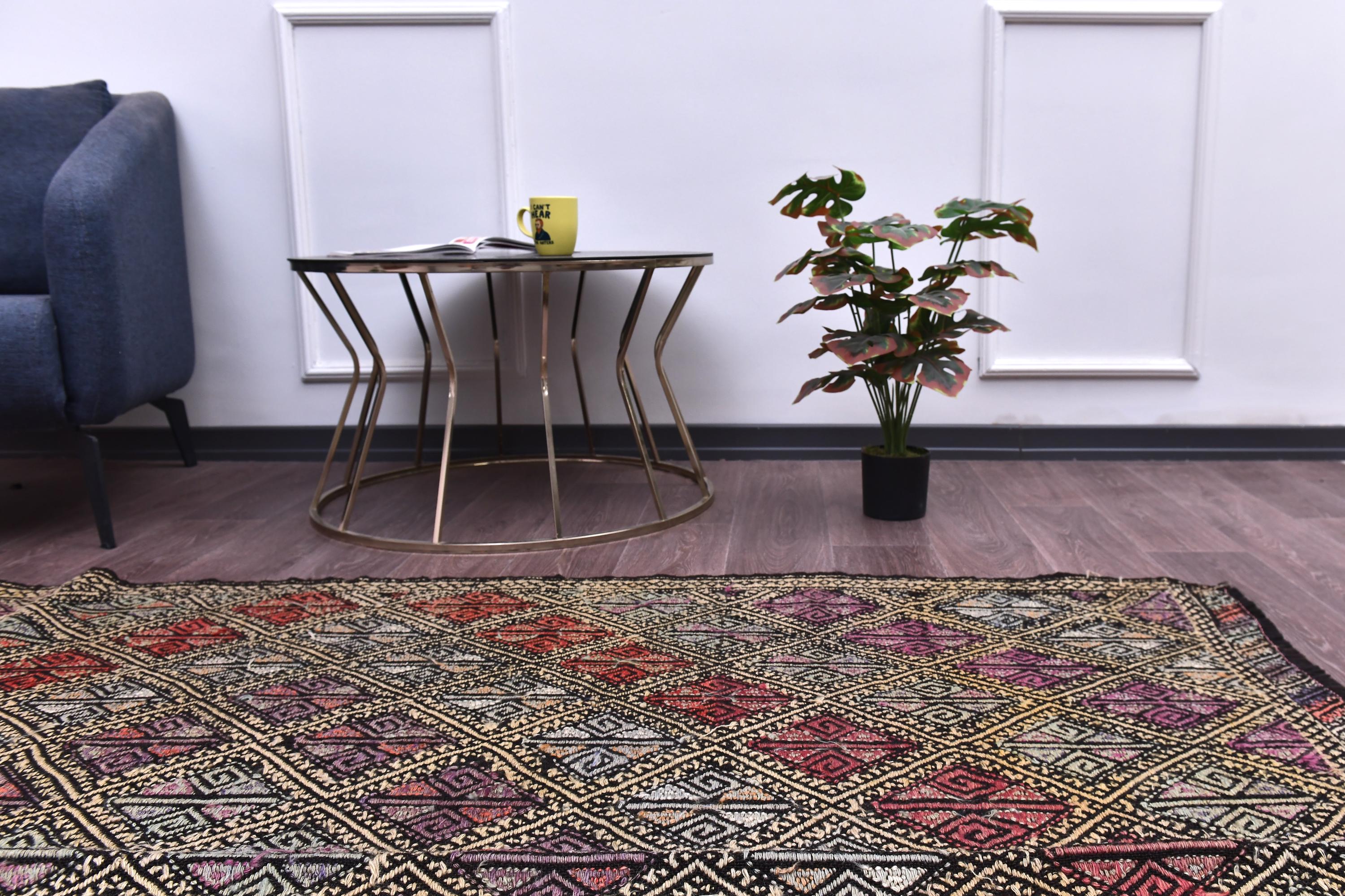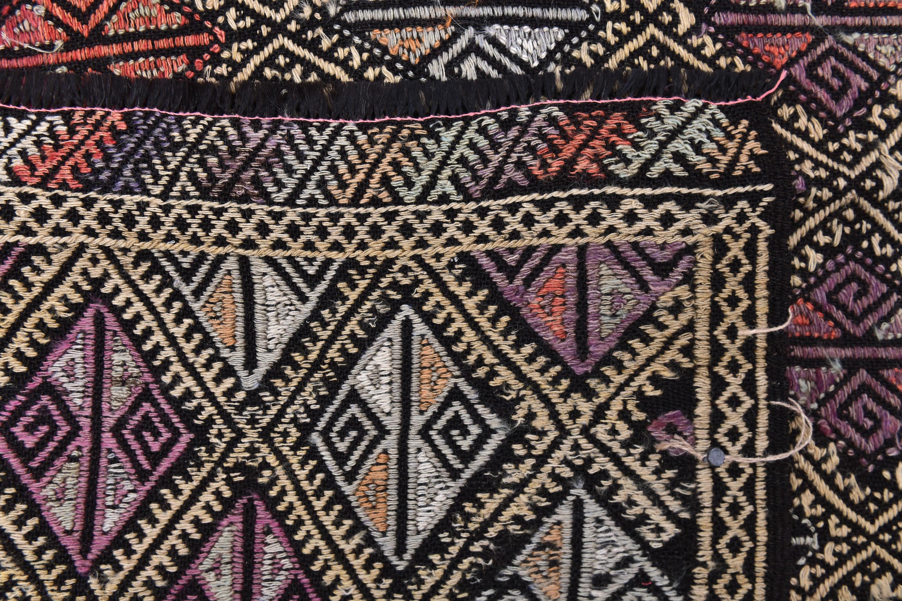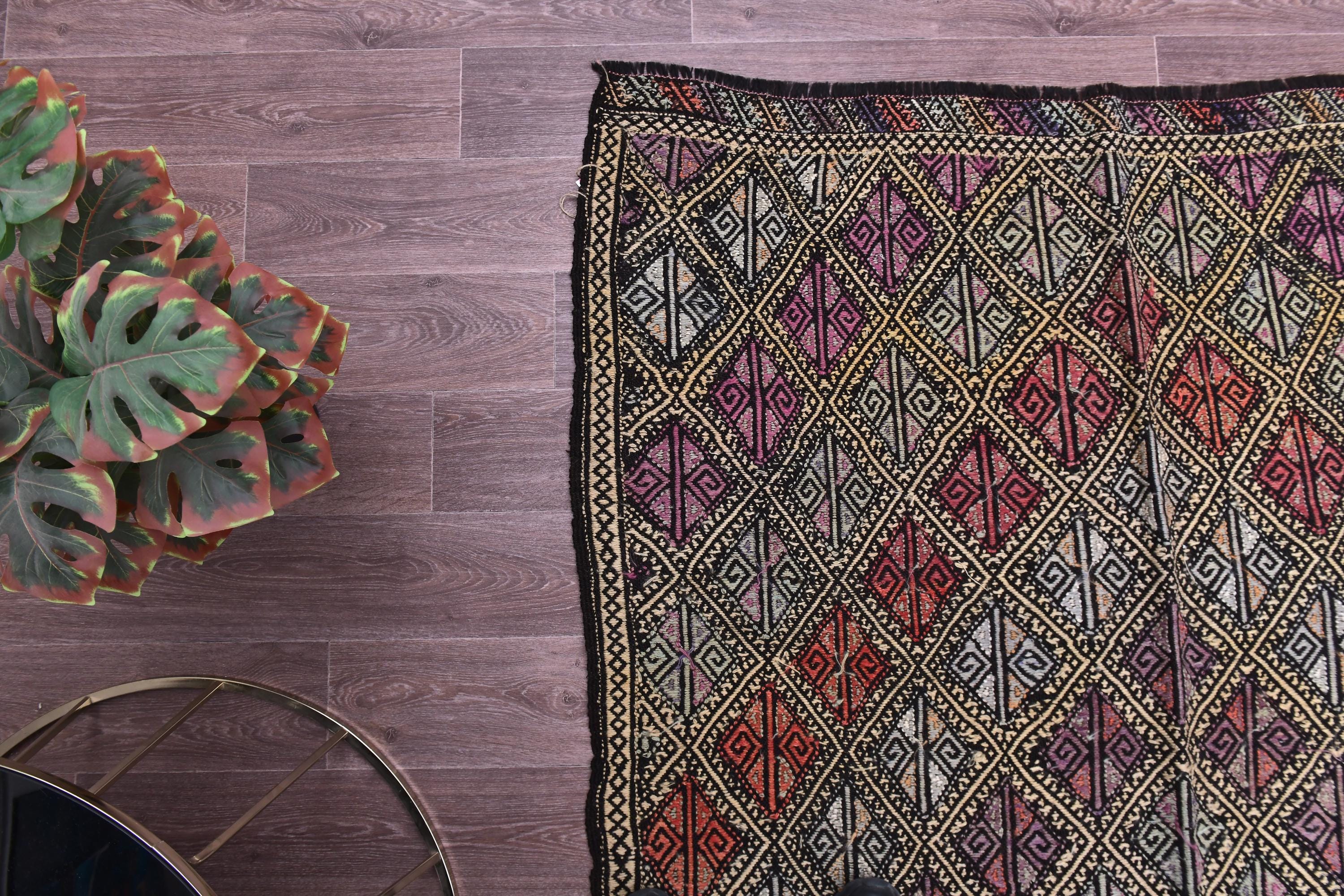 📜📌Vintage Turkish Cicim kilim featuring intricate hand-embroidered geometric diamond grid pattern in purple, coral red, and black with yellow gold accents, traditional flat weave wool construction with supplementary weft embroidery technique, repeating tribal motifs with zigzag and cross designs, authentic Anatolian craftsmanship