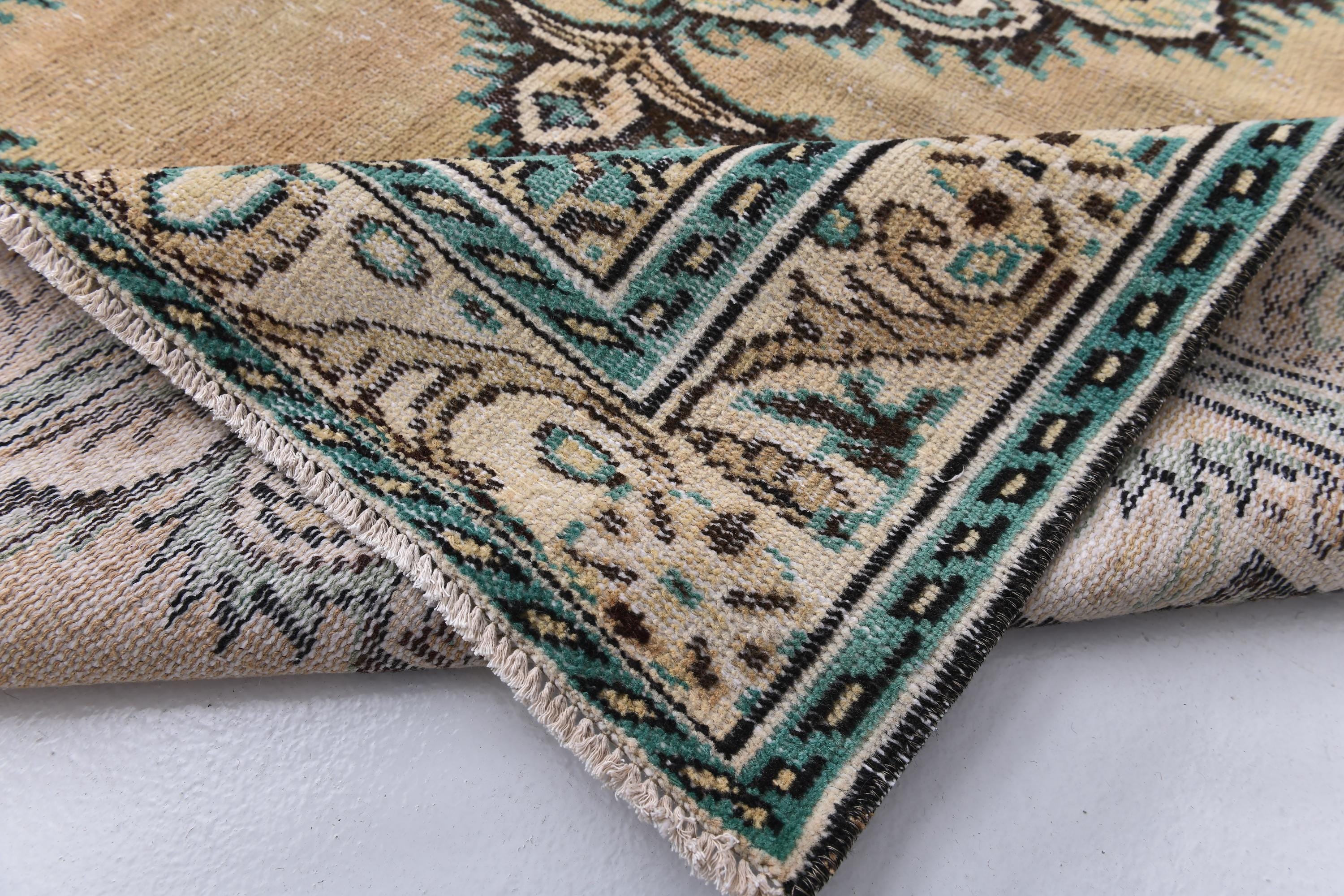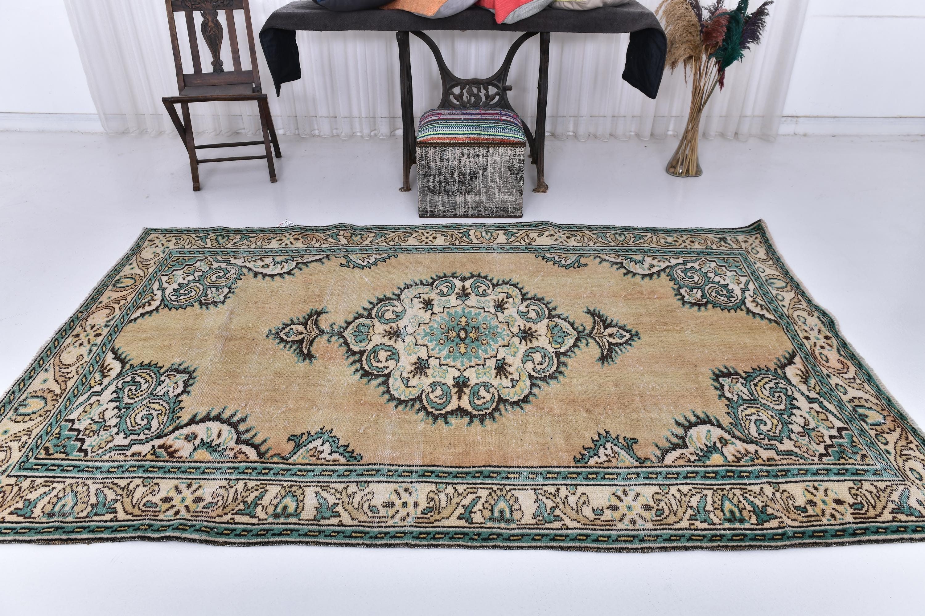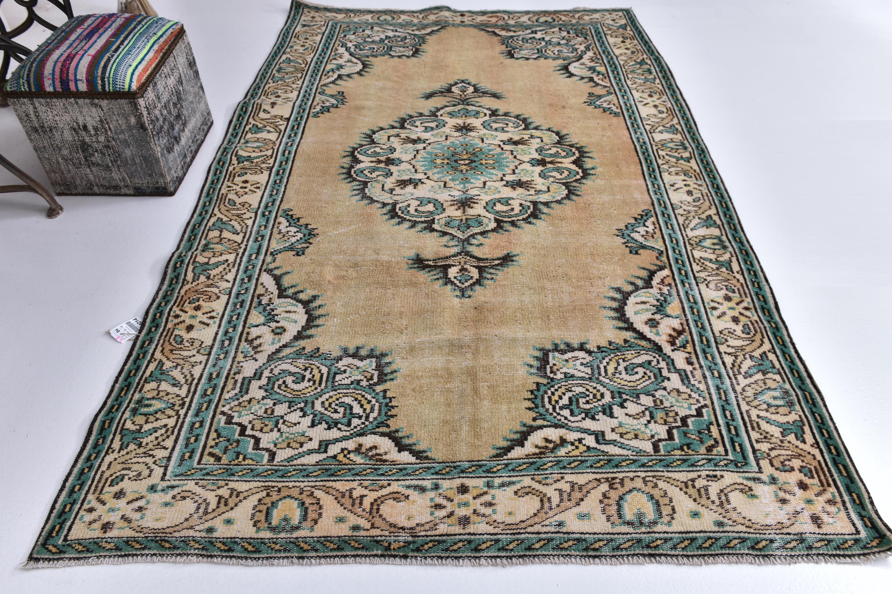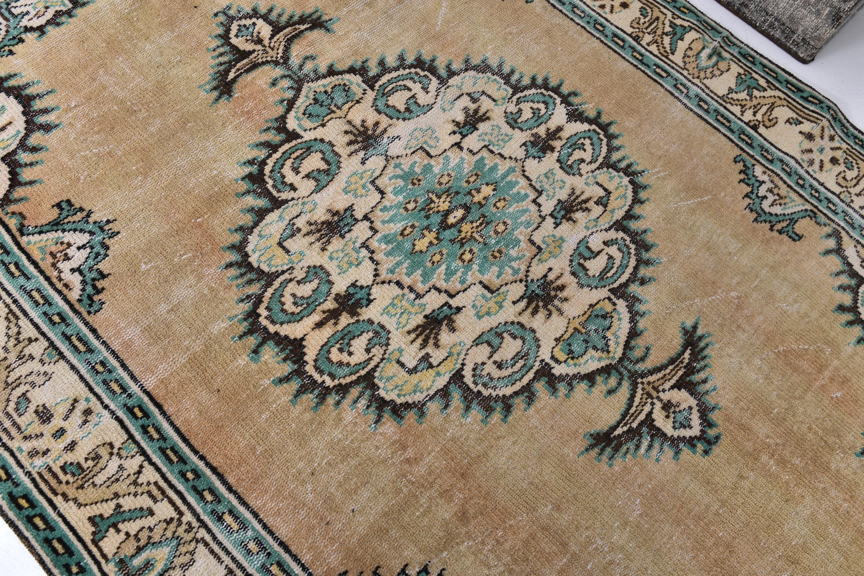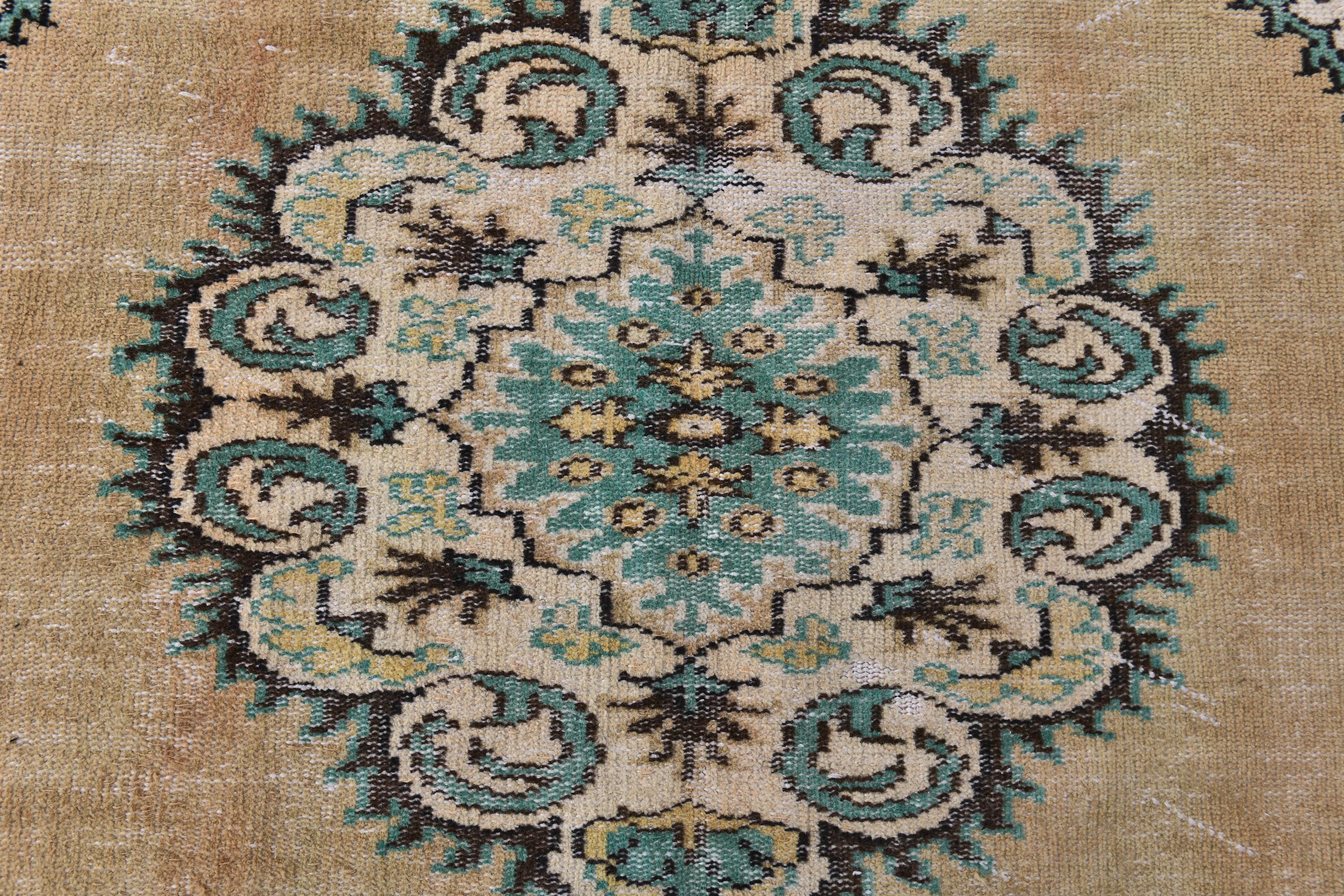 📜📌 Distressed vintage Turkish carpet with classic medallion layout in soft neutral beige background, detailed central rosette in teal blue-green and ivory with delicate botanical scrollwork, hand-woven wool pile with aged worn appearance, ornamental corner cartouches with paisley and floral patterns, wide decorative border with vine motifs