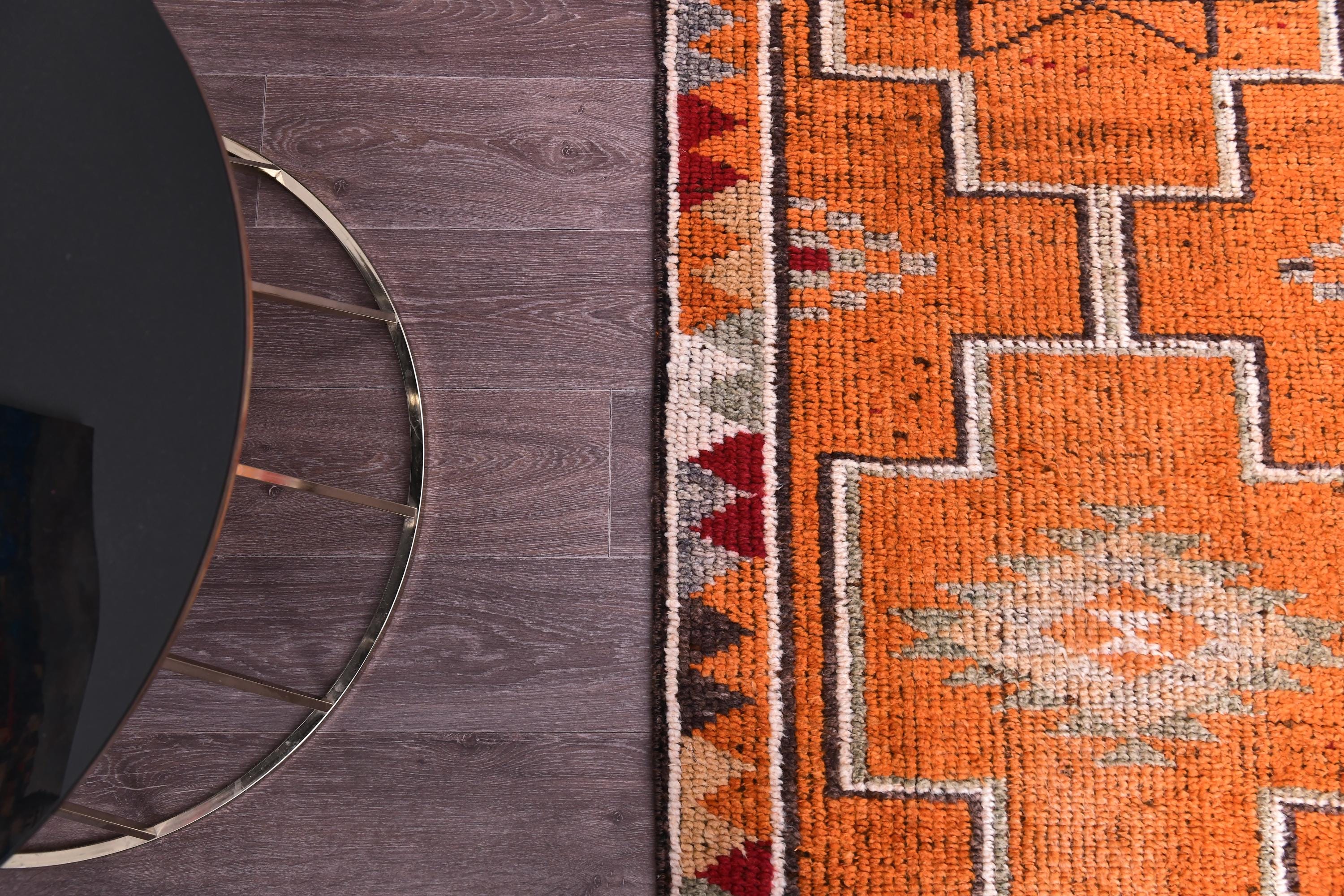 📜📌 Vintage distressed Turkish runner rug featuring geometric medallion patterns in rich burnt orange, and neutral beige tones with a decorative border, displayed on gray wood floor in modern interior