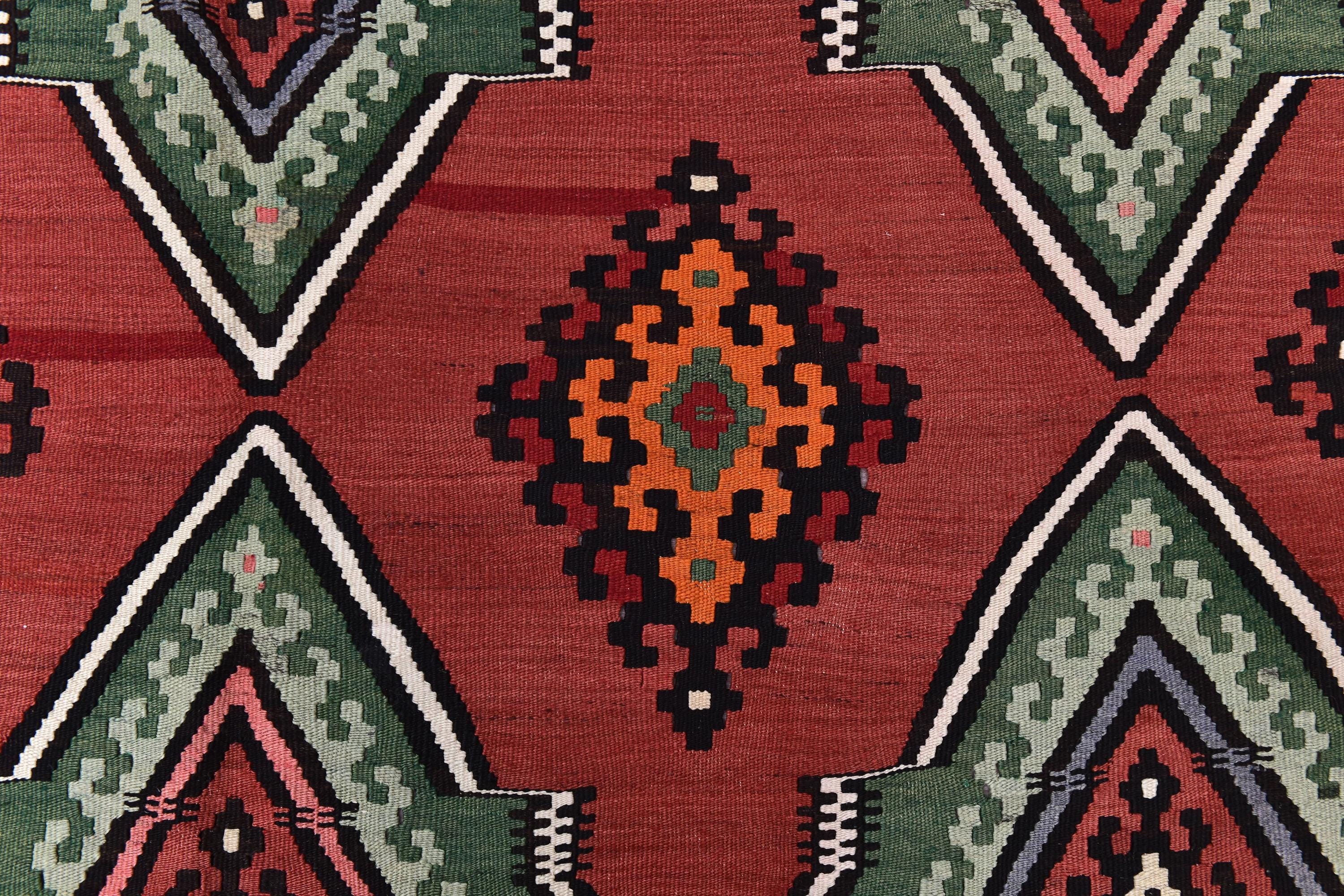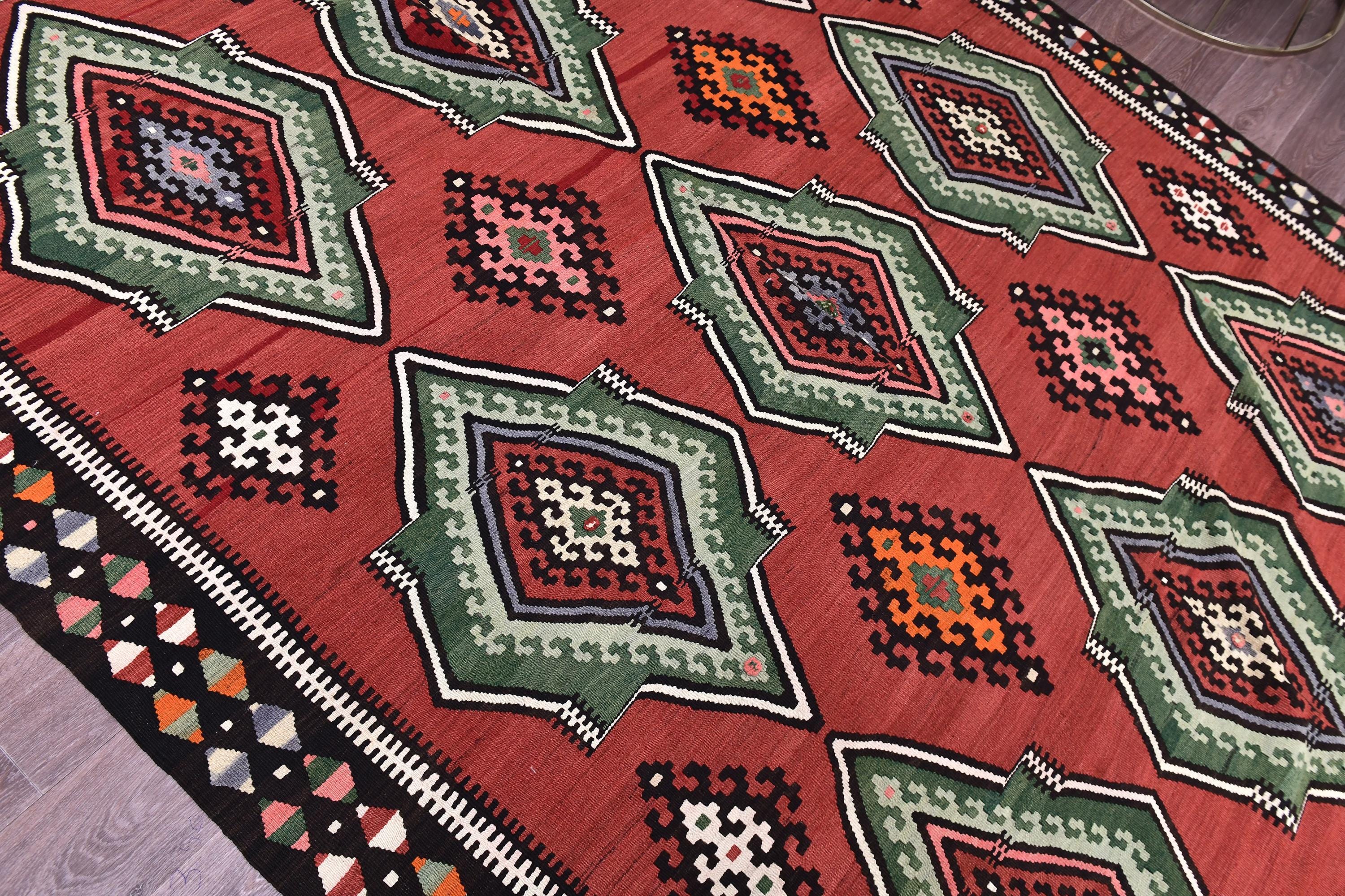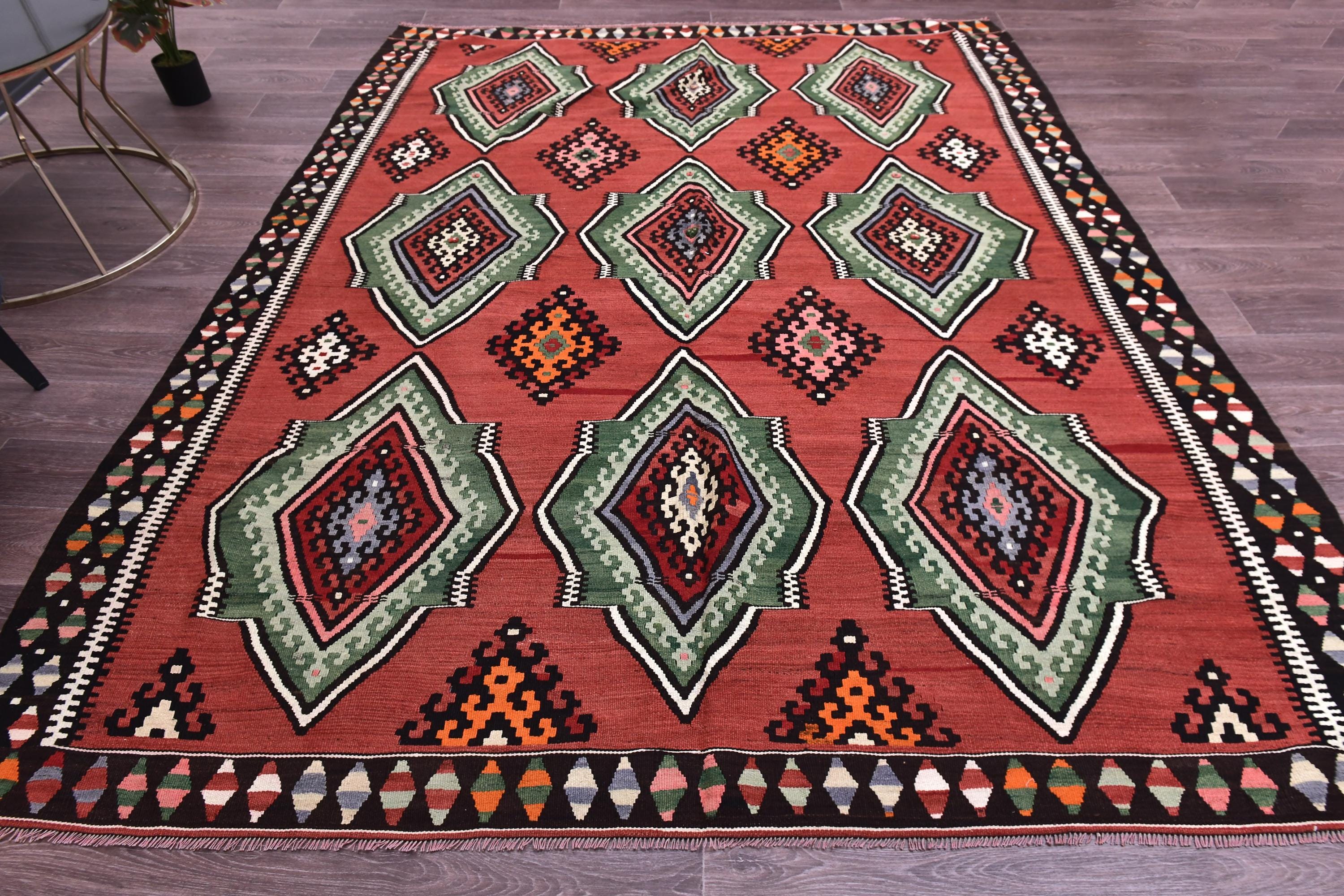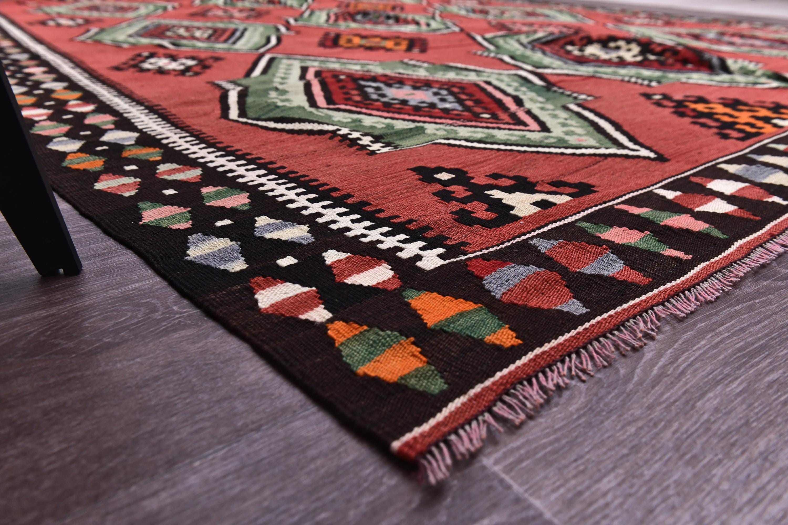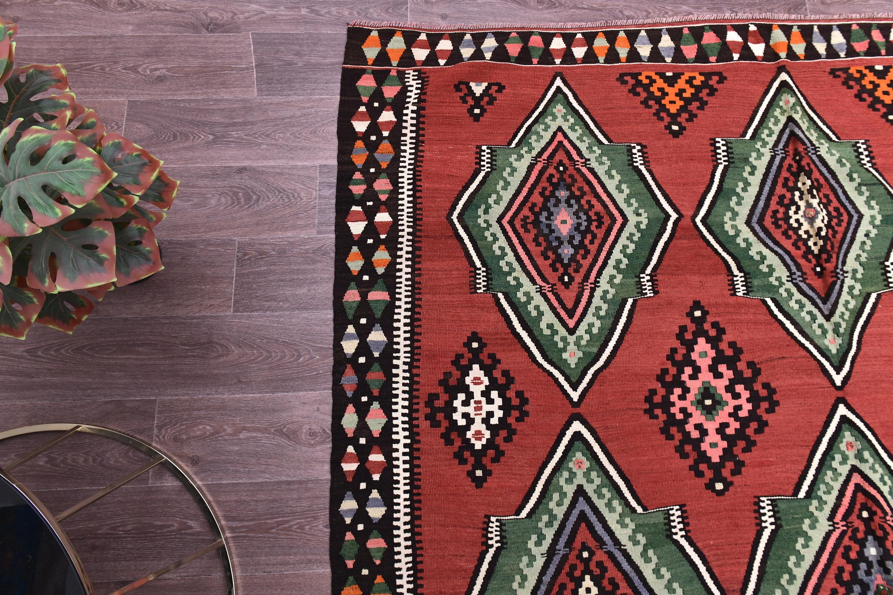 📜📌 Handwoven Turkish kilim rug featuring vibrant coral-red background with geometric diamond medallions in olive green, black, and cream. The rug displays traditional tribal patterns with smaller colorful diamond motifs scattered throughout the field. Decorative border with triangular and diamond shapes in multicolored arrangement on black background. Flat-woven wool construction with visible fringe edges.