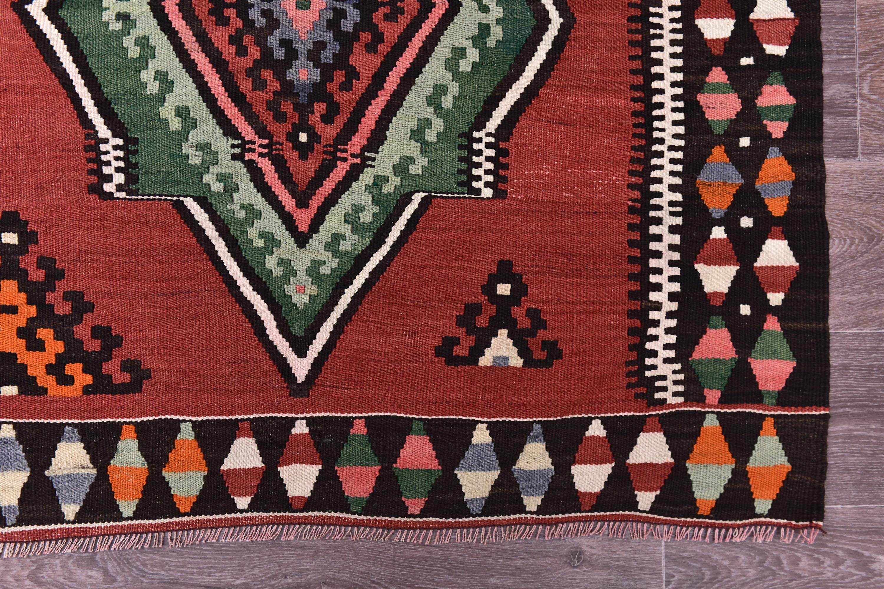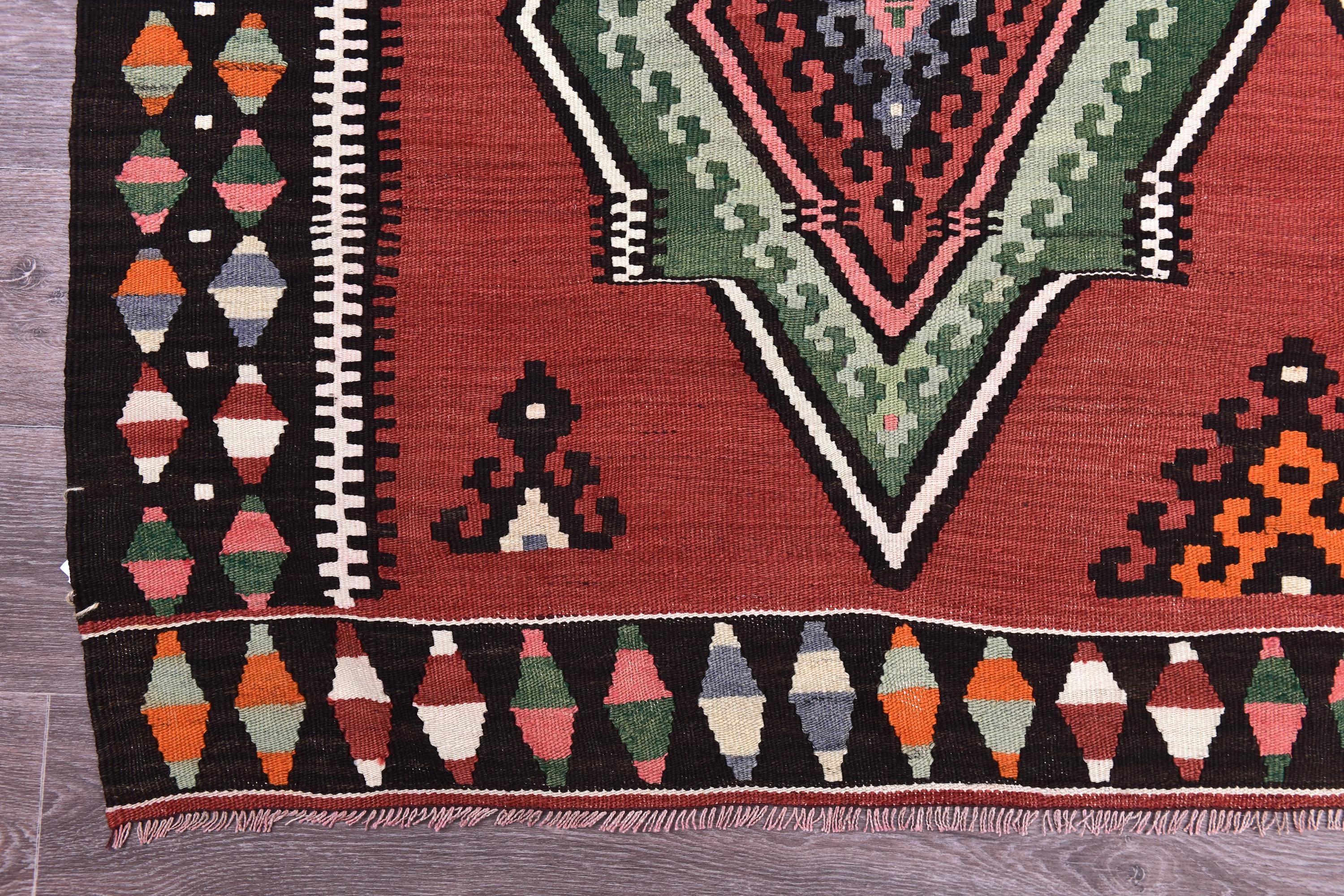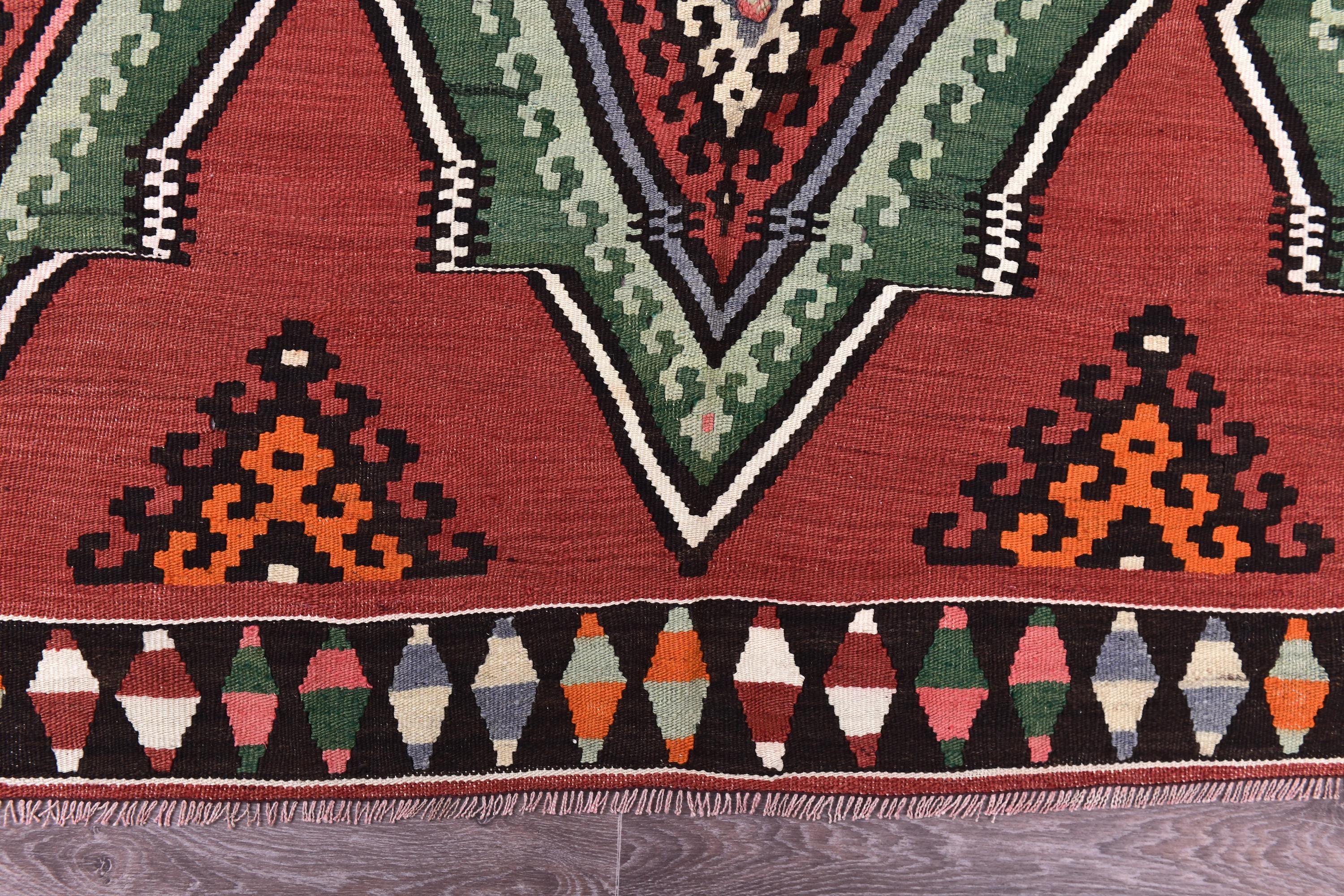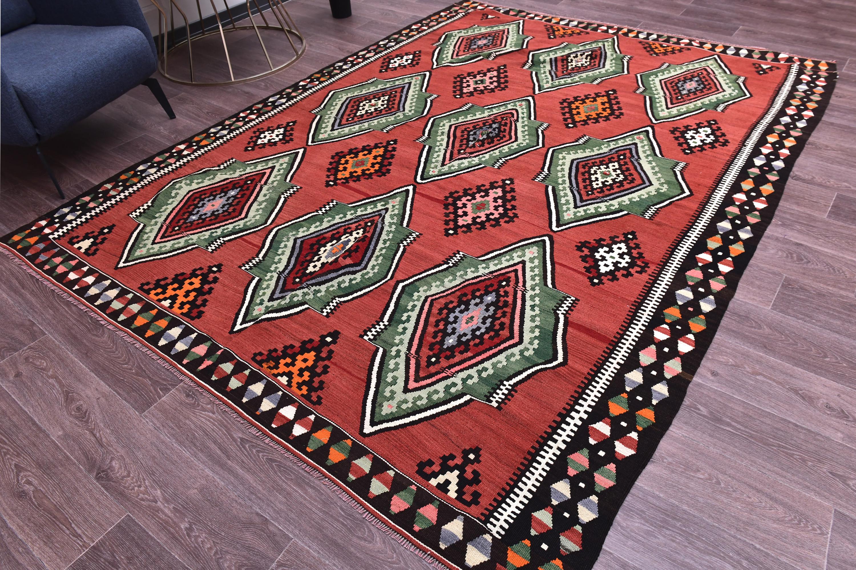 📜📌 Handwoven Turkish kilim rug featuring vibrant coral-red background with geometric diamond medallions in olive green, black, and cream. The rug displays traditional tribal patterns with smaller colorful diamond motifs scattered throughout the field. Decorative border with triangular and diamond shapes in multicolored arrangement on black background. Flat-woven wool construction with visible fringe edges.