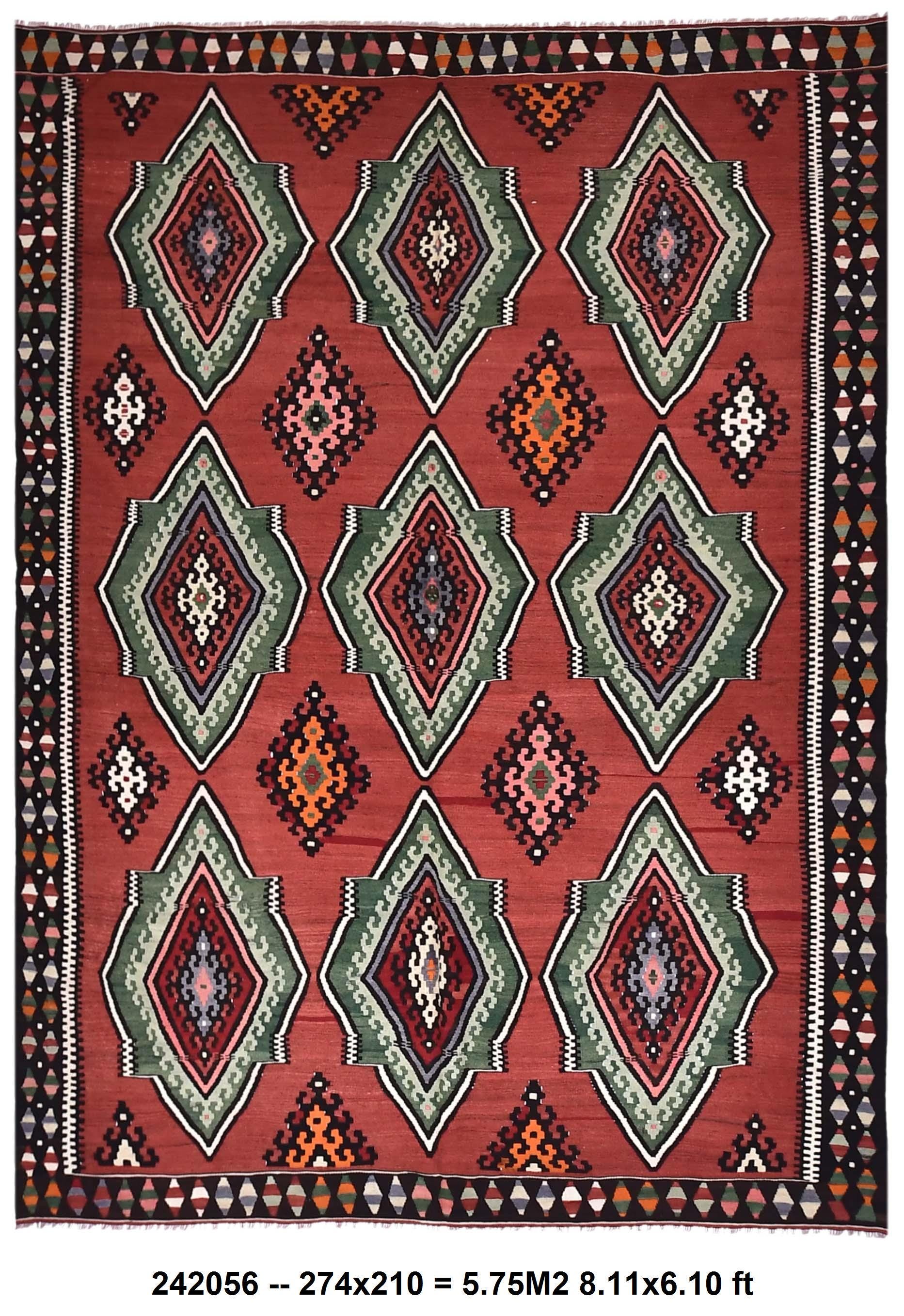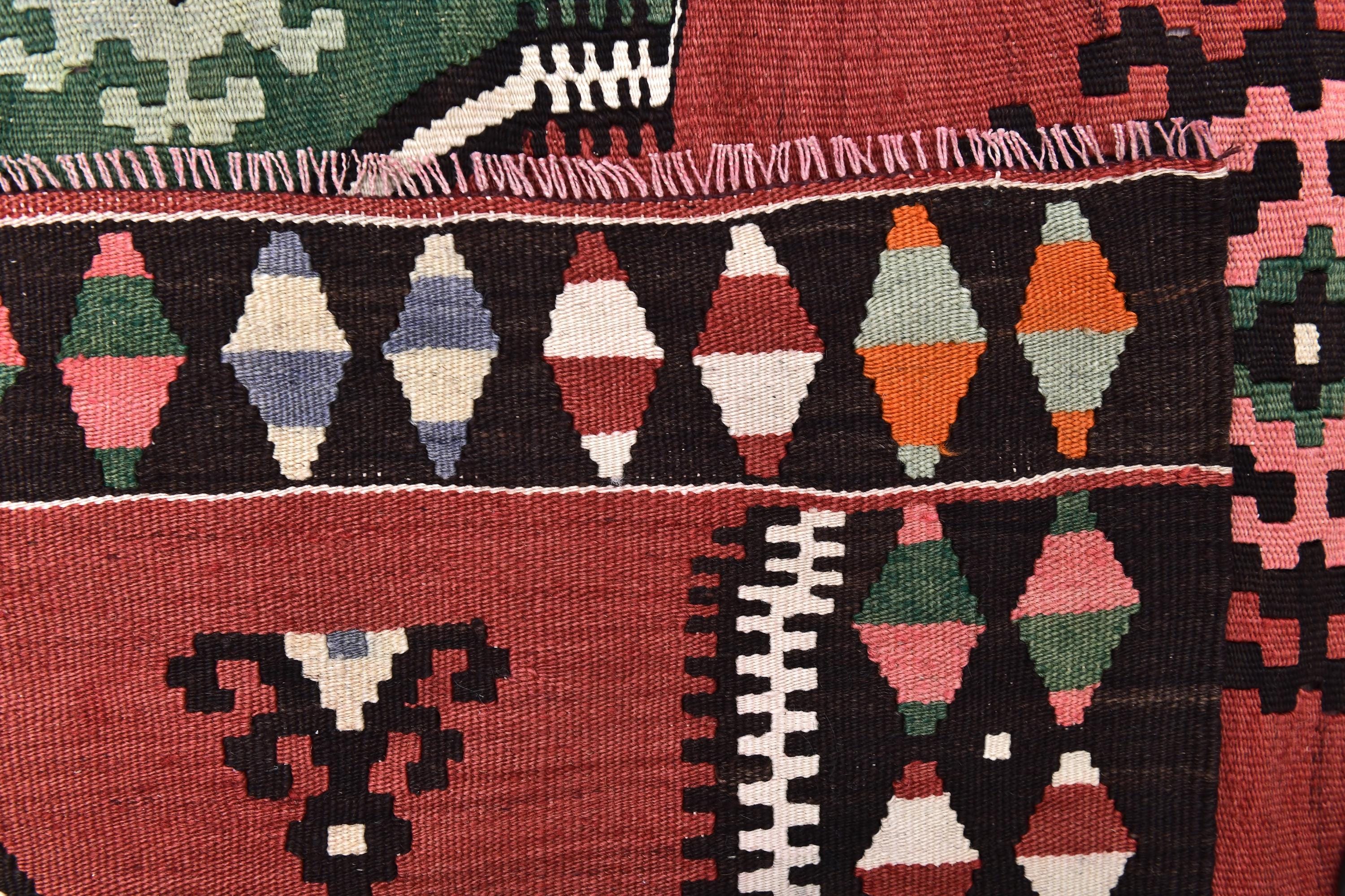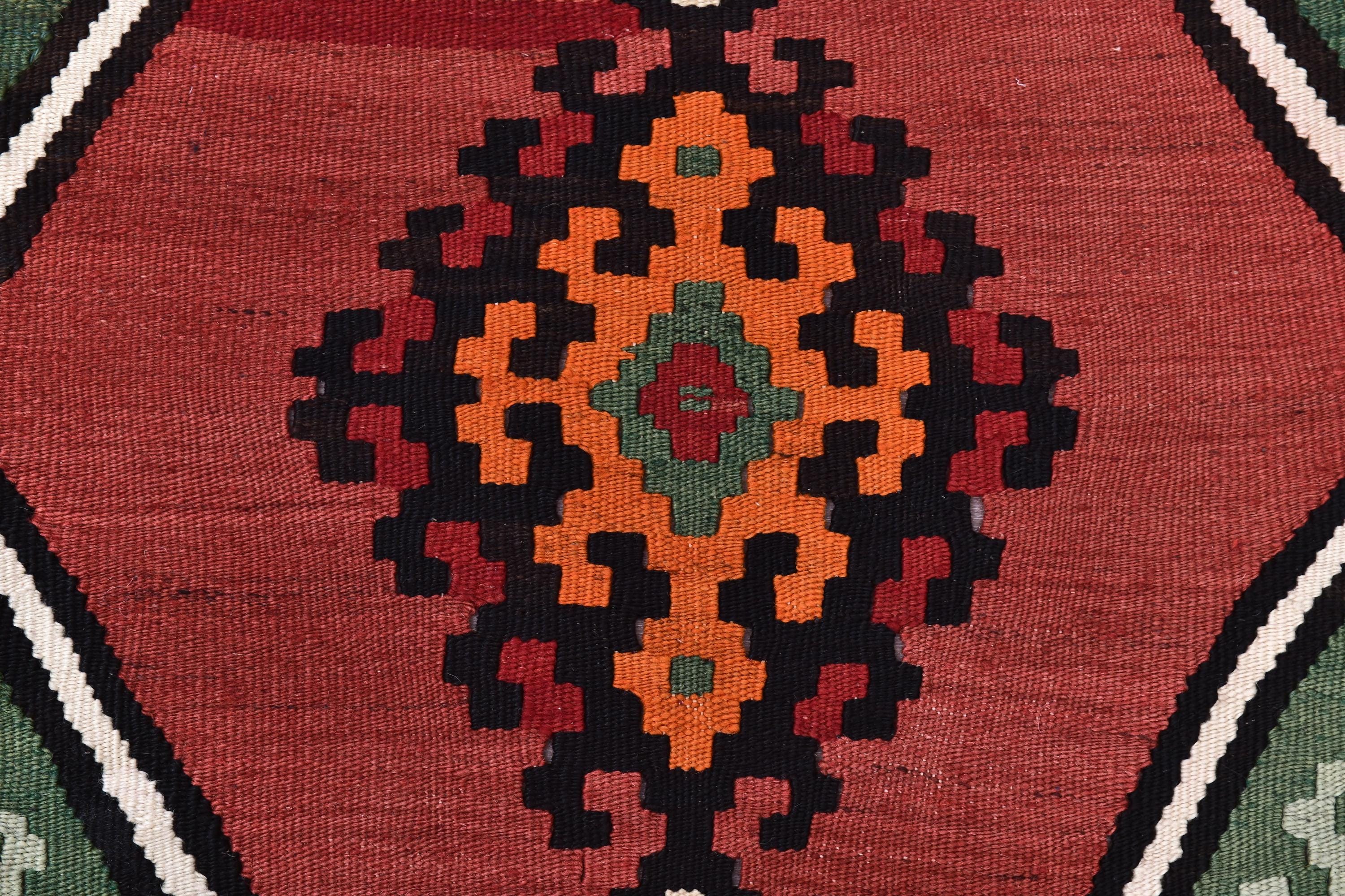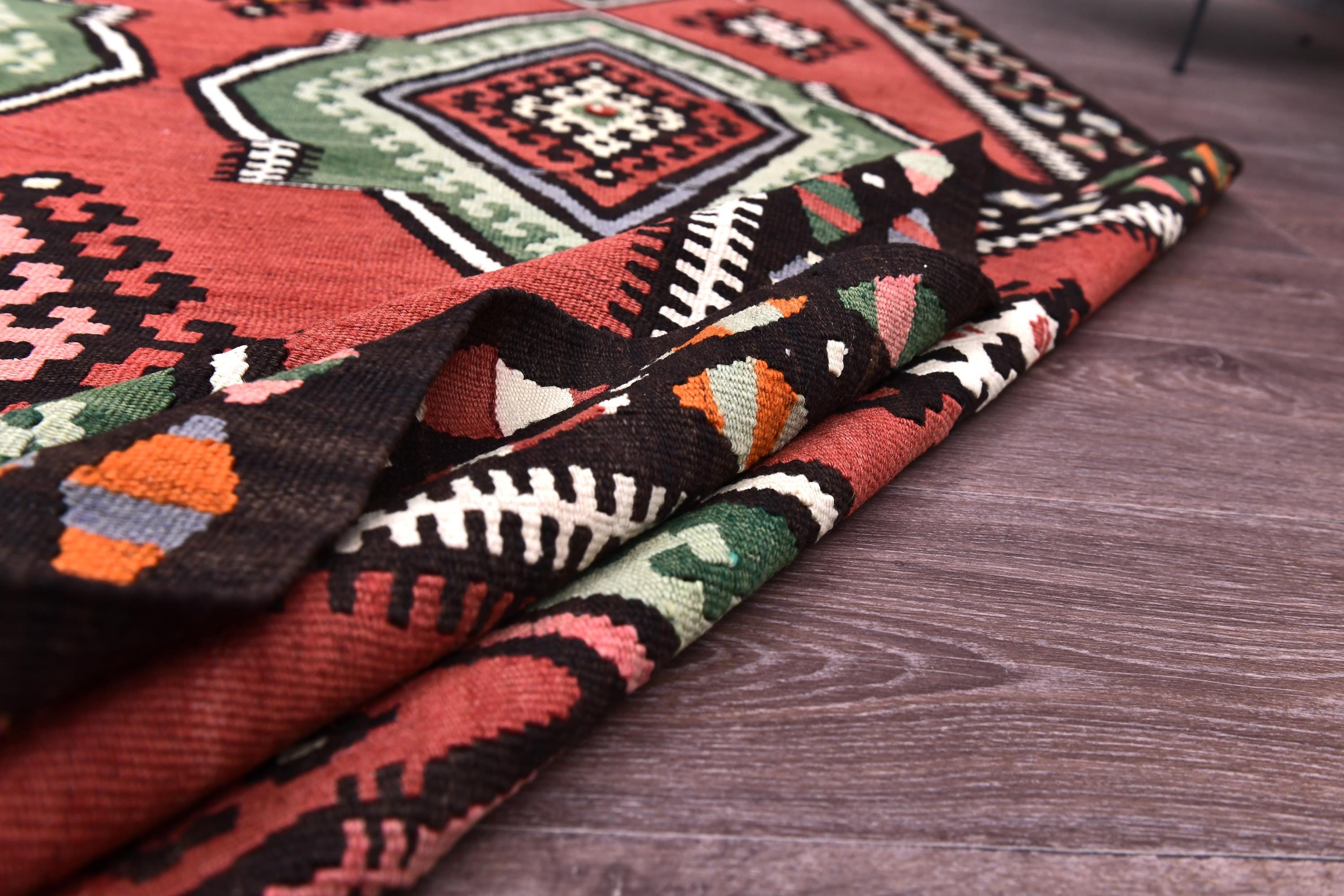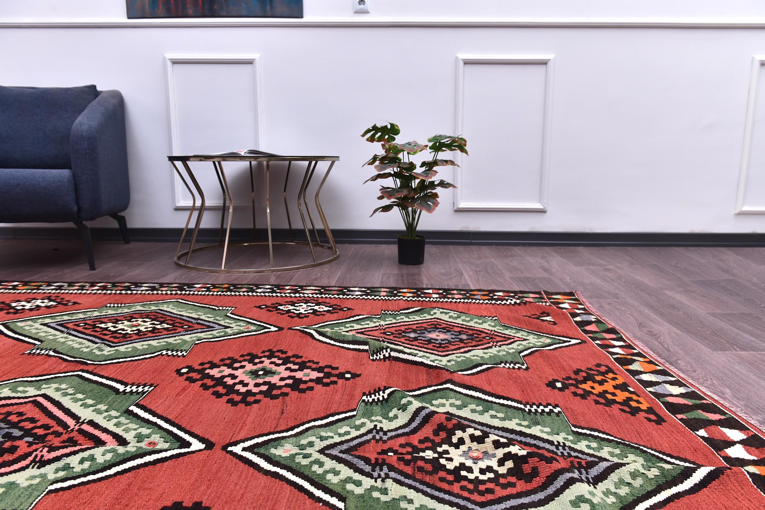 📜📌 Handwoven Turkish kilim rug featuring vibrant coral-red background with geometric diamond medallions in olive green, black, and cream. The rug displays traditional tribal patterns with smaller colorful diamond motifs scattered throughout the field. Decorative border with triangular and diamond shapes in multicolored arrangement on black background. Flat-woven wool construction with visible fringe edges.