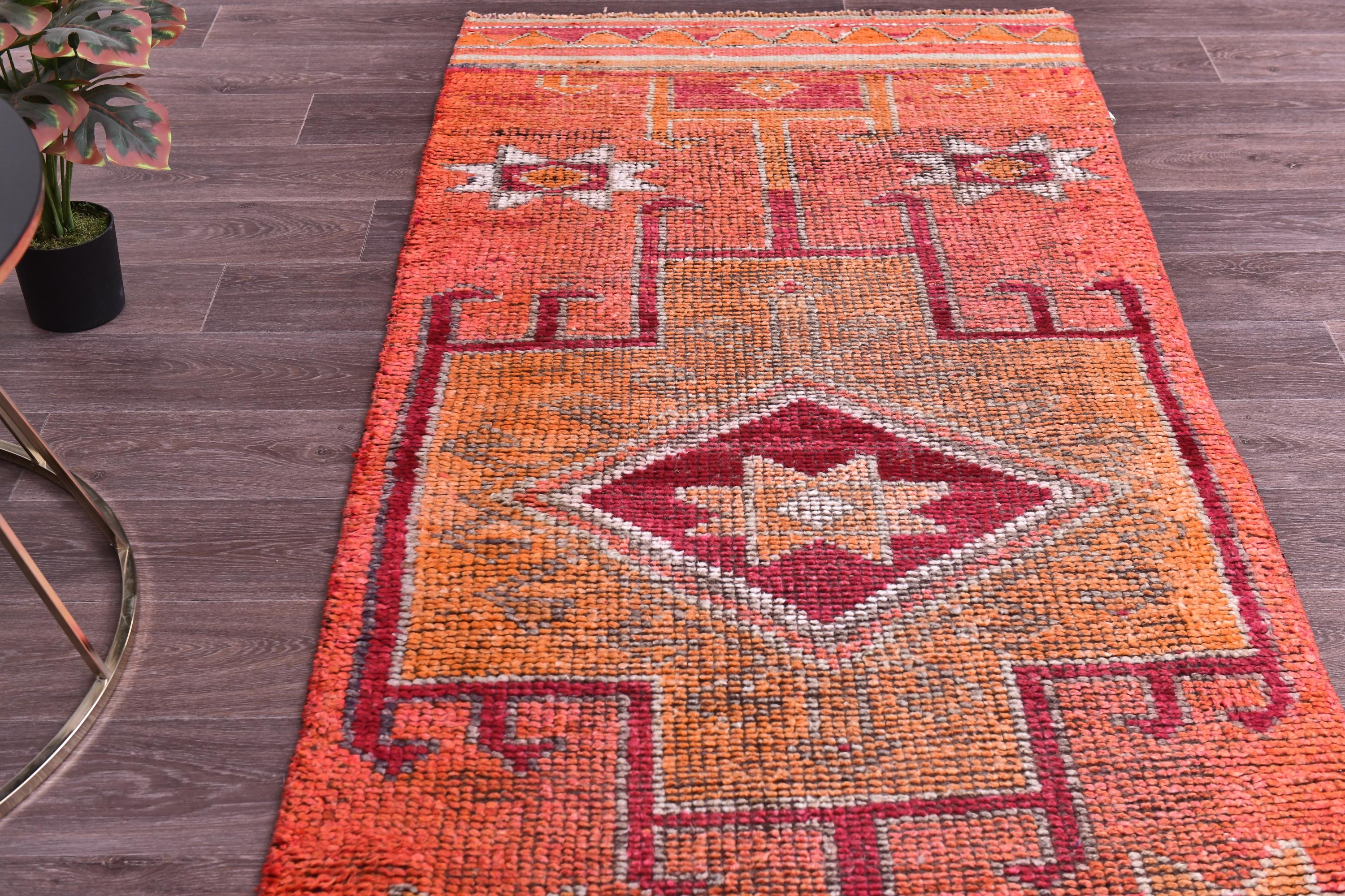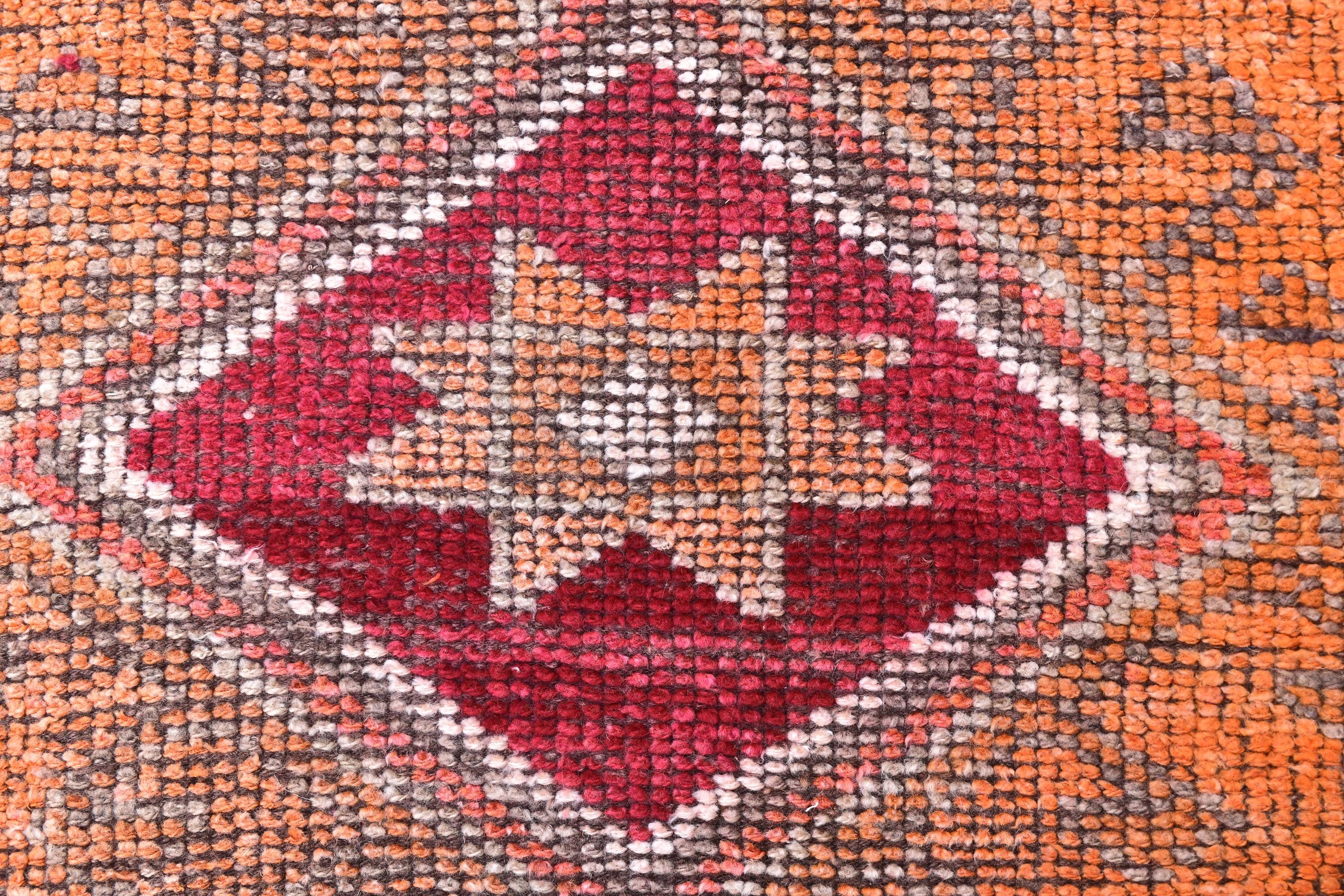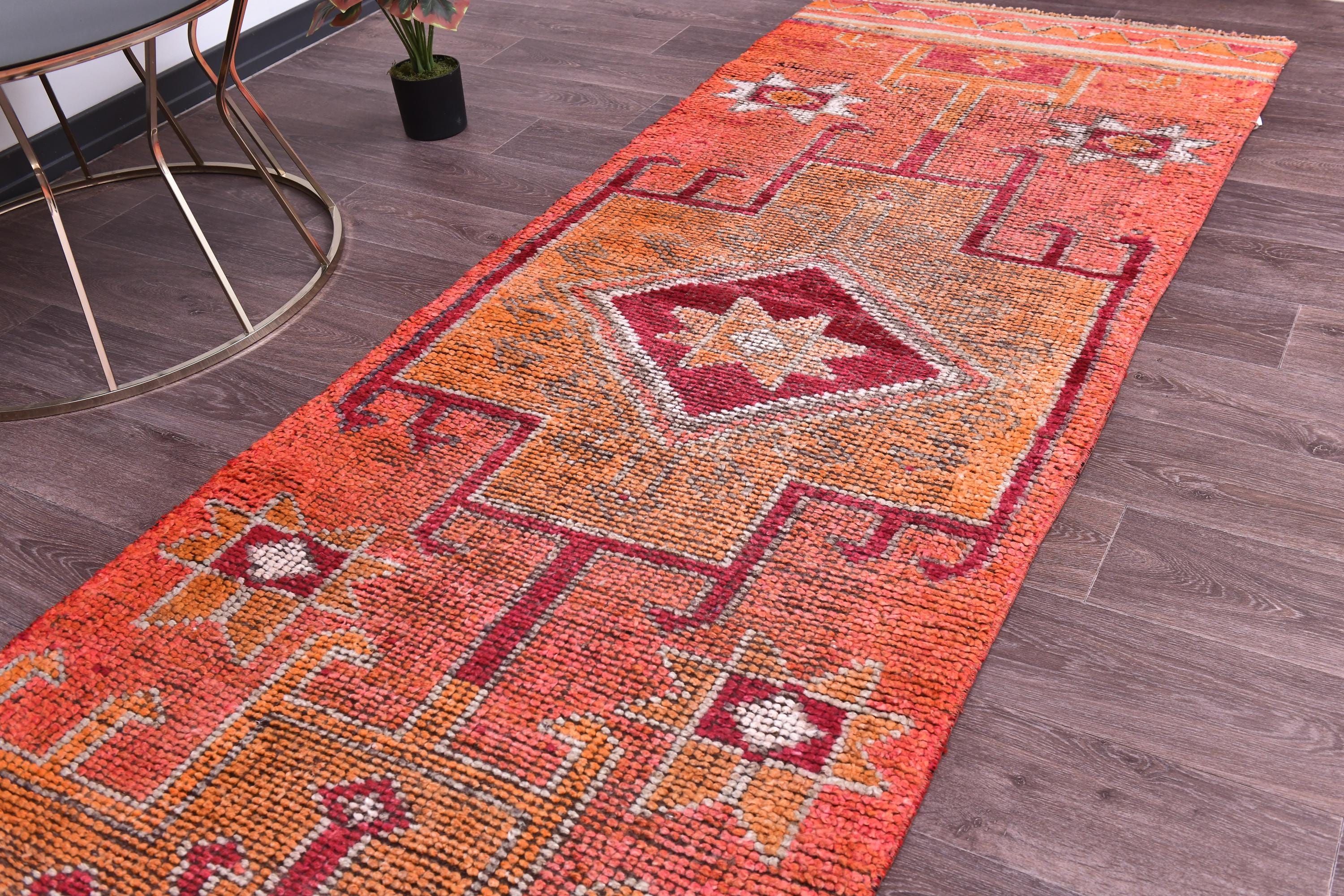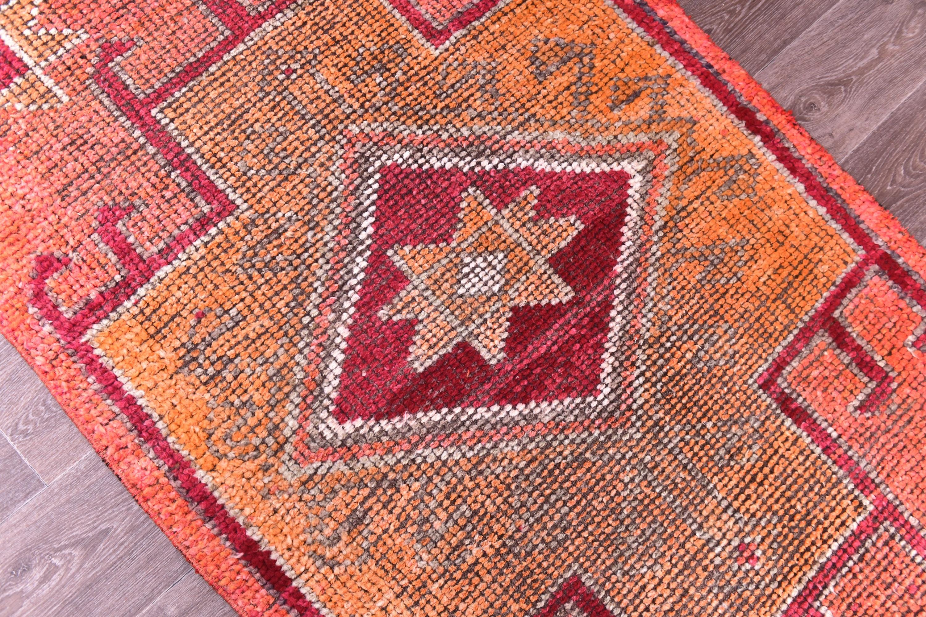📜📌 Vintage Turkish hand-knotted runner rug in vibrant orange, coral red, and golden yellow tones with distressed worn appearance. Features central diamond medallion in burgundy with cream star motif, surrounded by geometric borders and decorative floral crosses in white and orange. Traditional zigzag wave pattern adorns the bottom border in alternating orange and cream. Low pile wool construction ideal for hallways and narrow spaces.