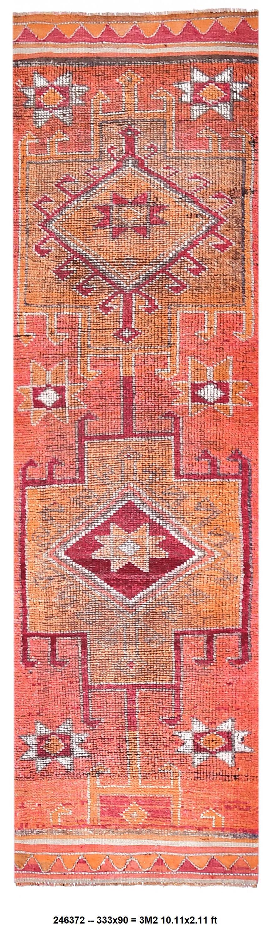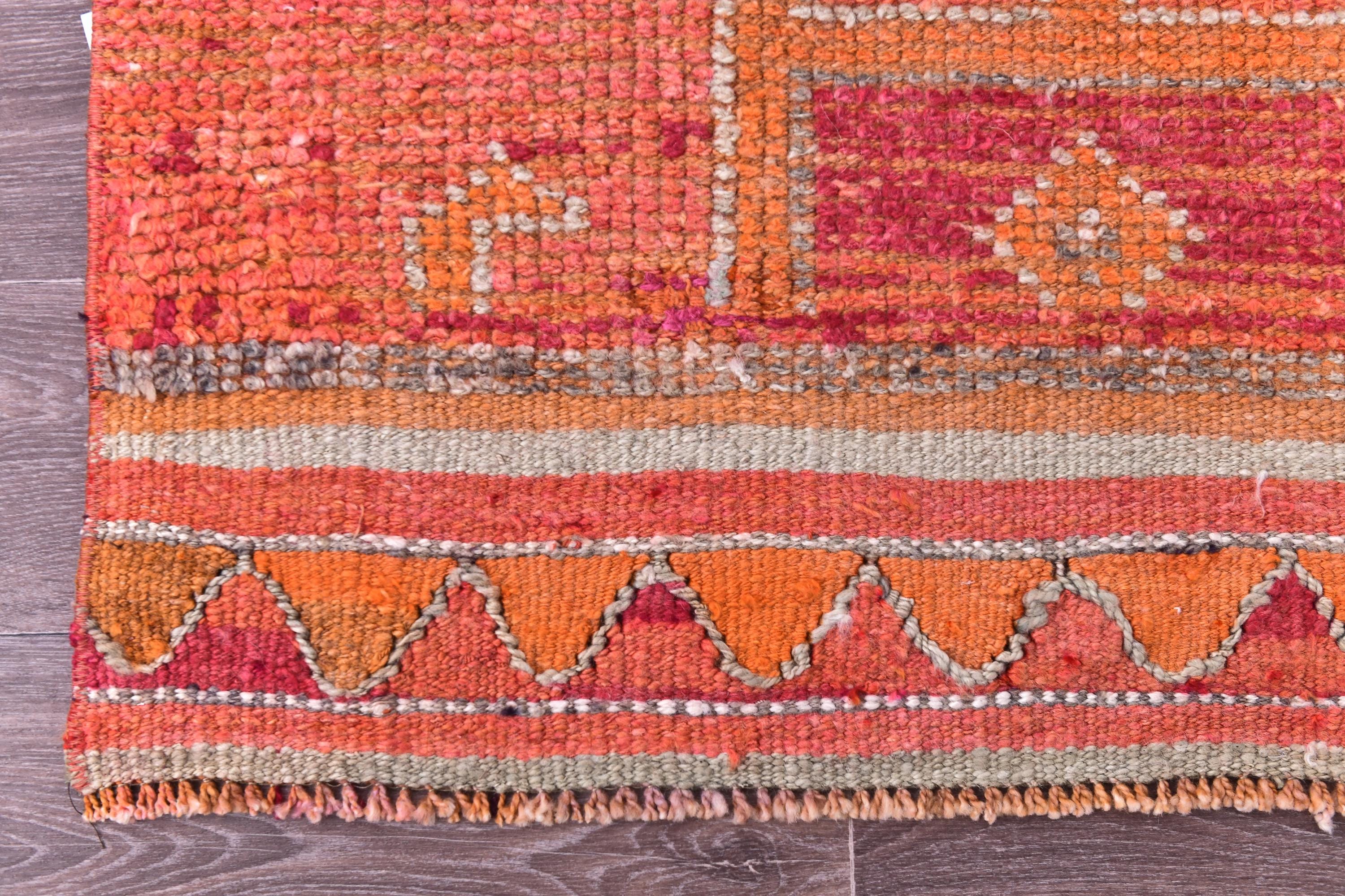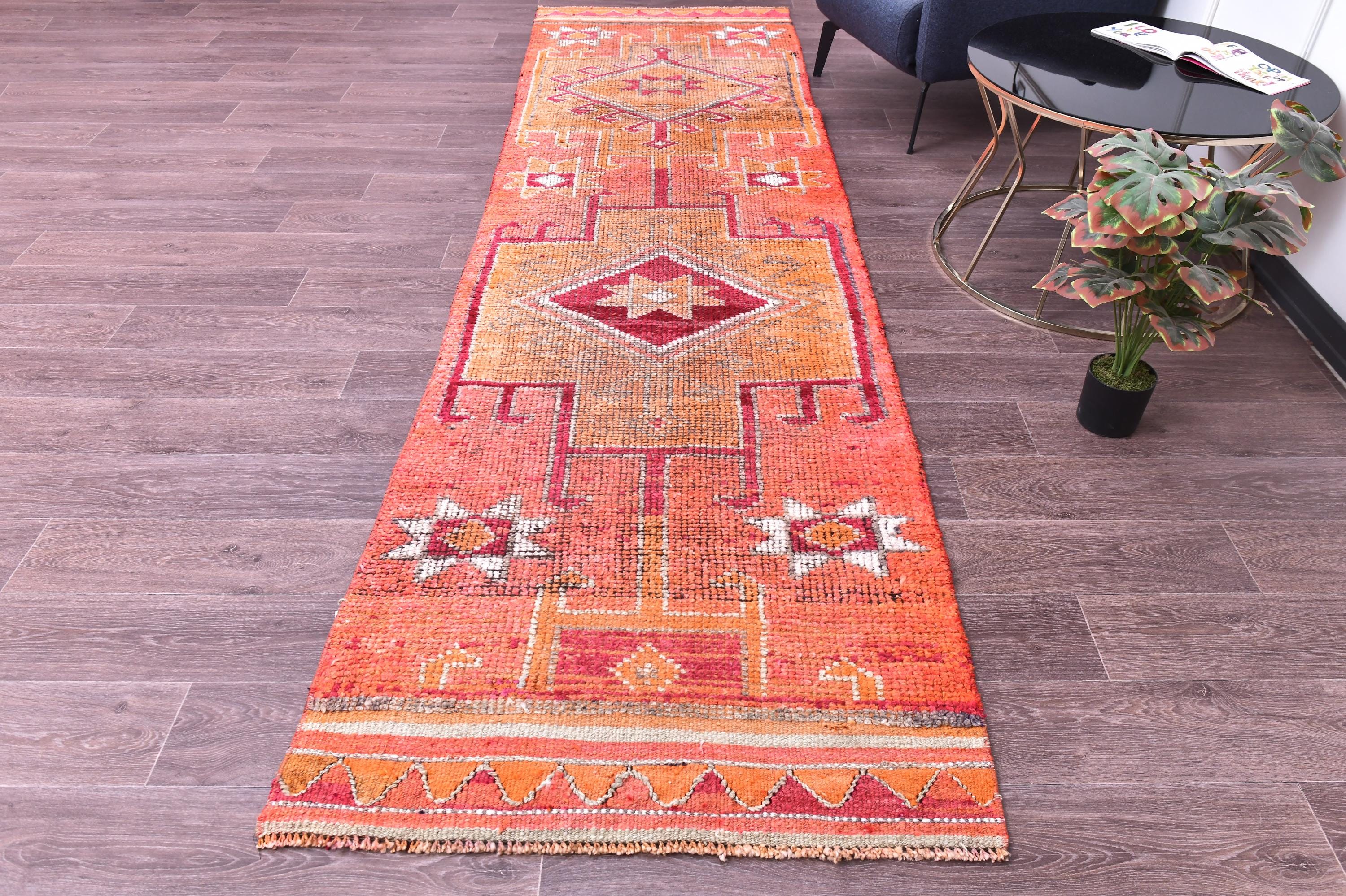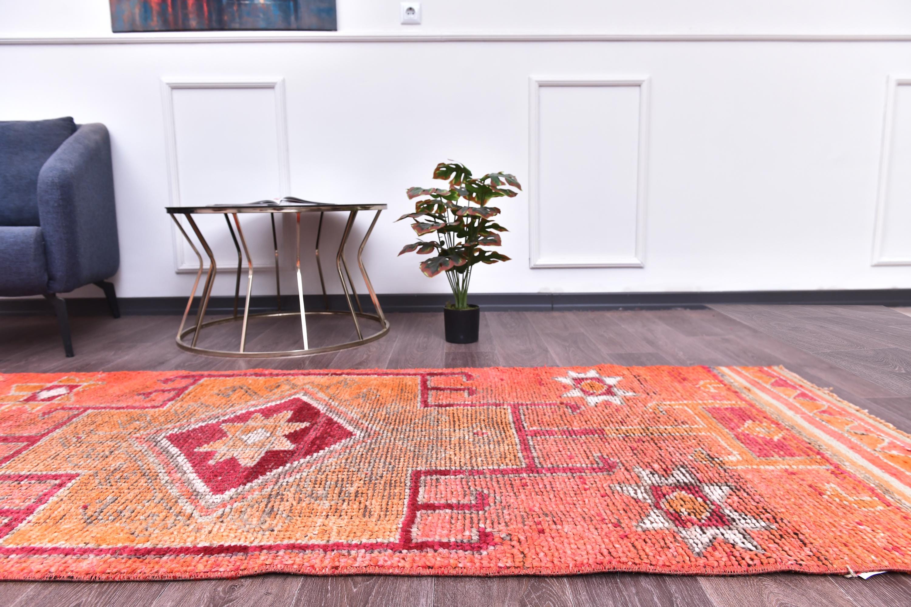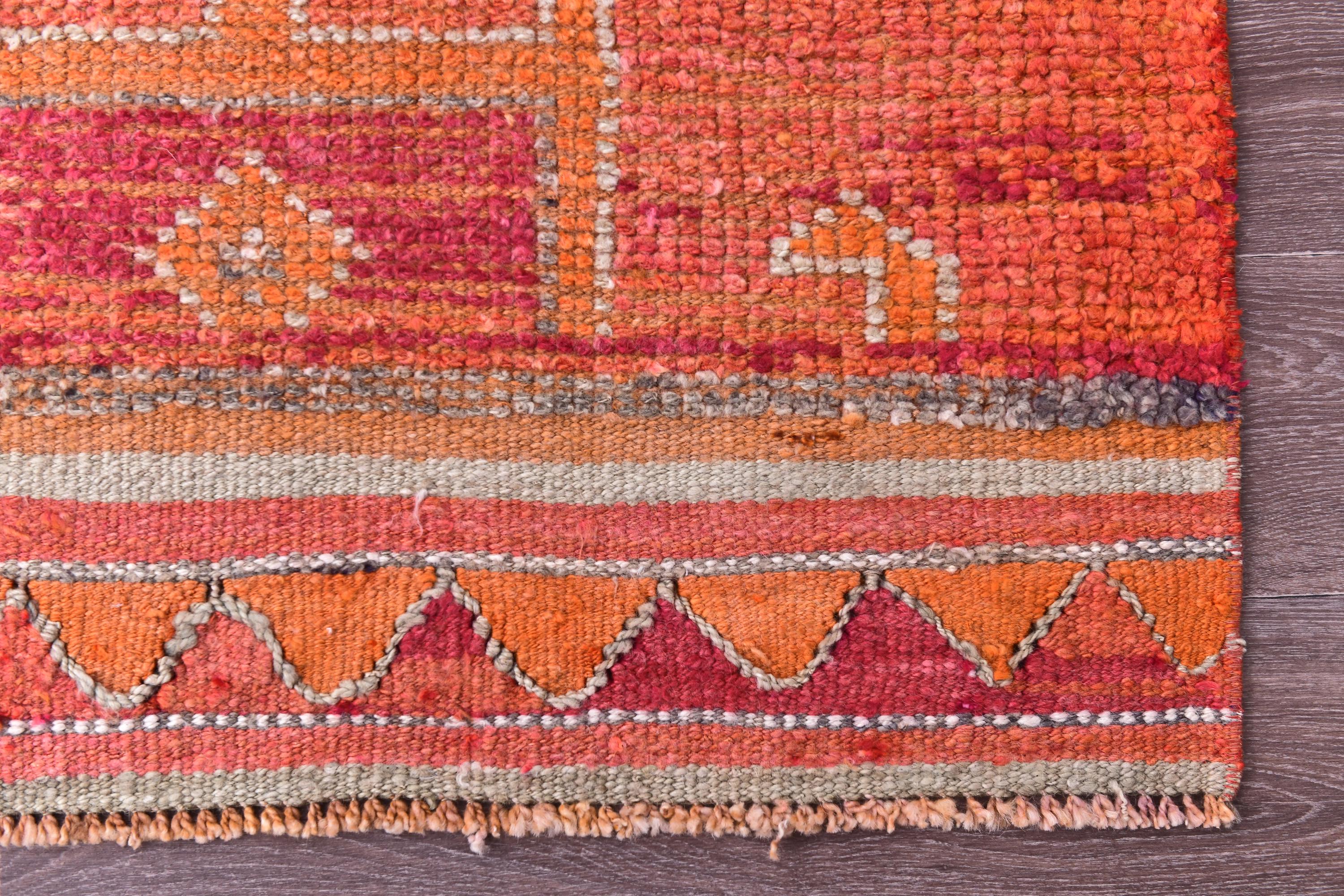 📜📌 Vintage Turkish hand-knotted runner rug in vibrant orange, coral red, and golden yellow tones with distressed worn appearance. Features central diamond medallion in burgundy with cream star motif, surrounded by geometric borders and decorative floral crosses in white and orange. Traditional zigzag wave pattern adorns the bottom border in alternating orange and cream. Low pile wool construction ideal for hallways and narrow spaces.