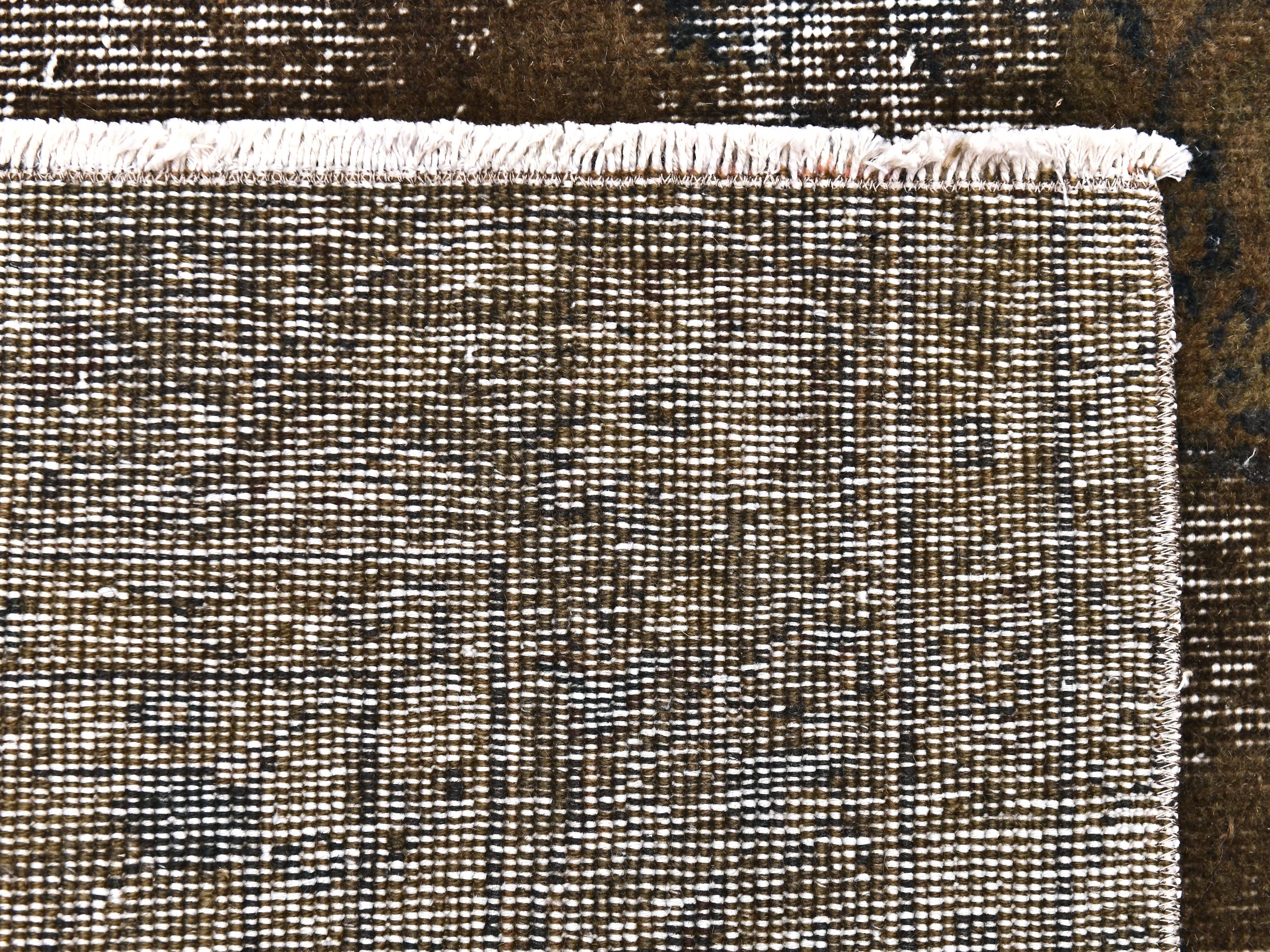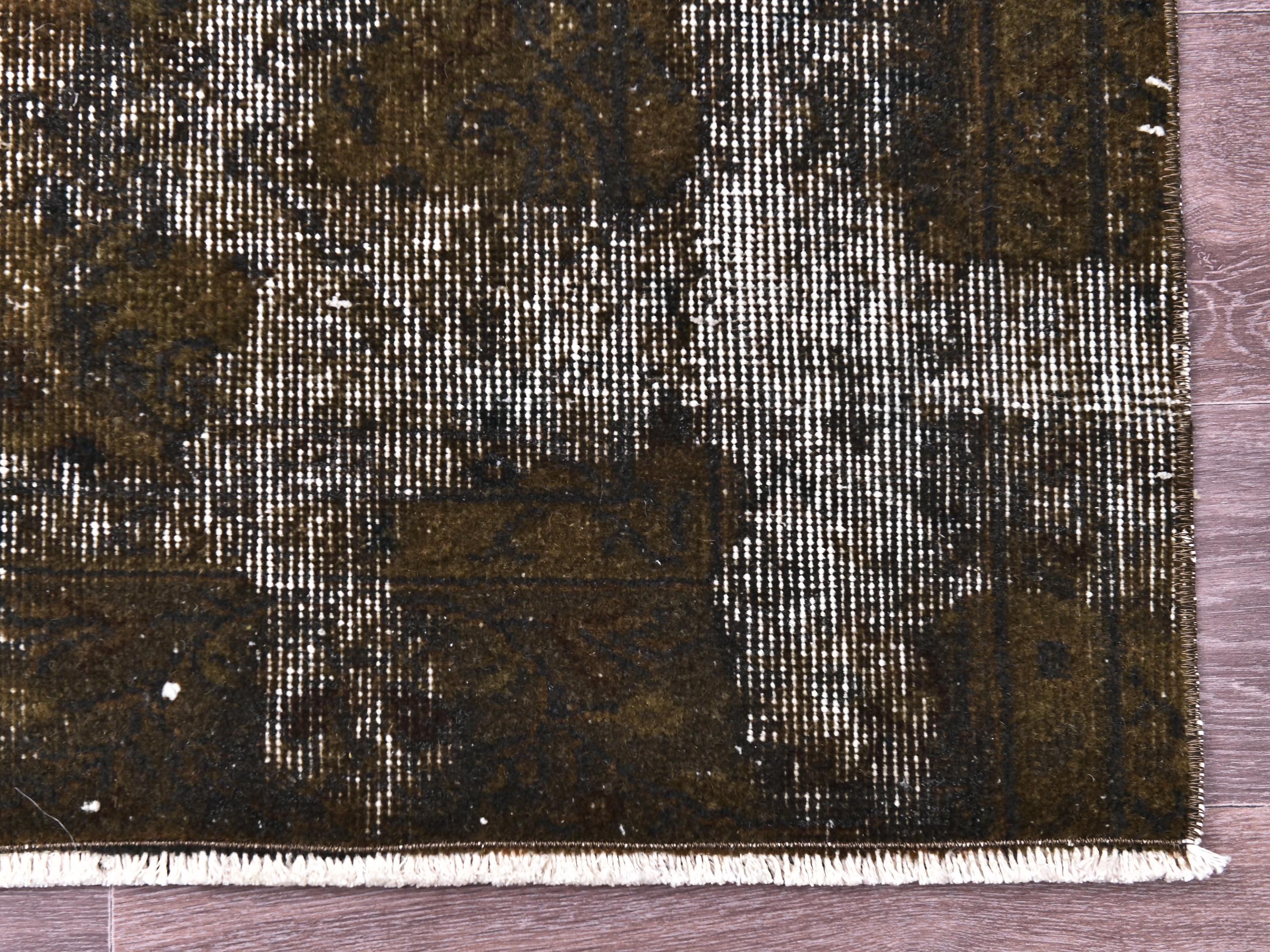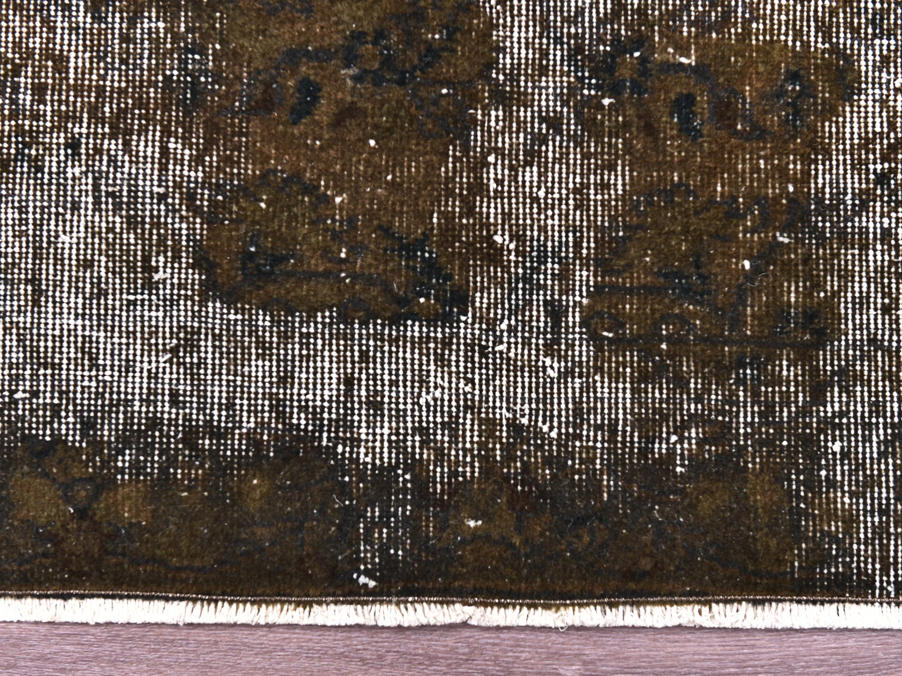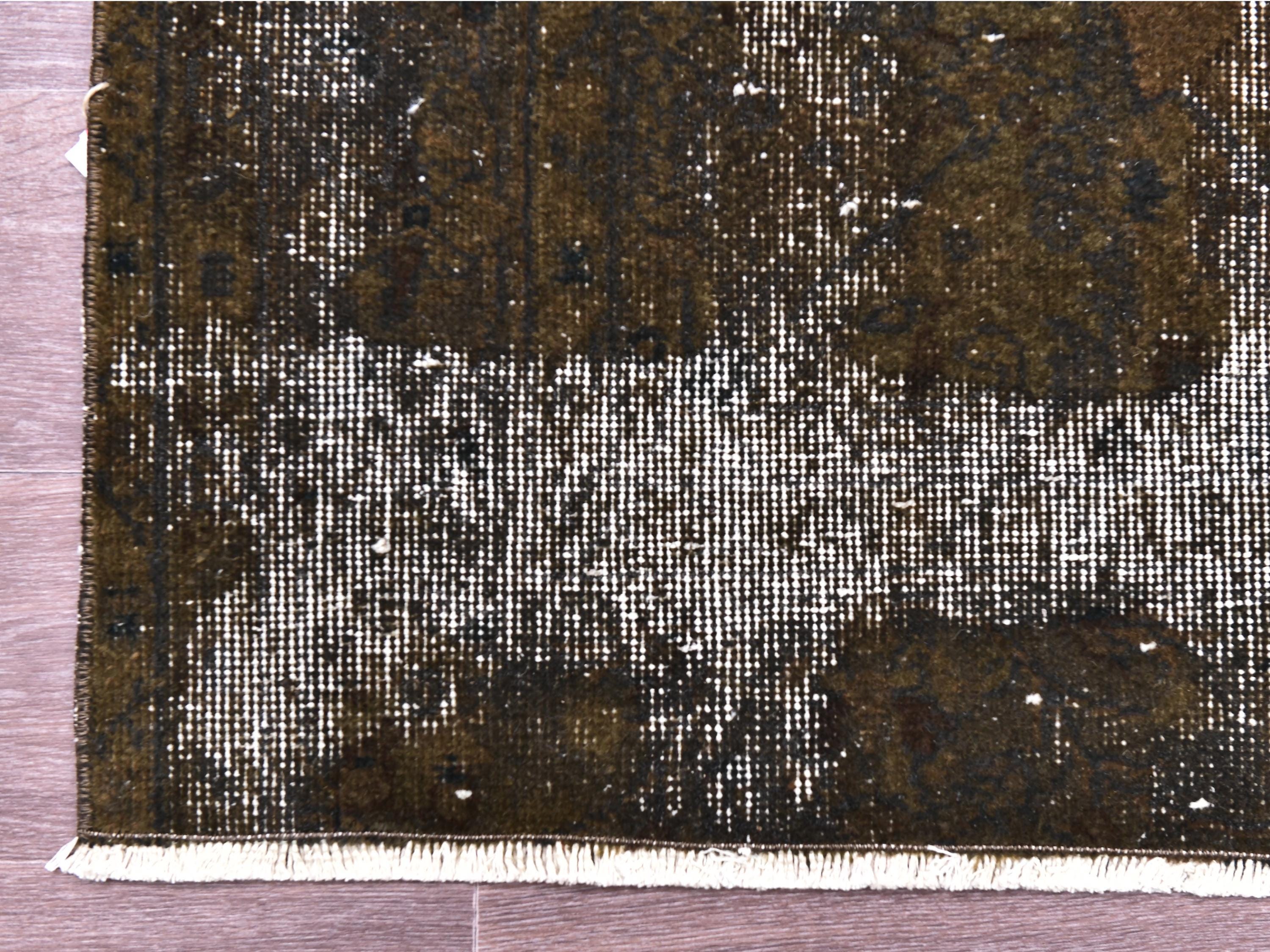 📜📌 Hand-knotted Turkish rug with specialty overdyed finish in deep olive green and earthy brown palette. Original vintage pattern partially visible through translucent dye treatment, revealing traditional floral medallions and geometric borders in cream, gray, and beige. Distressed low pile wool carpet with authentic aged patina. Square medallion layout with ornate corner spandrels creates classic Anatolian design aesthetic enhanced by modern overdye technique.
