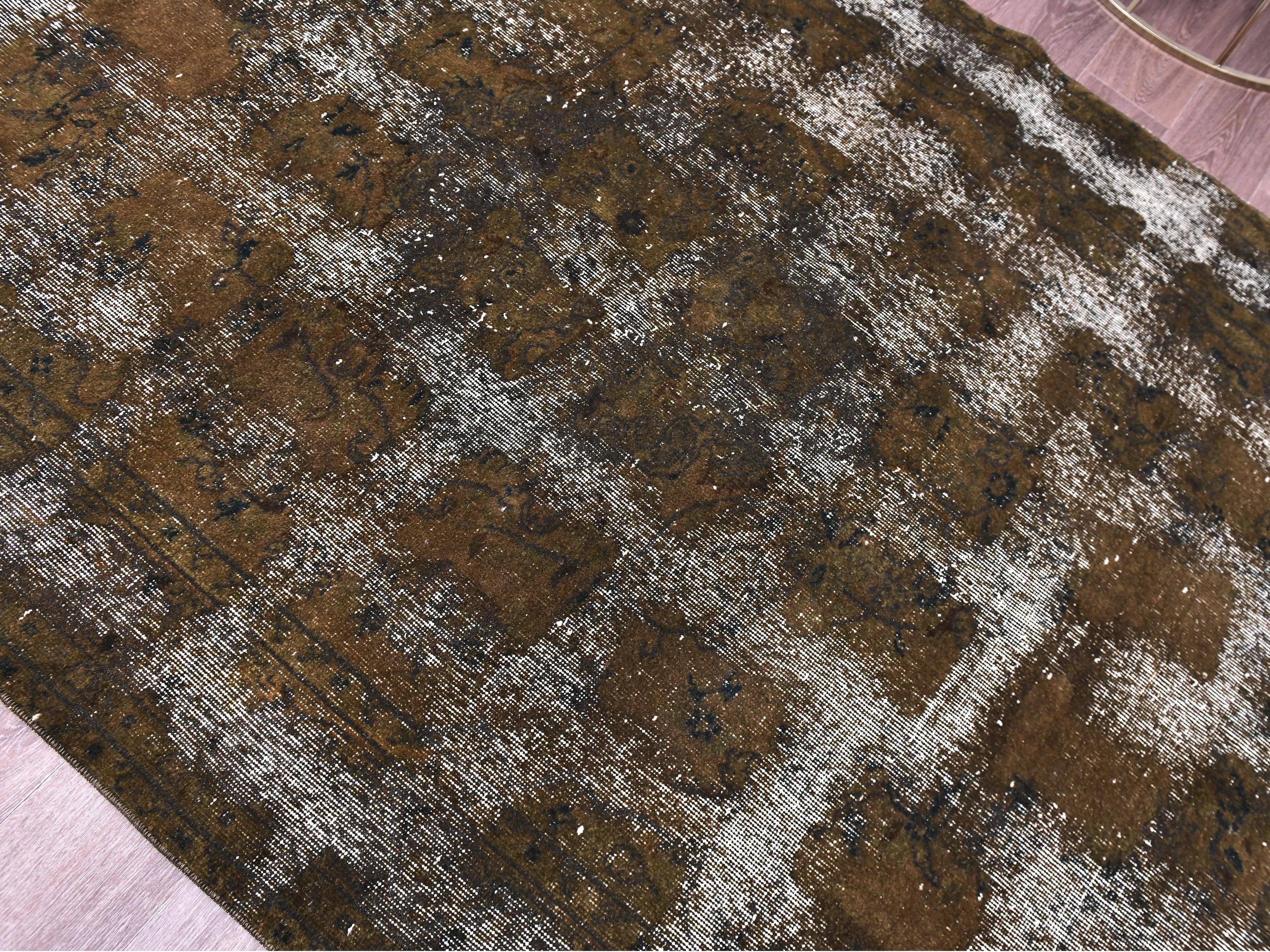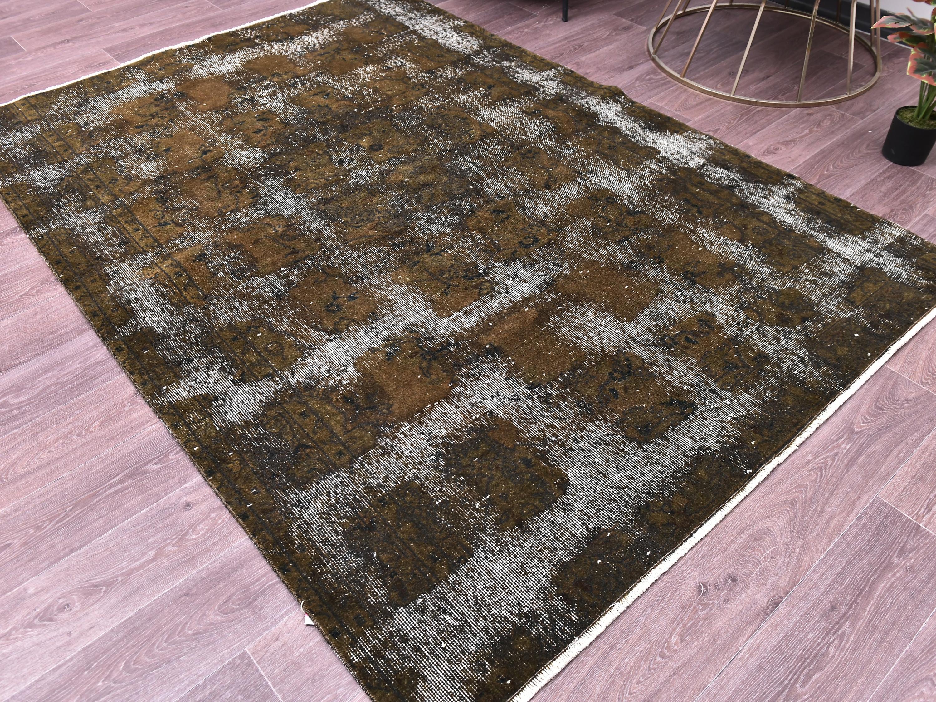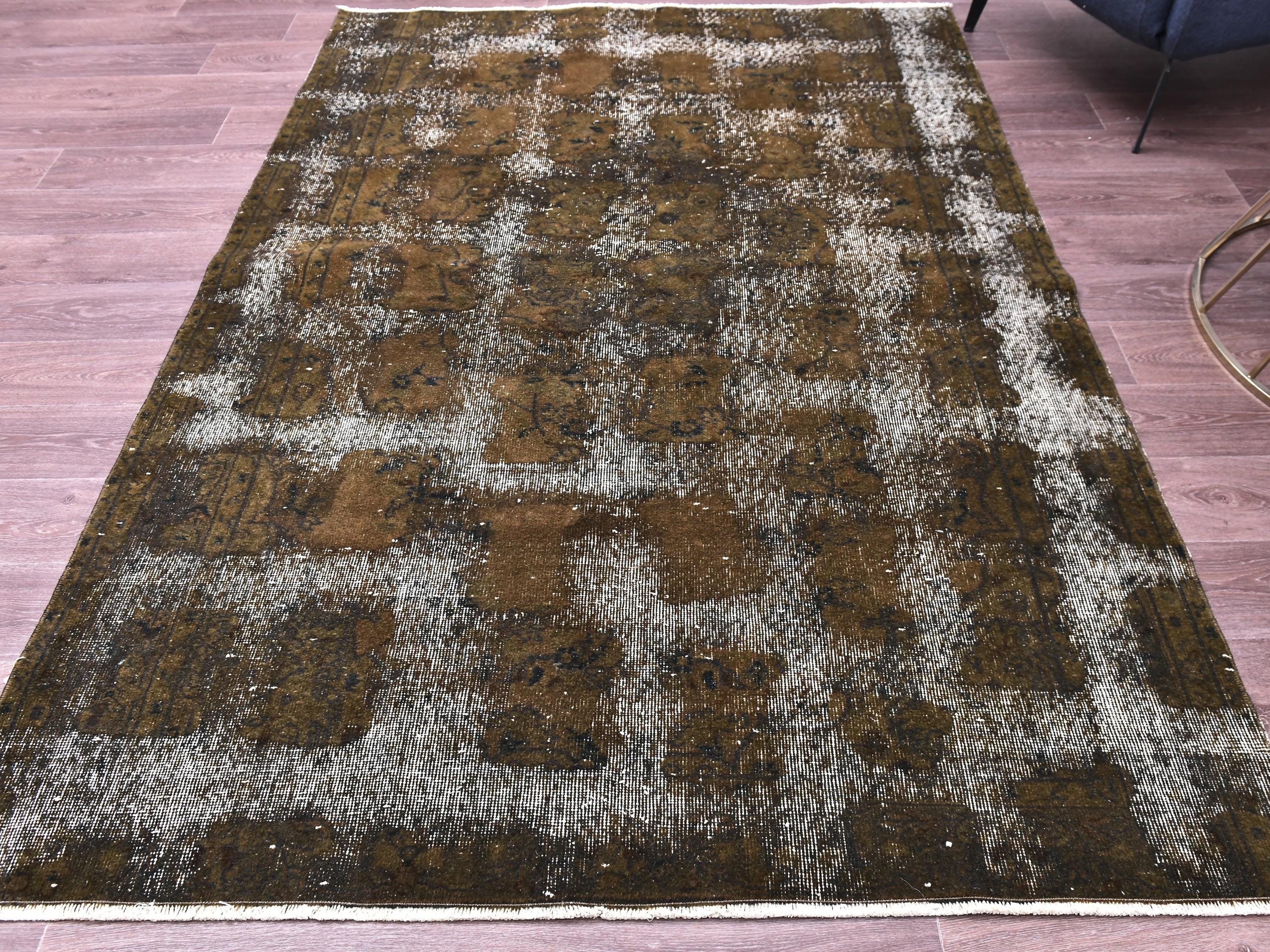📜📌 Hand-knotted Turkish rug with specialty overdyed finish in deep olive green and earthy brown palette. Original vintage pattern partially visible through translucent dye treatment, revealing traditional floral medallions and geometric borders in cream, gray, and beige. Distressed low pile wool carpet with authentic aged patina. Square medallion layout with ornate corner spandrels creates classic Anatolian design aesthetic enhanced by modern overdye technique.