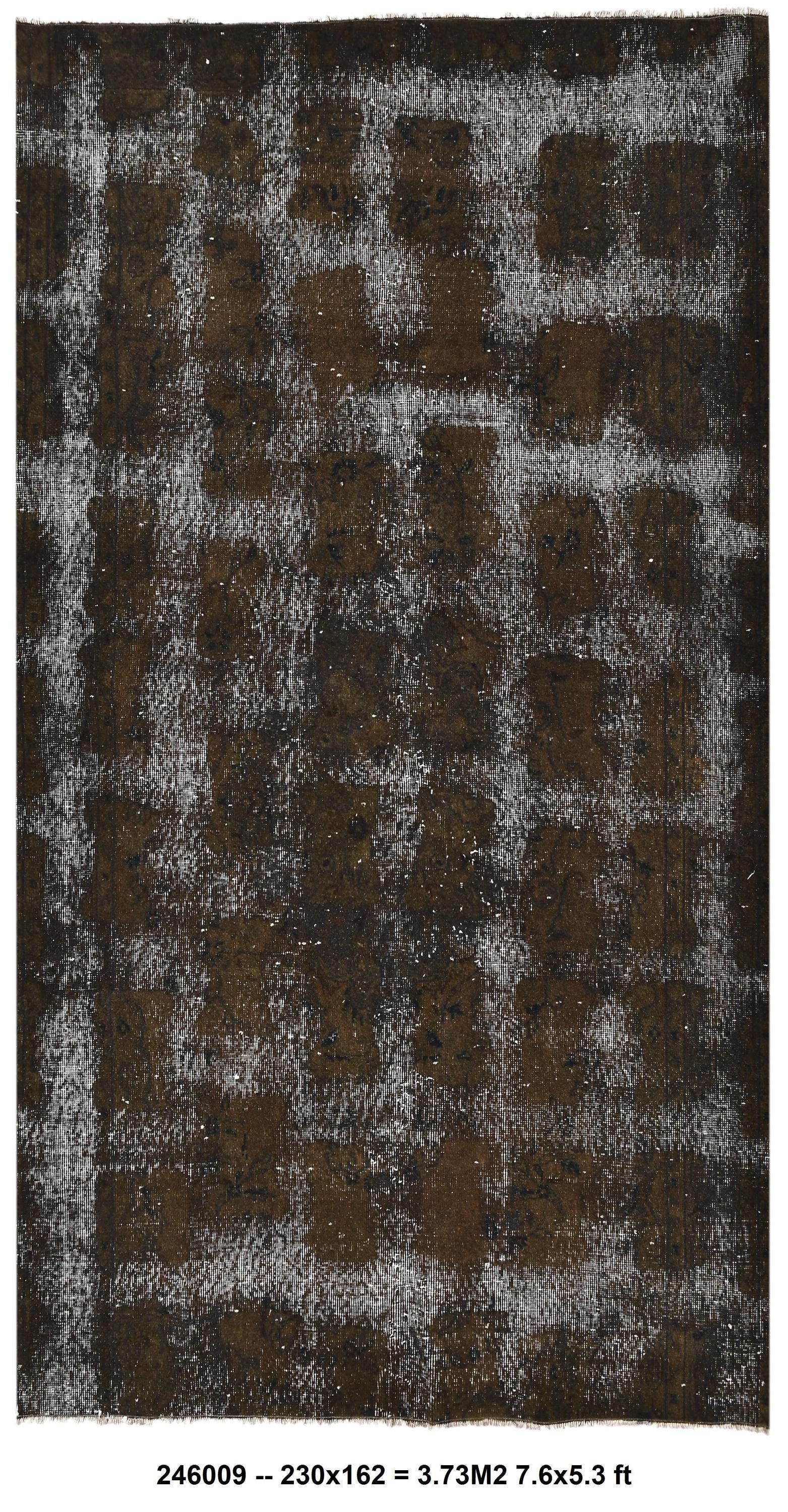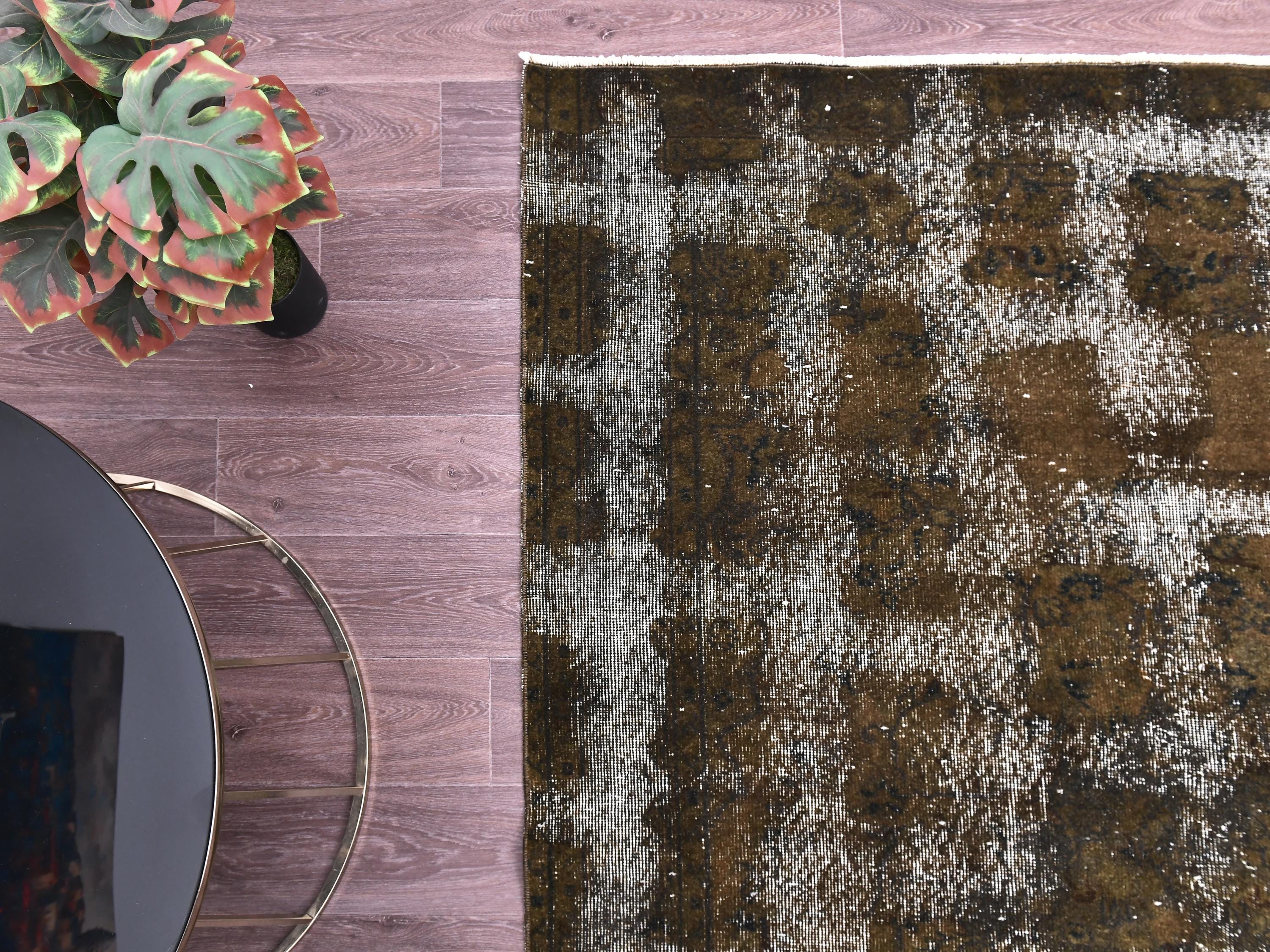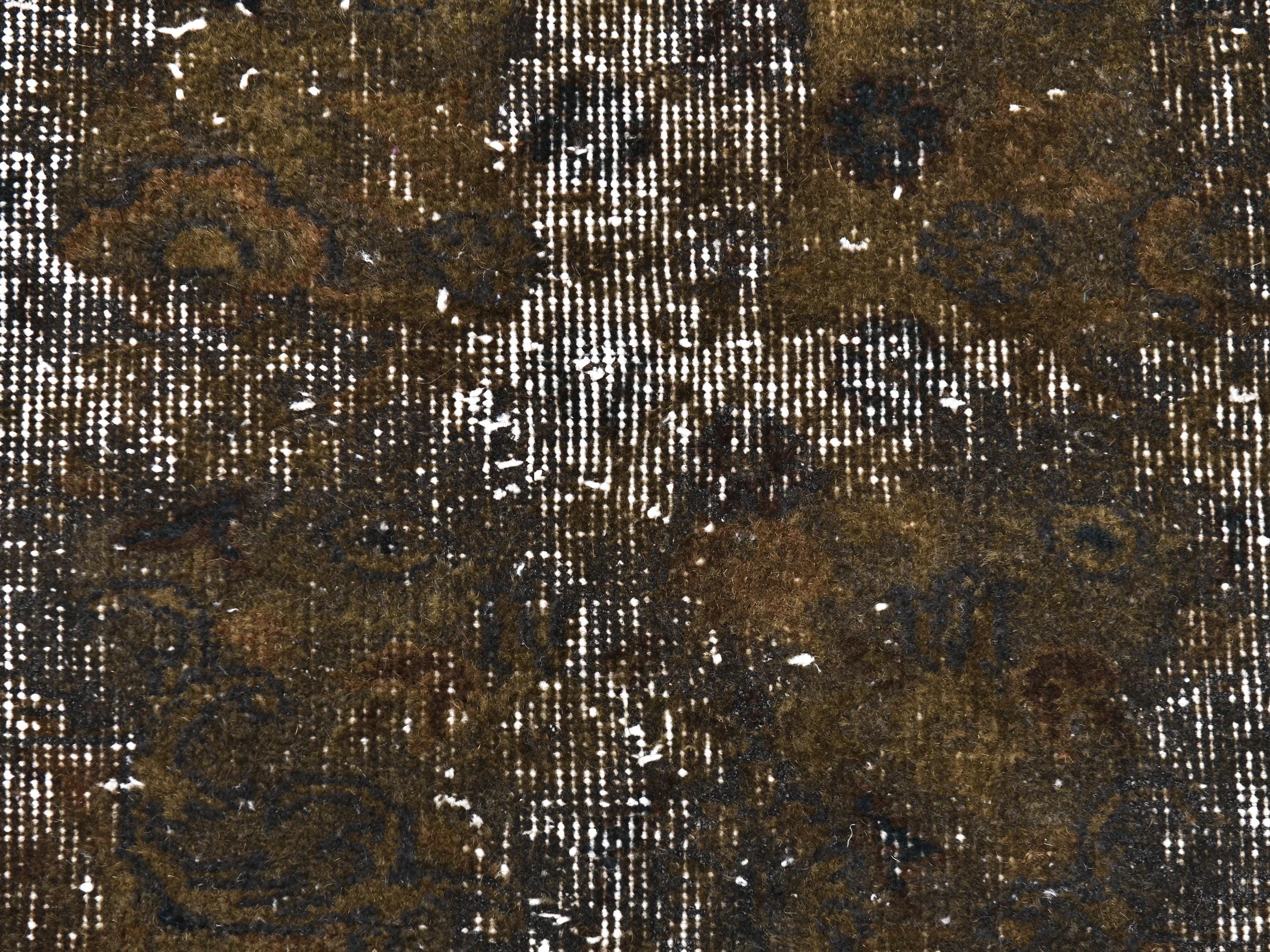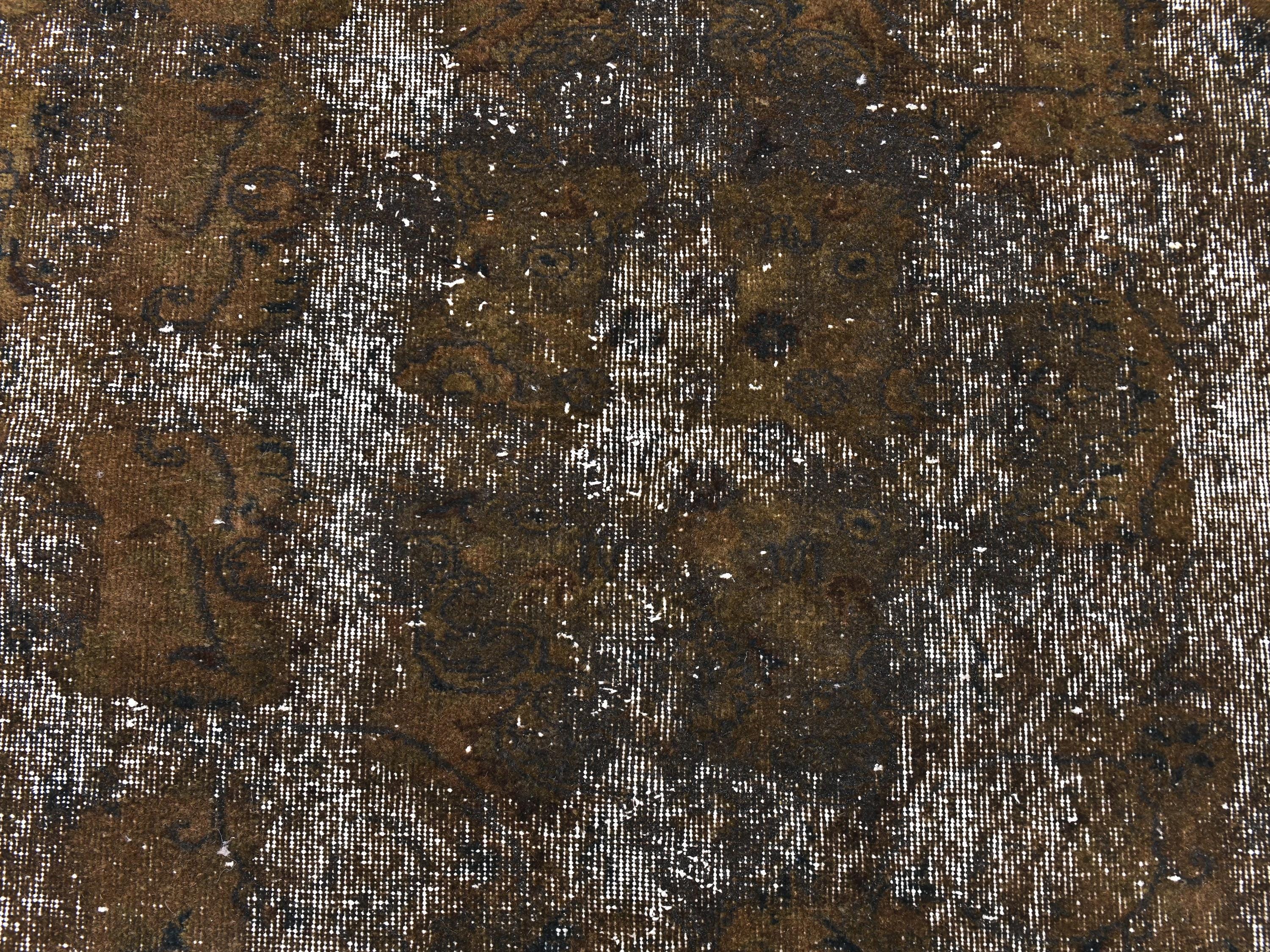 📜📌 Hand-knotted Turkish rug with specialty overdyed finish in deep olive green and earthy brown palette. Original vintage pattern partially visible through translucent dye treatment, revealing traditional floral medallions and geometric borders in cream, gray, and beige. Distressed low pile wool carpet with authentic aged patina. Square medallion layout with ornate corner spandrels creates classic Anatolian design aesthetic enhanced by modern overdye technique.