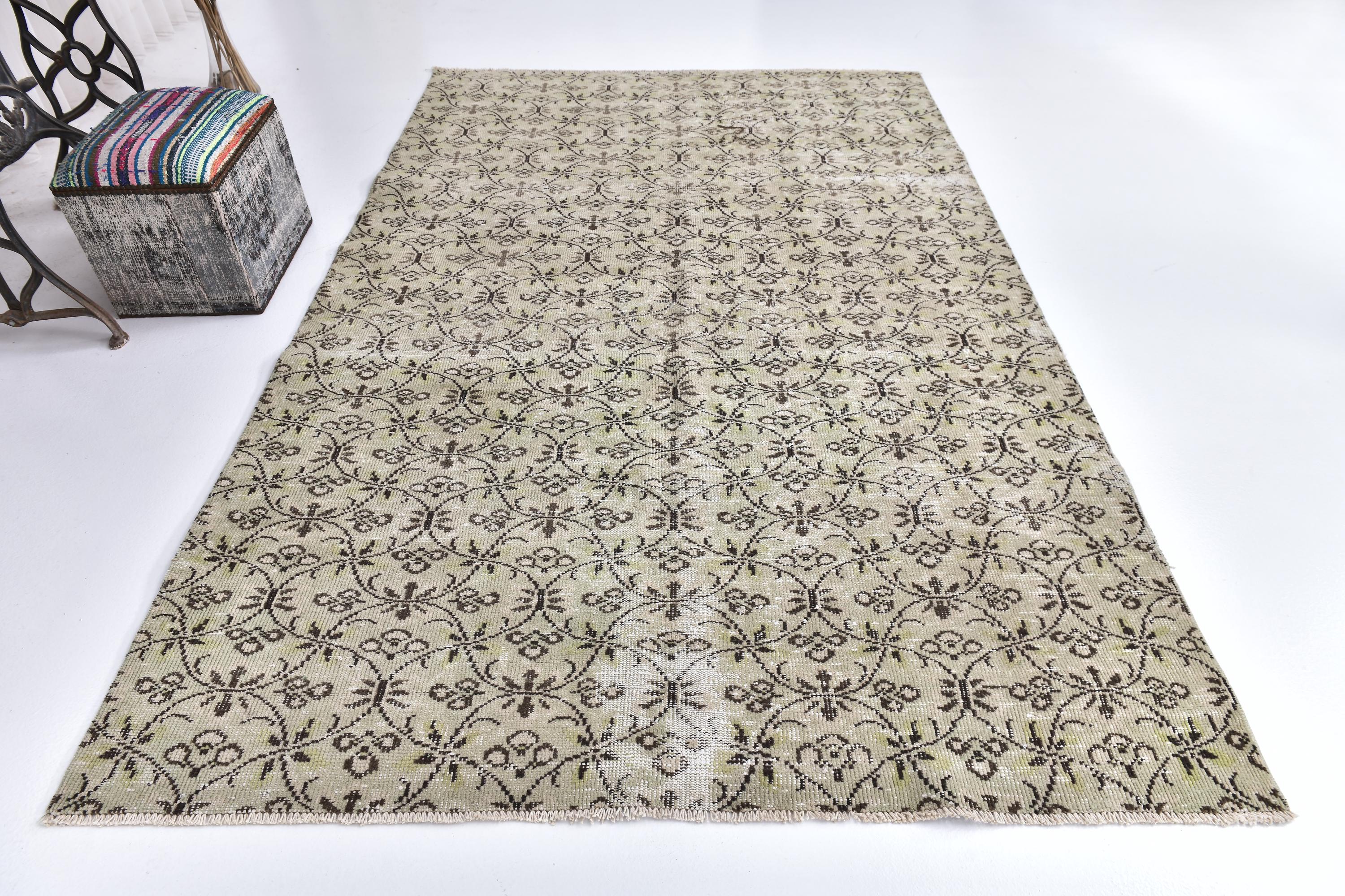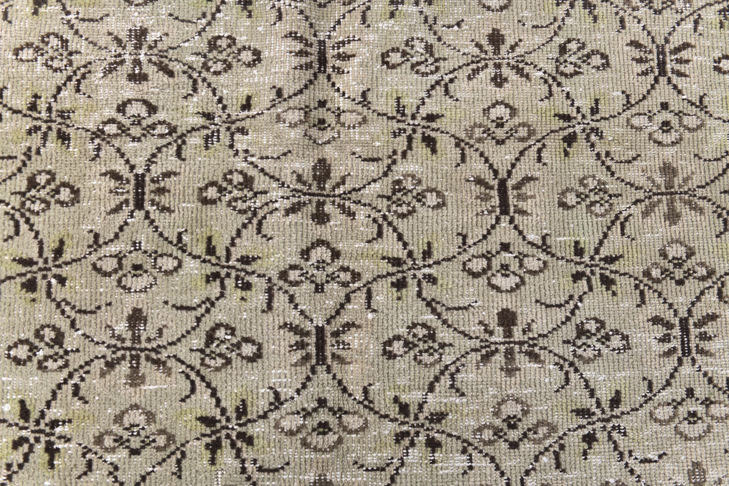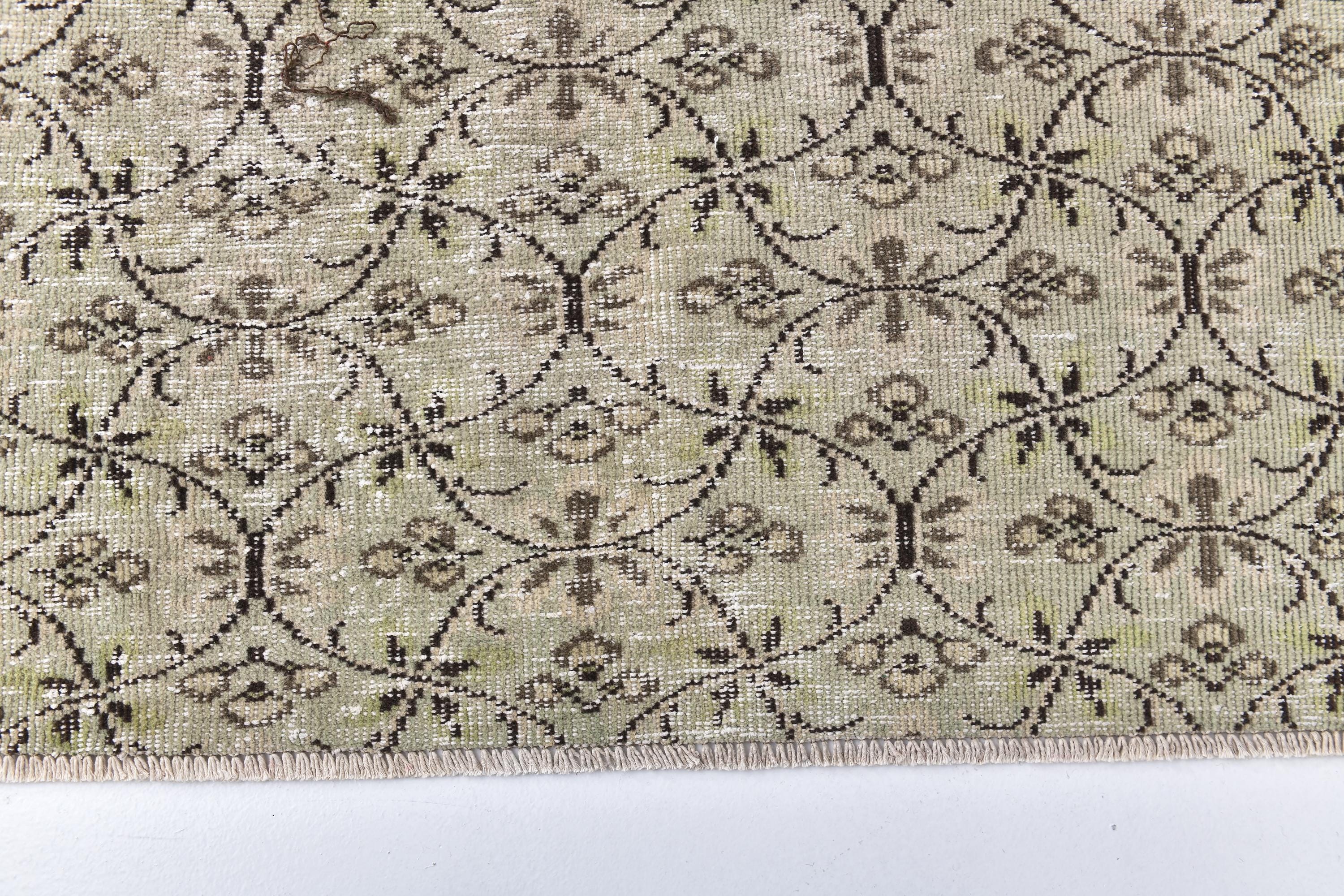 📜📌 Vintage Turkish Oushak rug featuring all-over repeating floral vine pattern in muted neutral tones of beige, cream, sage green, and brown. Hand-knotted wool pile rug with distressed weathered appearance showing delicate botanical motifs throughout. Soft faded color palette creates elegant understated look perfect for modern farmhouse or transitional interior design.