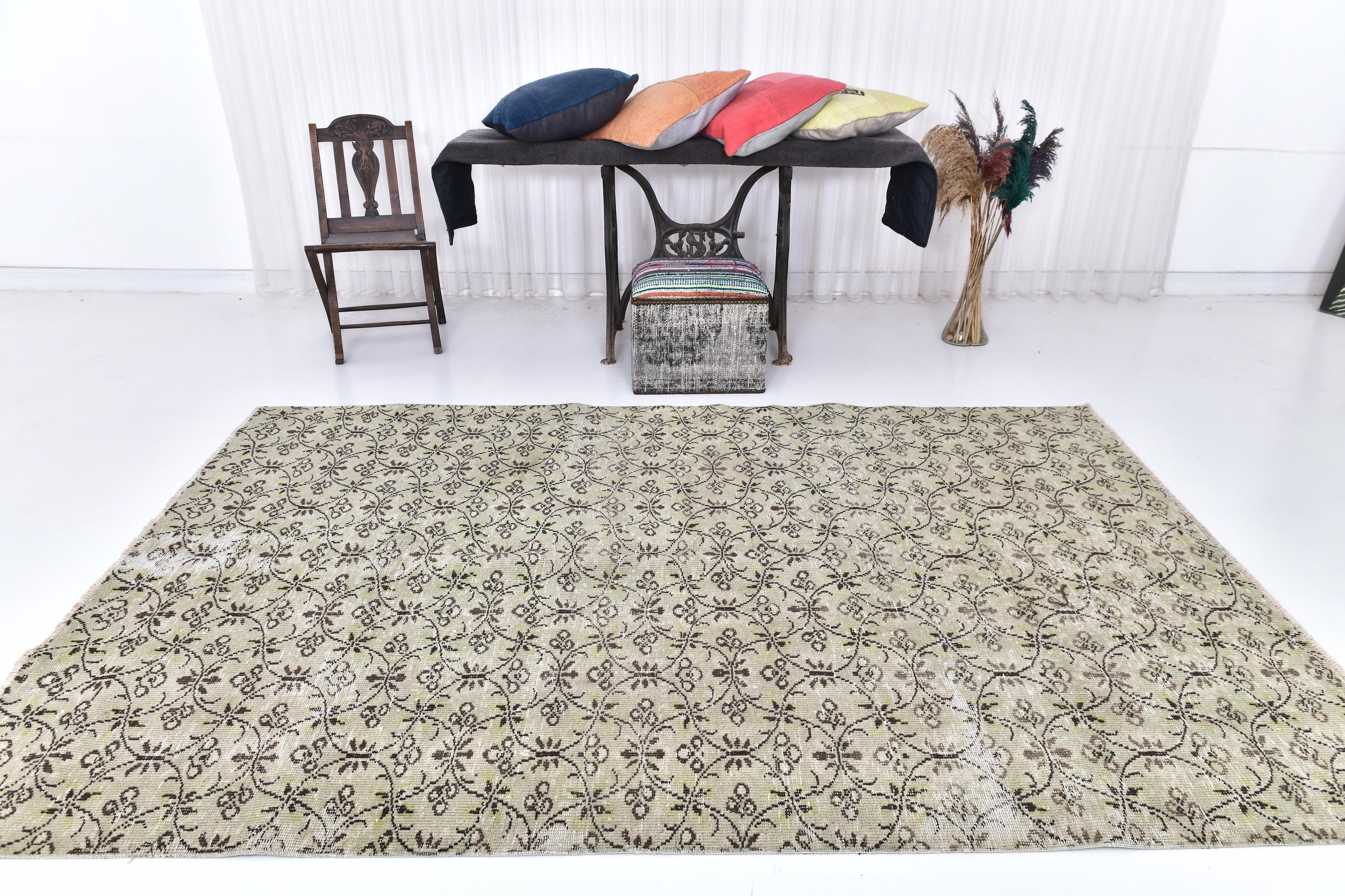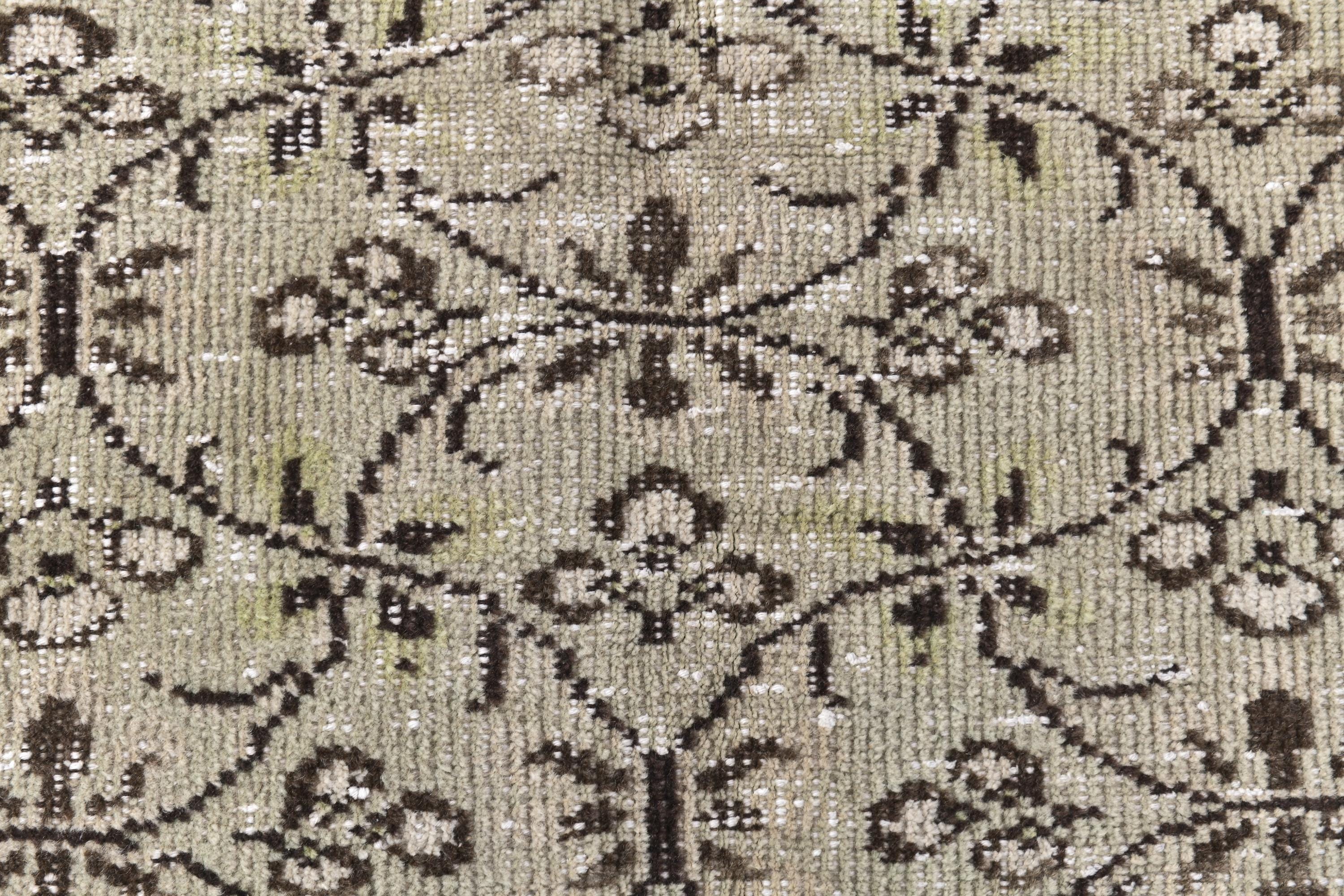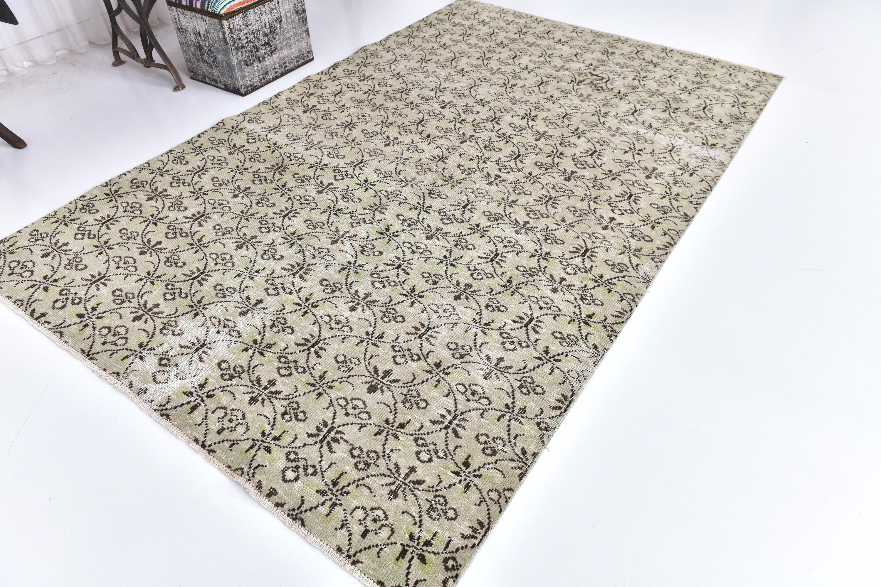 📜📌 Vintage Turkish Oushak rug featuring all-over repeating floral vine pattern in muted neutral tones of beige, cream, sage green, and brown. Hand-knotted wool pile rug with distressed weathered appearance showing delicate botanical motifs throughout. Soft faded color palette creates elegant understated look perfect for modern farmhouse or transitional interior design.