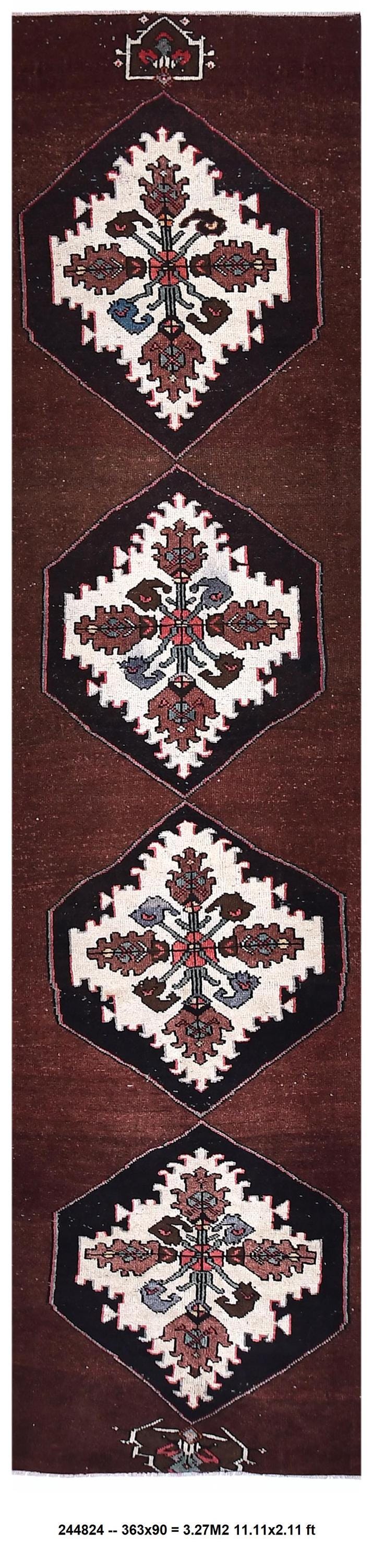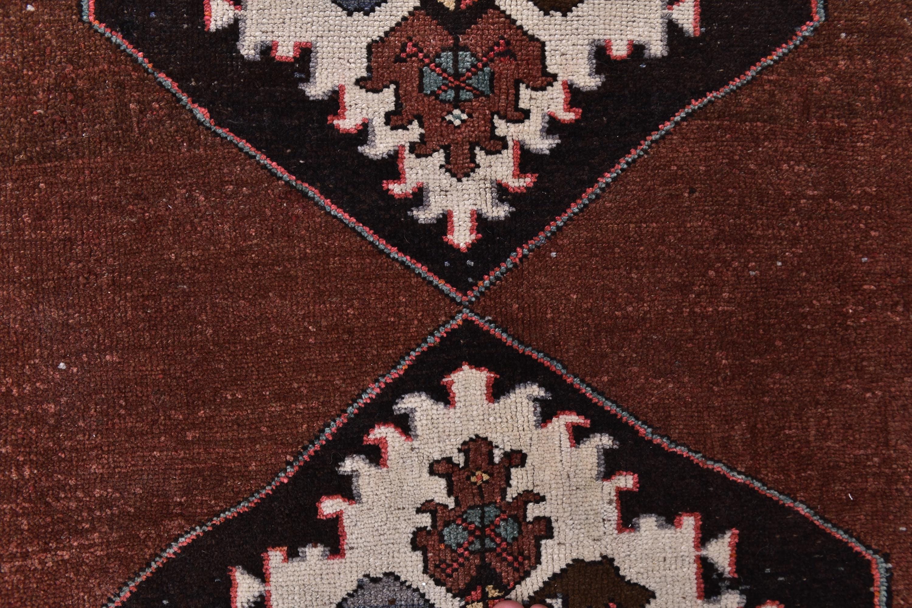 📜📌 Vintage Turkish runner rug featuring rich chocolate brown field with four large hexagonal medallions arranged vertically. Hand-knotted wool pile runner displaying traditional tribal floral motifs in cream ivory, black, coral red, and turquoise blue. Unique geometric design with repeating hexagon patterns outlined in contrasting colors creates distinctive Anatolian hallway textile.
