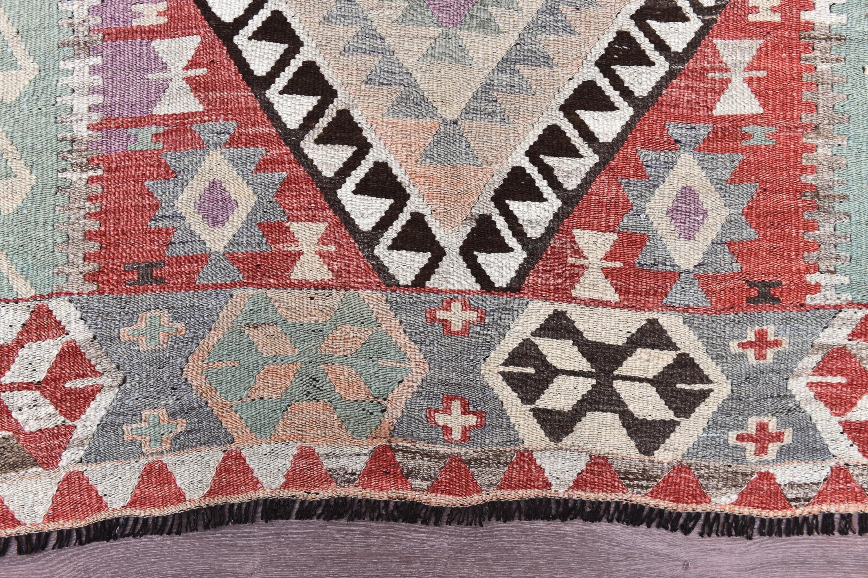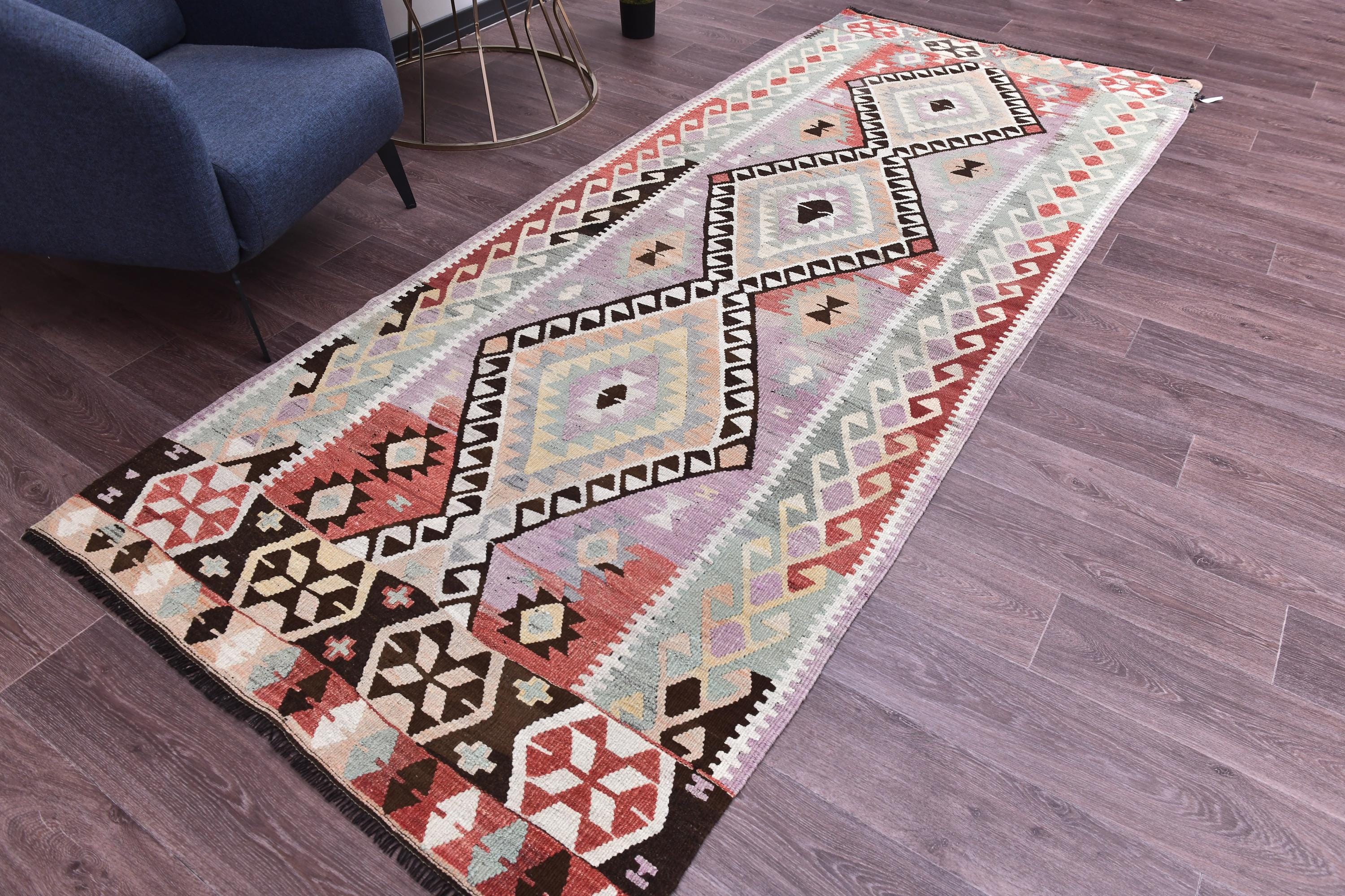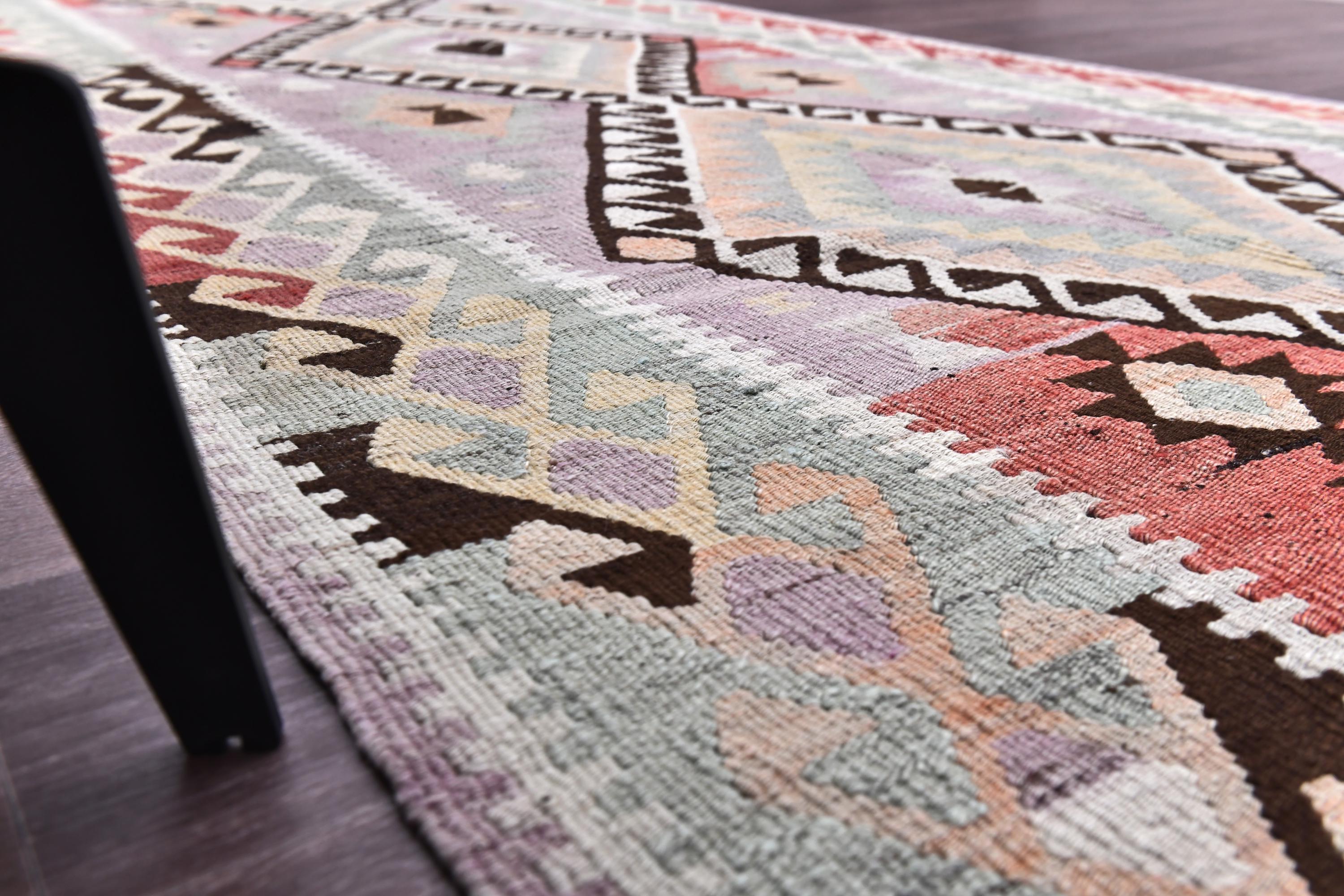 📜📌 Vintage Turkish kilim runner rug featuring vibrant geometric medallion pattern in pastel colors including coral red, lavender purple, mint green, peach, and cream. Hand-woven wool flat weave runner with three large diamond medallions and intricate tribal motifs. Decorative hexagonal end borders with traditional Anatolian geometric designs create authentic bohemian hallway textile.