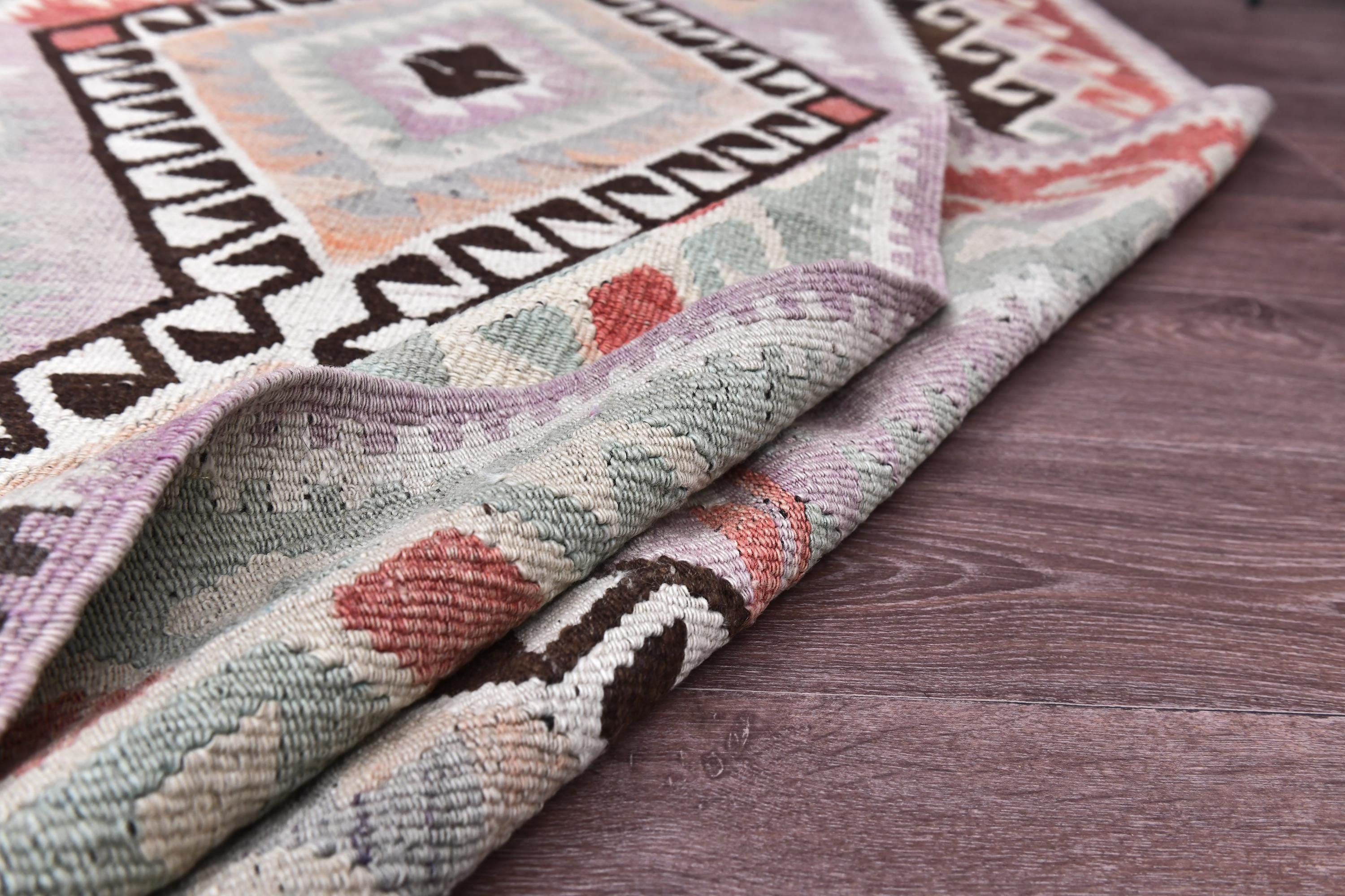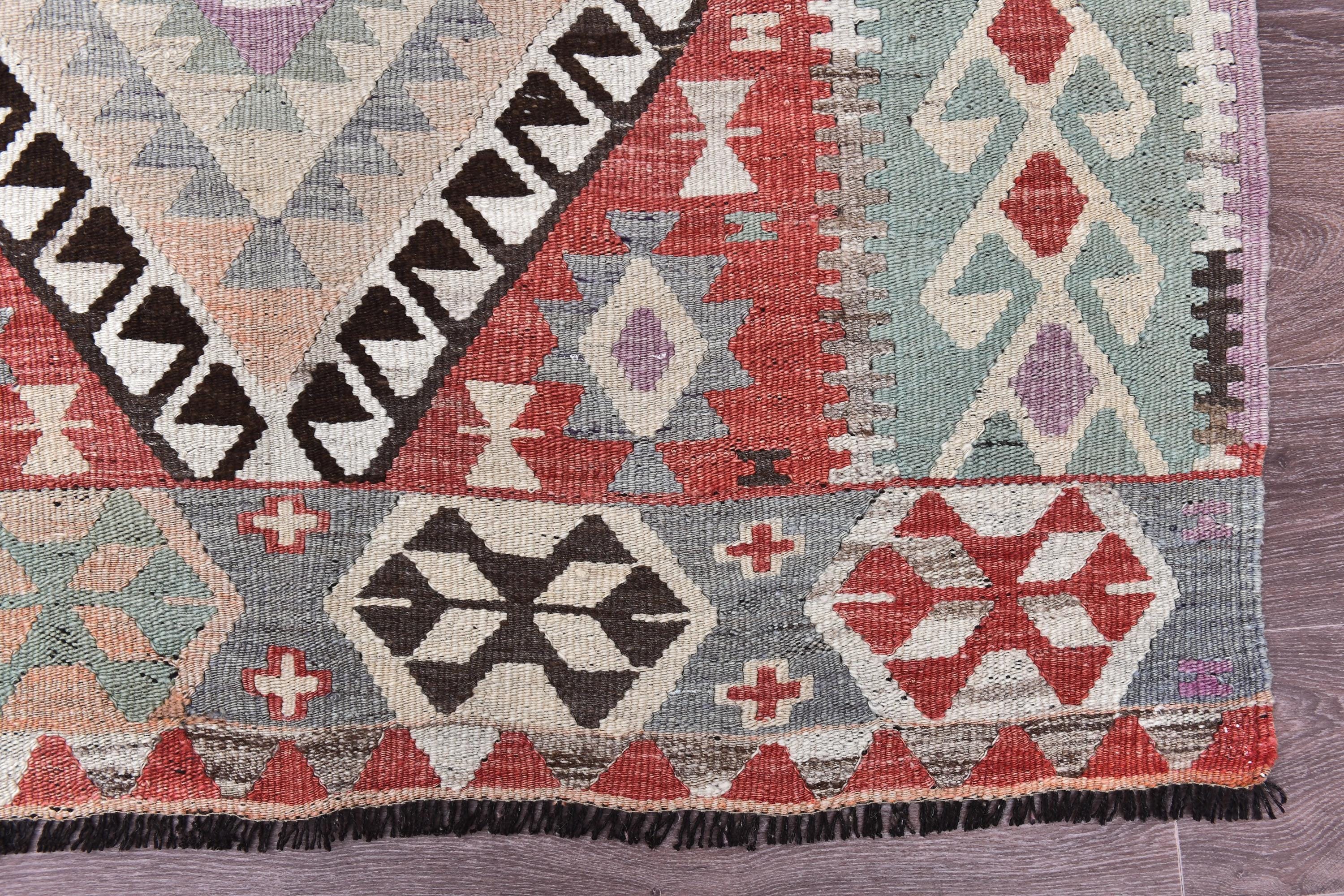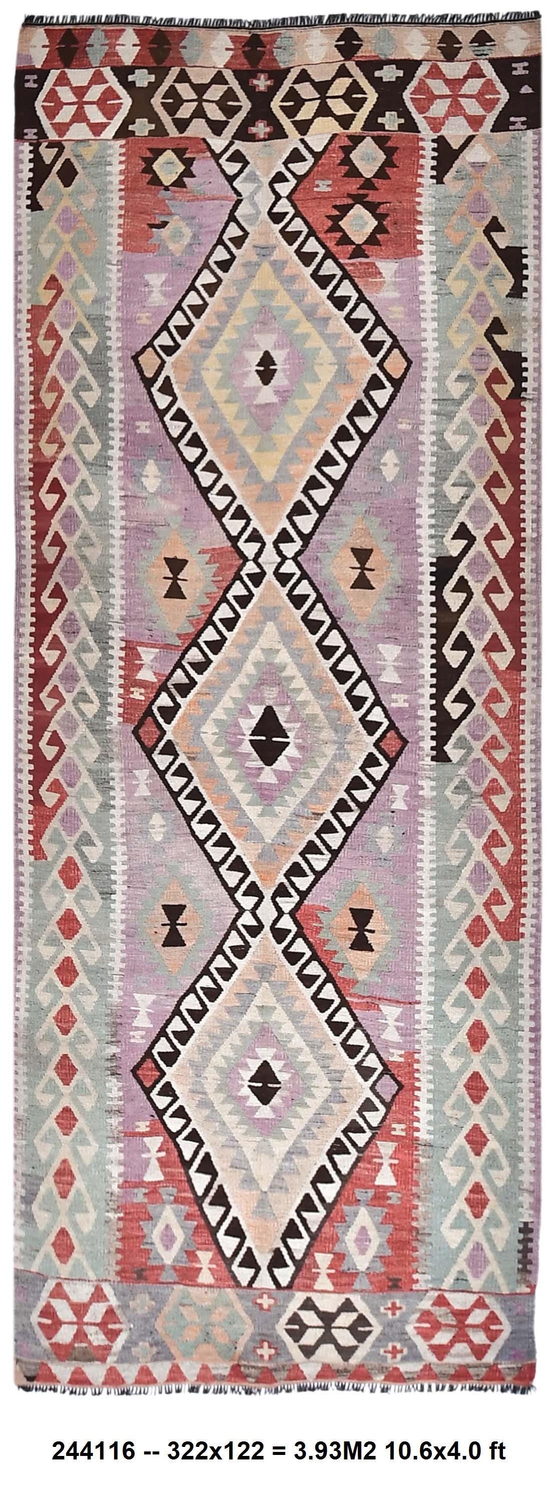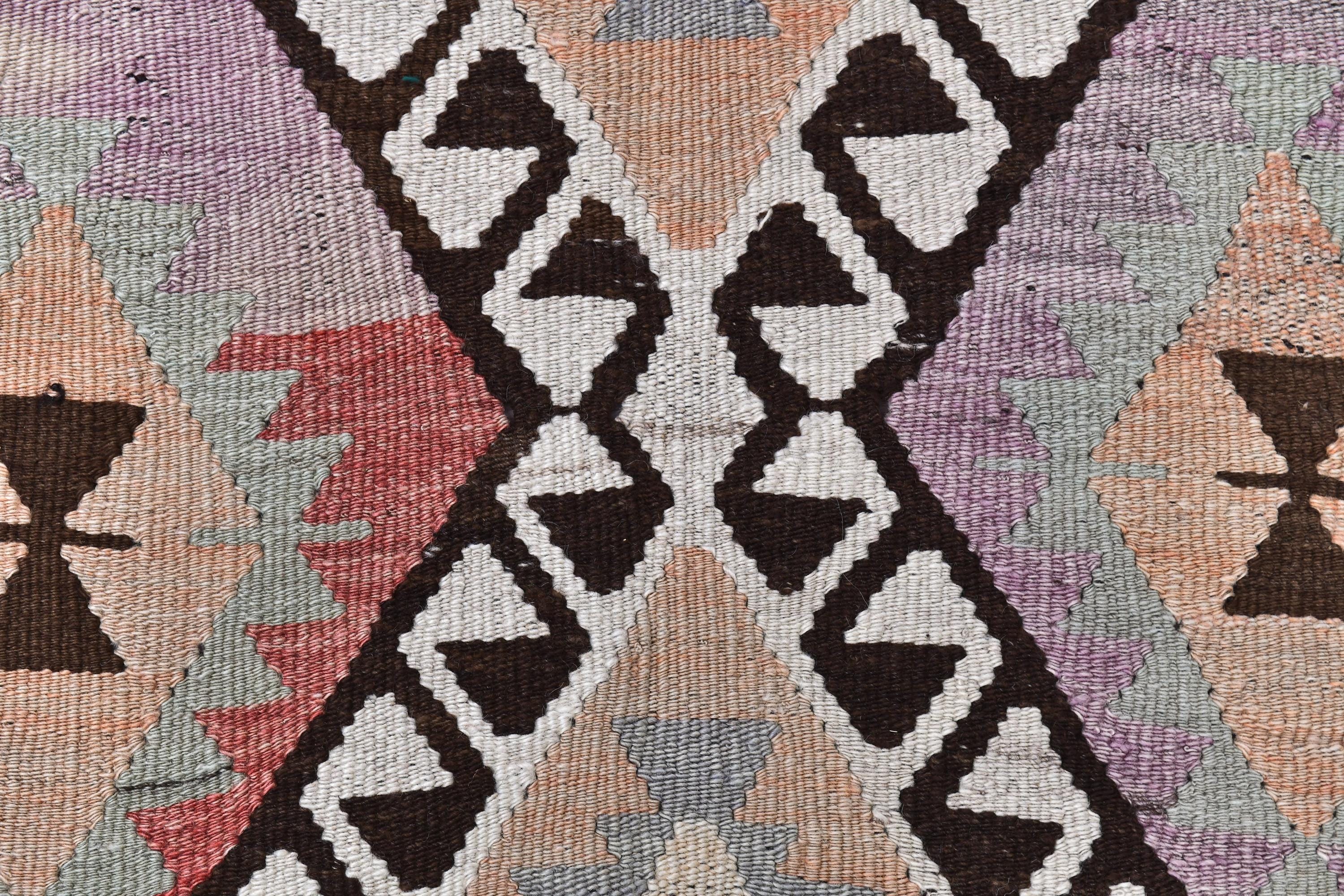 📜📌 Vintage Turkish kilim runner rug featuring vibrant geometric medallion pattern in pastel colors including coral red, lavender purple, mint green, peach, and cream. Hand-woven wool flat weave runner with three large diamond medallions and intricate tribal motifs. Decorative hexagonal end borders with traditional Anatolian geometric designs create authentic bohemian hallway textile.