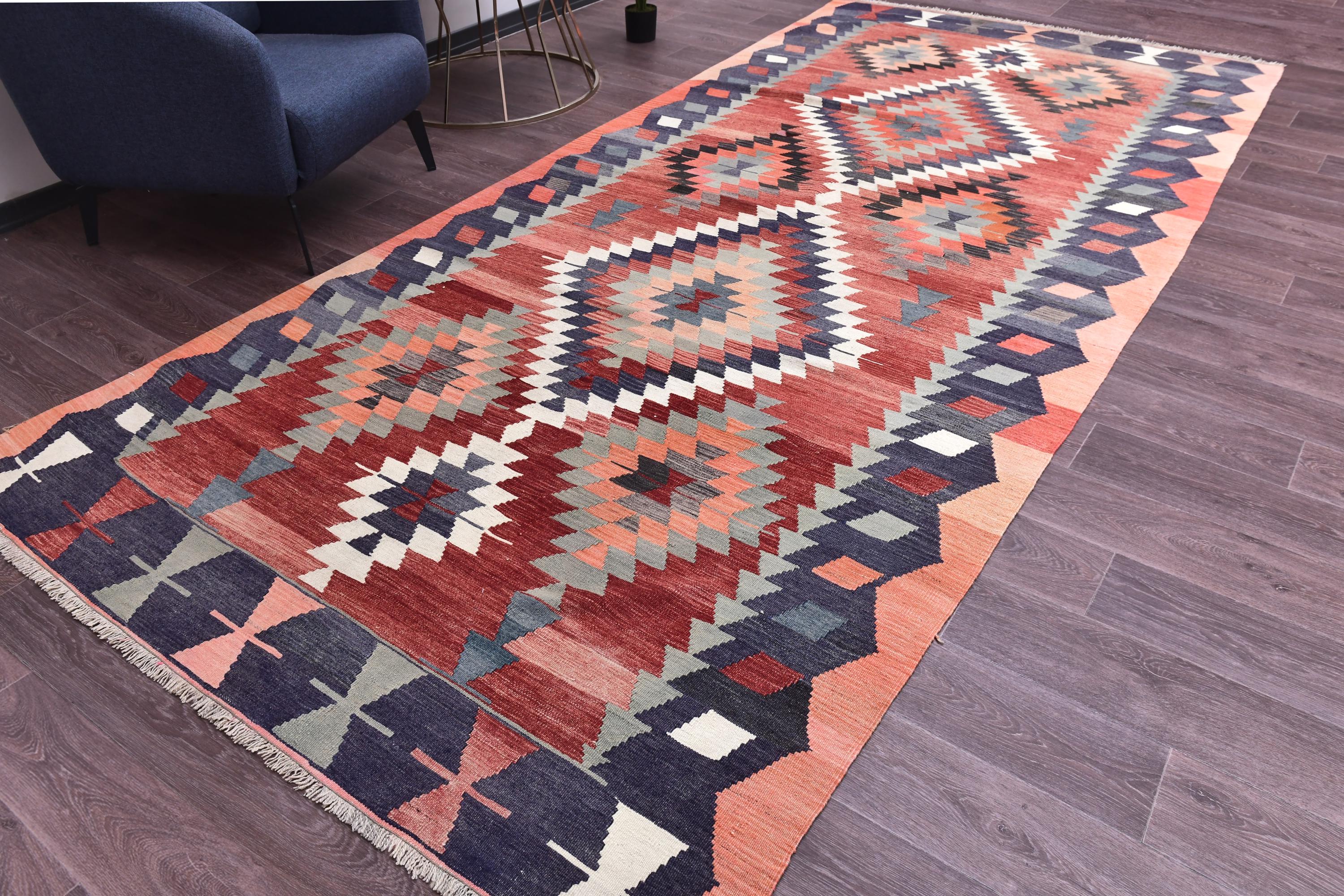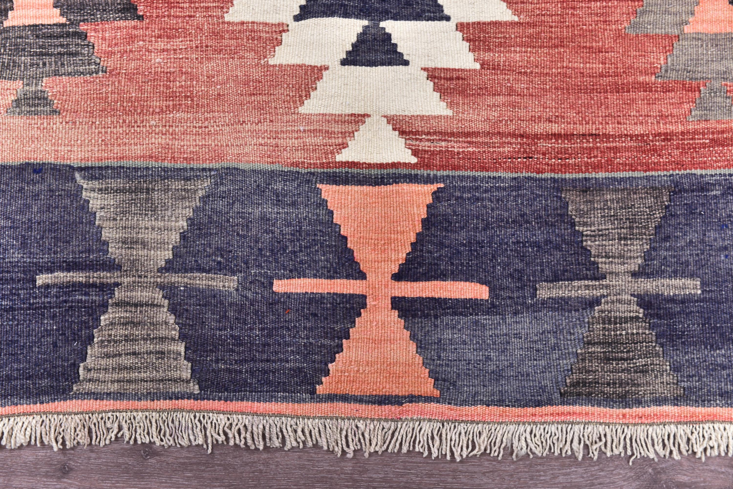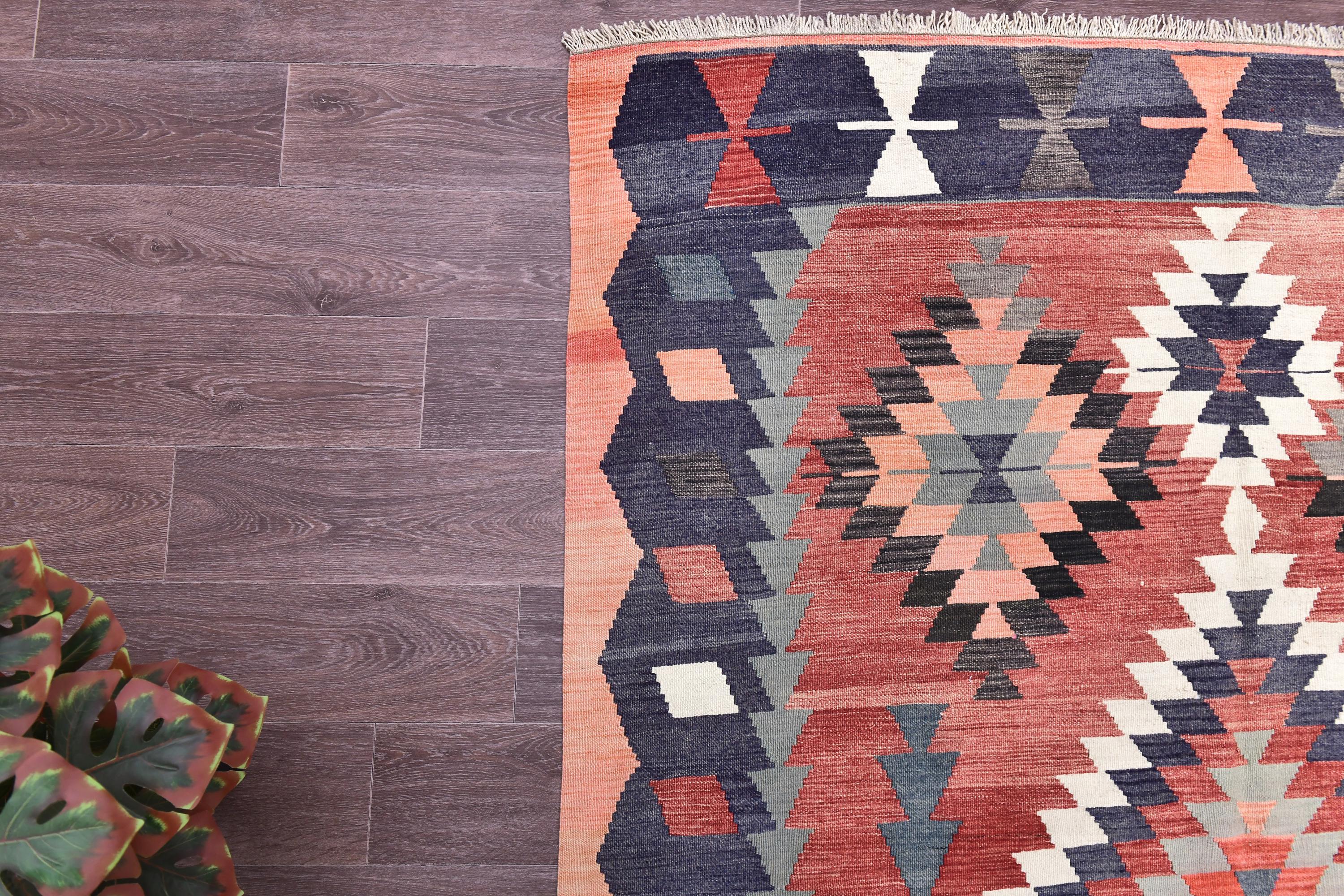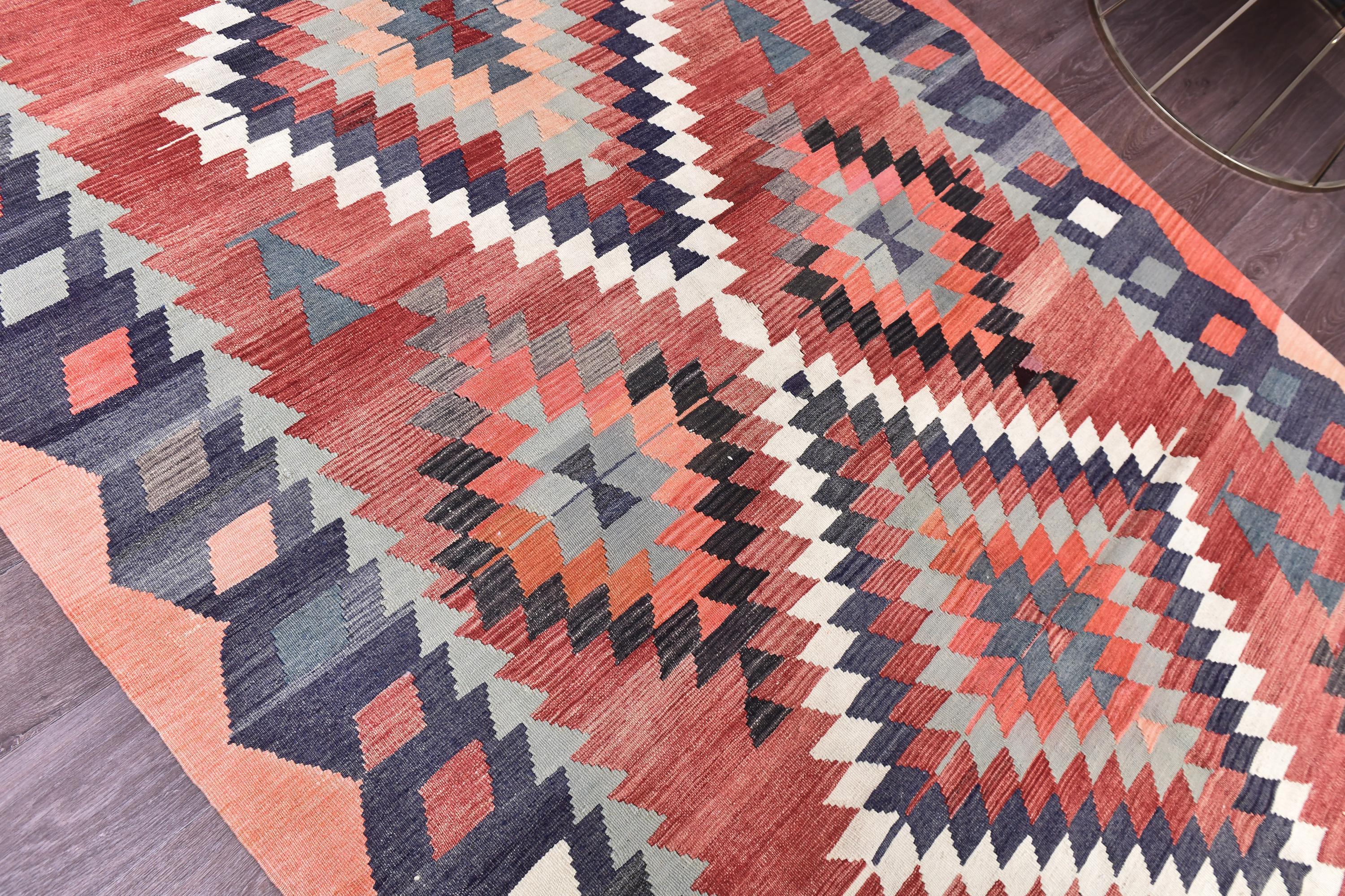 📜📌 Handwoven Turkish kilim area rug showcasing bold geometric diamond medallions in coral red, rust, navy blue, sage green, and peach tones. Flat weave wool construction with traditional southwestern style zigzag patterns and decorative border design featuring tribal motifs, perfect for modern bohemian living rooms.