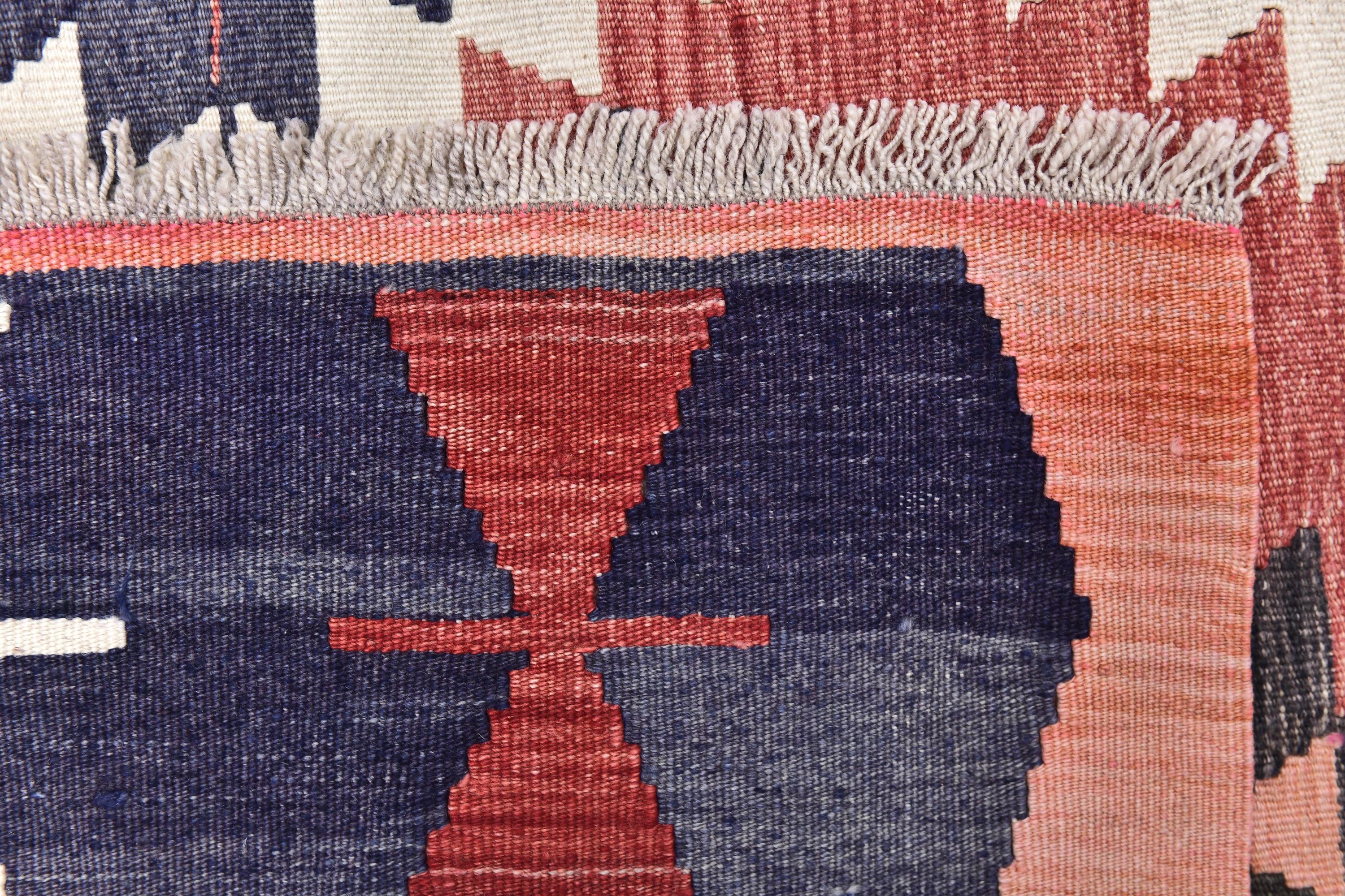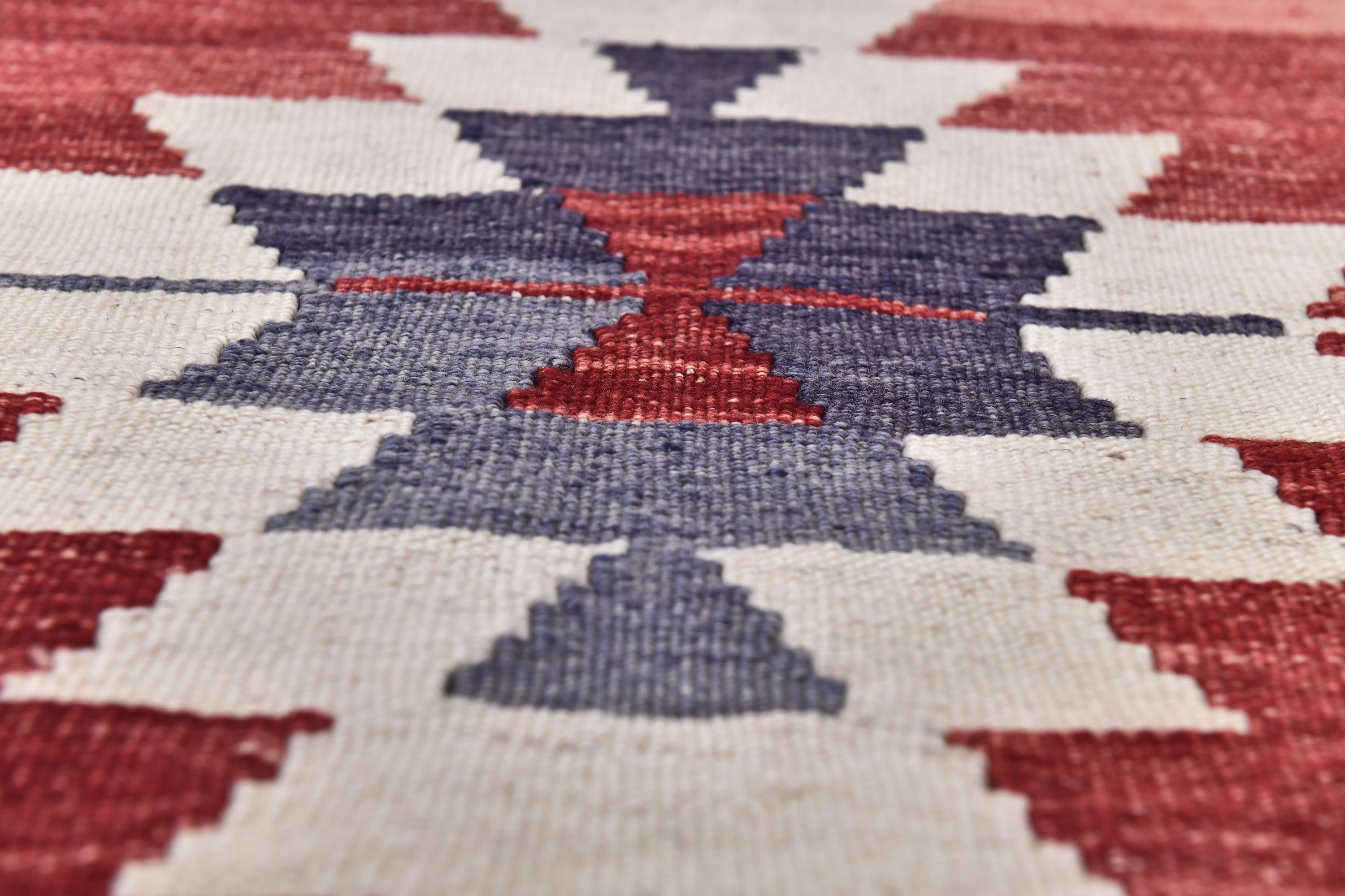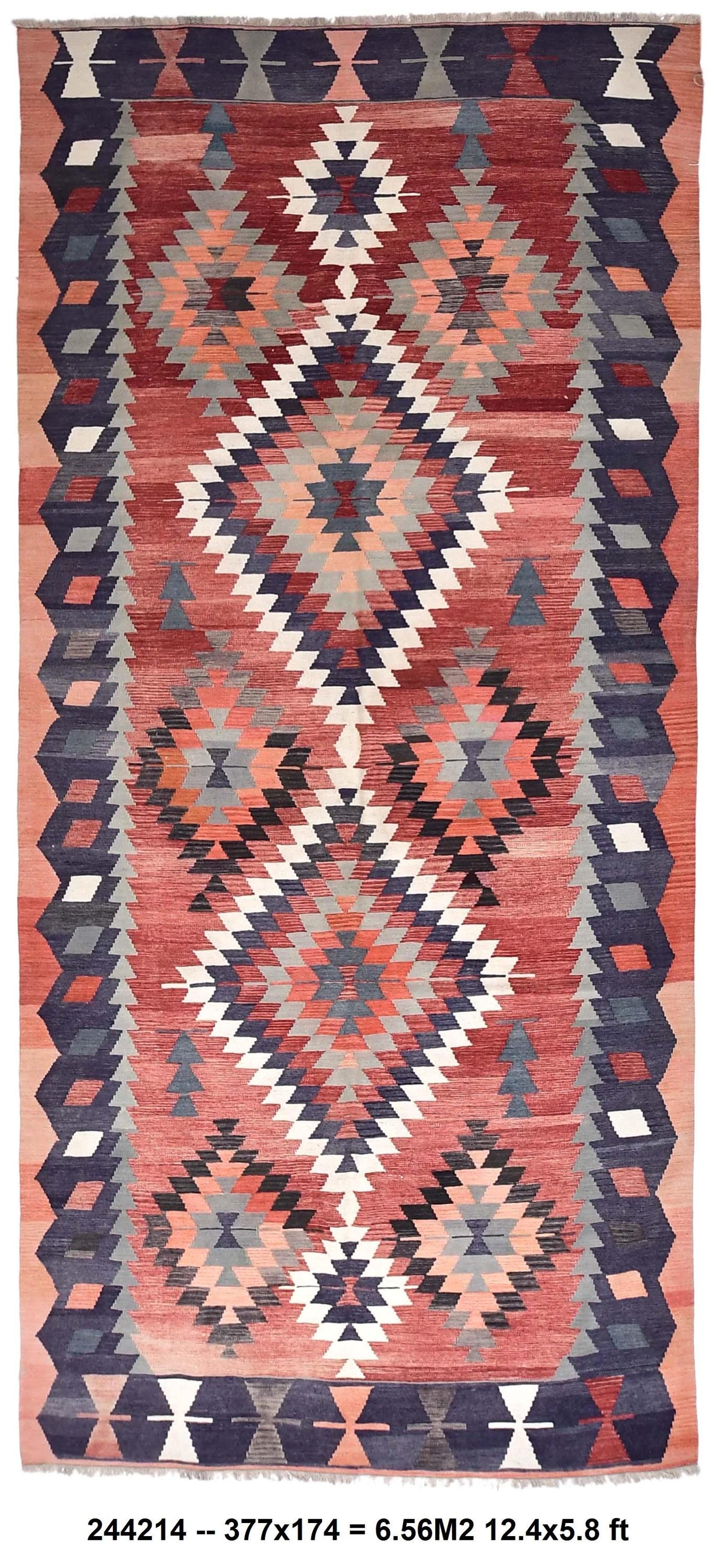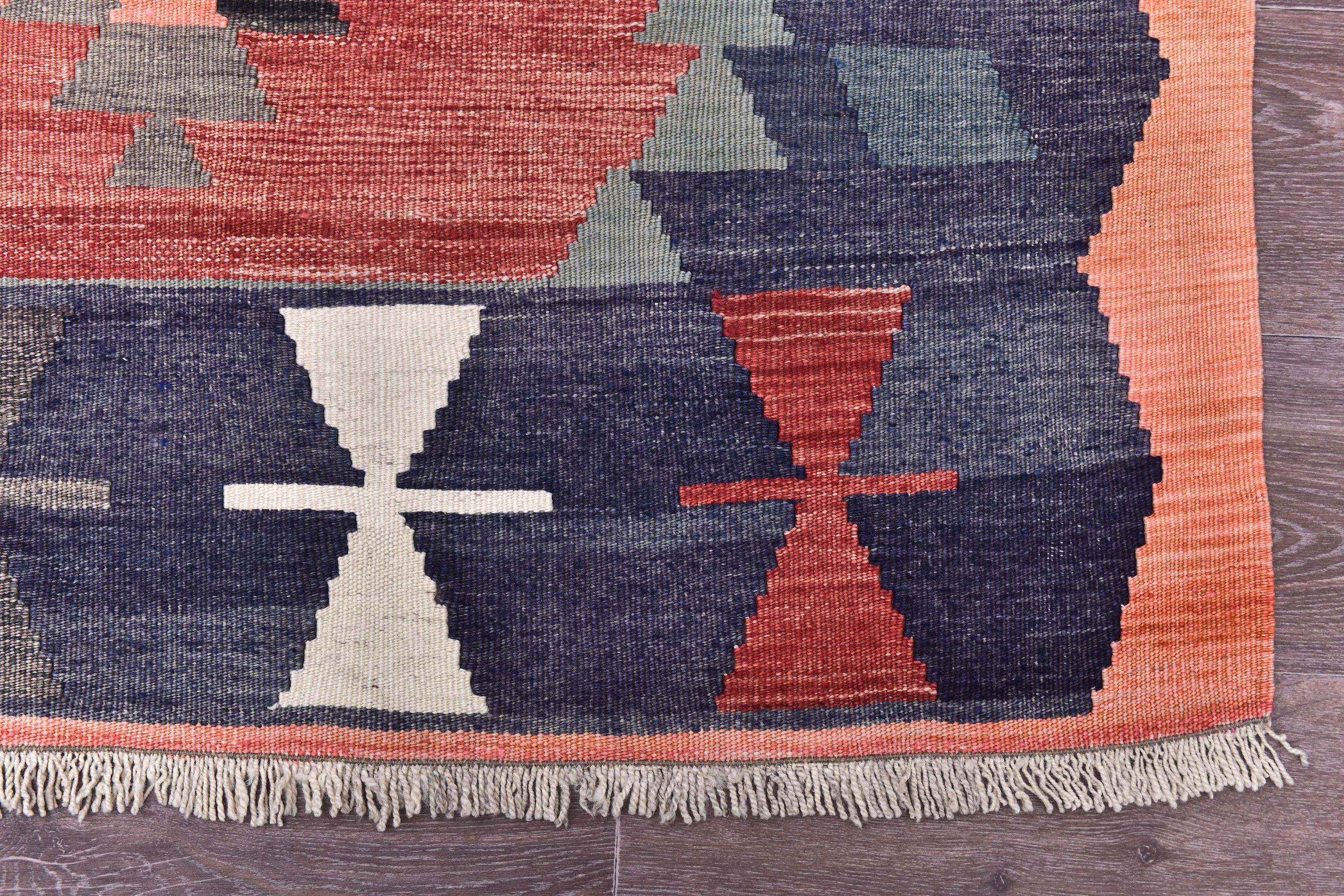 📜📌 Handwoven Turkish kilim area rug showcasing bold geometric diamond medallions in coral red, rust, navy blue, sage green, and peach tones. Flat weave wool construction with traditional southwestern style zigzag patterns and decorative border design featuring tribal motifs, perfect for modern bohemian living rooms.