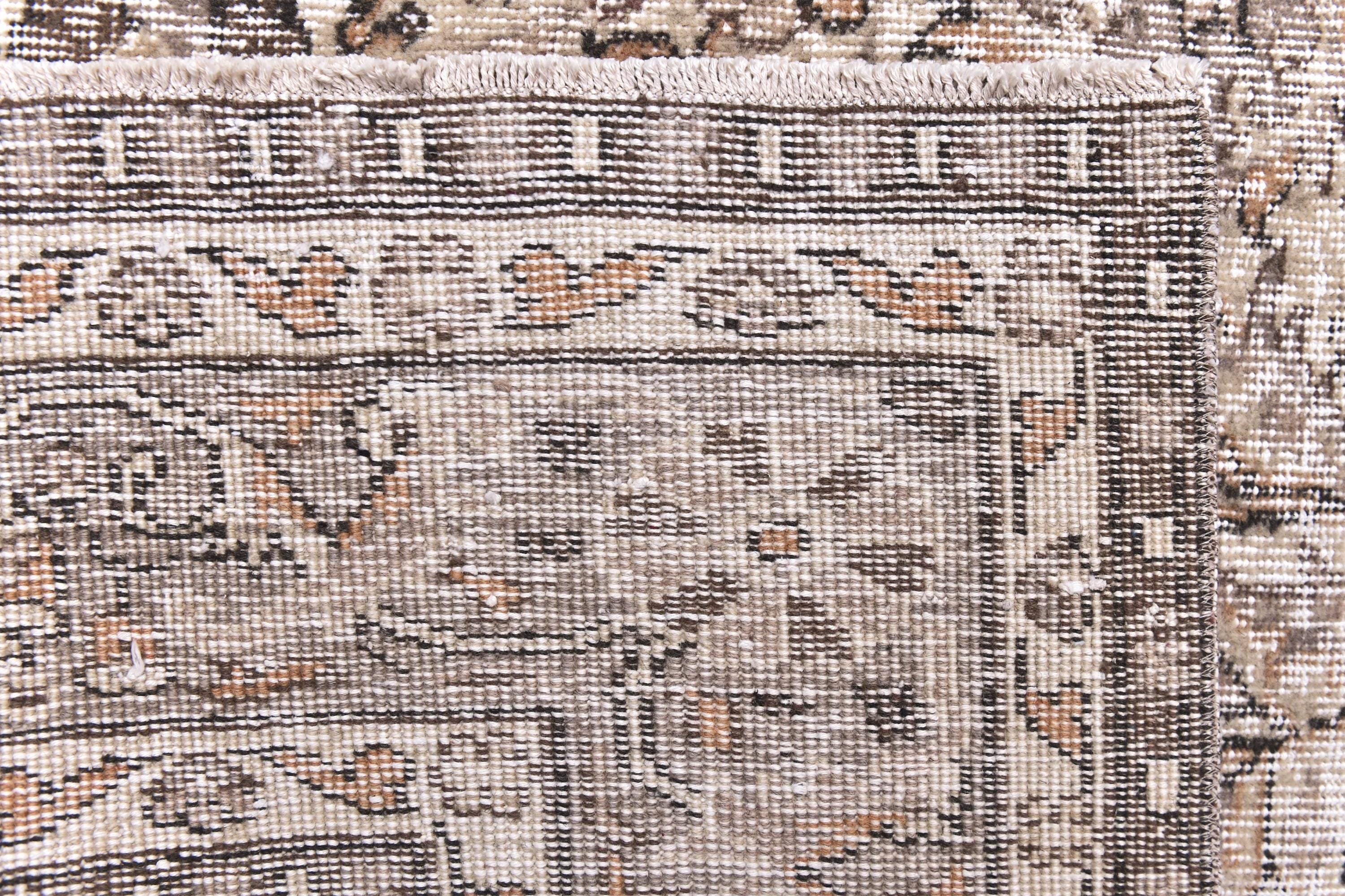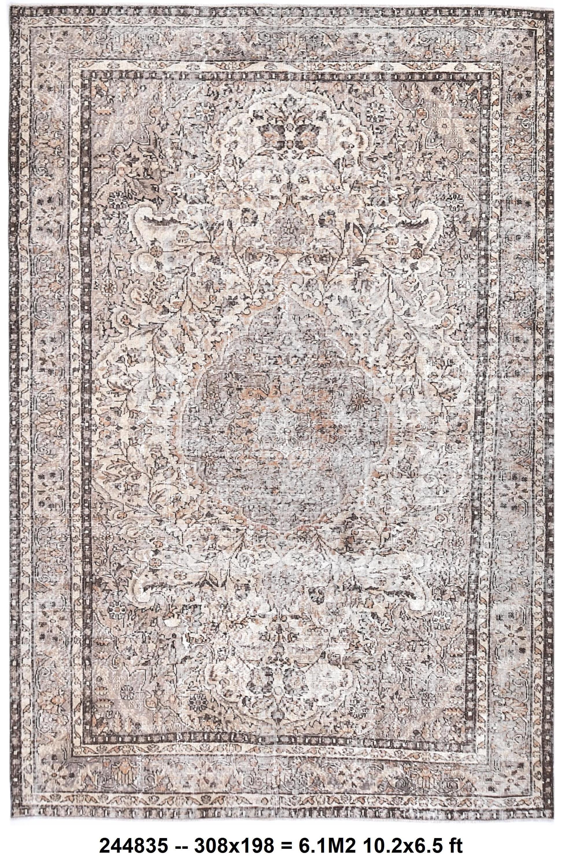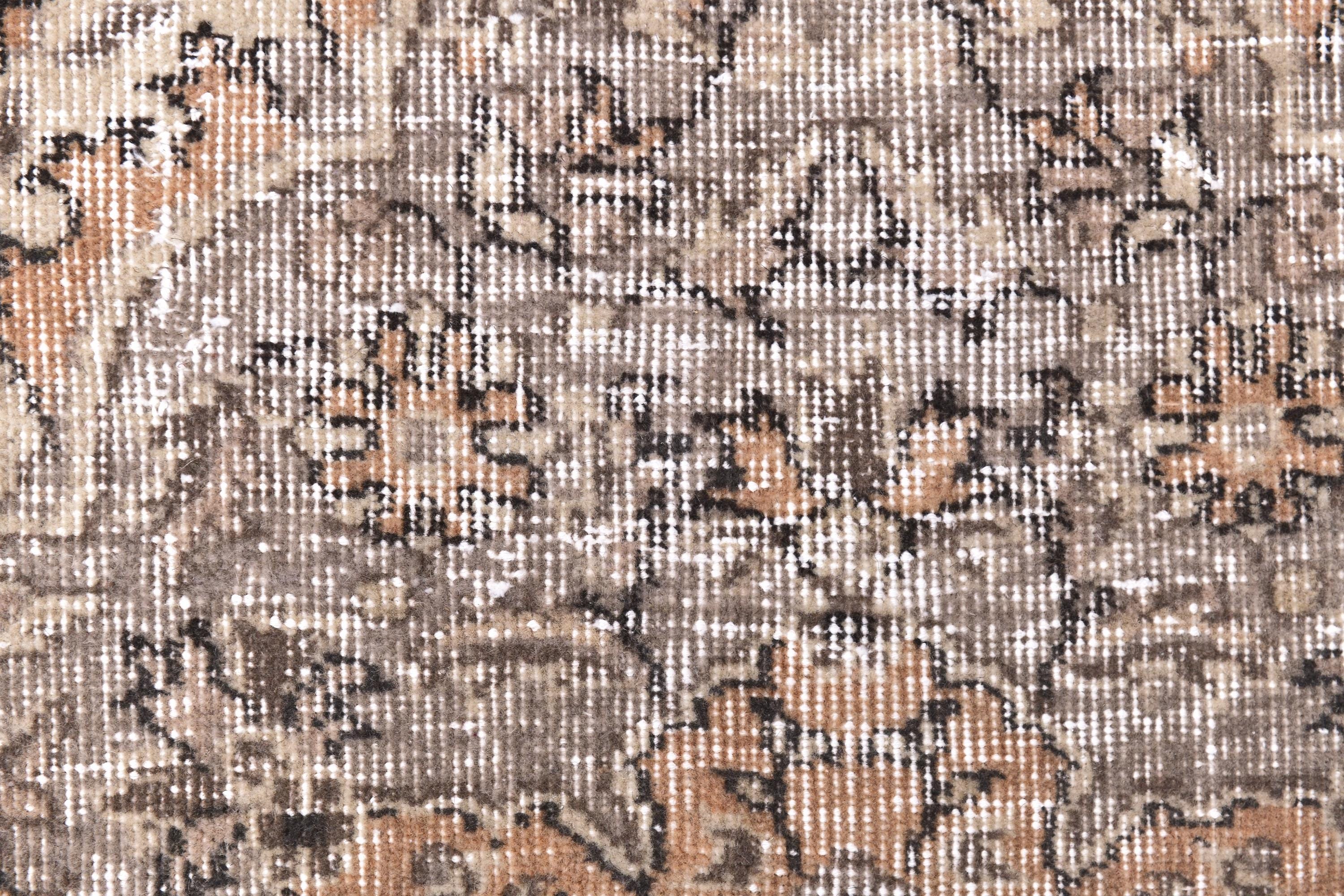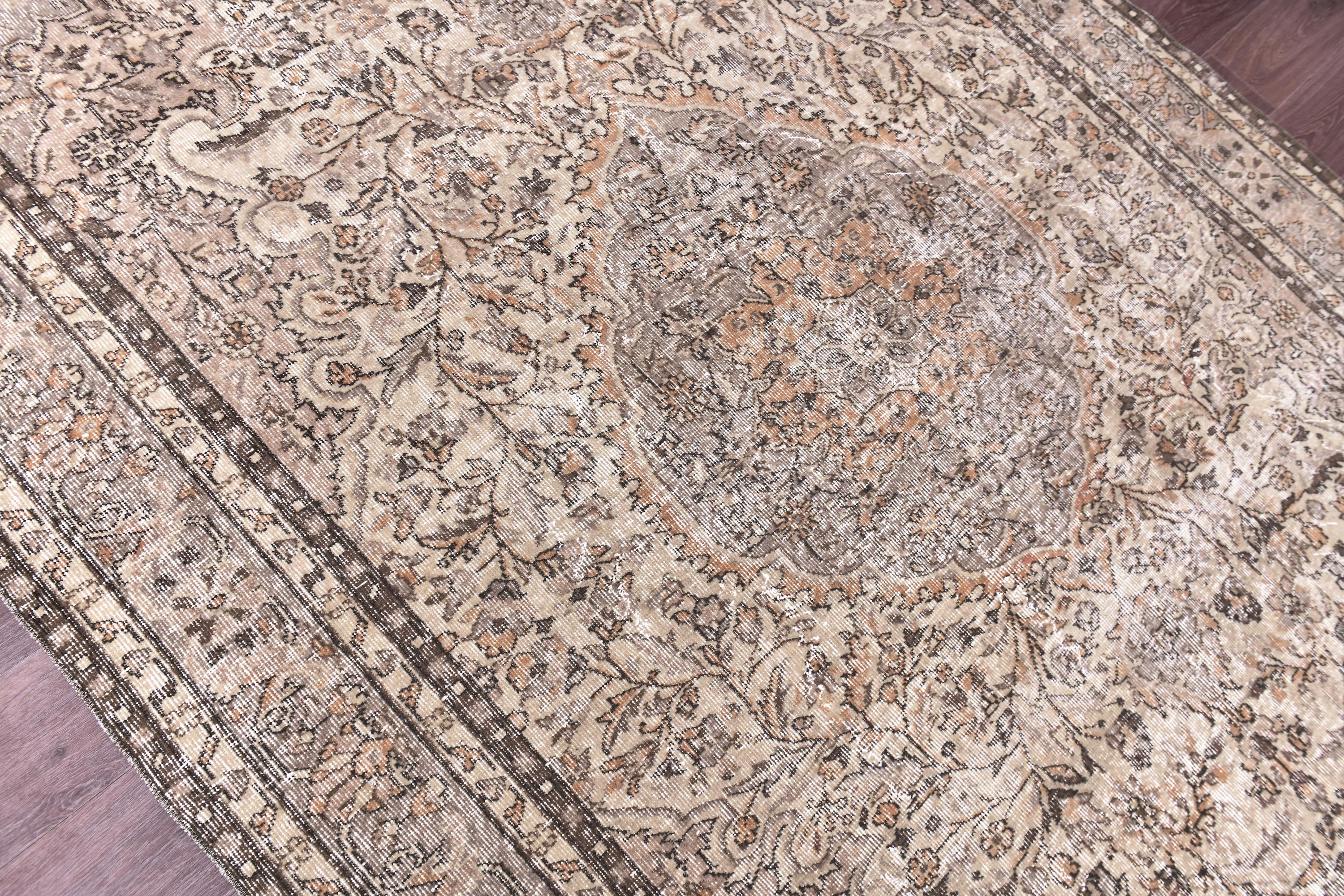 📜📌Vintage distressed Turkish area rug featuring intricate all-over floral and botanical design in muted neutral palette. Hand-knotted wool construction displays elegant cream, beige, taupe, and soft gray tones with ornate central medallion and detailed vine scroll patterns. Multiple borders showcase traditional Persian-inspired motifs with authentic weathered patina perfect for farmhouse or shabby chic interiors.