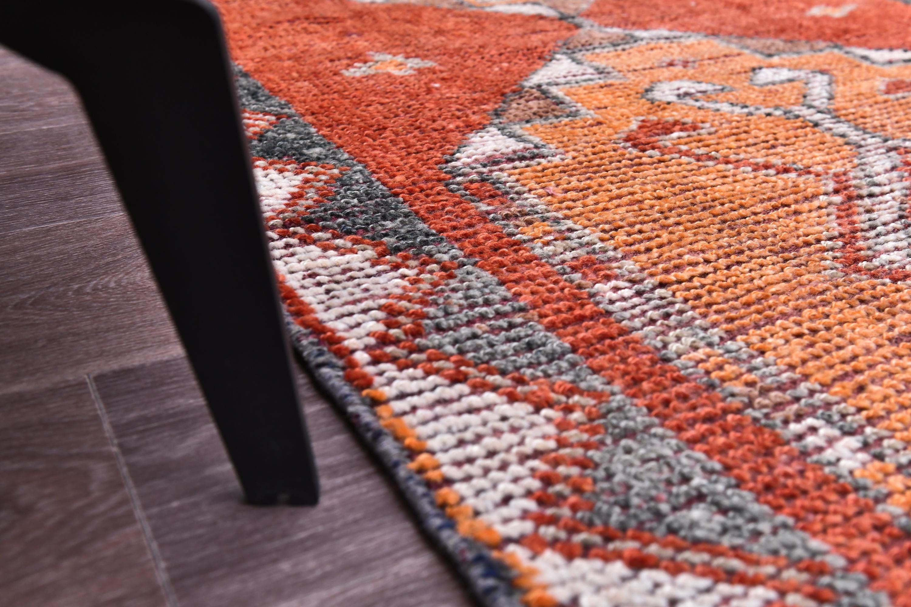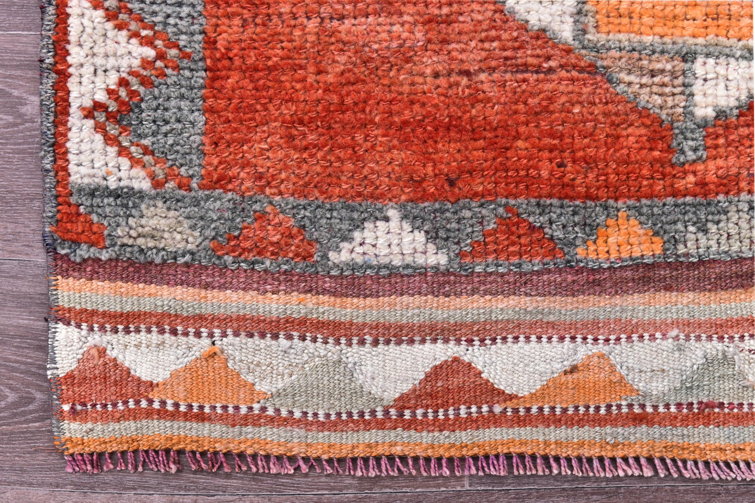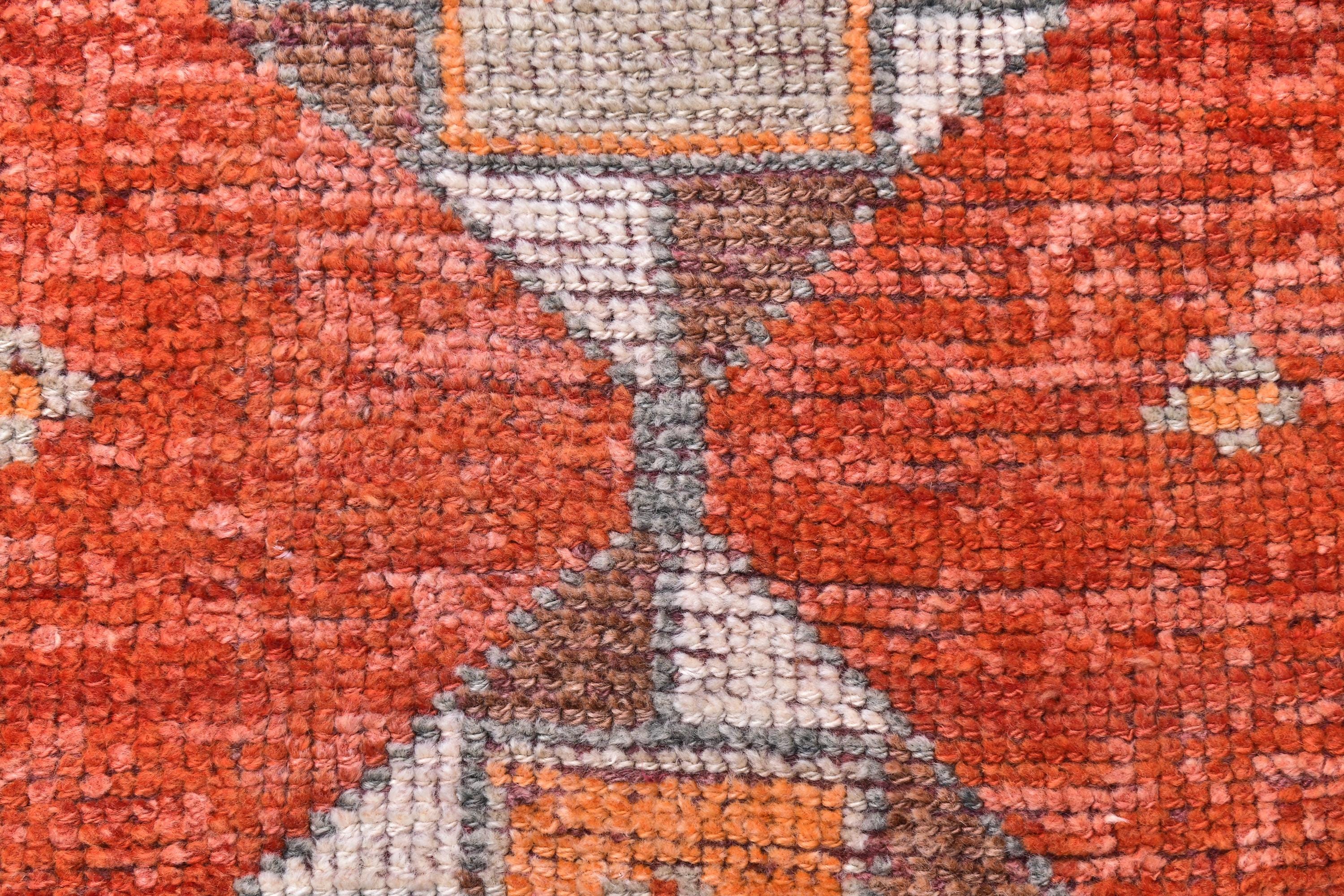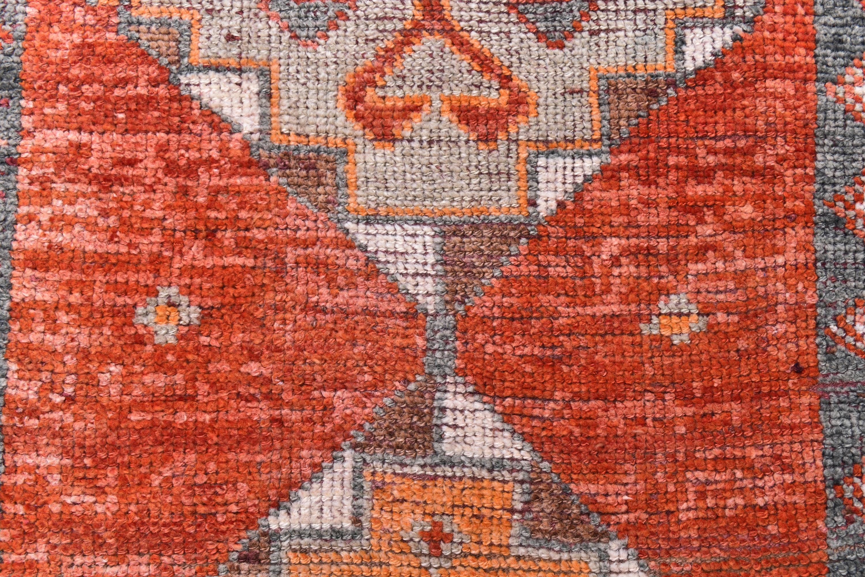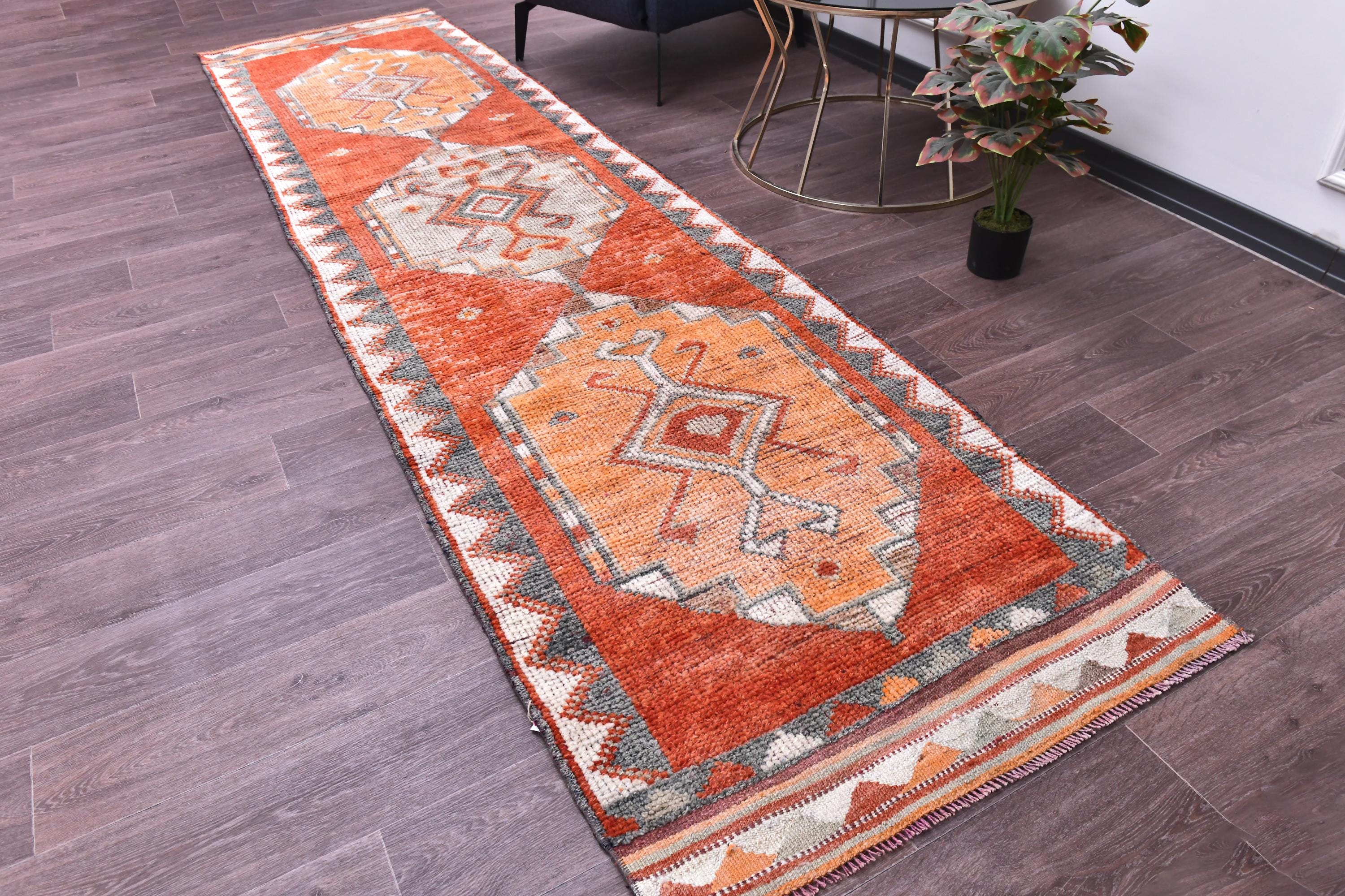 📜📌 Vintage Turkish runner rug featuring vibrant burnt orange and rust red field with three hexagonal geometric medallions in peach, cream, and blue-gray tones. Hand-knotted wool construction displays traditional Oushak tribal designs with stylized diamond motifs and decorative border in ivory, charcoal gray, and orange creating authentic bohemian style for long hallways.