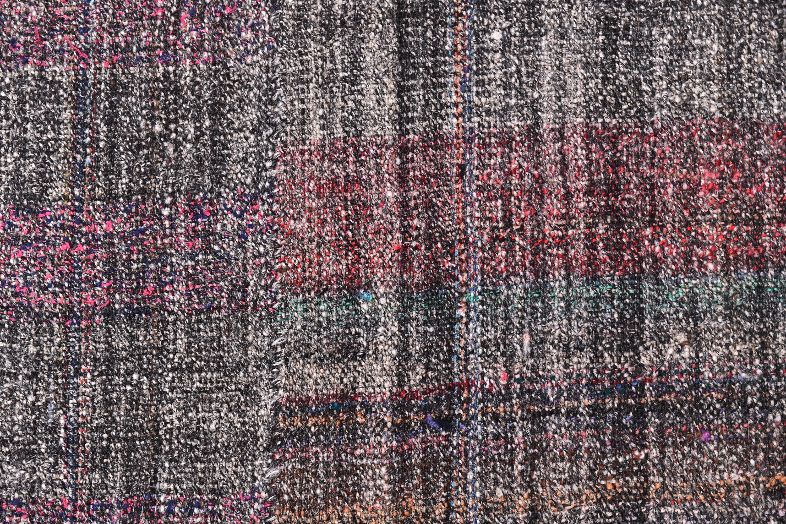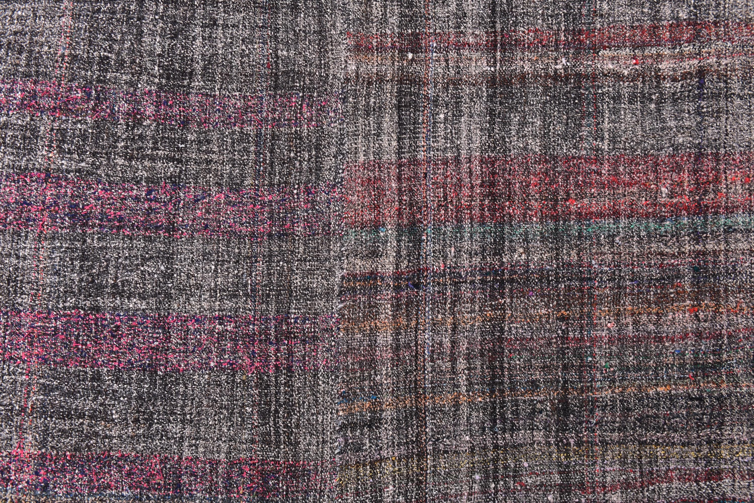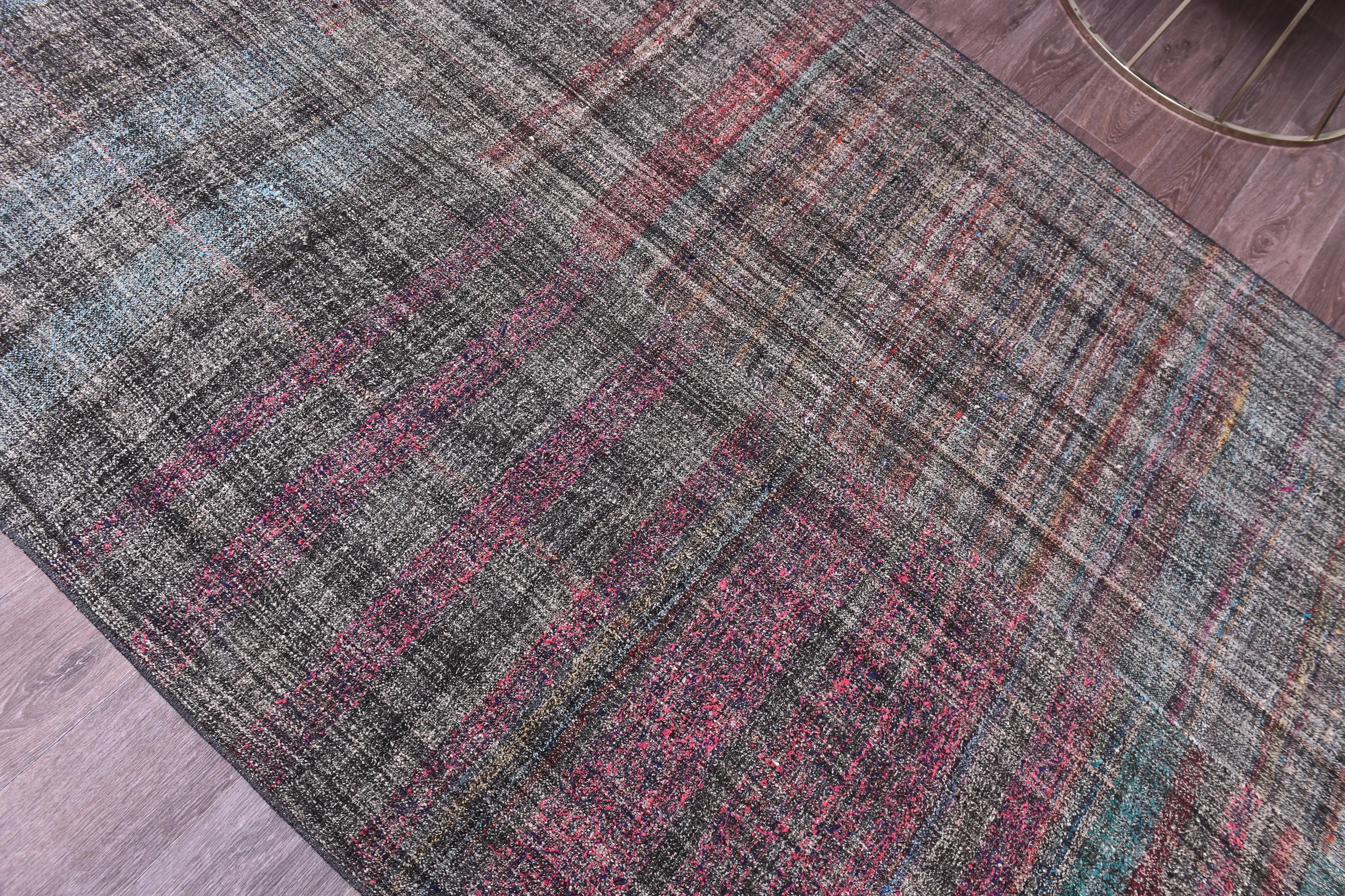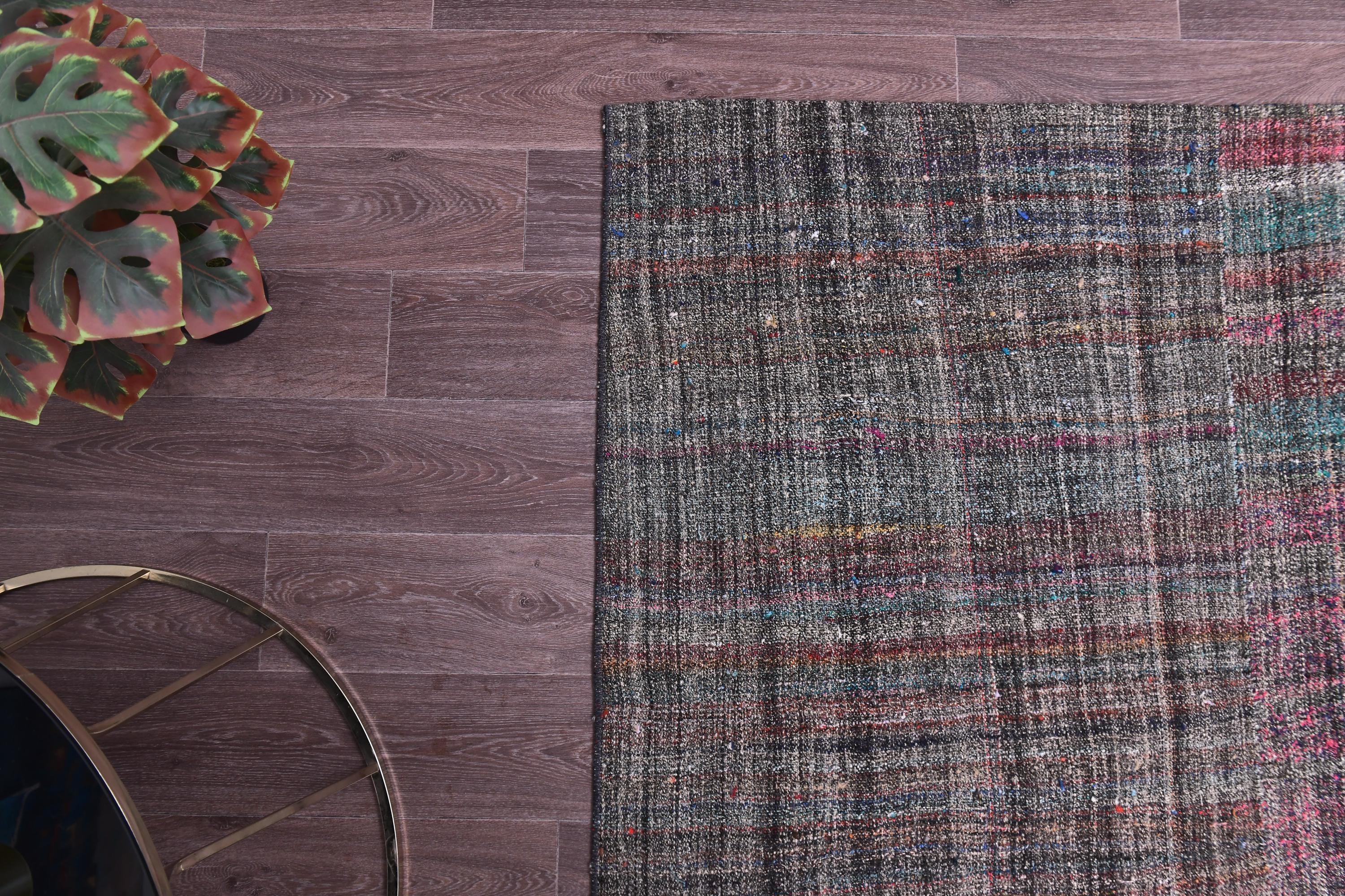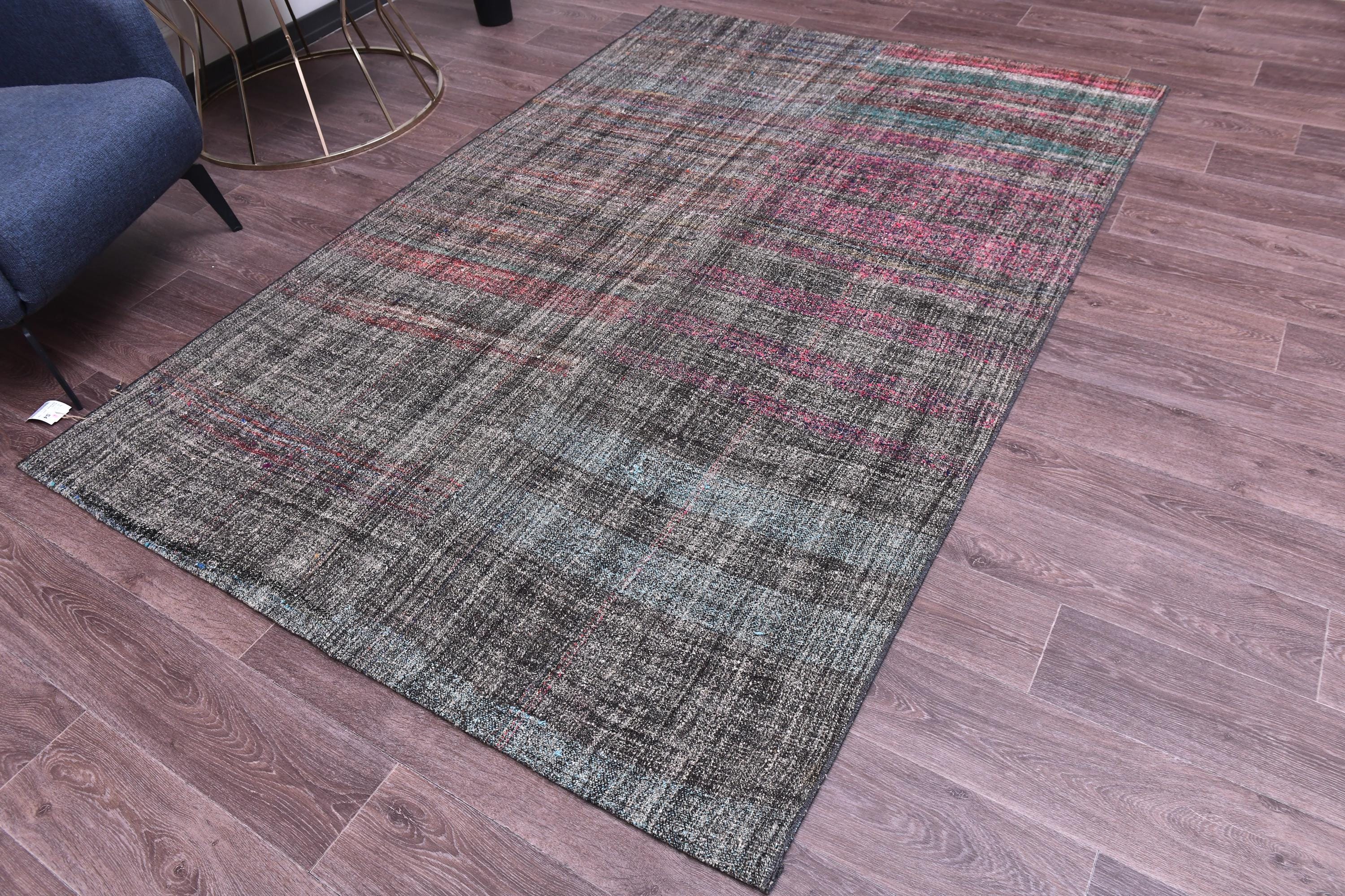 📜📌 Handwoven Turkish patchwork carpet with gray and black dominant tones, featuring geometric patchwork design with pink and teal vintage kilim sections, overdyed finish creating unique distressed weathered appearance ideal for eclectic modern home decor
