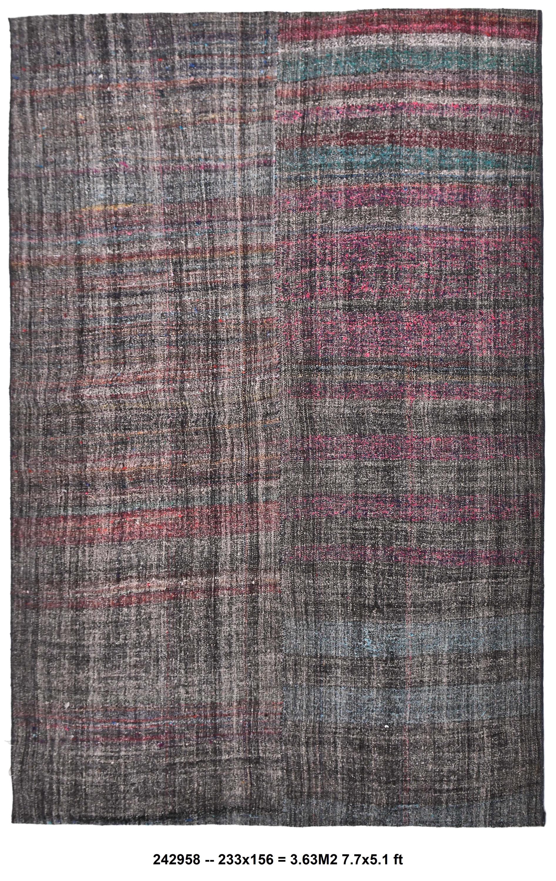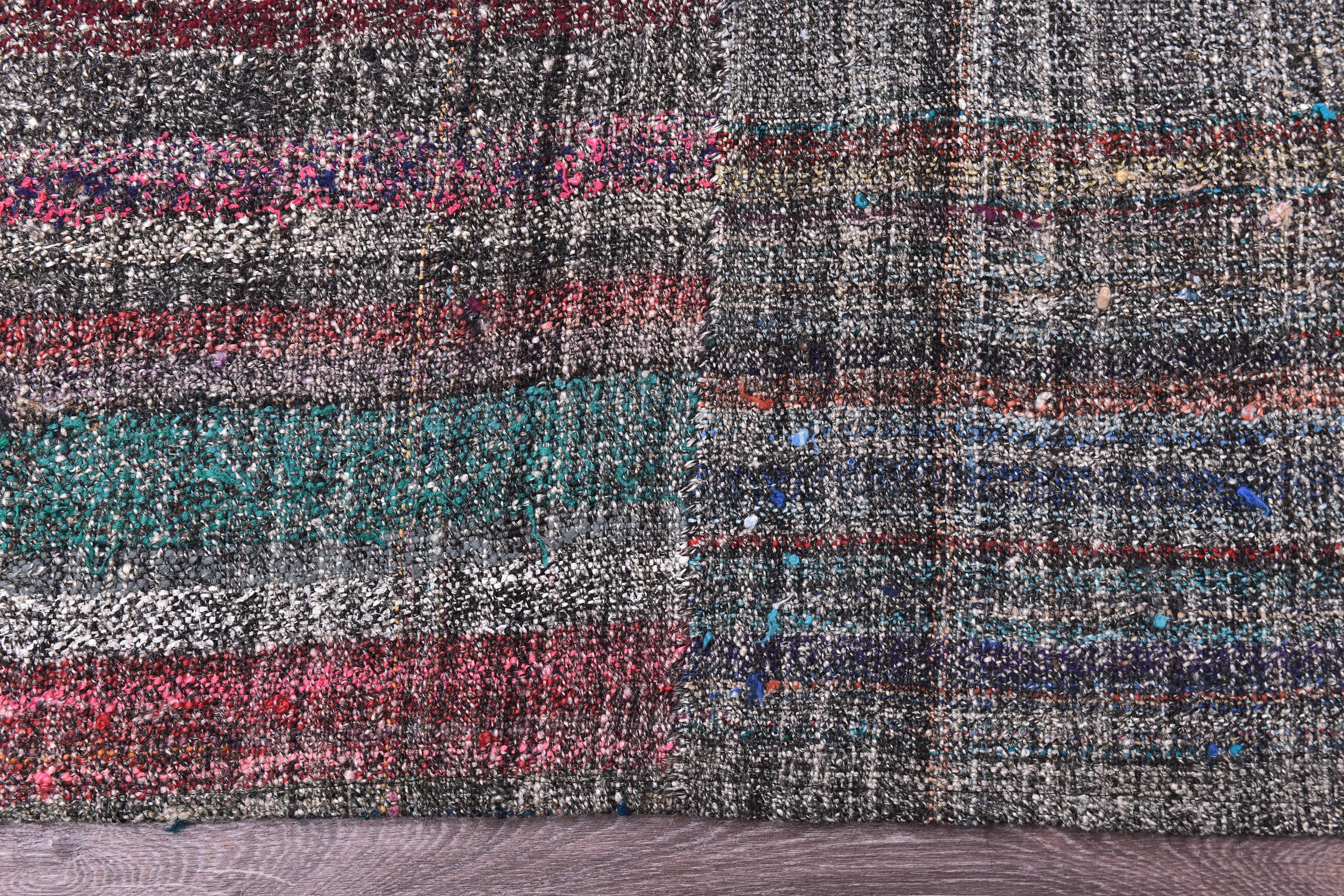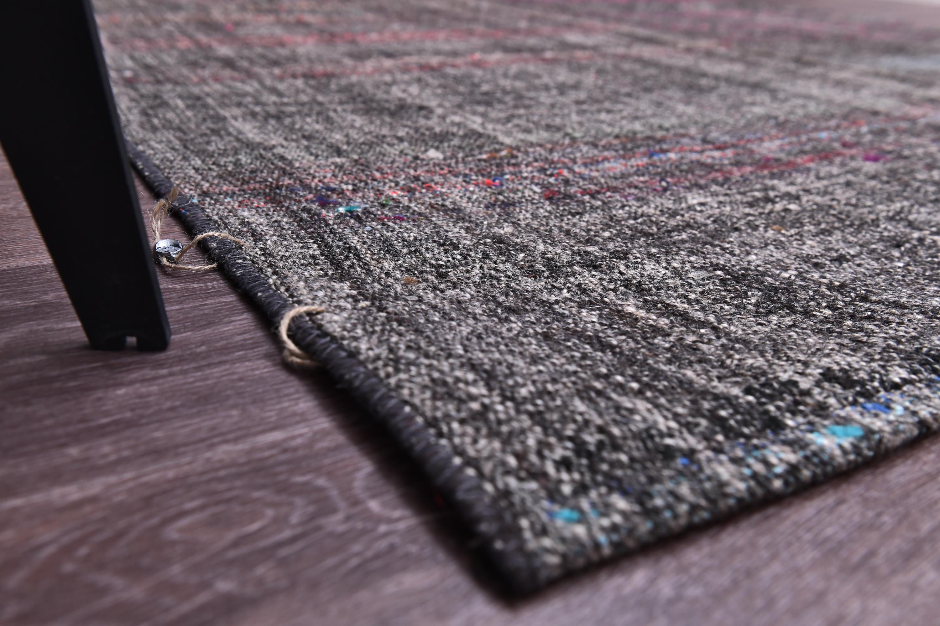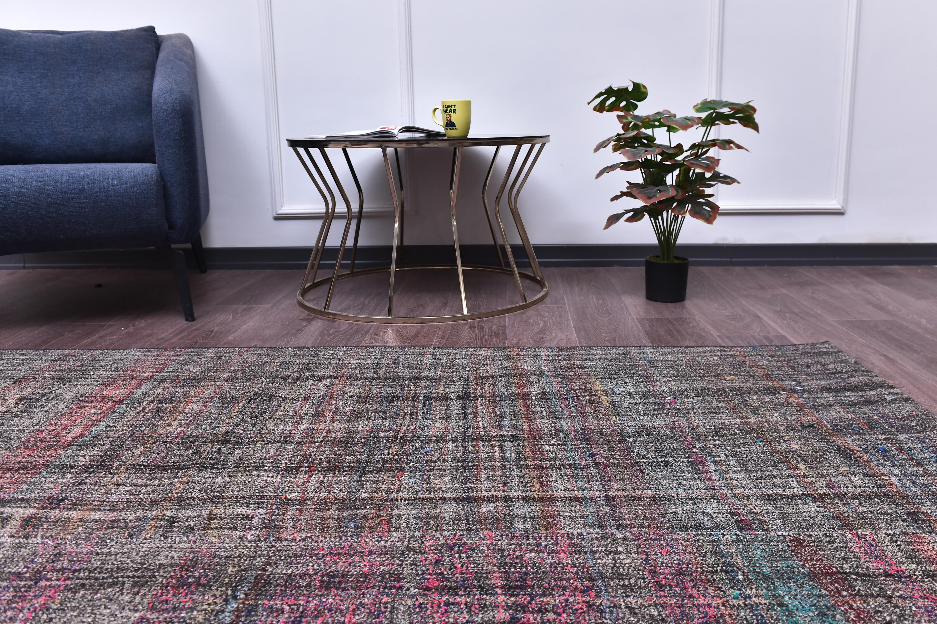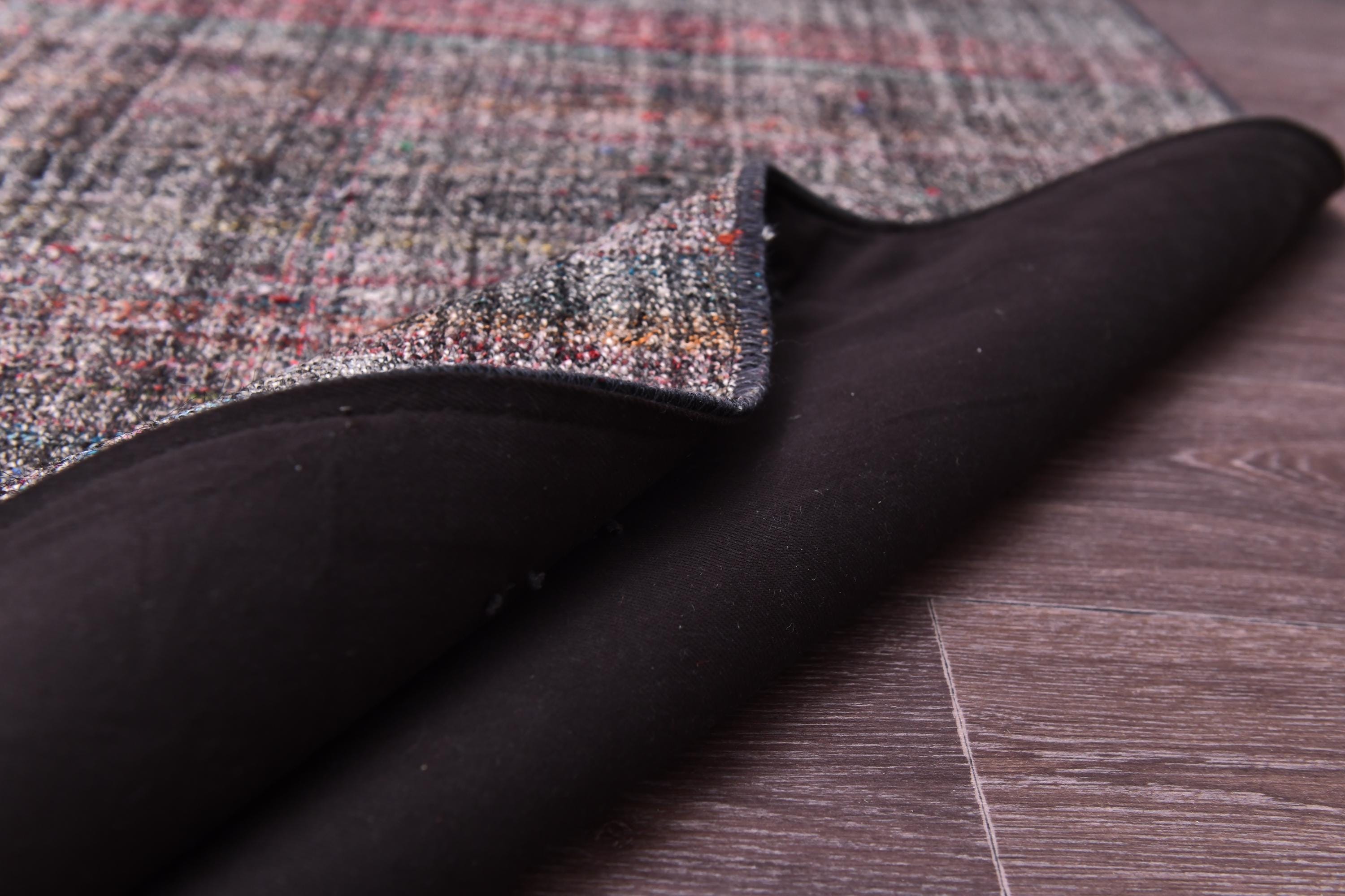 📜📌 Handwoven Turkish patchwork carpet with gray and black dominant tones, featuring geometric patchwork design with pink and teal vintage kilim sections, overdyed finish creating unique distressed weathered appearance ideal for eclectic modern home decor