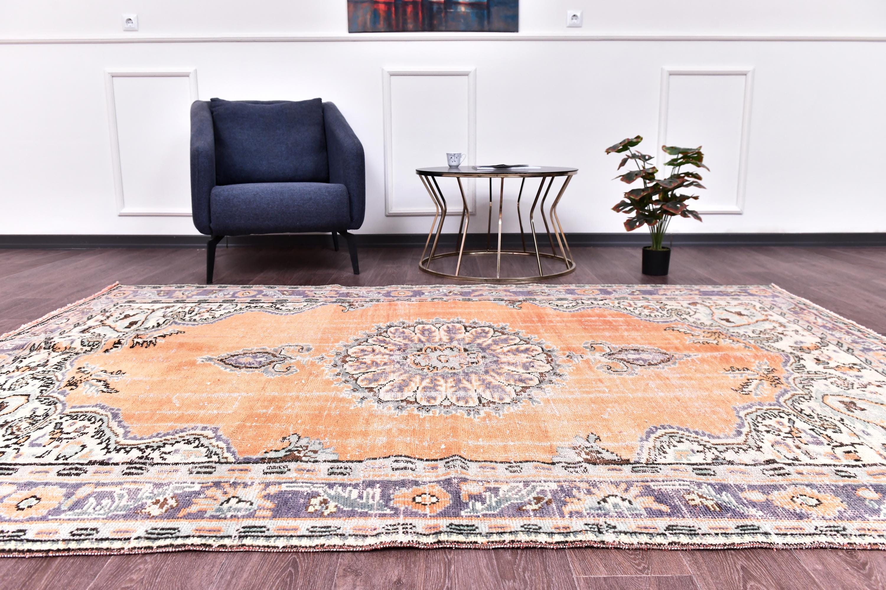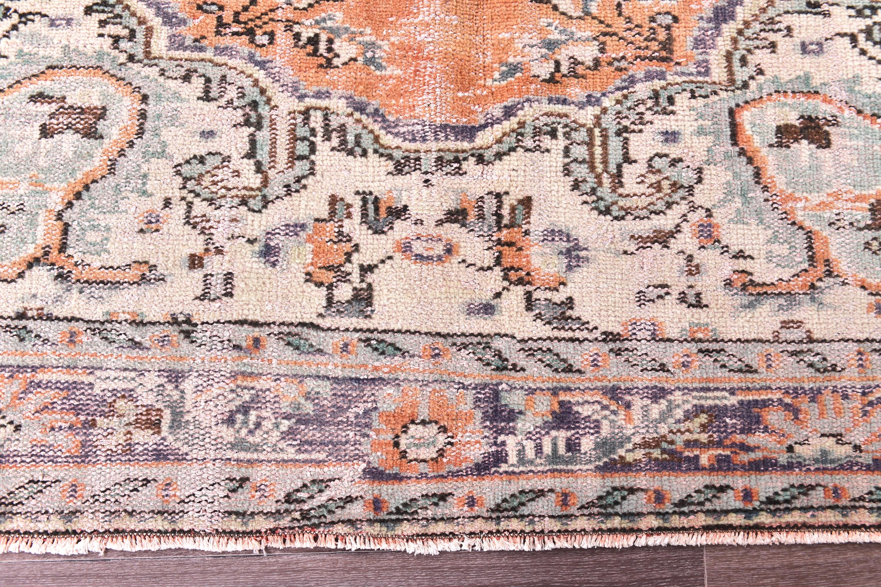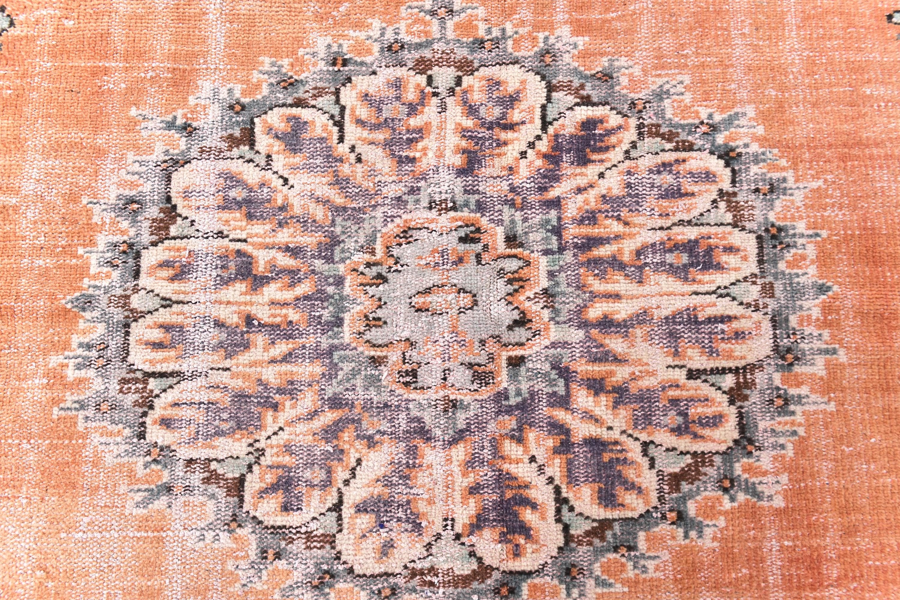 📜 Faded antique Turkish rug with apricot-orange central field and traditional Persian-style floral medallion design. Low-pile hand-knotted wool carpet exhibits natural distressing and color variations from age, including cream, lavender-gray, charcoal, and peachy tones. Corner cartouches feature elaborate paisley and vine motifs, while multiple ornate borders frame the composition.