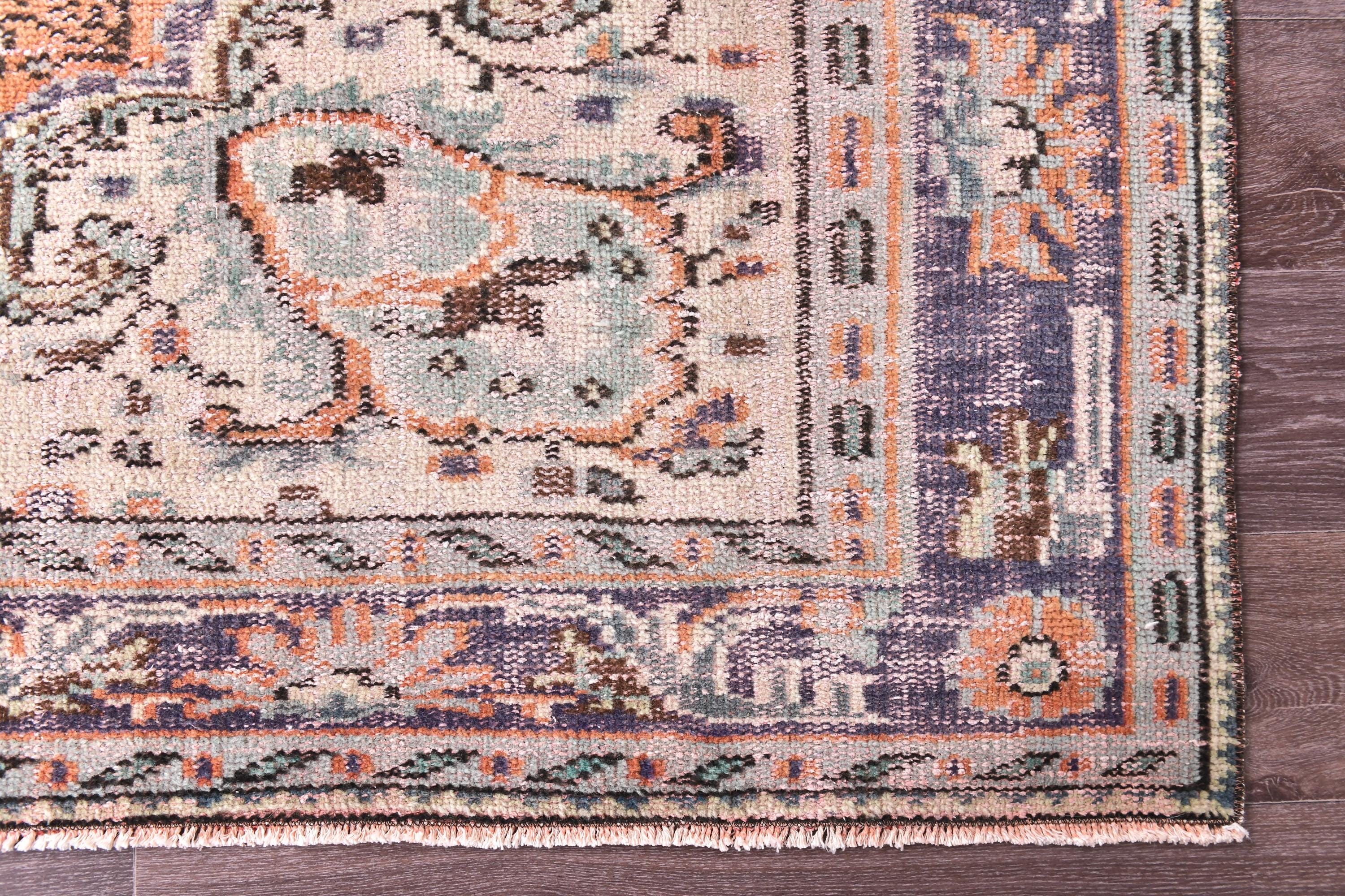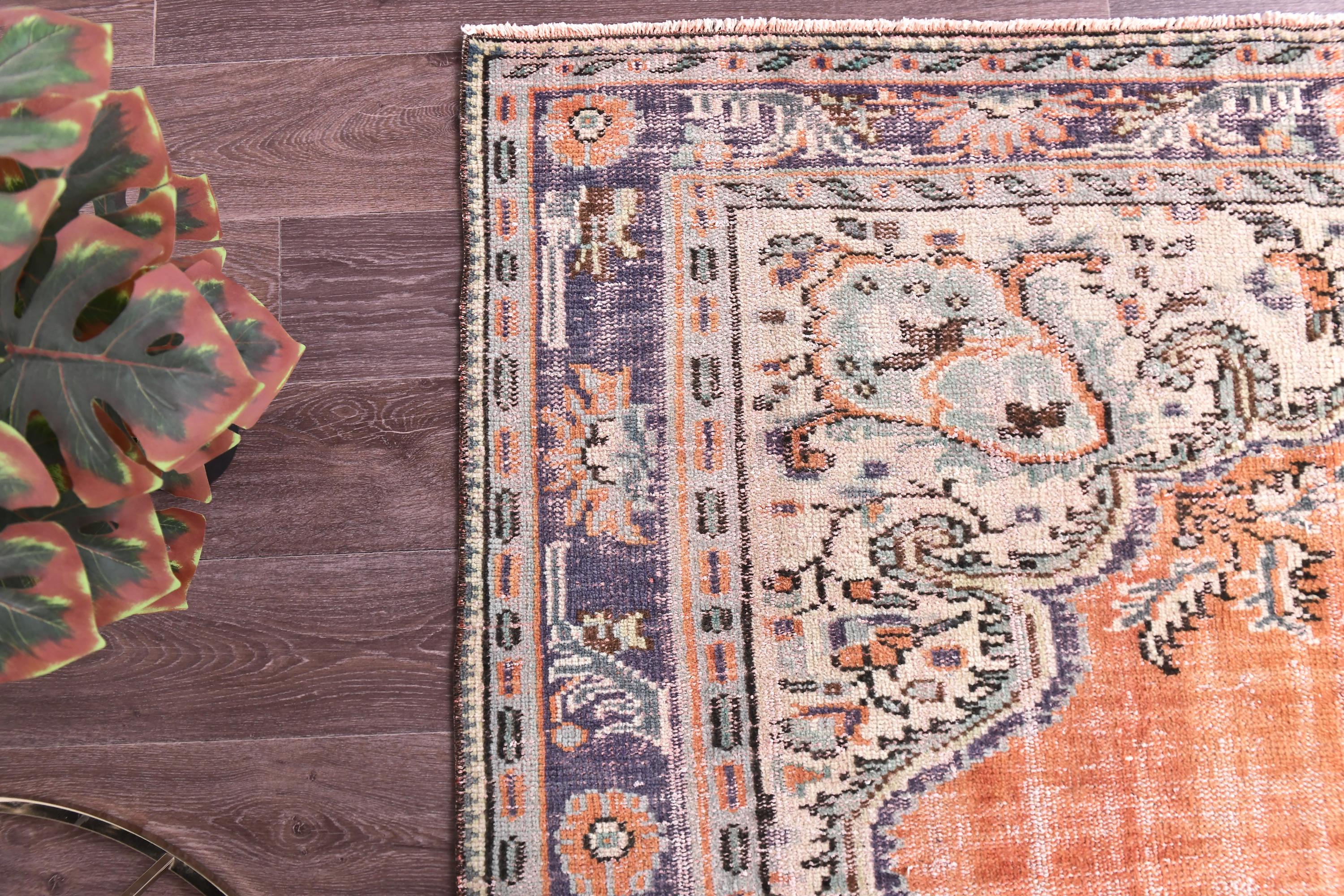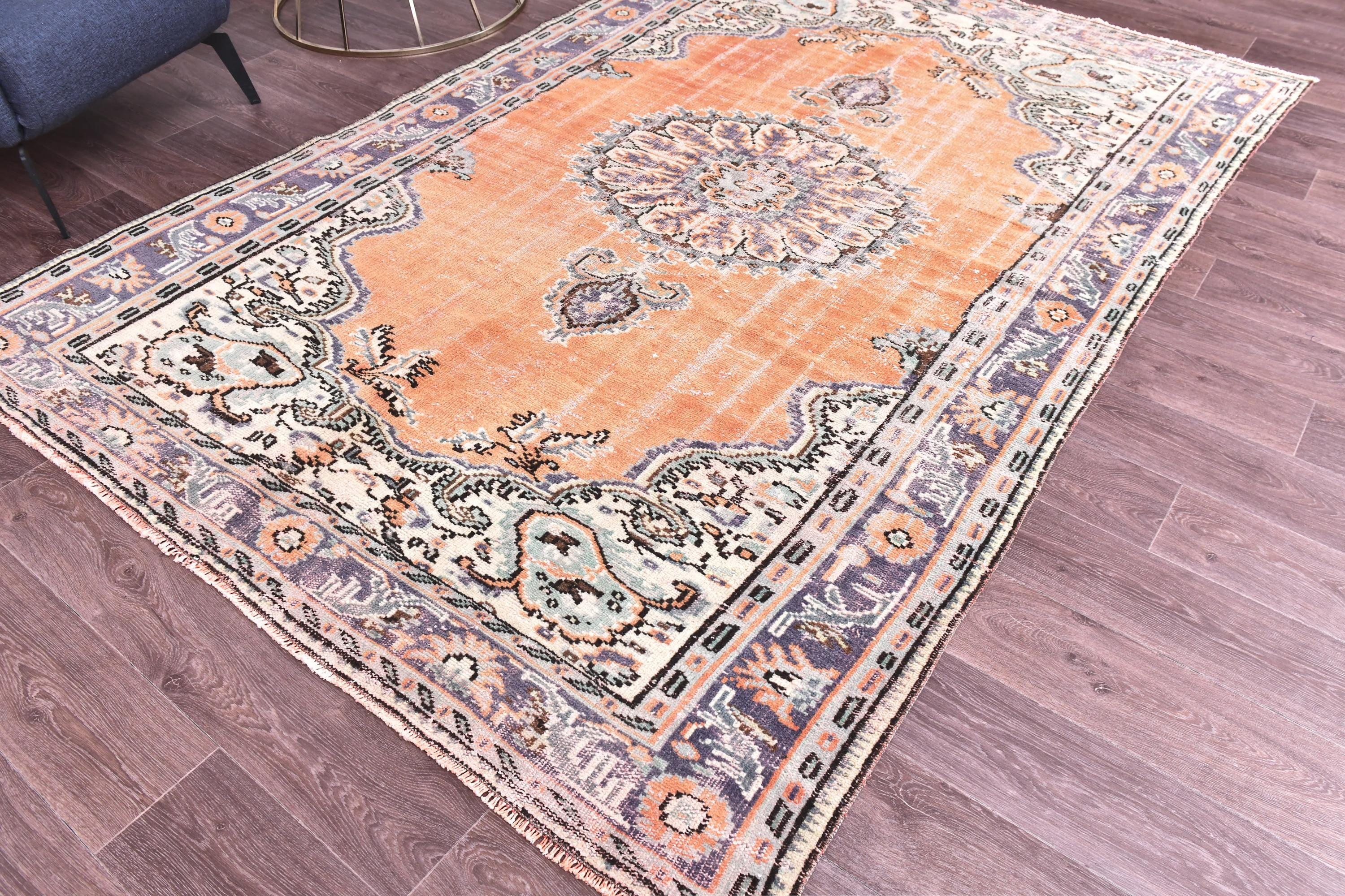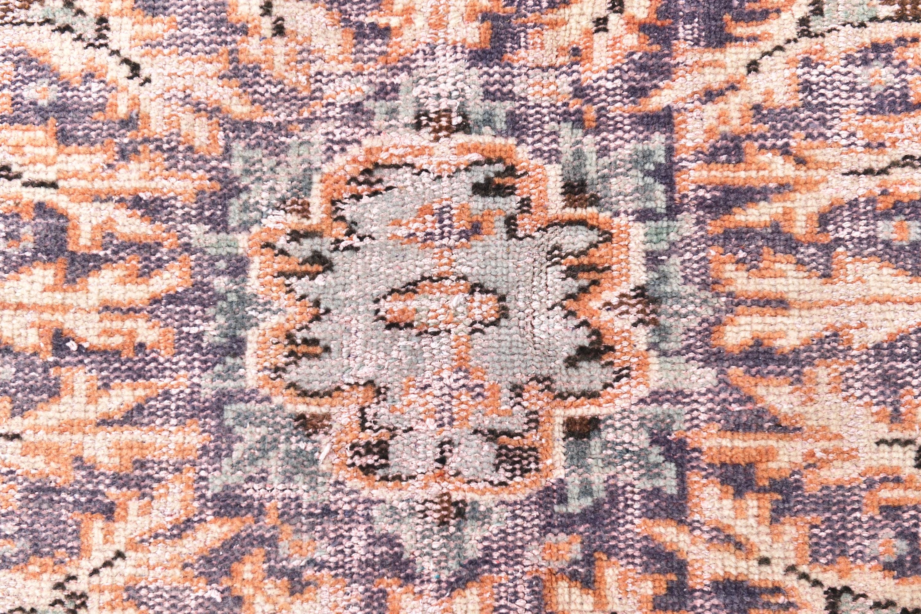 📜 Faded antique Turkish rug with apricot-orange central field and traditional Persian-style floral medallion design. Low-pile hand-knotted wool carpet exhibits natural distressing and color variations from age, including cream, lavender-gray, charcoal, and peachy tones. Corner cartouches feature elaborate paisley and vine motifs, while multiple ornate borders frame the composition.