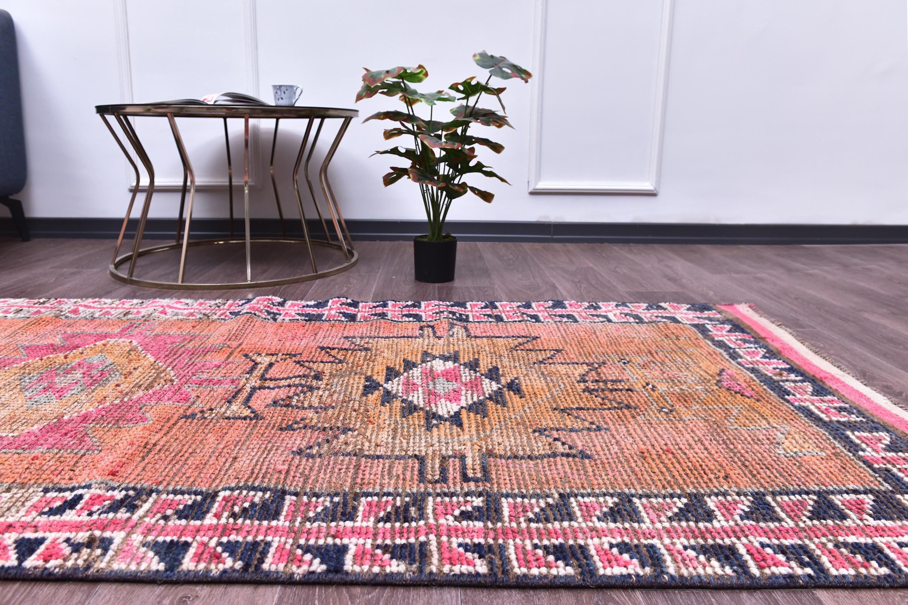 📜📌 Vintage hand-knotted Turkish runner rug in warm coral pink, peachy orange, and golden tones with traditional tribal medallion pattern. The low-pile wool carpet features three geometric diamond medallions down the center field with stepped borders in charcoal black and pink. Natural aging and distressed appearance adds authentic character with visible wear patterns throughout the piece.