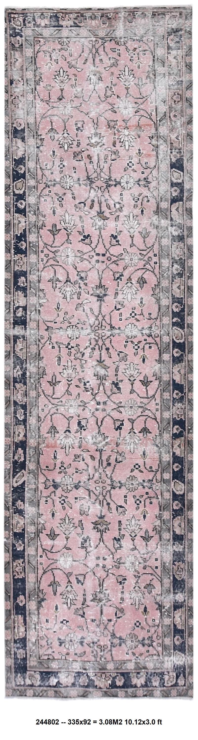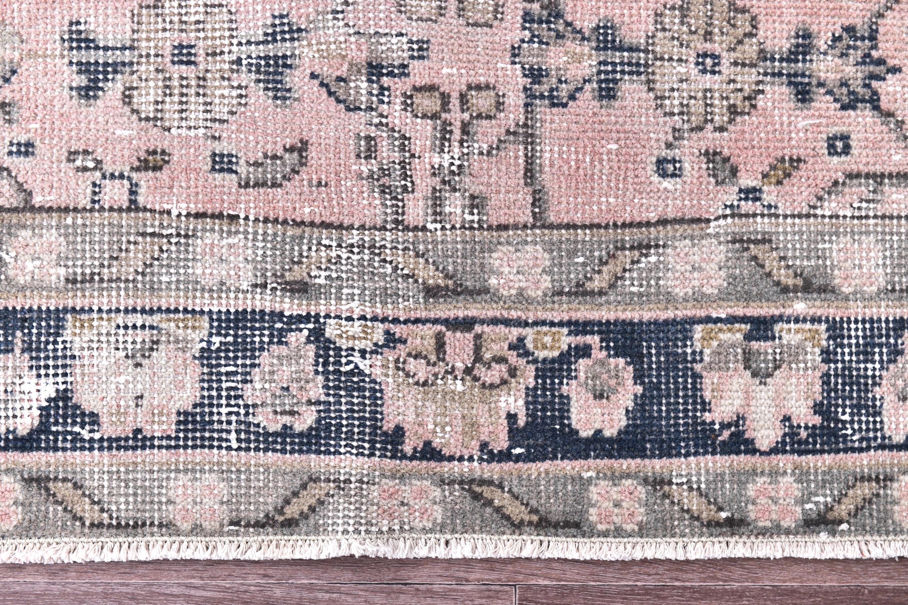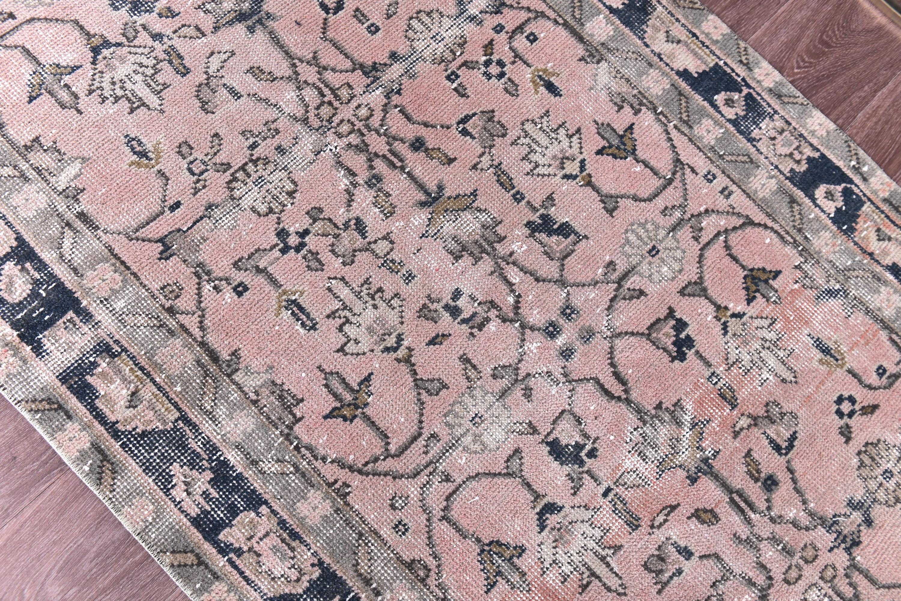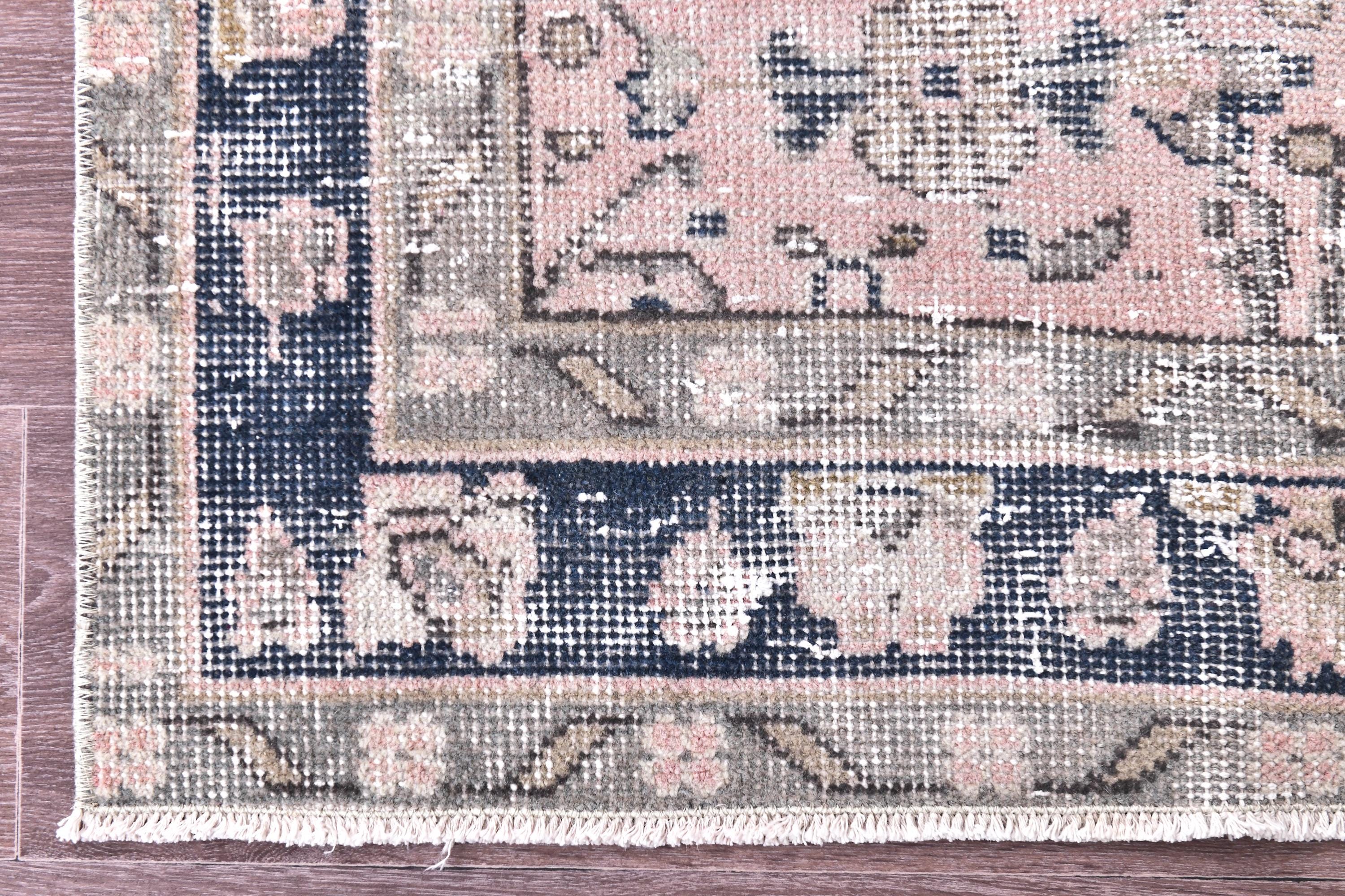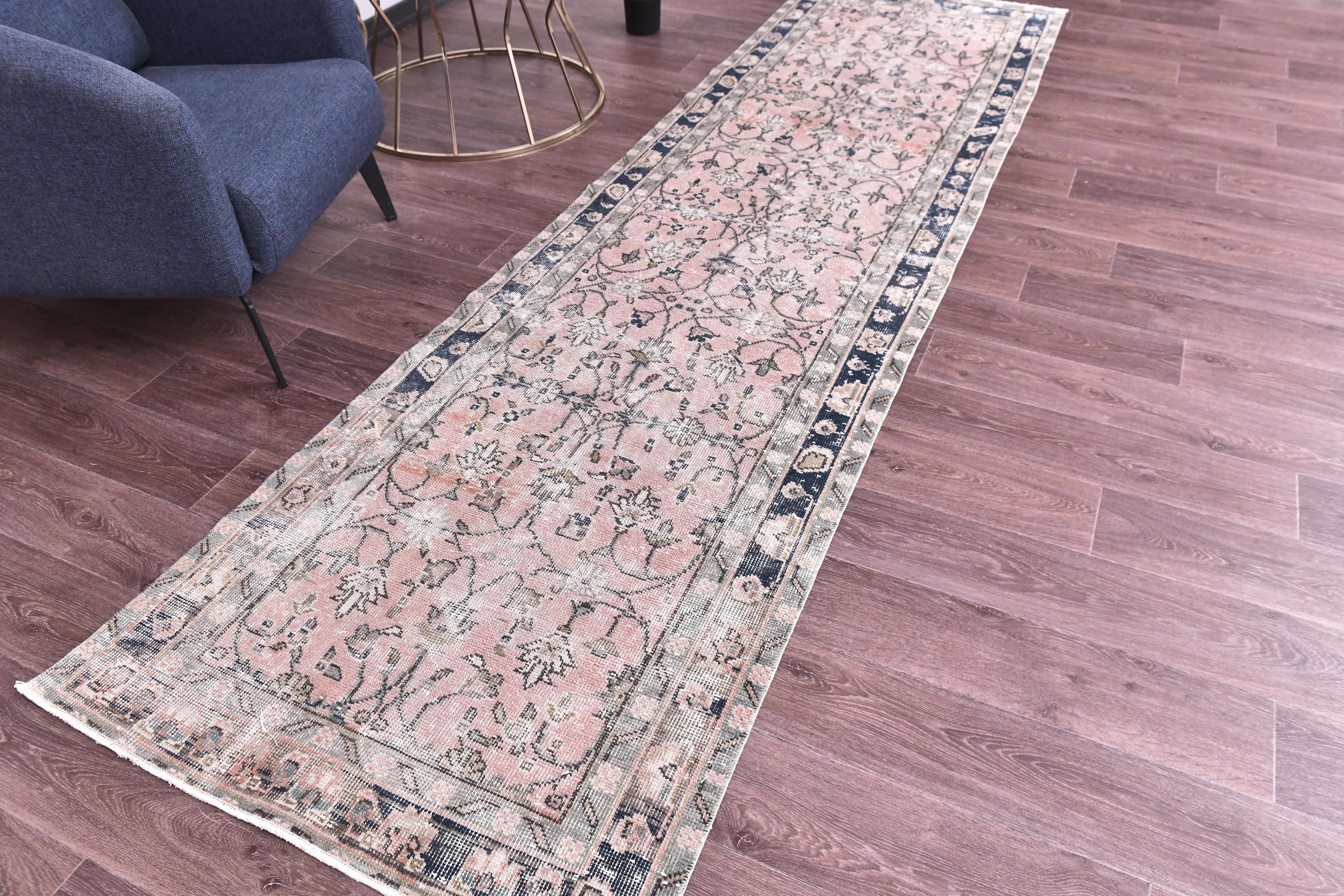 📜📌 Elegant vintage Turkish runner rug featuring an intricate all-over floral pattern in soft blush pink, navy blue, cream, and sage green. Hand-knotted wool construction showcases Persian-inspired botanical designs with delicate vines, palmettes, and flowers throughout the field. The rug displays a beautifully faded, distressed patina with a classic navy border adorned with traditional floral motifs, perfect for adding romantic charm to hallways or long narrow spaces.