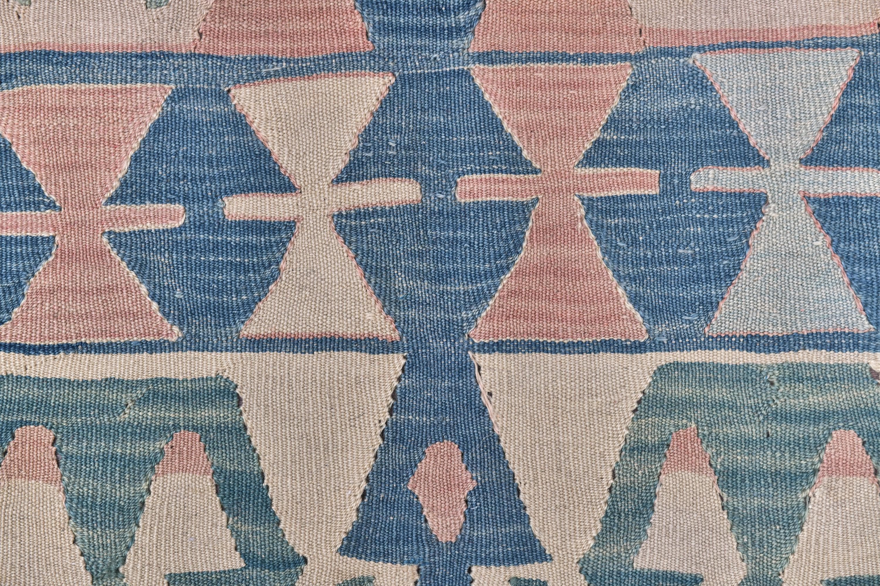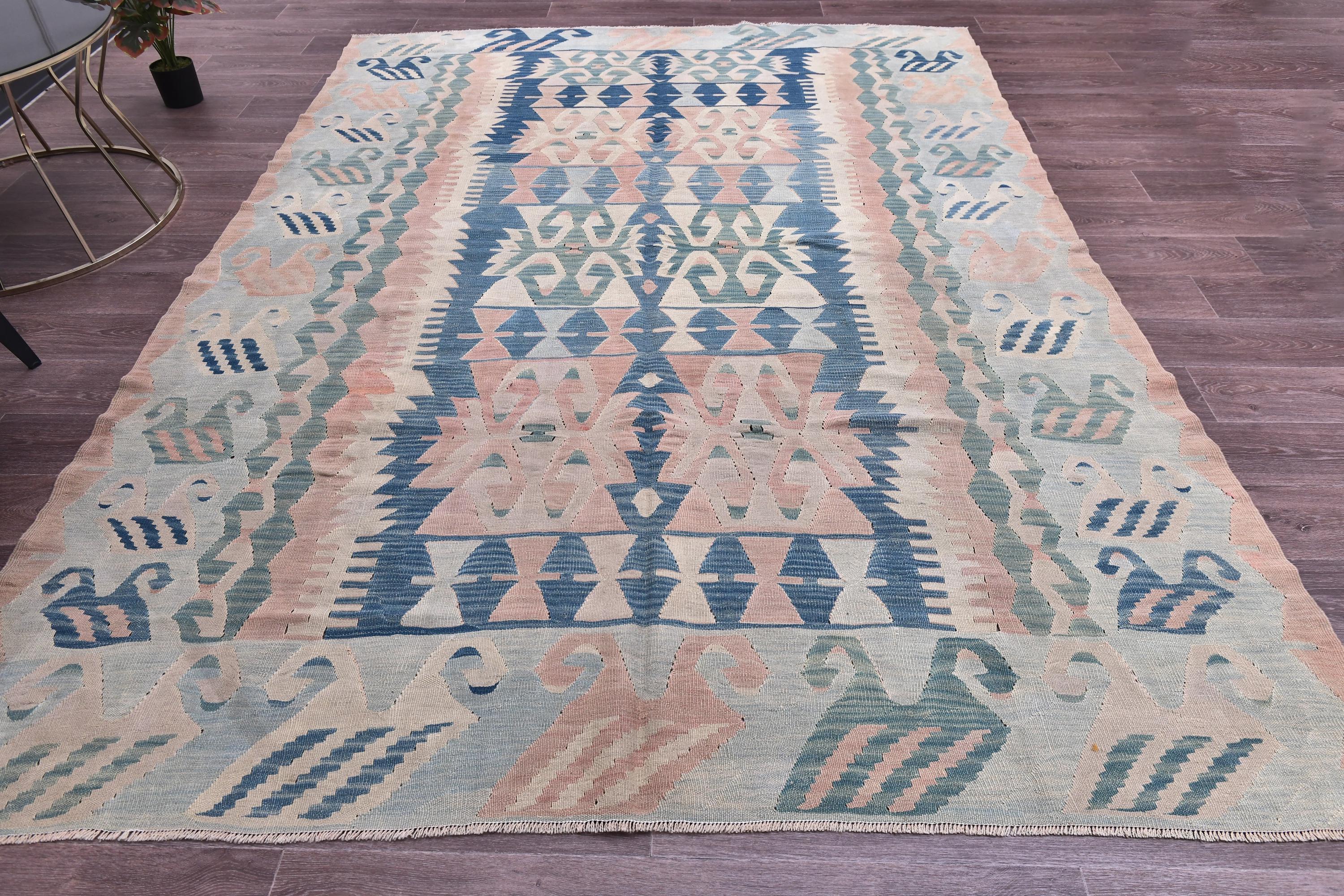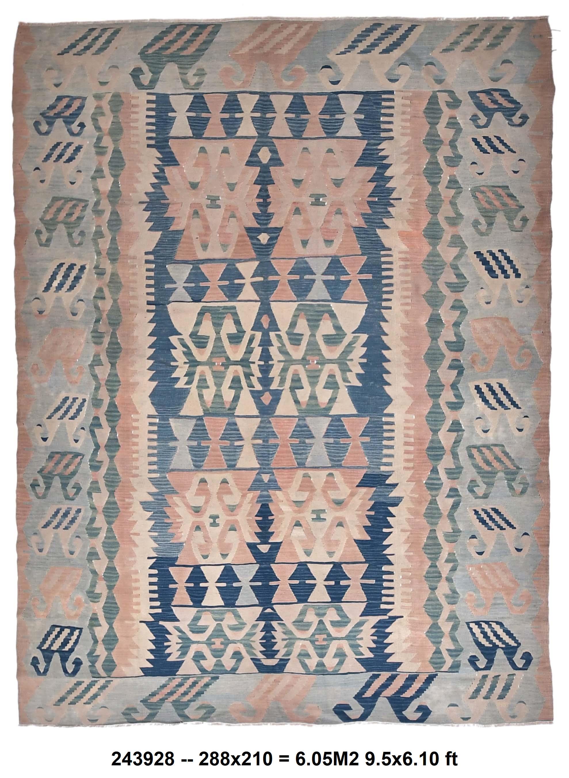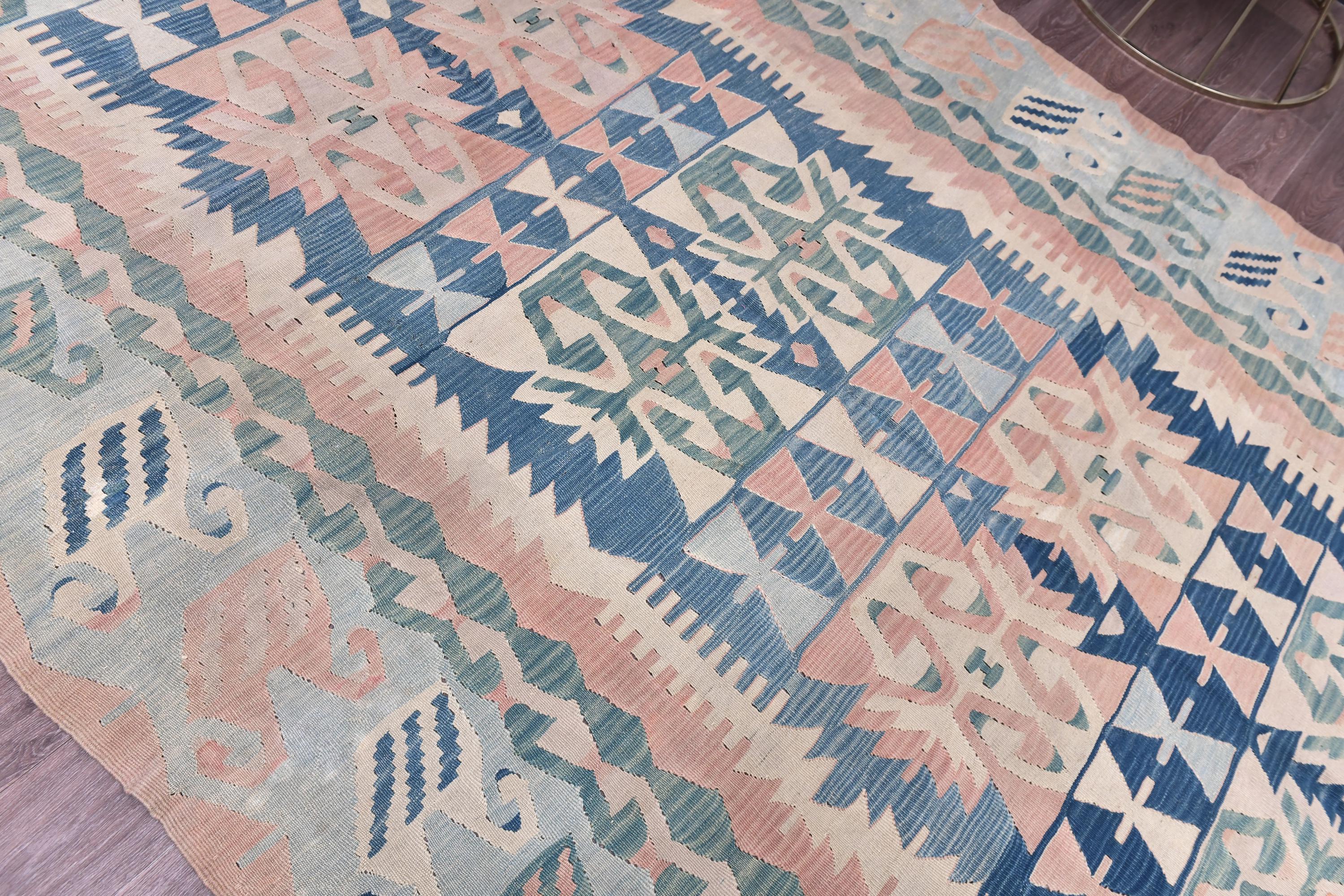 📜📌 Large Turkish kilim flat-weave rug showcasing authentic Anatolian craftsmanship in muted pastel tones of powder blue, dusty rose, seafoam green, and natural ivory. The symmetrical design features two prominent central medallions with intricate geometric detailing, surrounded by tribal symbols and folk art motifs scattered throughout the field