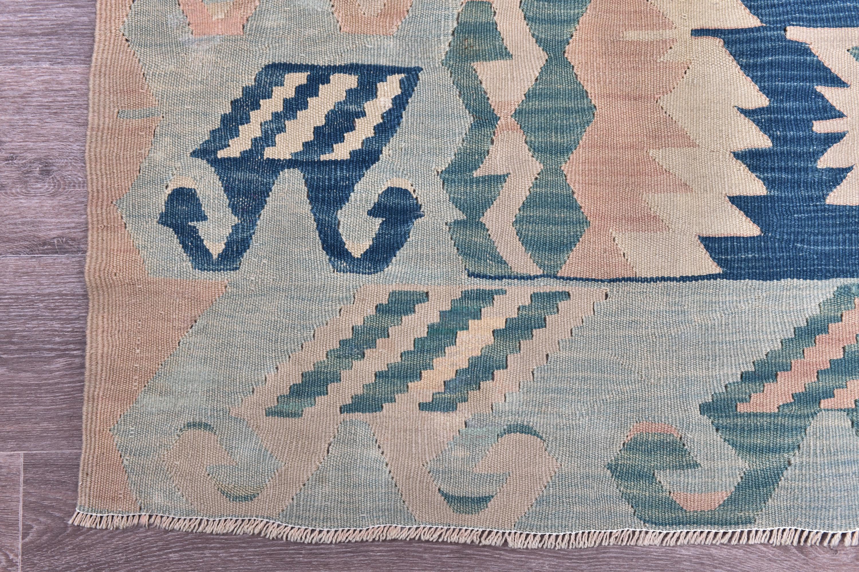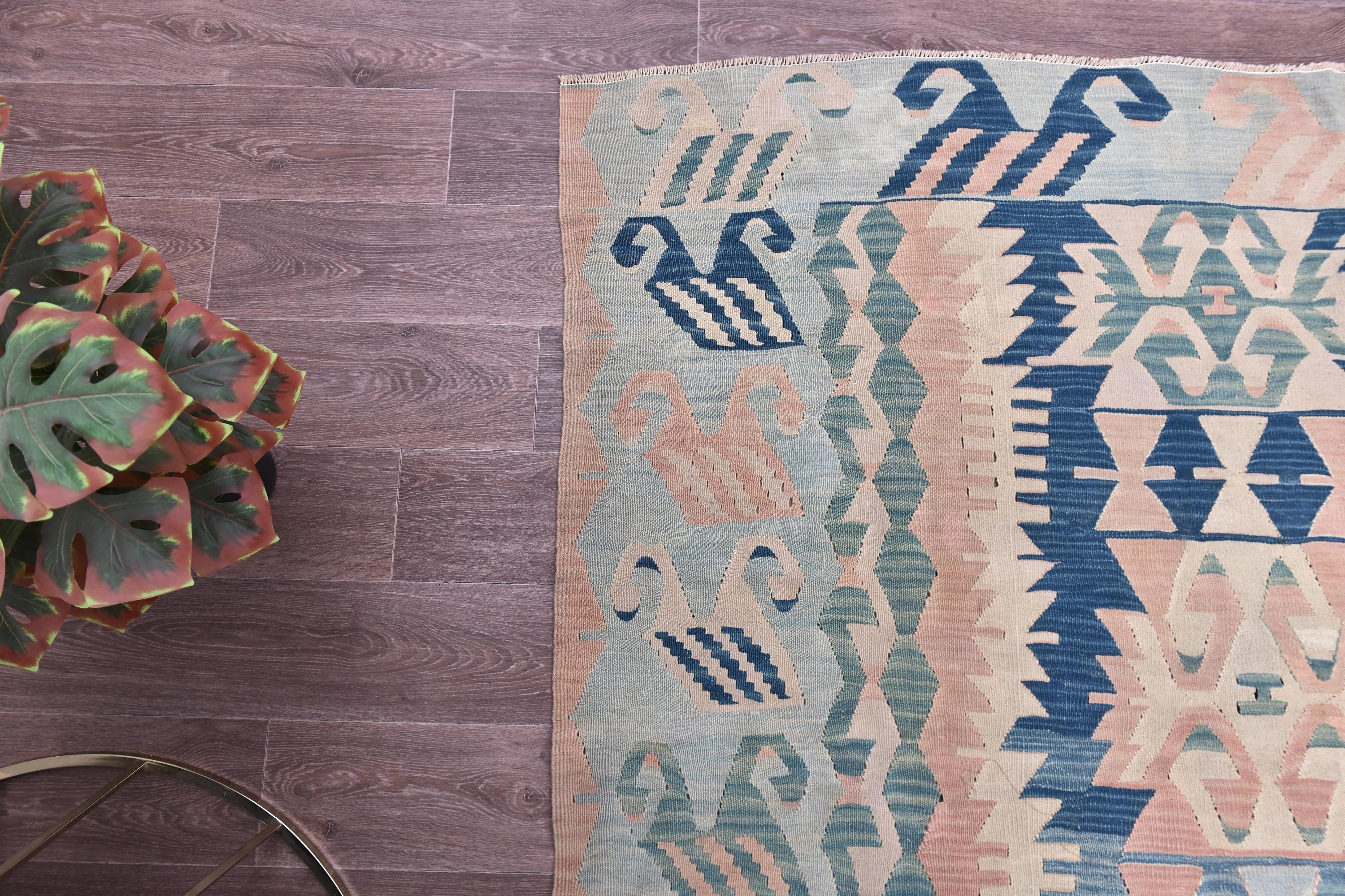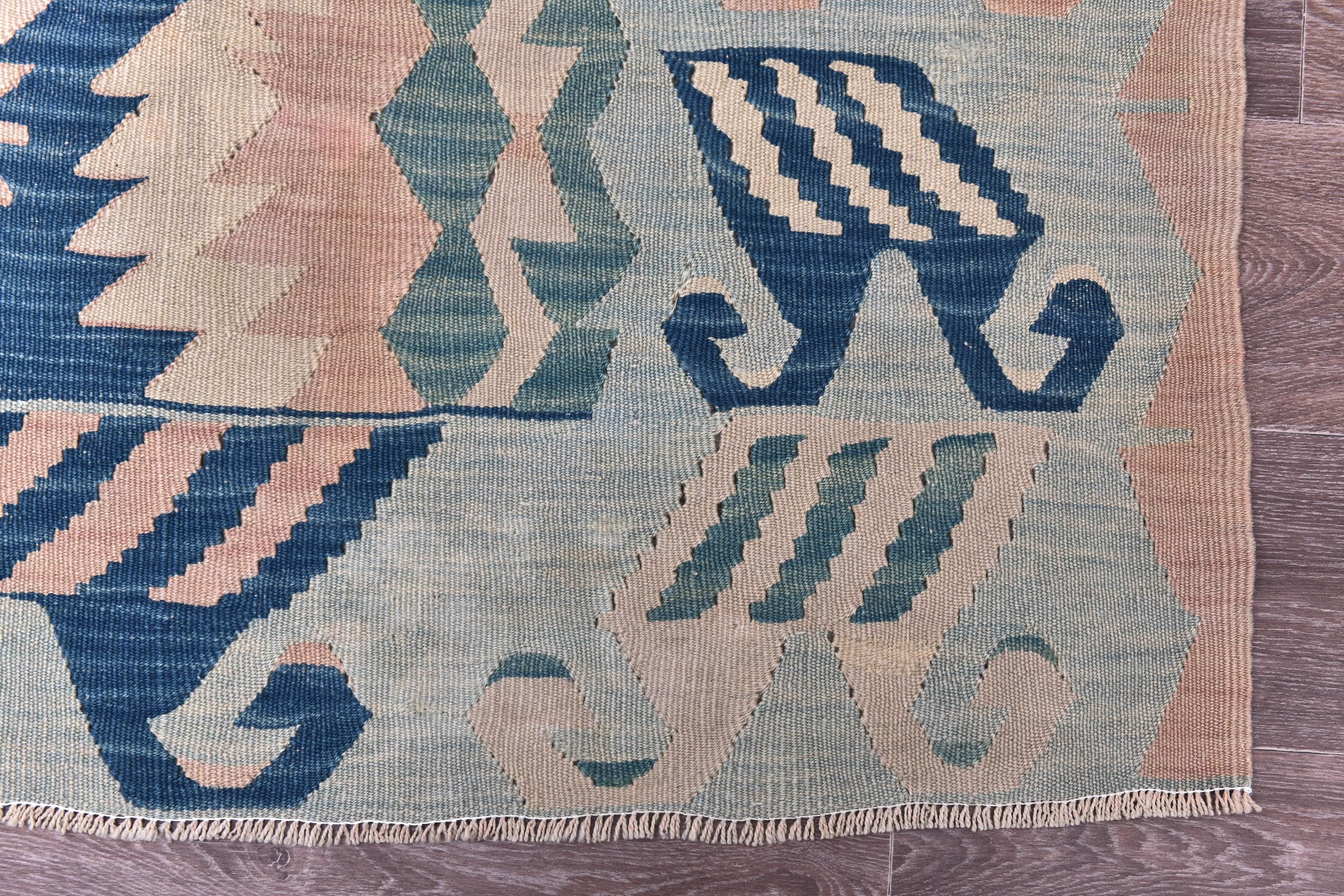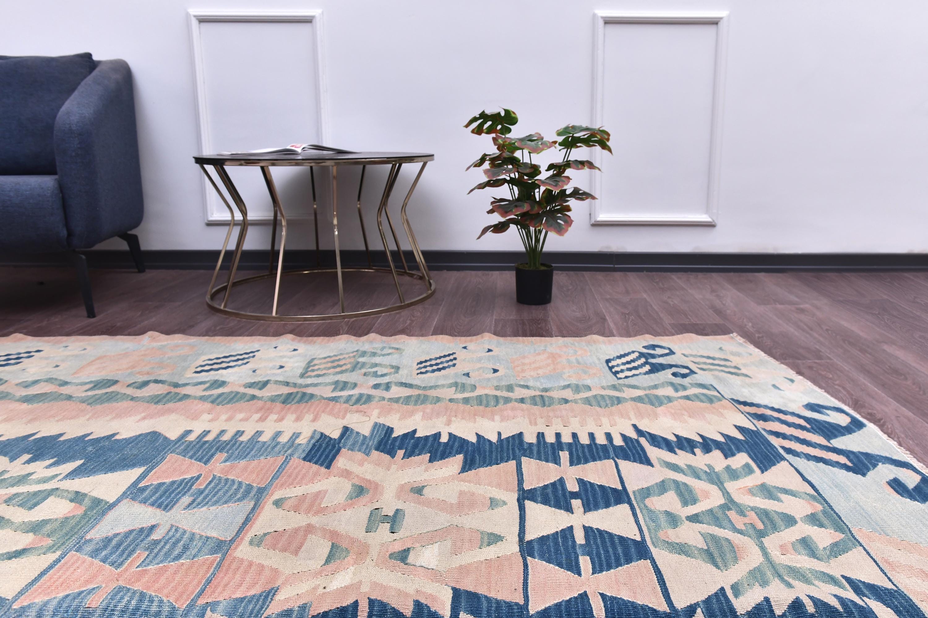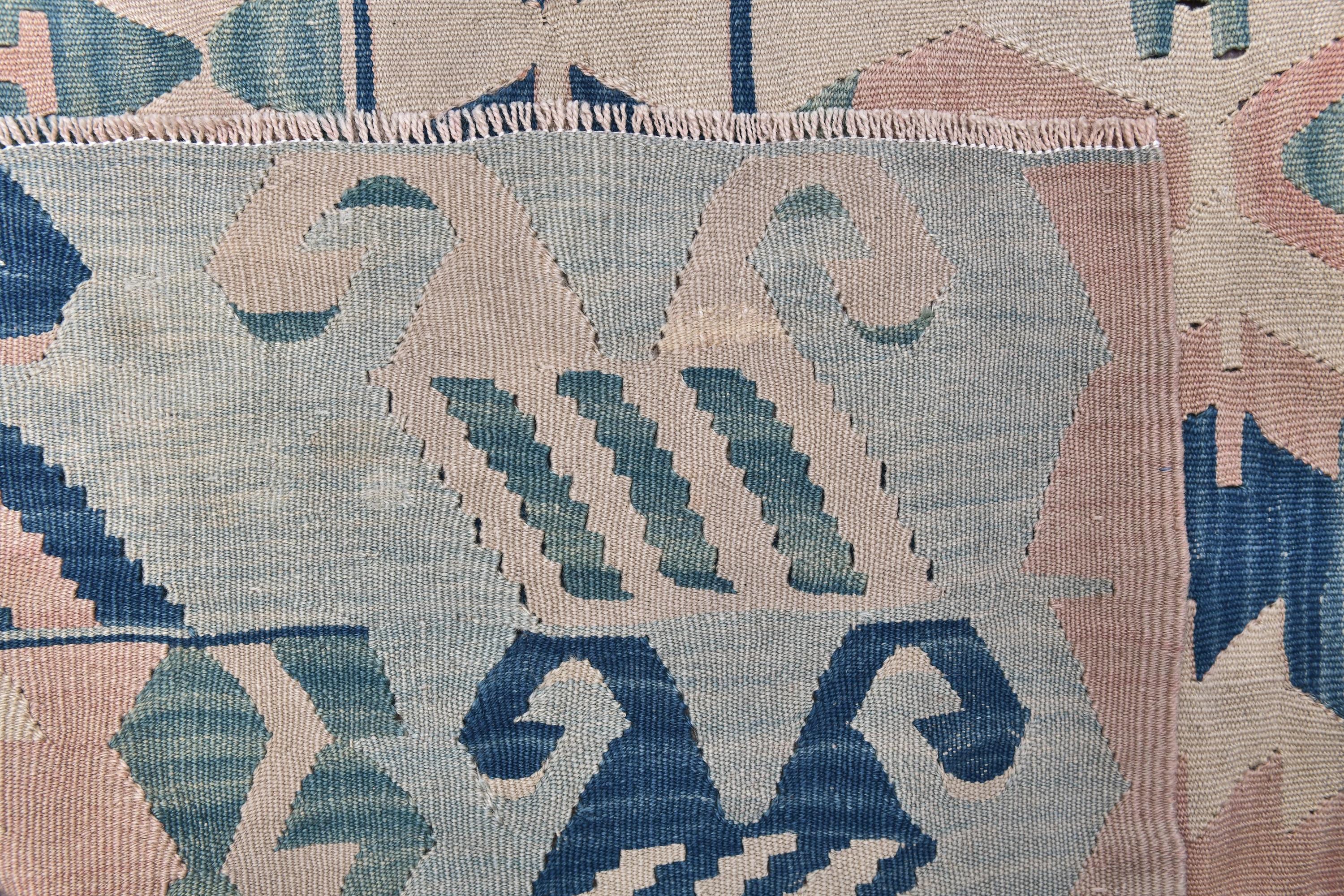 📜📌 Large Turkish kilim flat-weave rug showcasing authentic Anatolian craftsmanship in muted pastel tones of powder blue, dusty rose, seafoam green, and natural ivory. The symmetrical design features two prominent central medallions with intricate geometric detailing, surrounded by tribal symbols and folk art motifs scattered throughout the field
